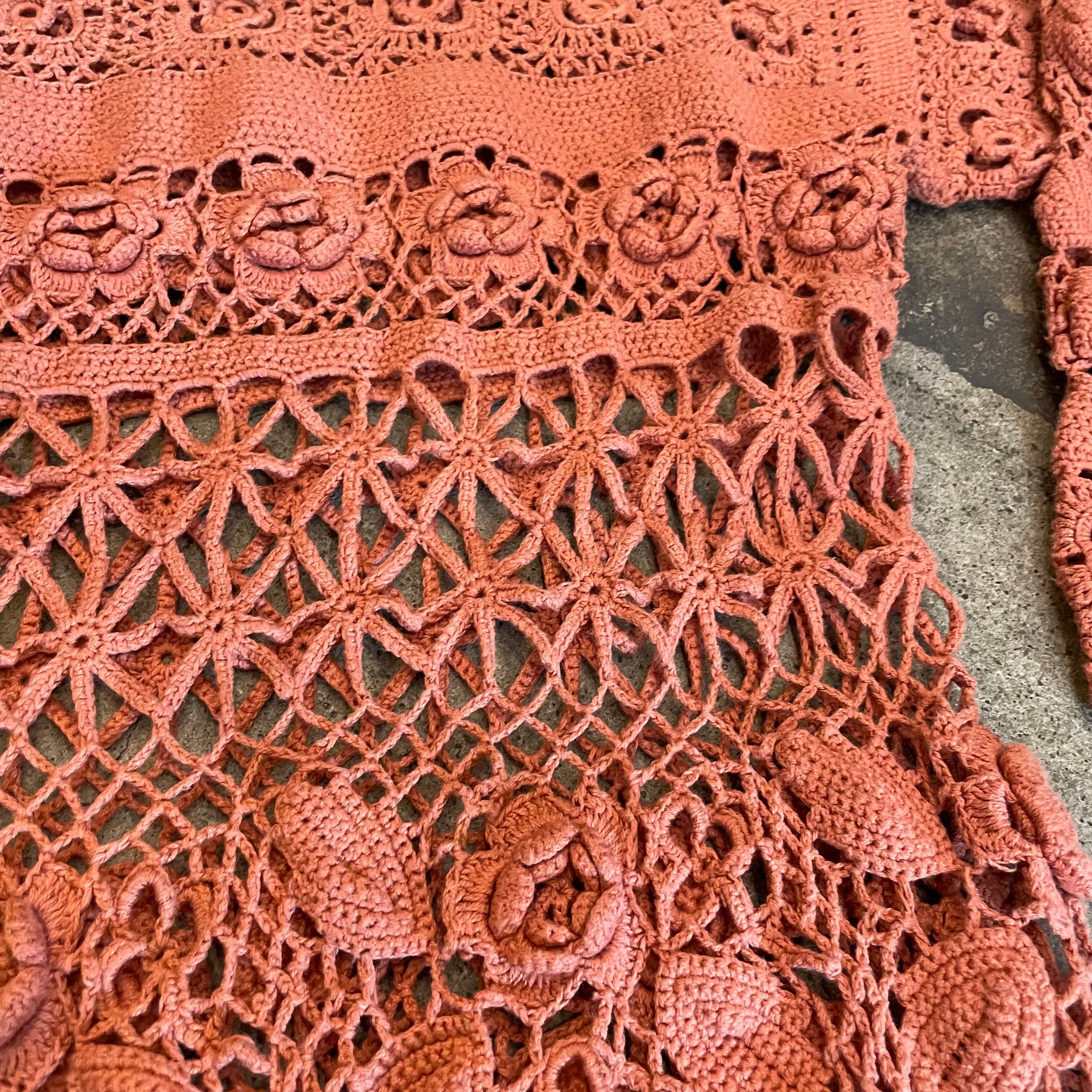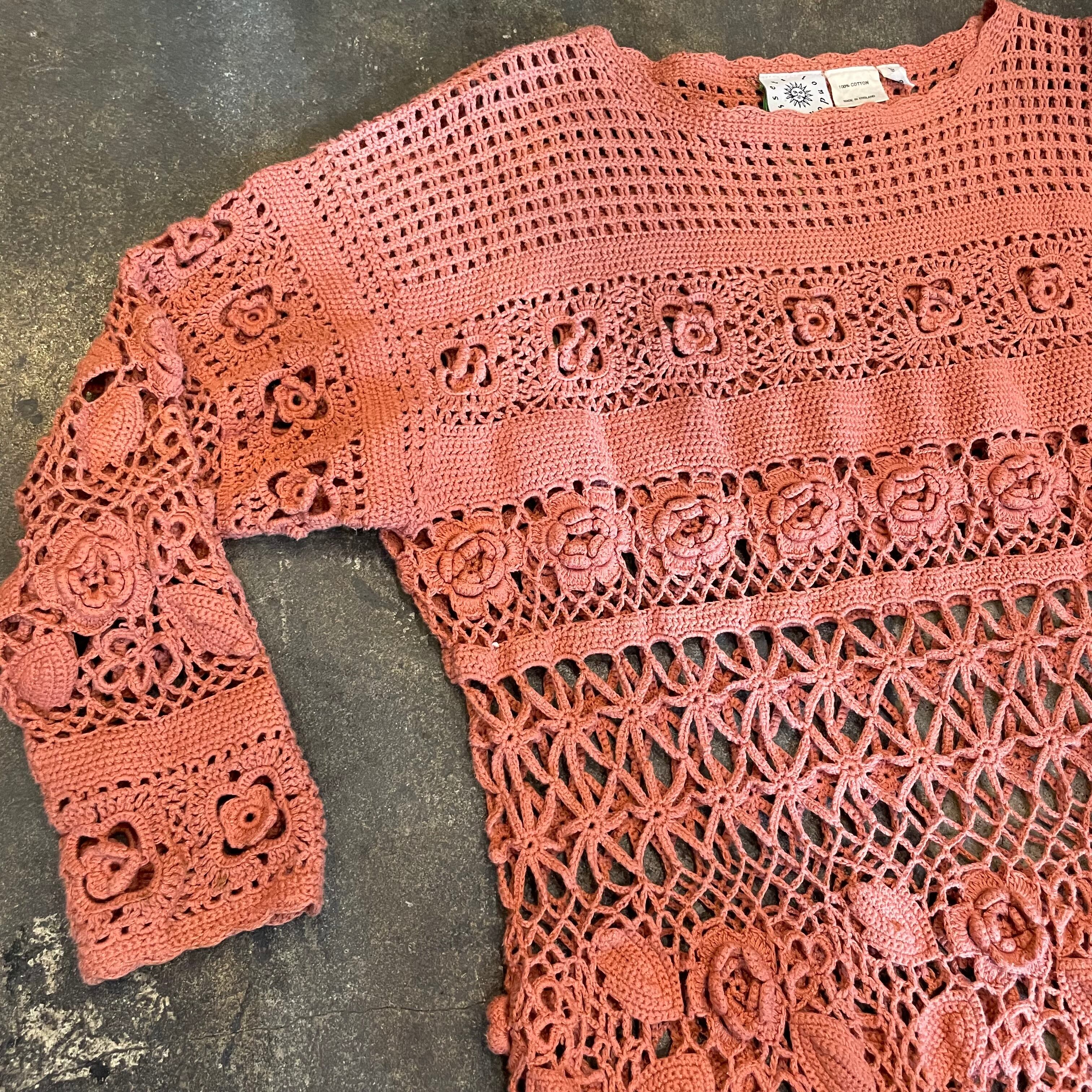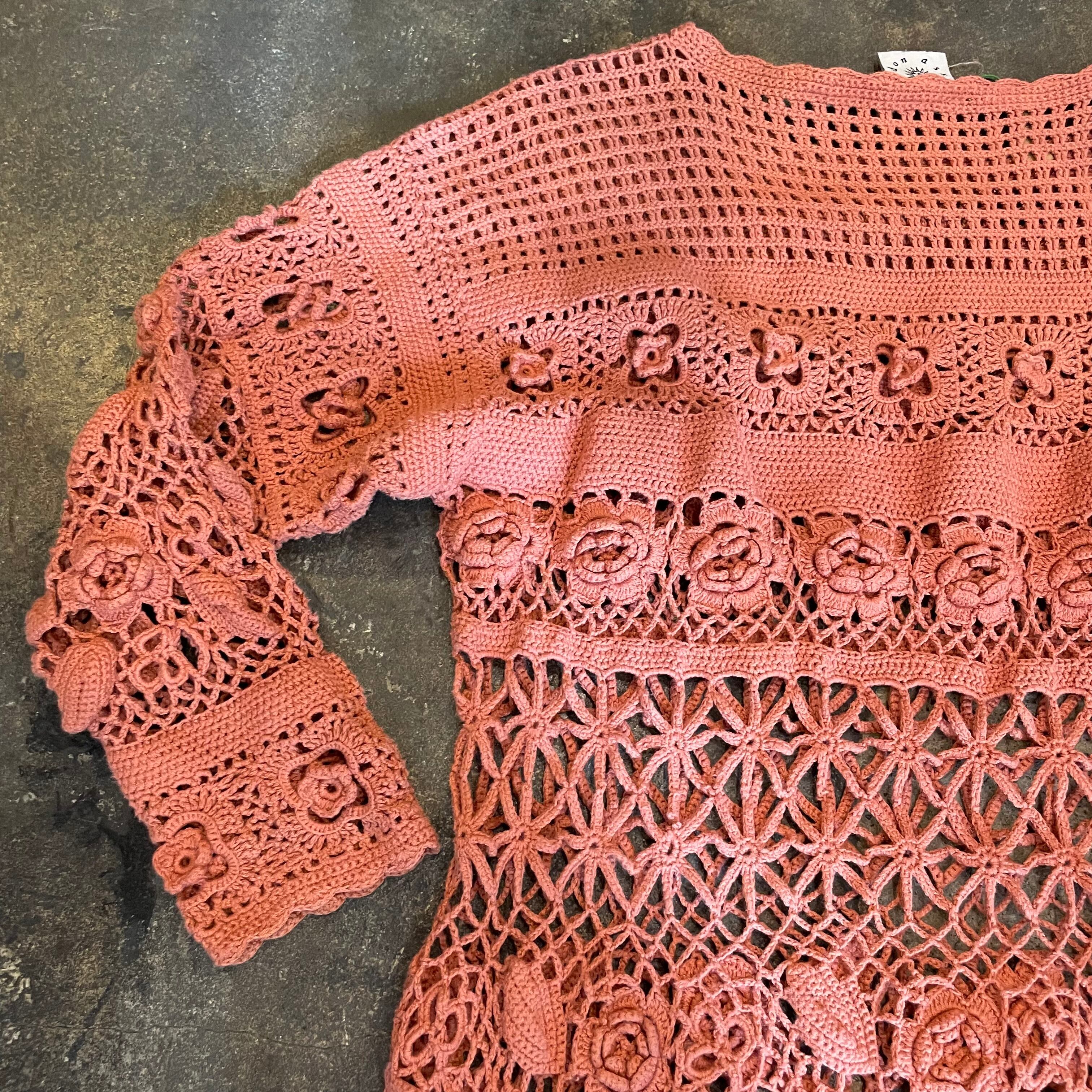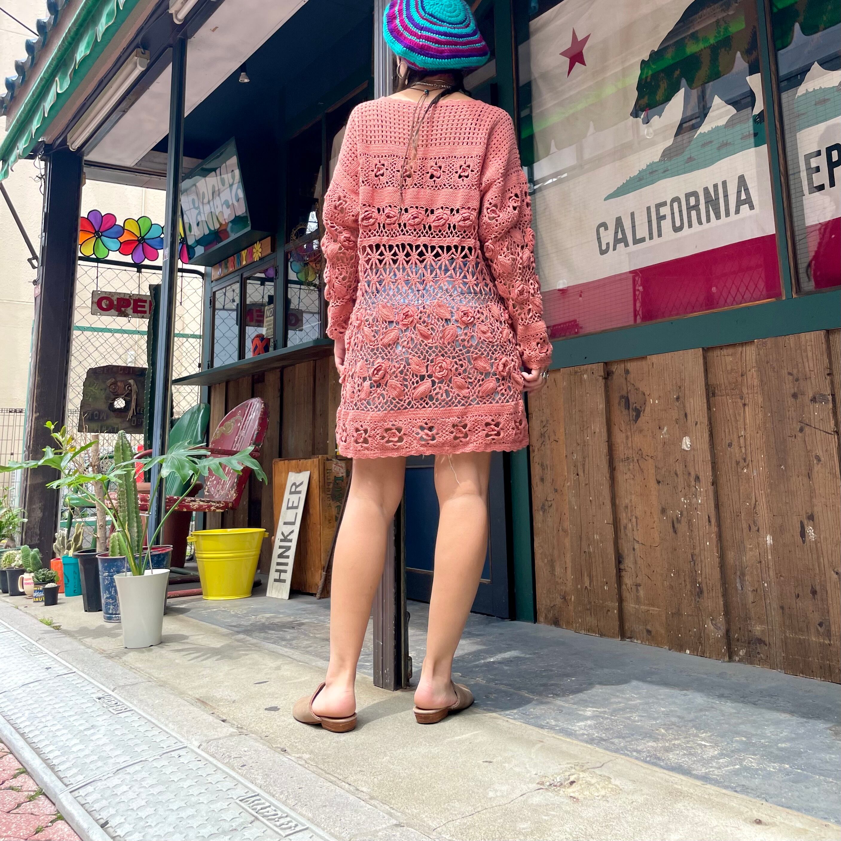 ダスティーピンクとお花やスケスケな編み地がかわいい手編みのコットンニットのセーターです。