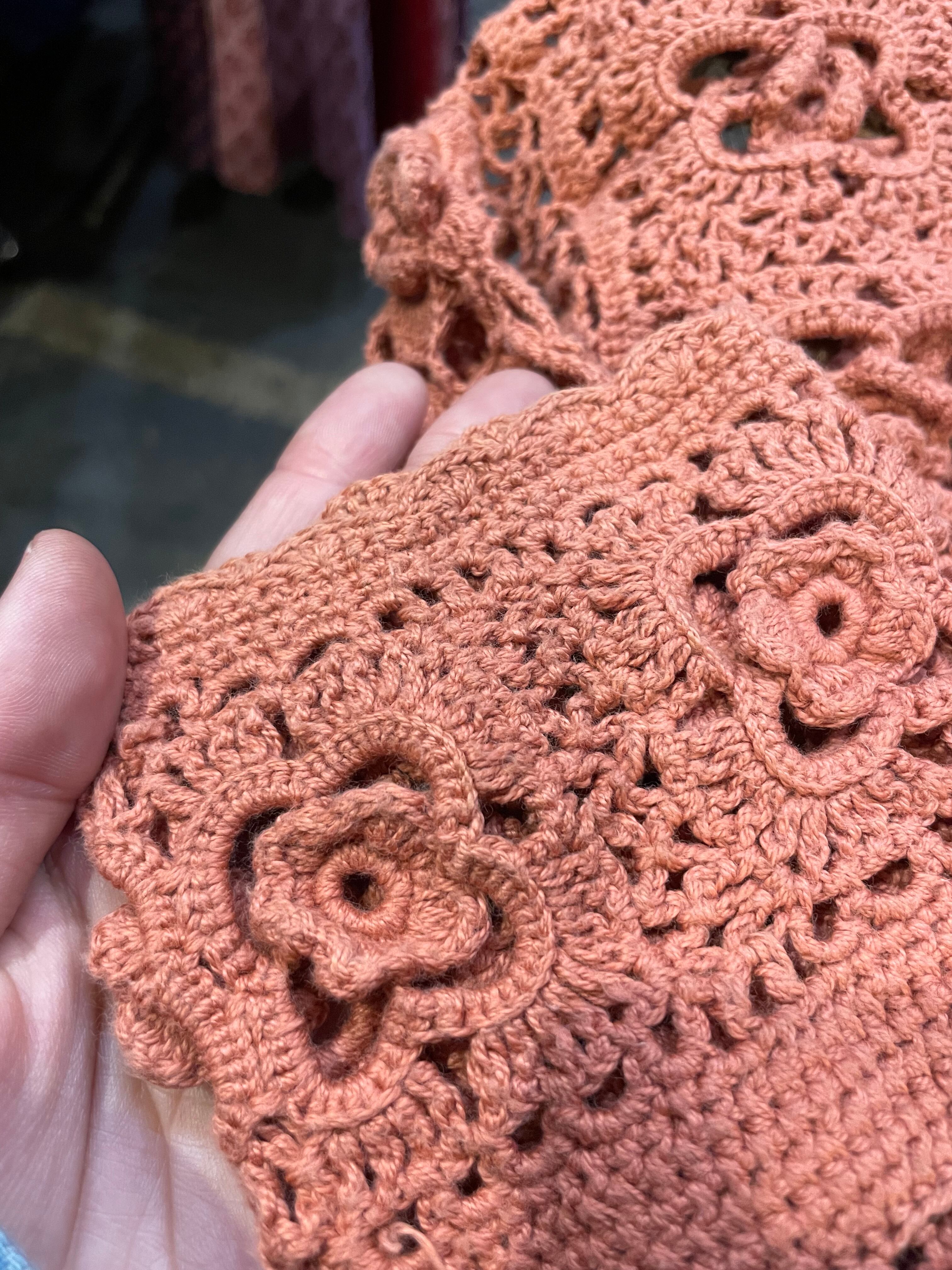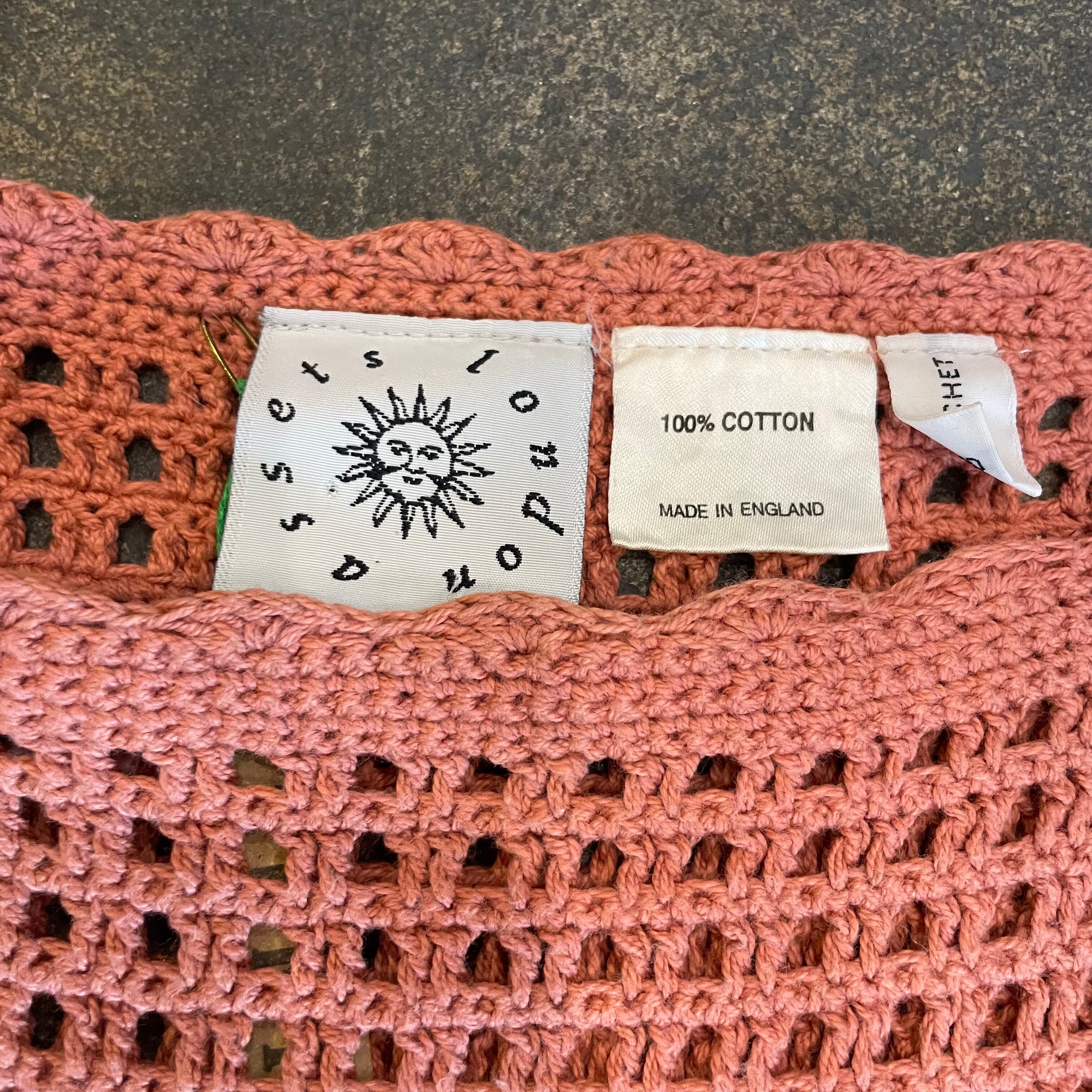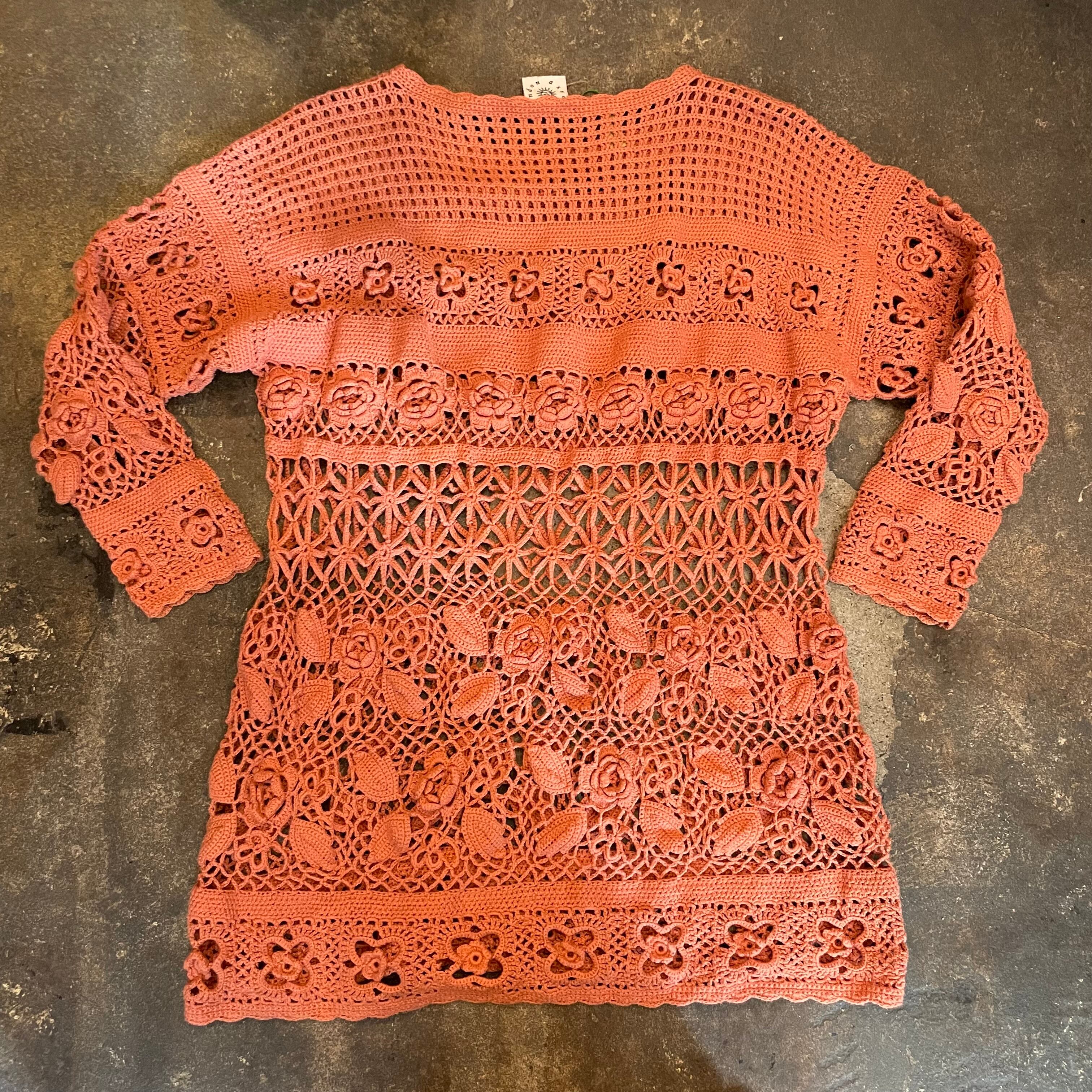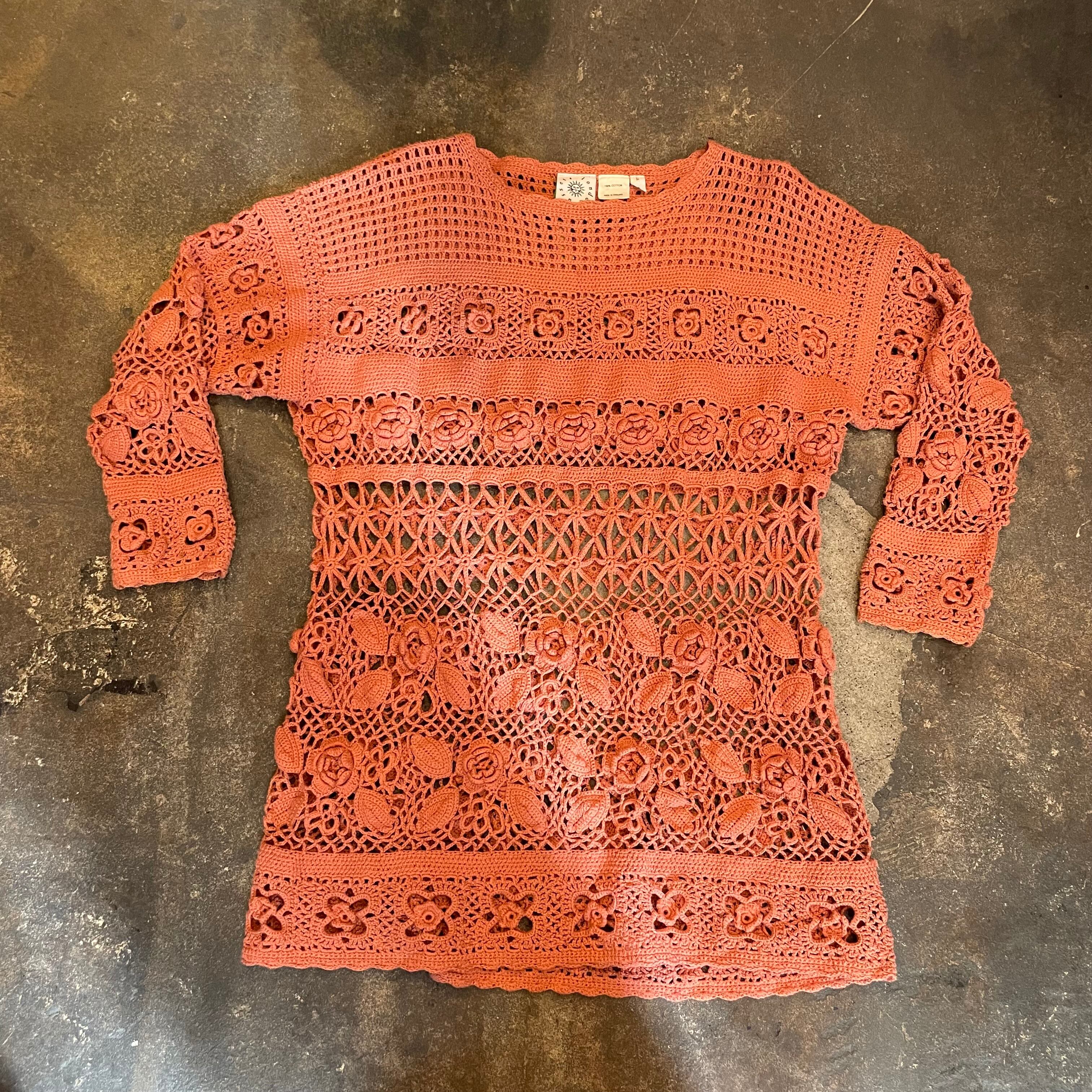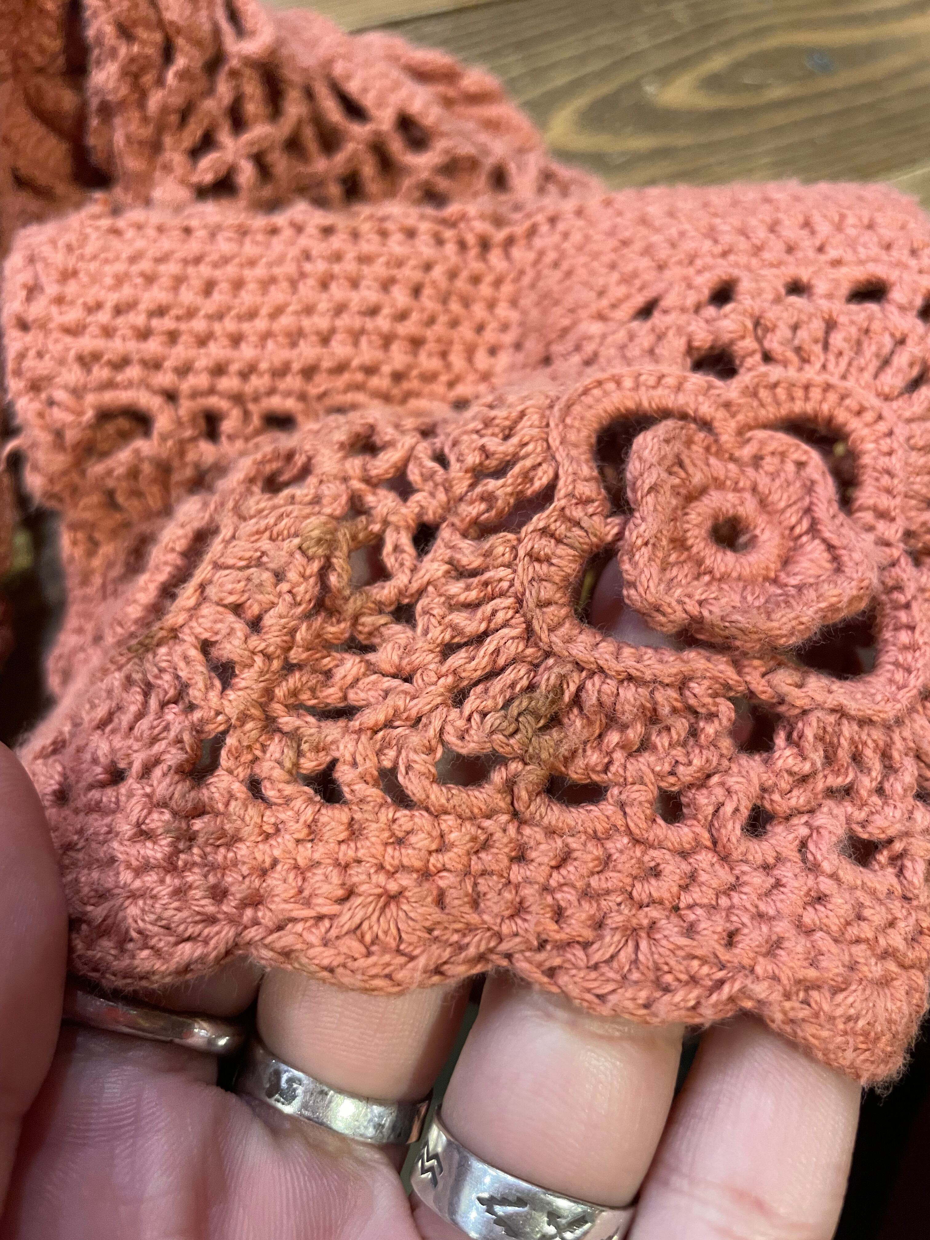 ダスティーピンクとお花やスケスケな編み地がかわいい手編みのコットンニットのセーターです。