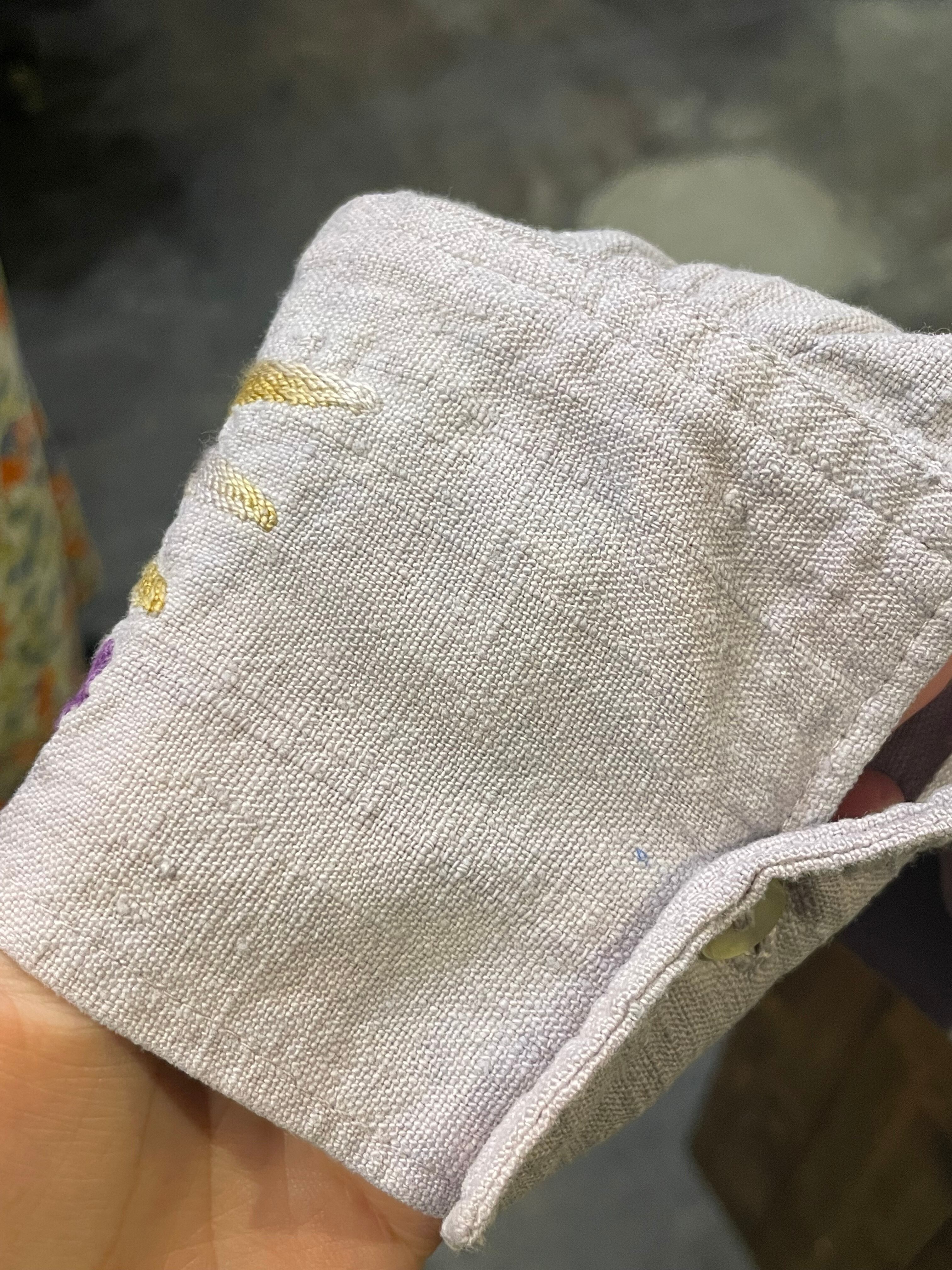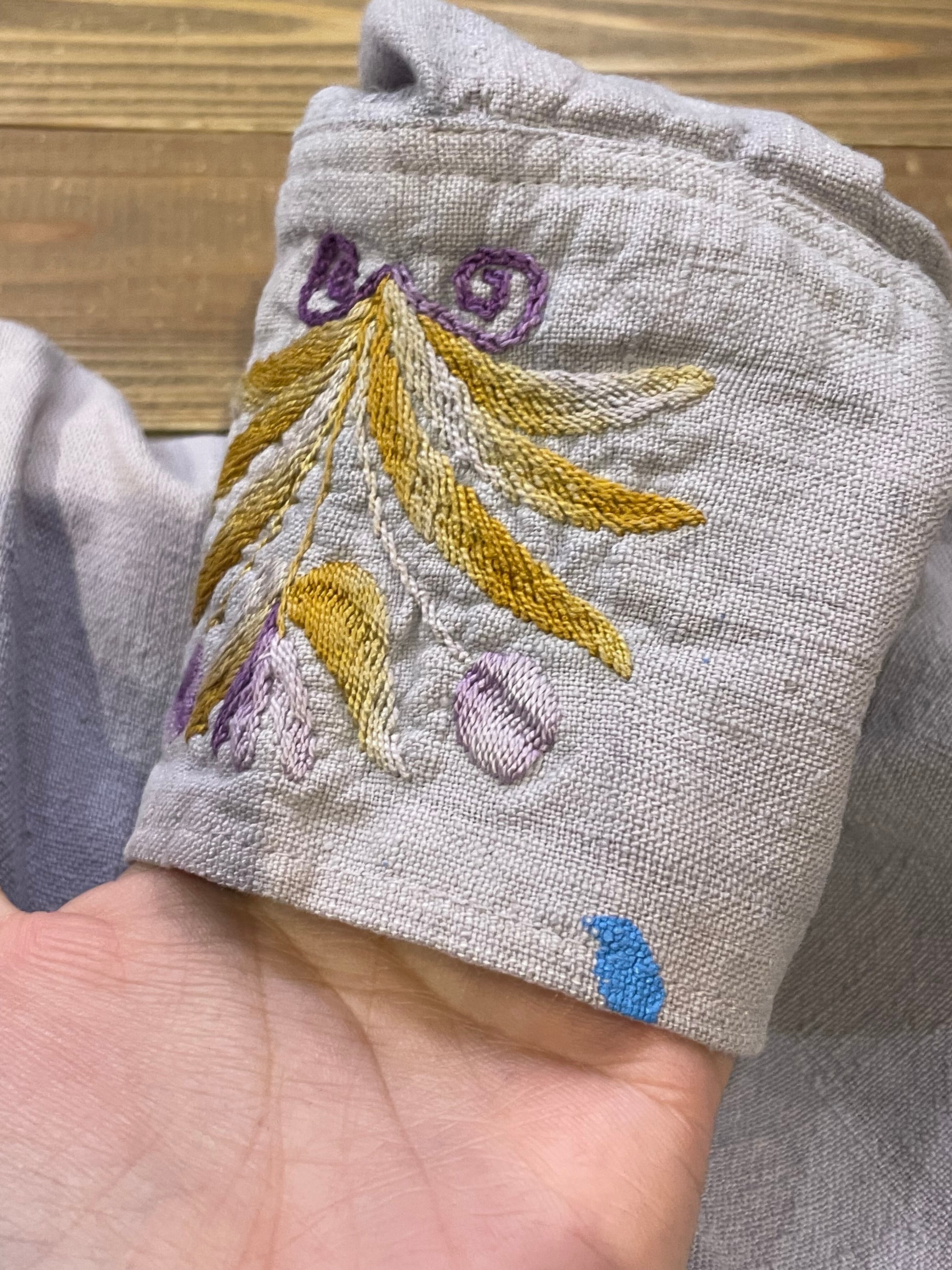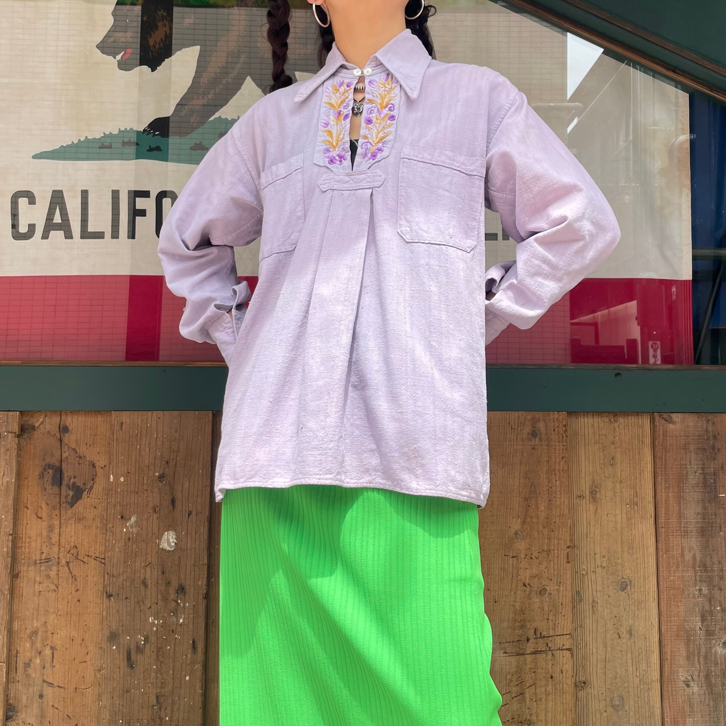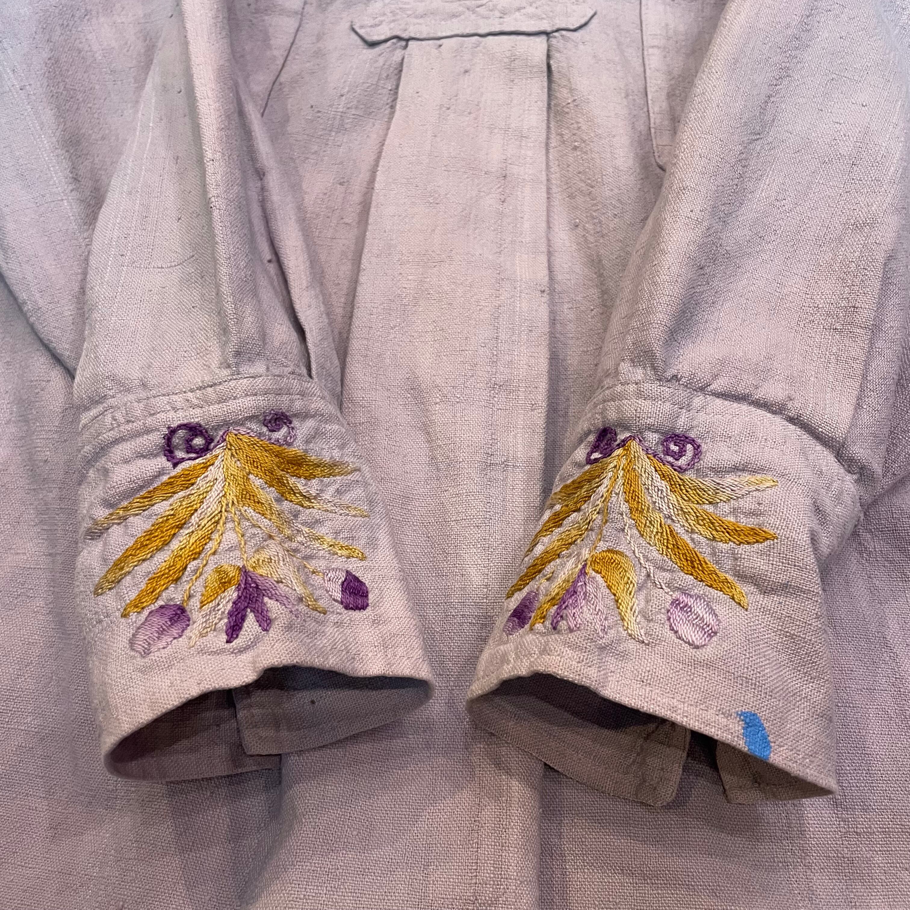 胸元や袖口の丁寧な手刺繍が素敵なプルオーバーシャツです。手織り感のある生地感がとても気持ちよく、温かみと雰囲気のある一着です。