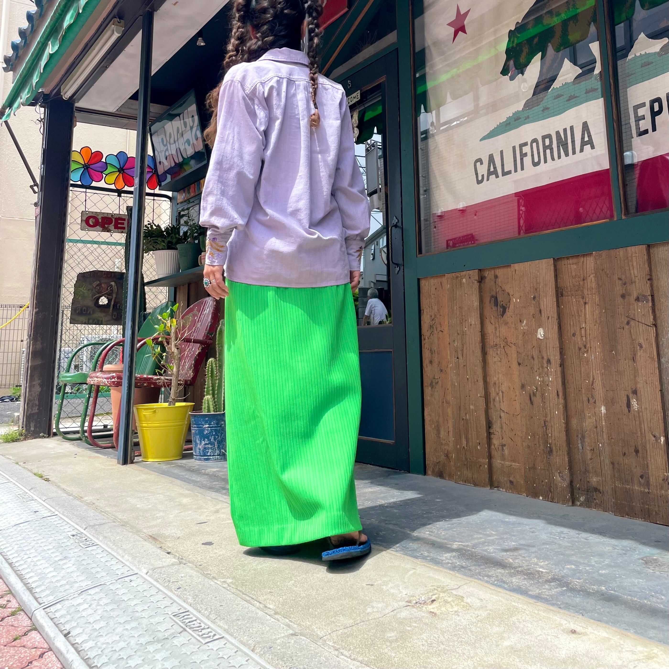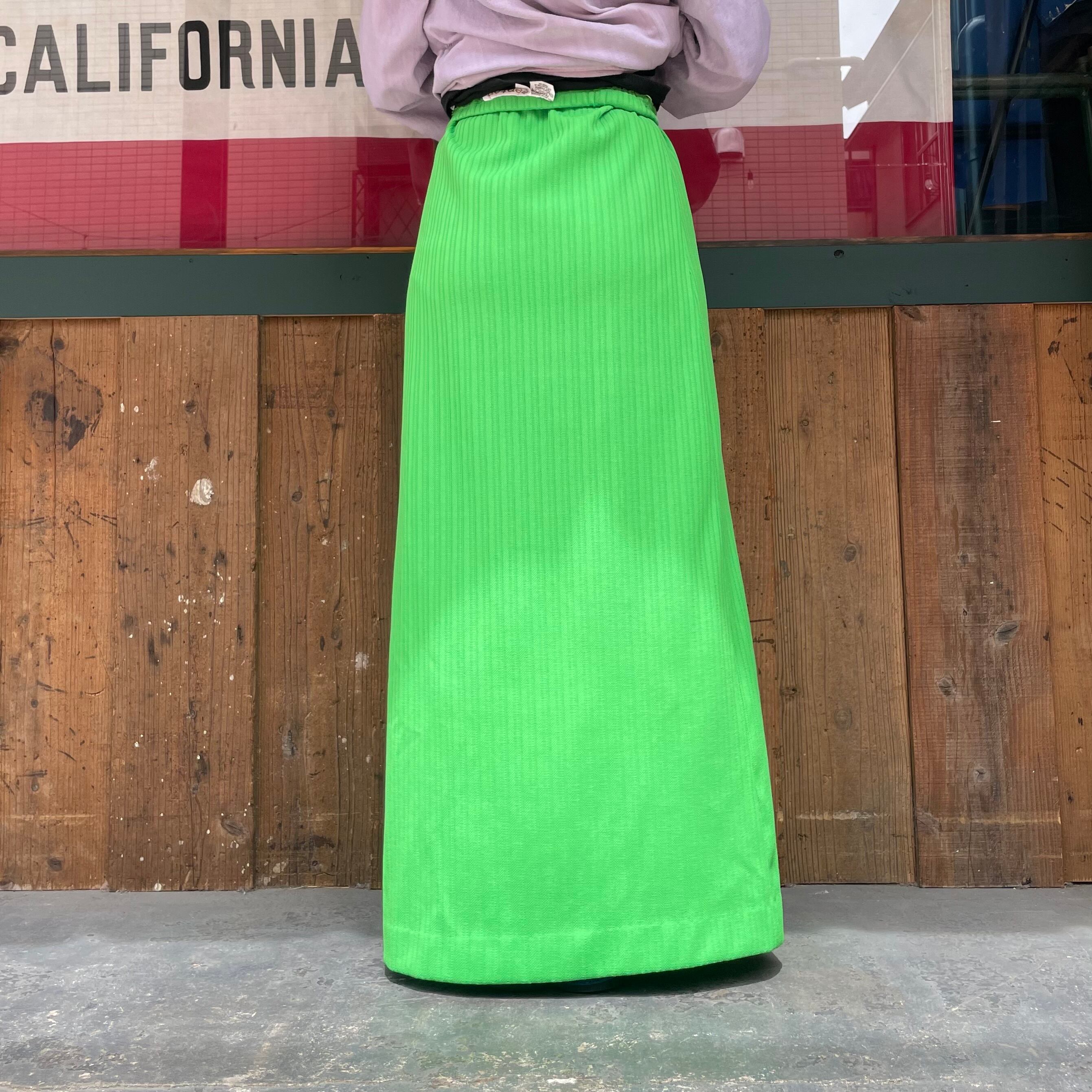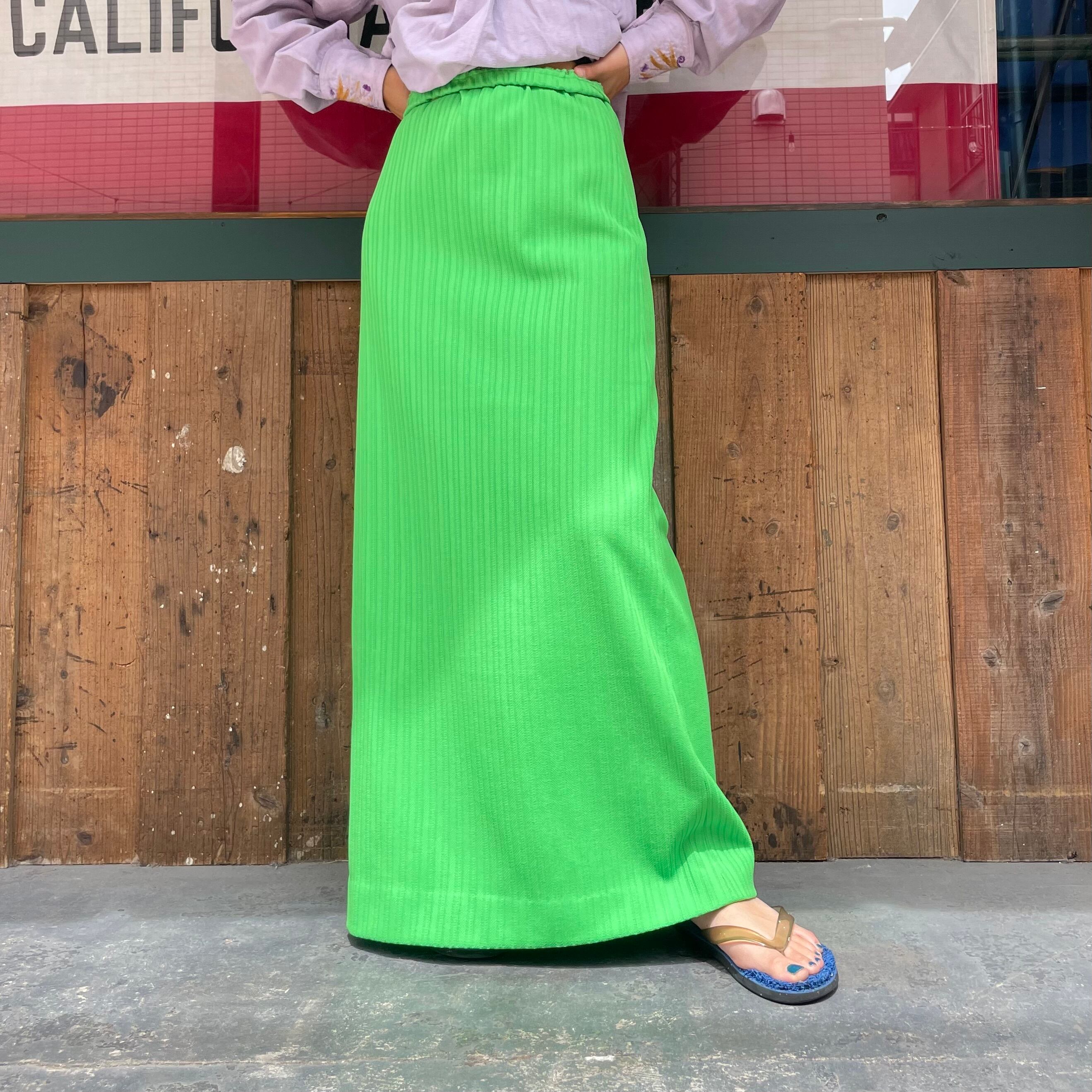 鮮やかなキミドリ色がかわいいポリエステル素材のスカートです。