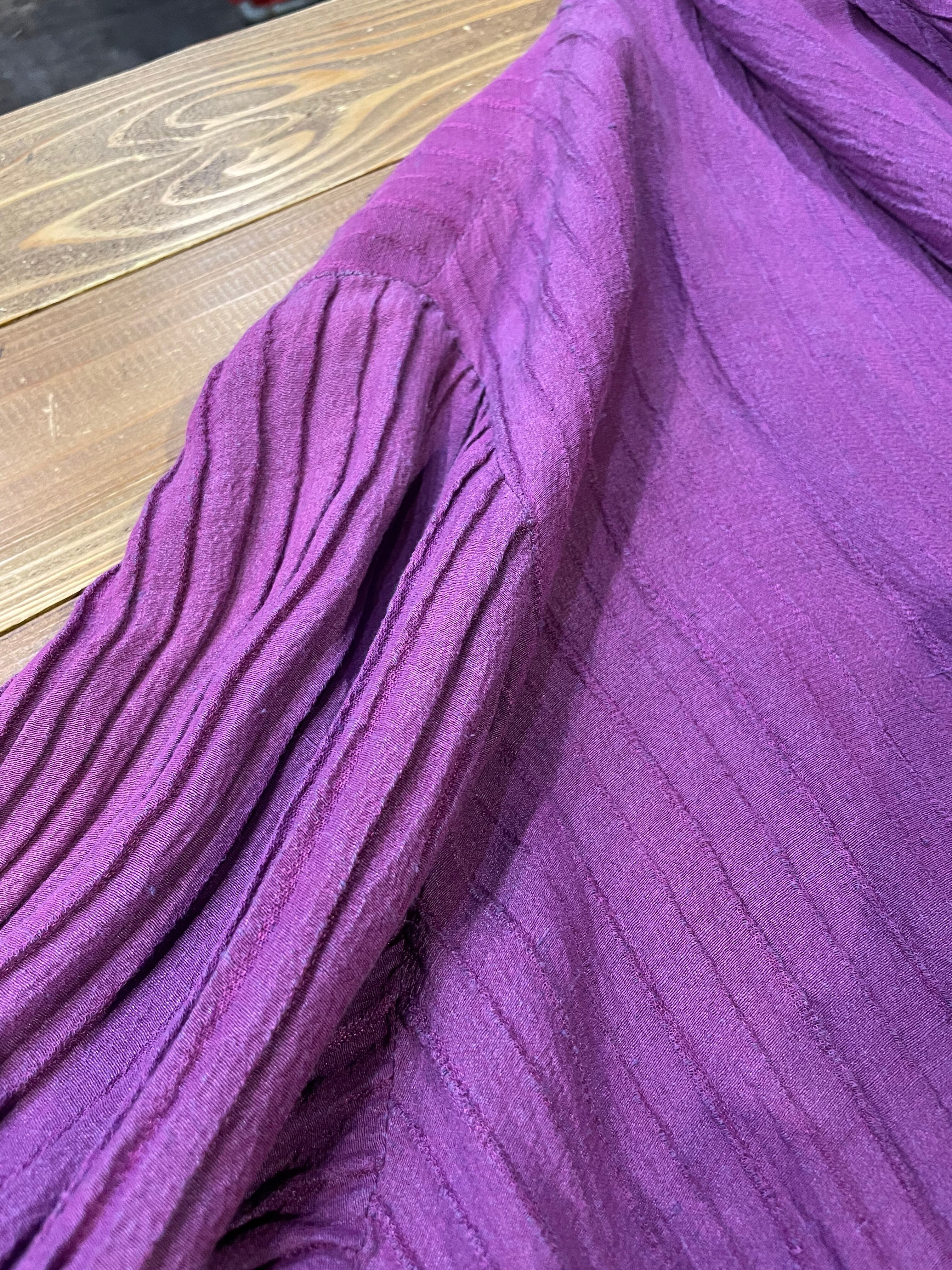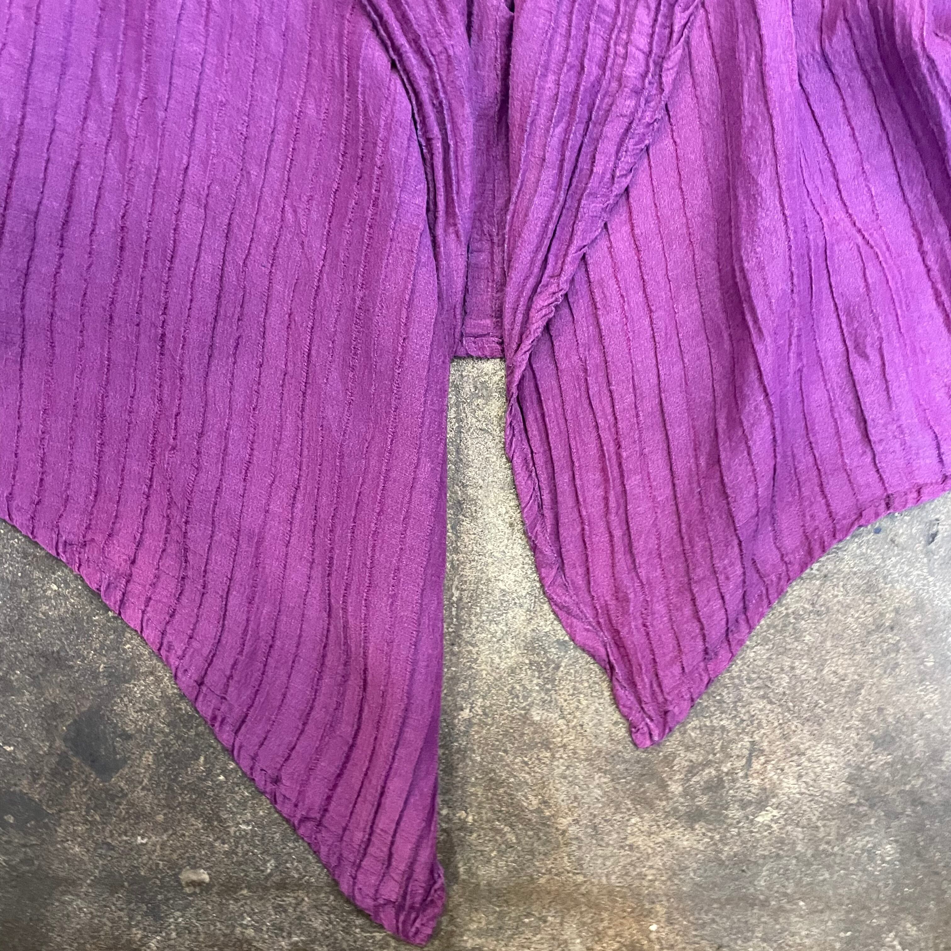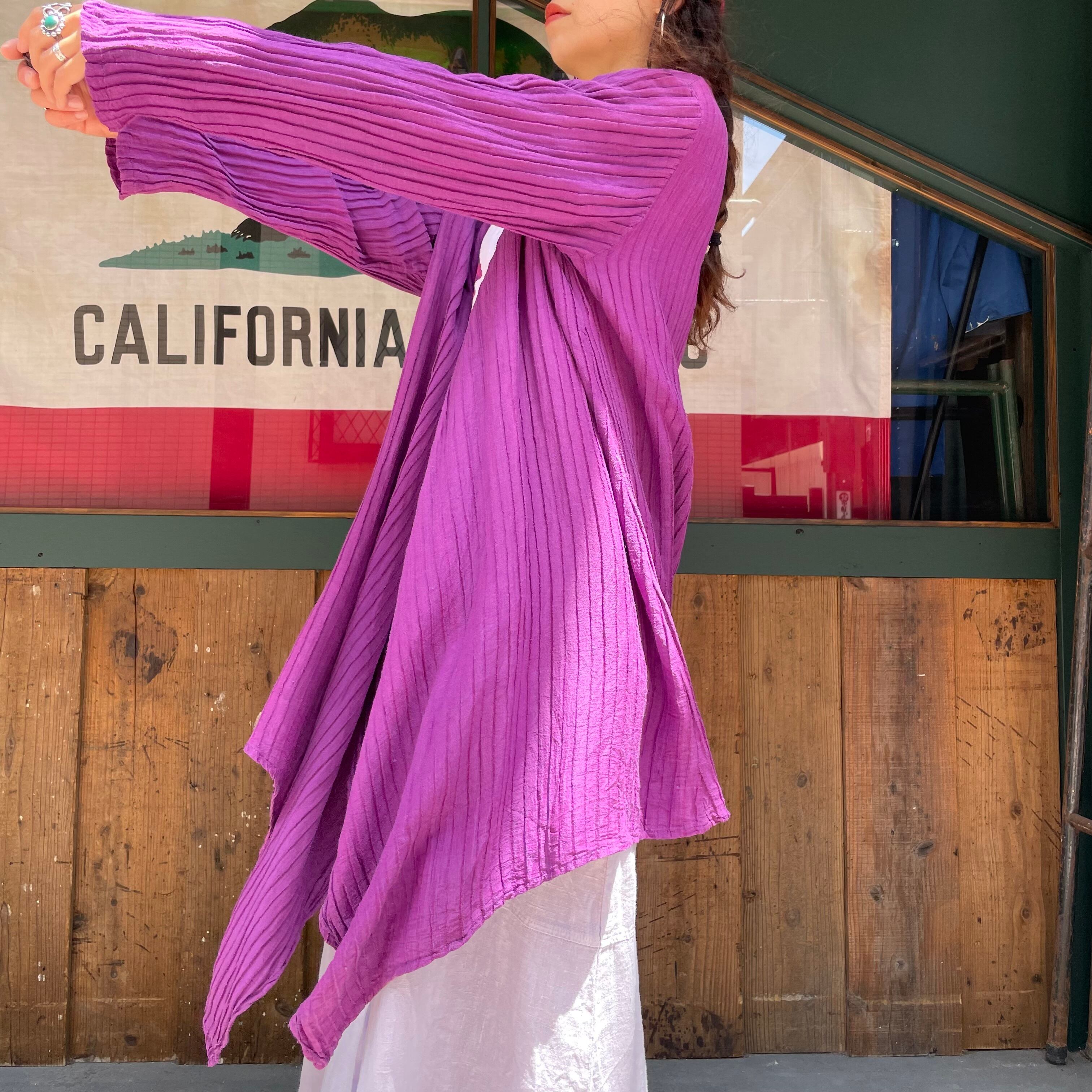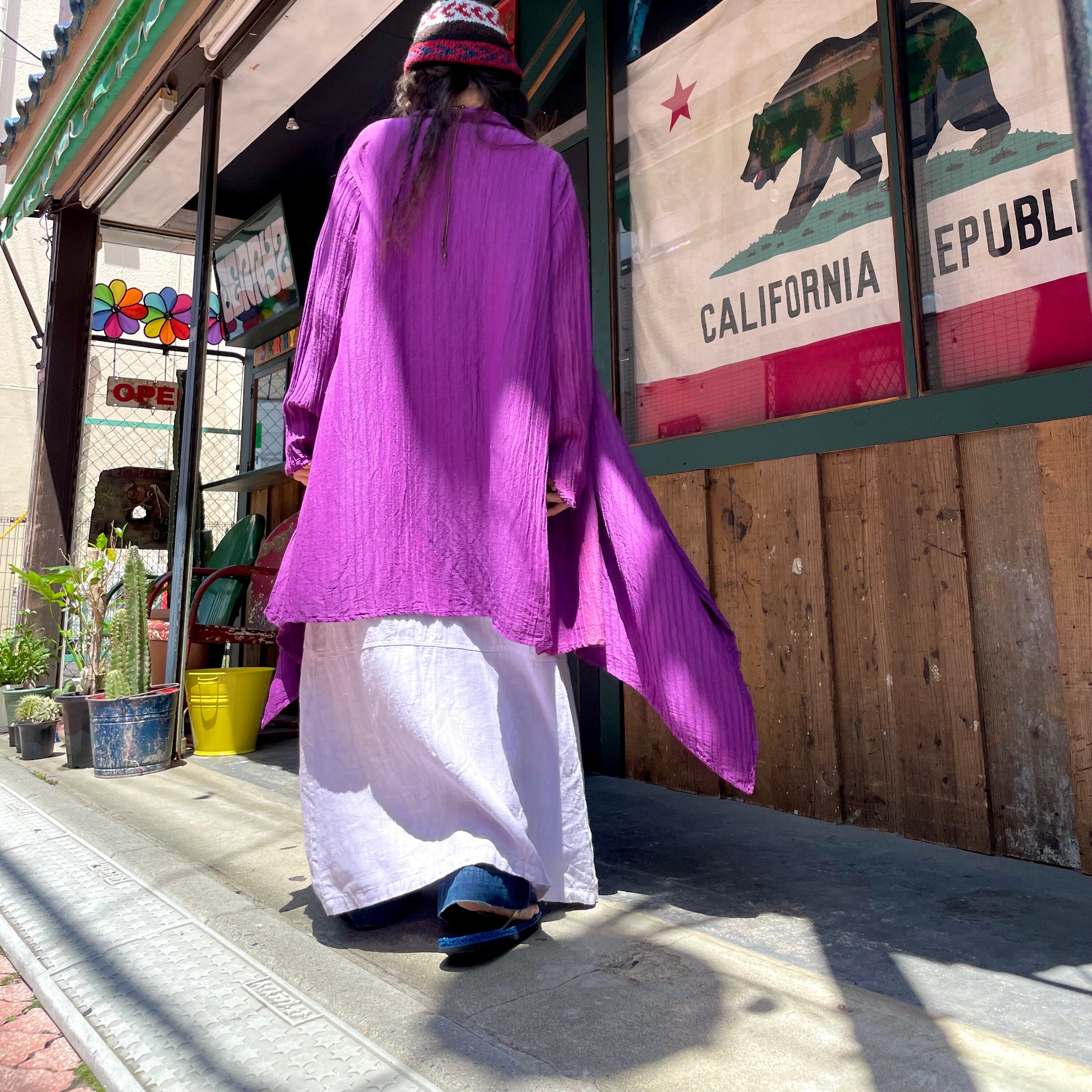 前下がりのデザインになっていて、裾がひらひらなびいてかわいいですね。ガウンより大袈裟でなくシャツより個性的な程よいバランスをもっている一着だと思います。