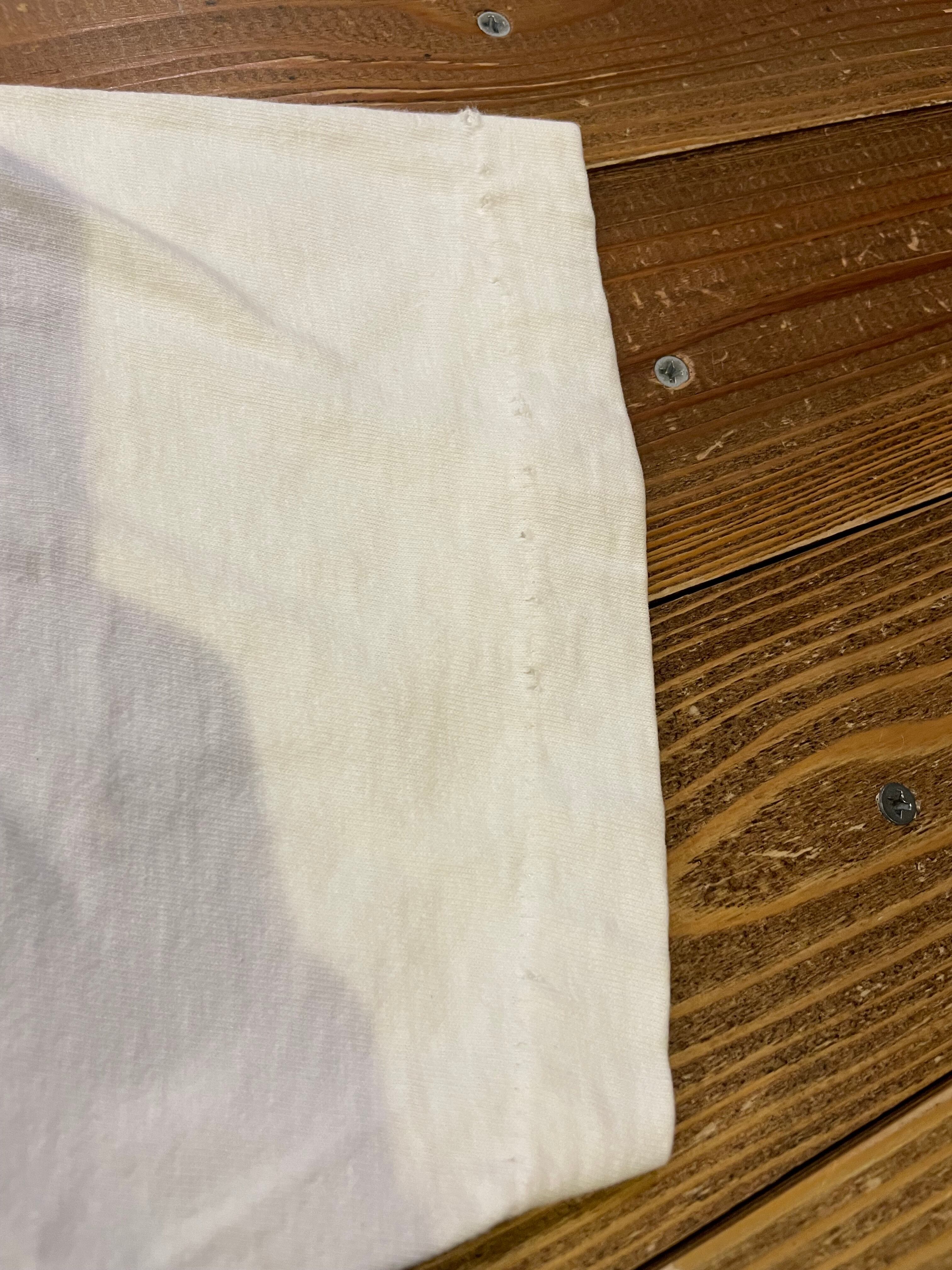 両袖口の傷や汚れ、襟ぐりの若干の黄ばみ、背中の生地の薄い箇所等ダメージのある商品です。