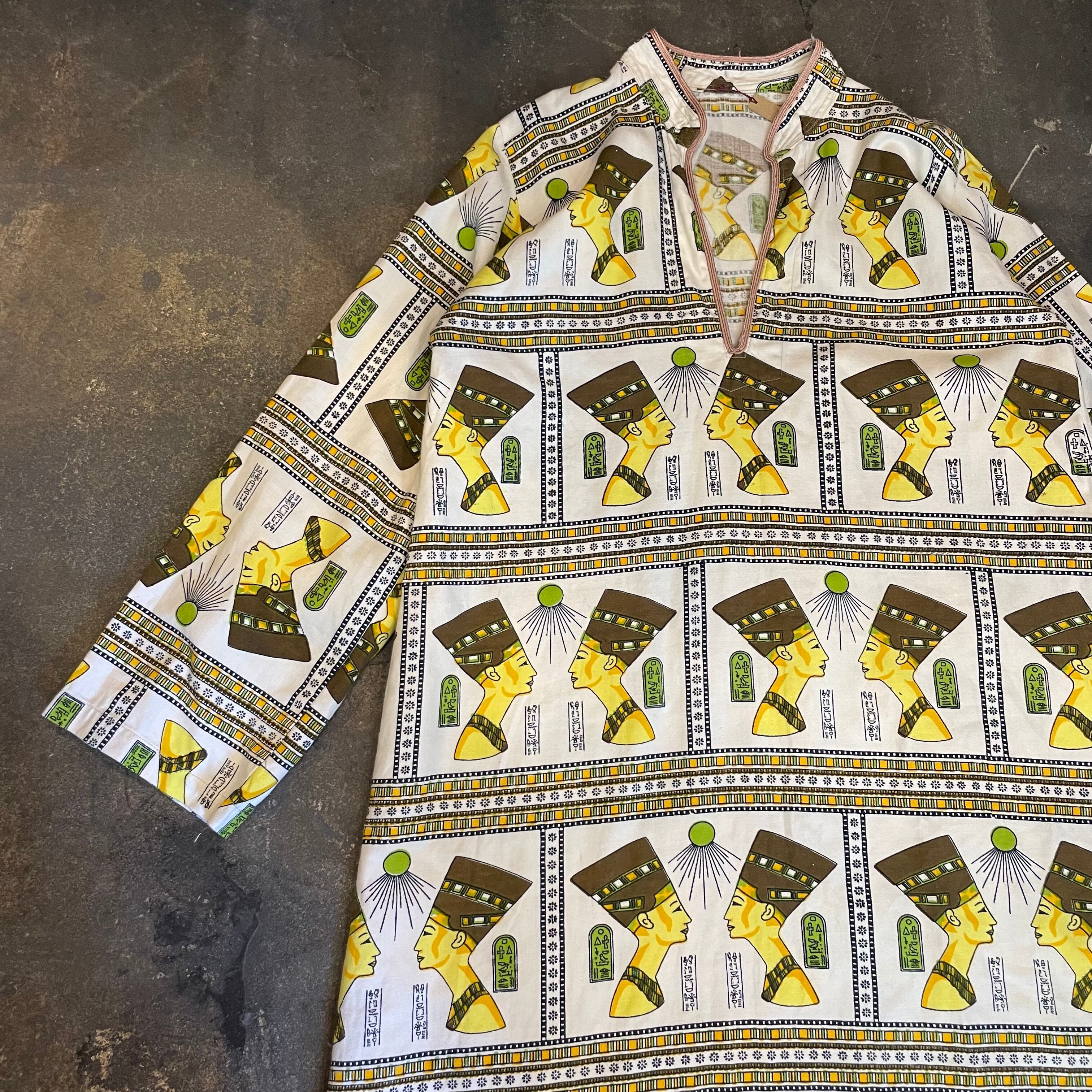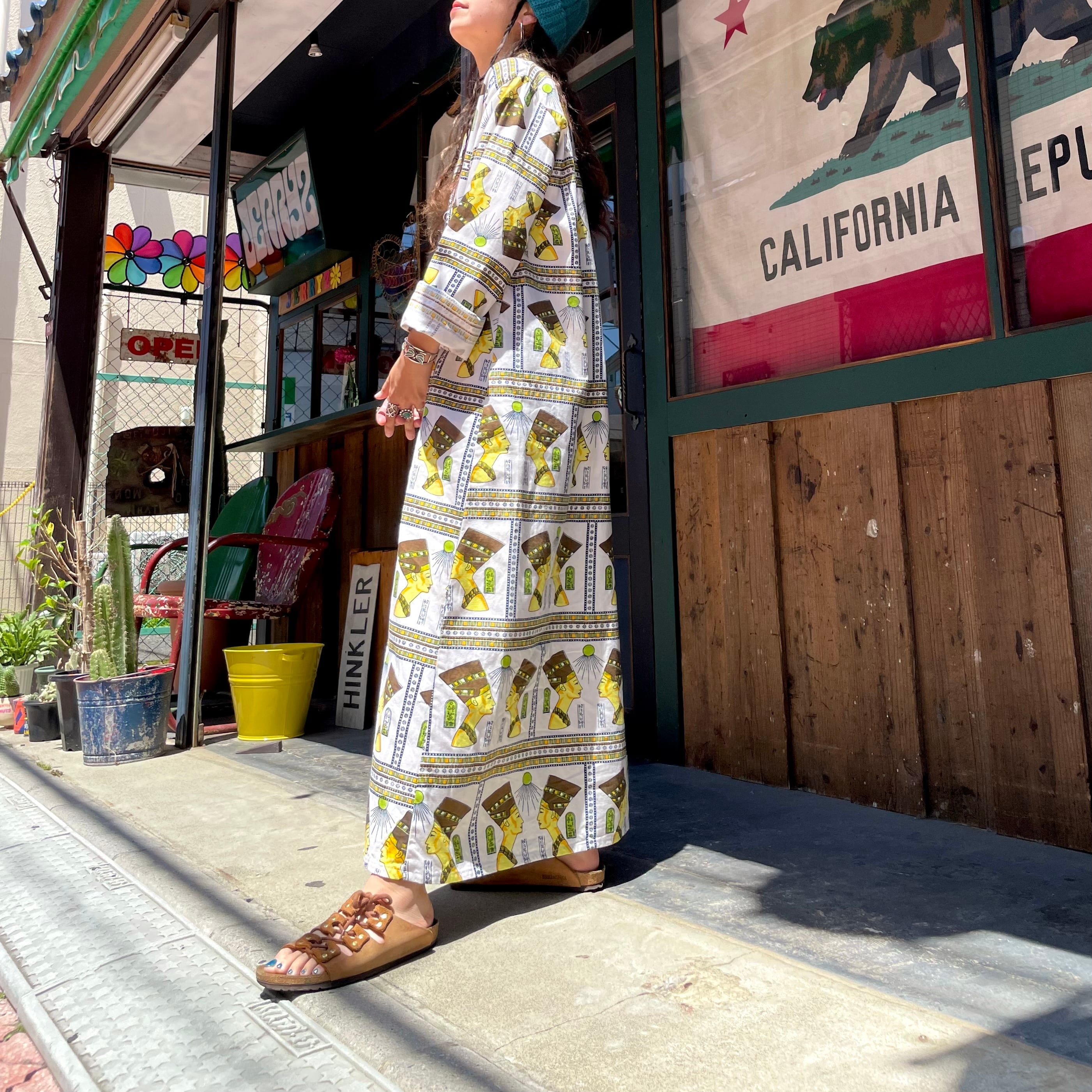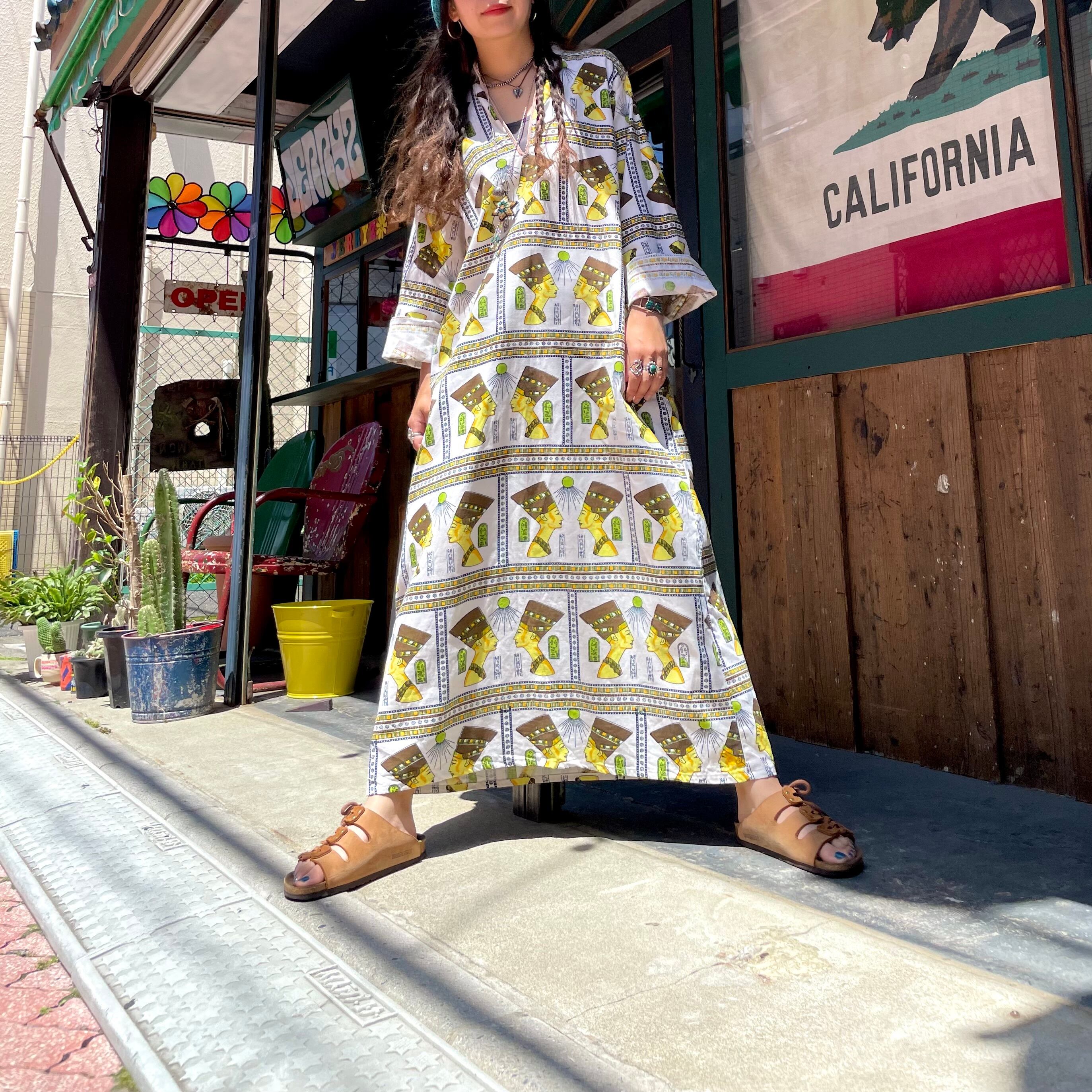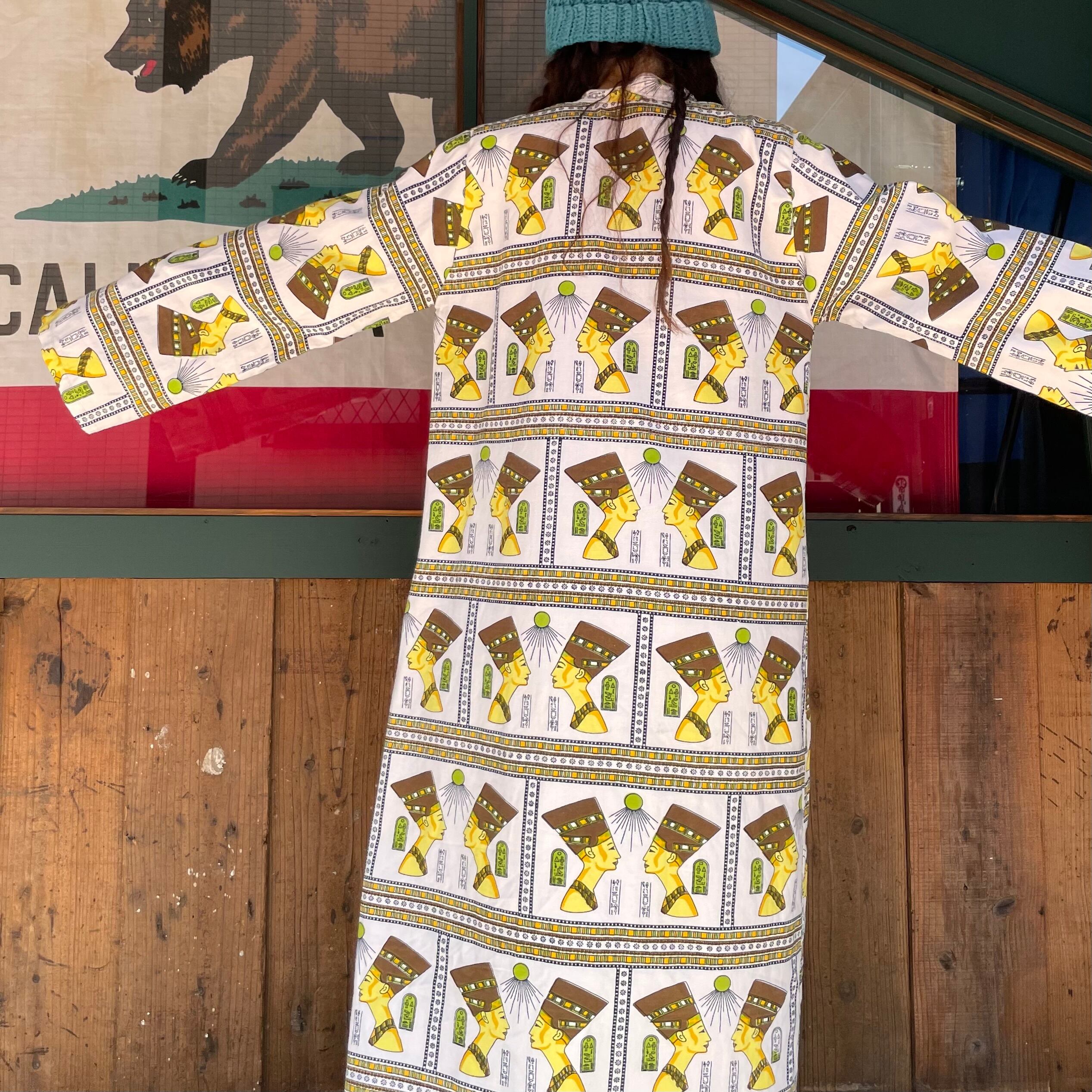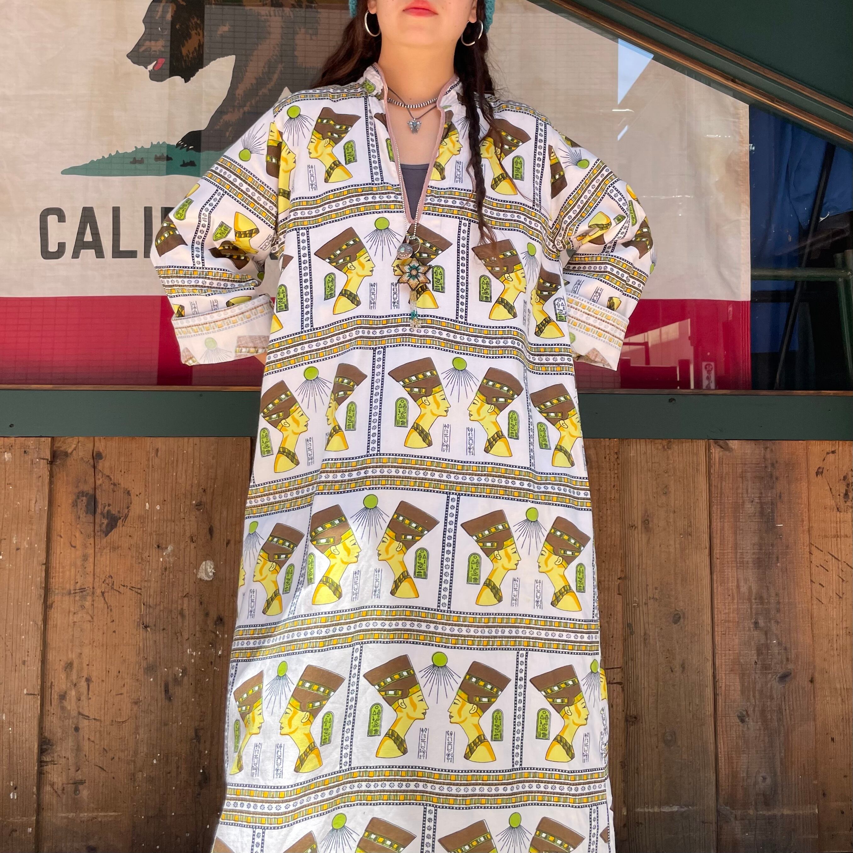 エジプトっぽい柄がインパクト抜群、不思議な雰囲気のワンピースです。