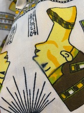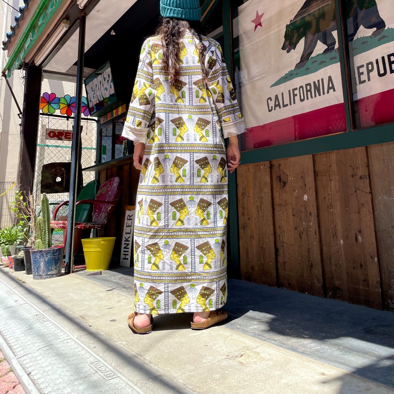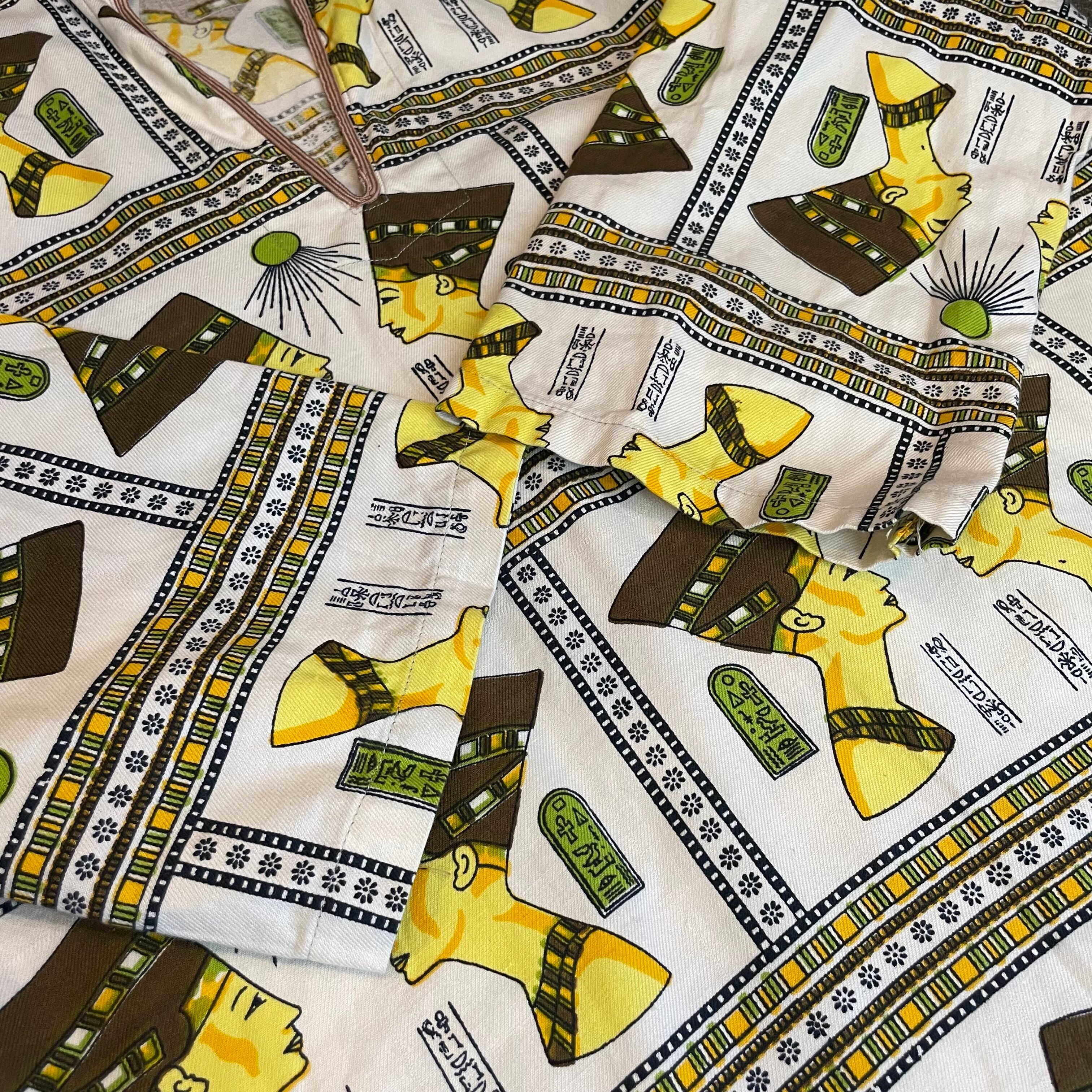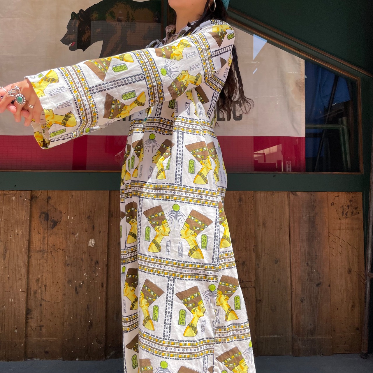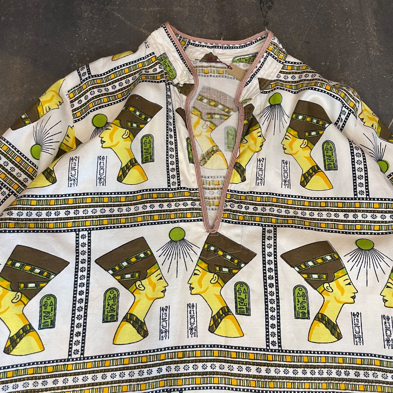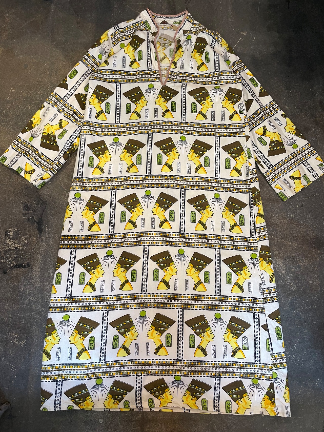 エジプトっぽい柄がインパクト抜群、不思議な雰囲気のワンピースです。
