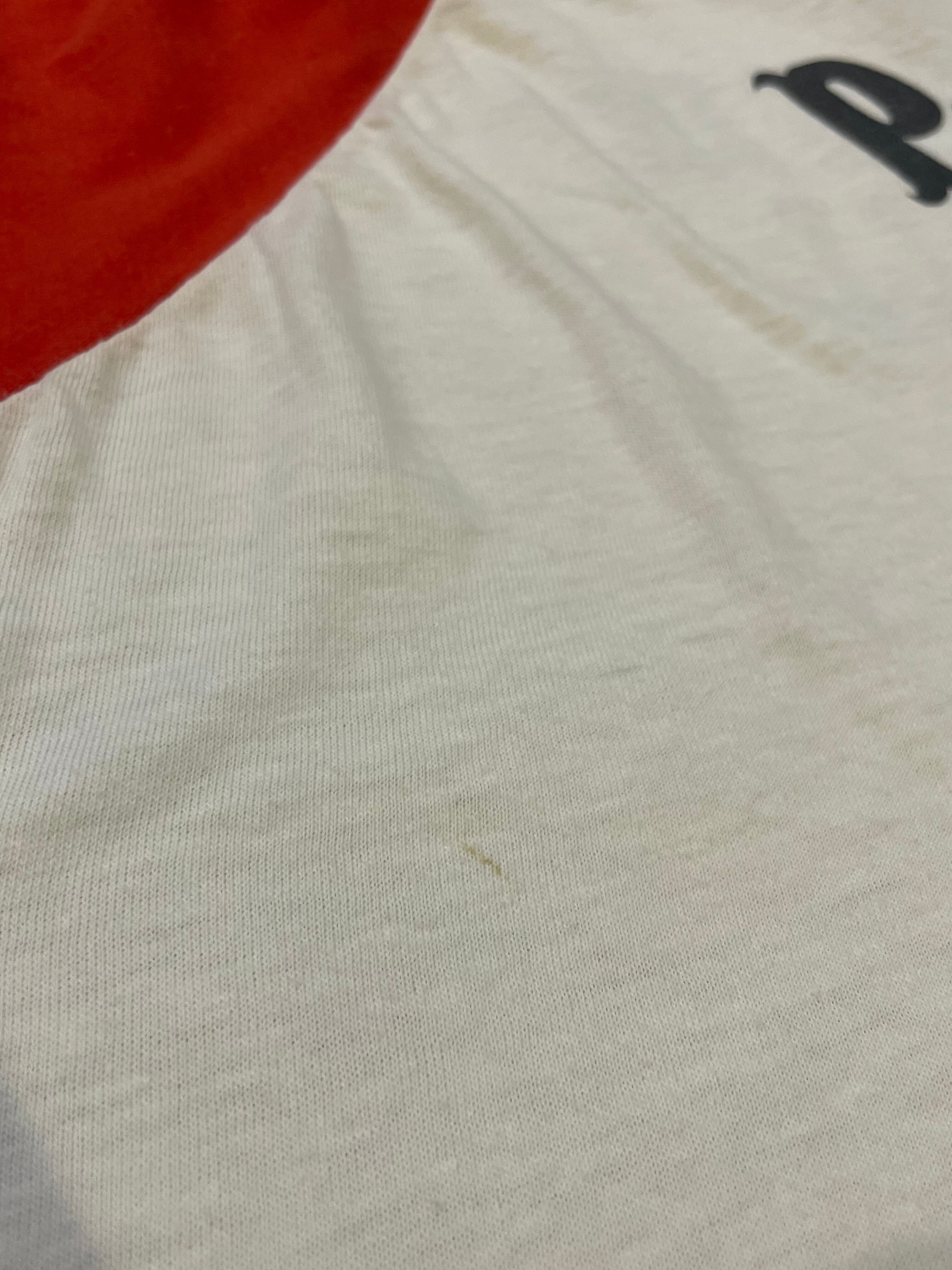前脇付近にシミ、袖に軽い毛羽立ち、ボディの歪み等使用感のある商品です。古着にご理解のある方のご購入をお願い致します。