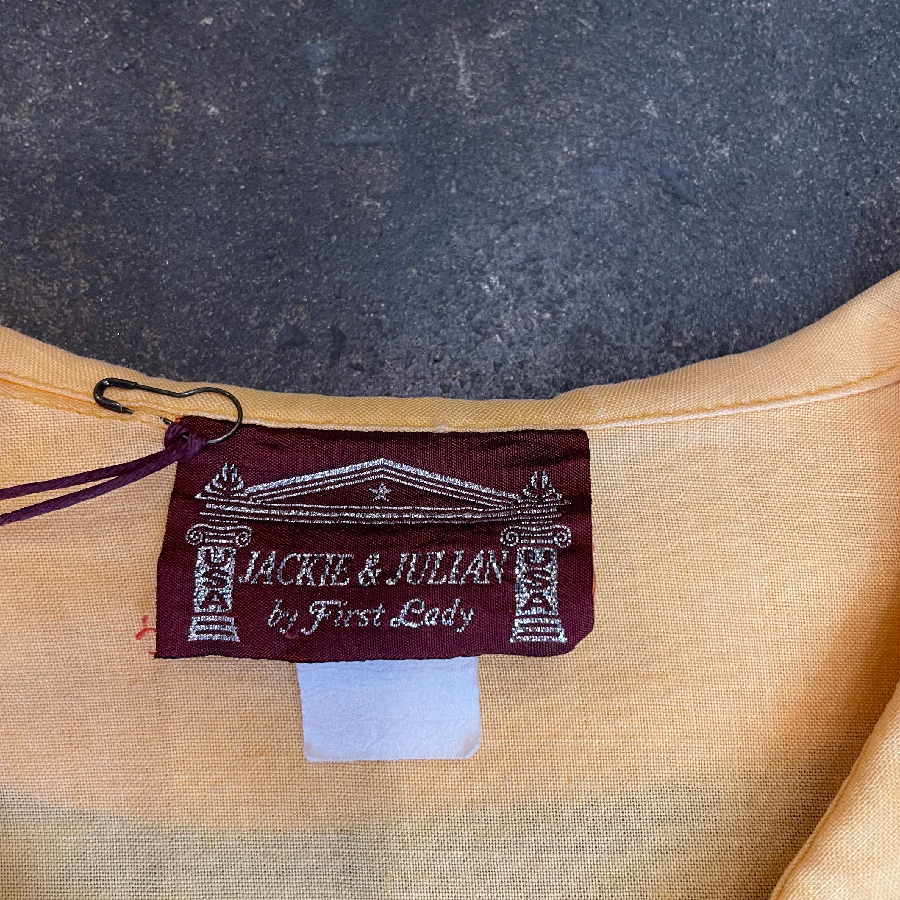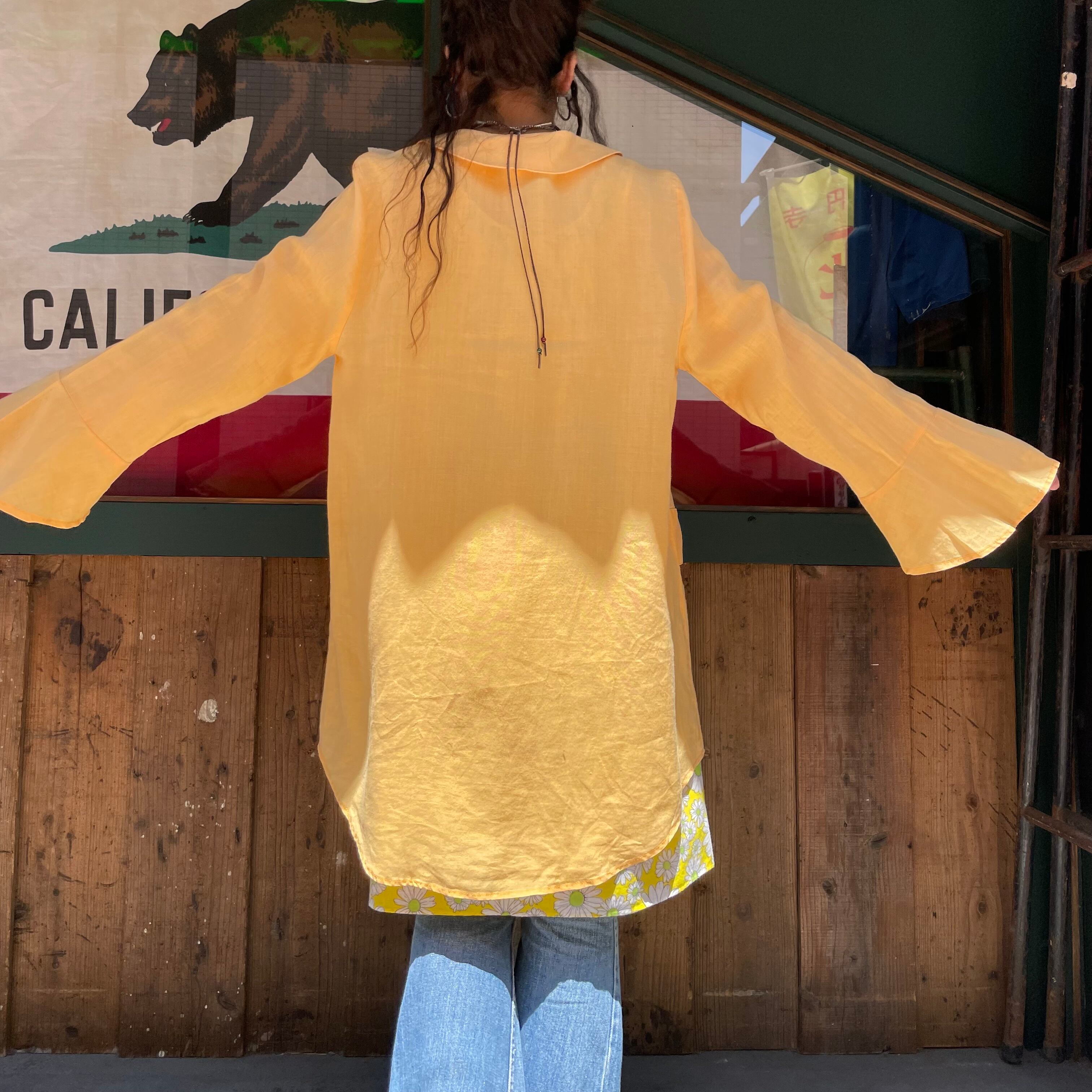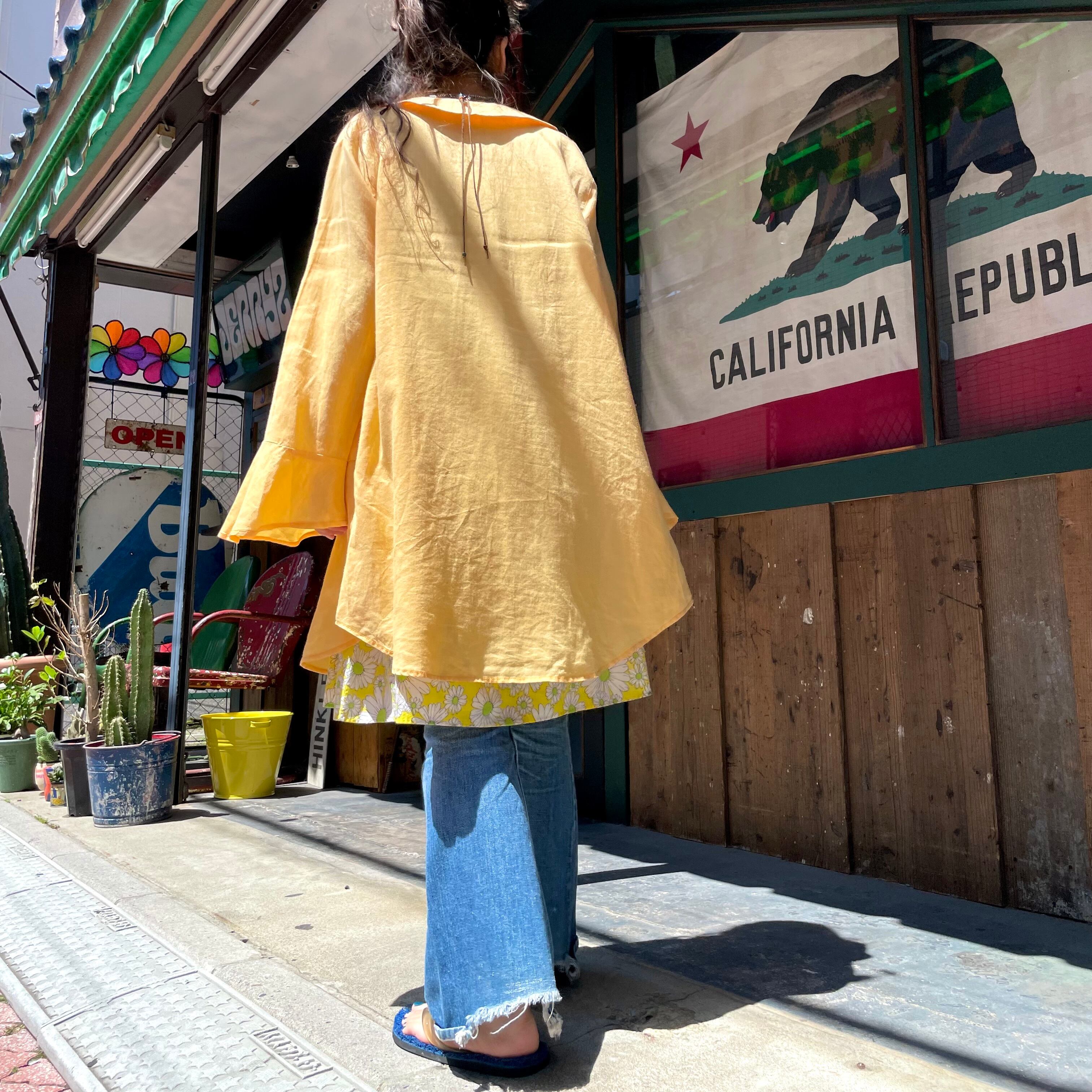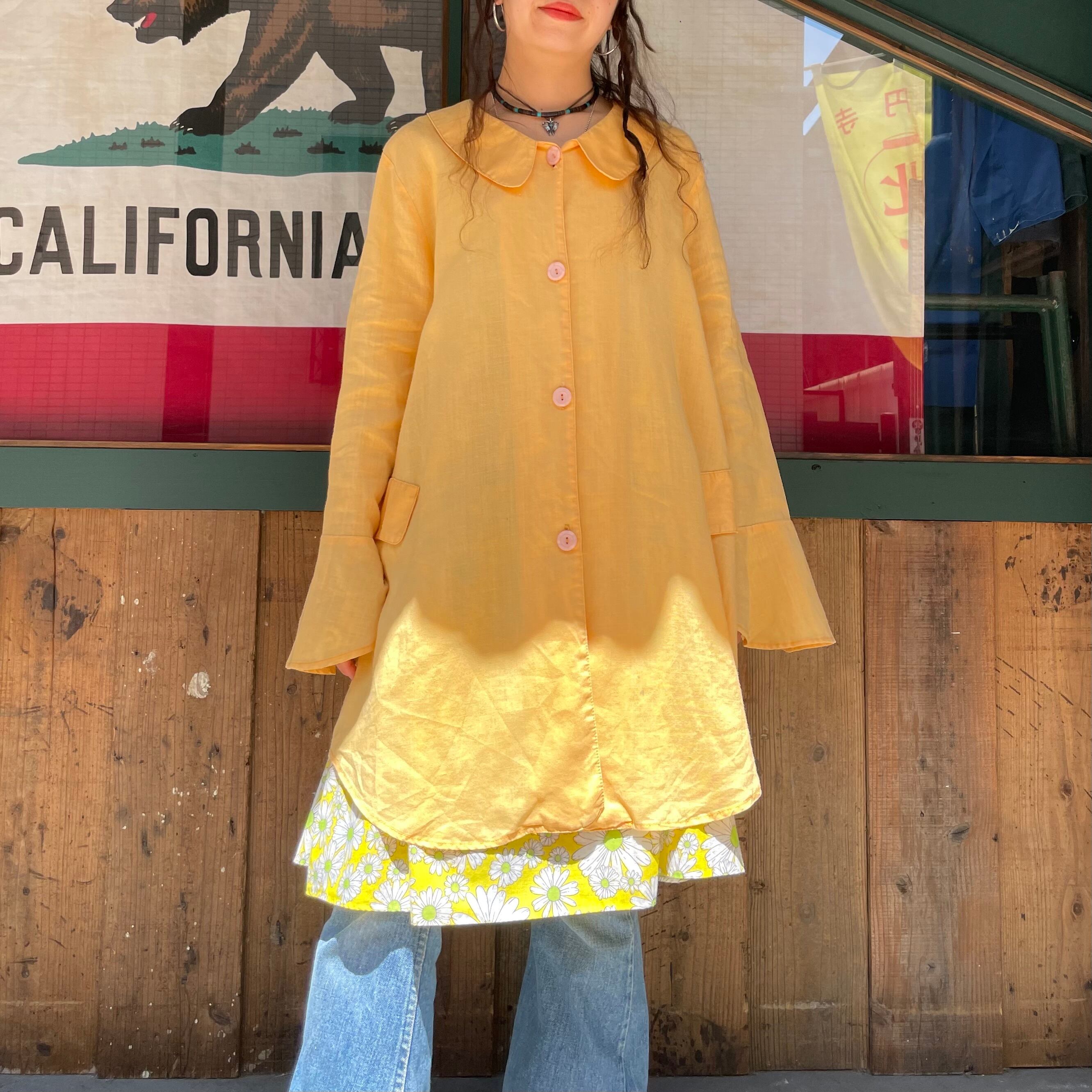 襟ぐり広めで襟は丸く、袖口フレアになっていて、裾のサイドは丸くラウンドしていてワンピースというよりは羽織りのようなデザインです。