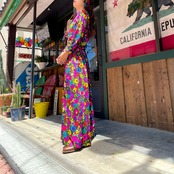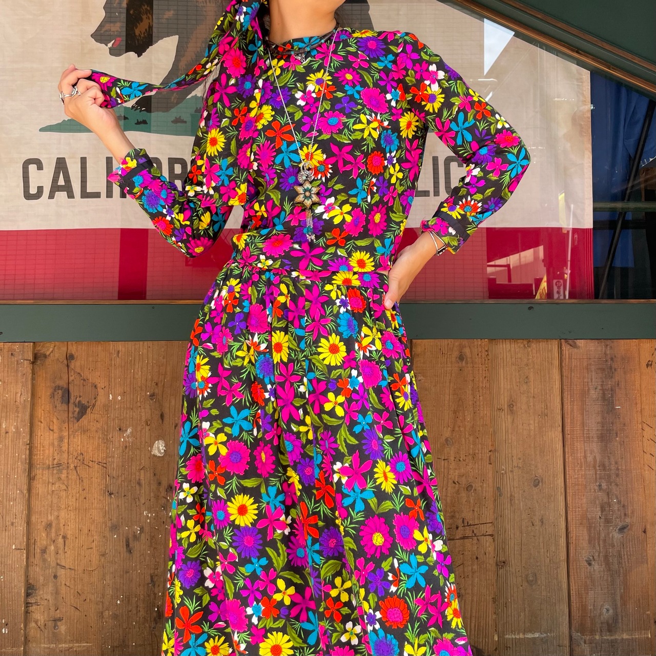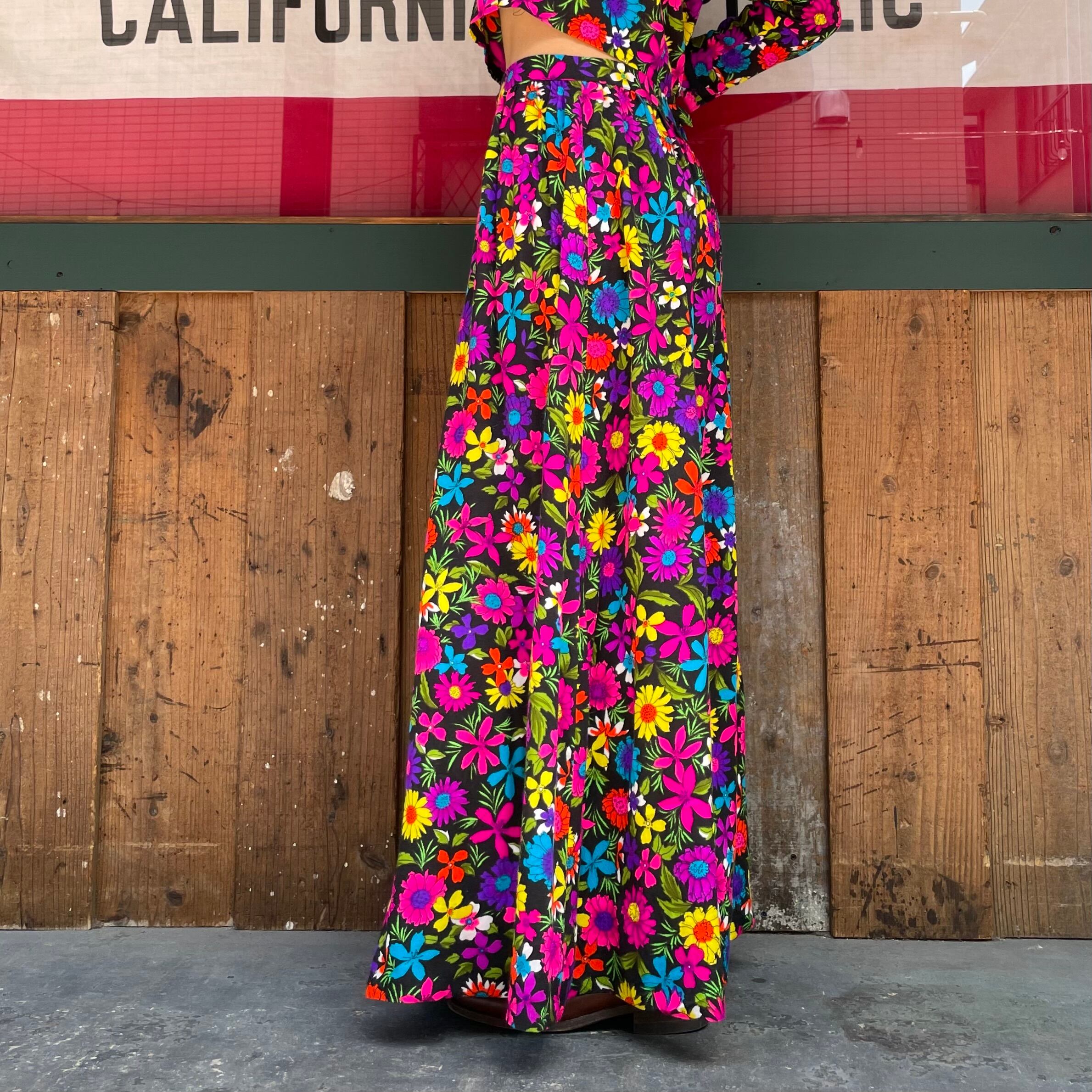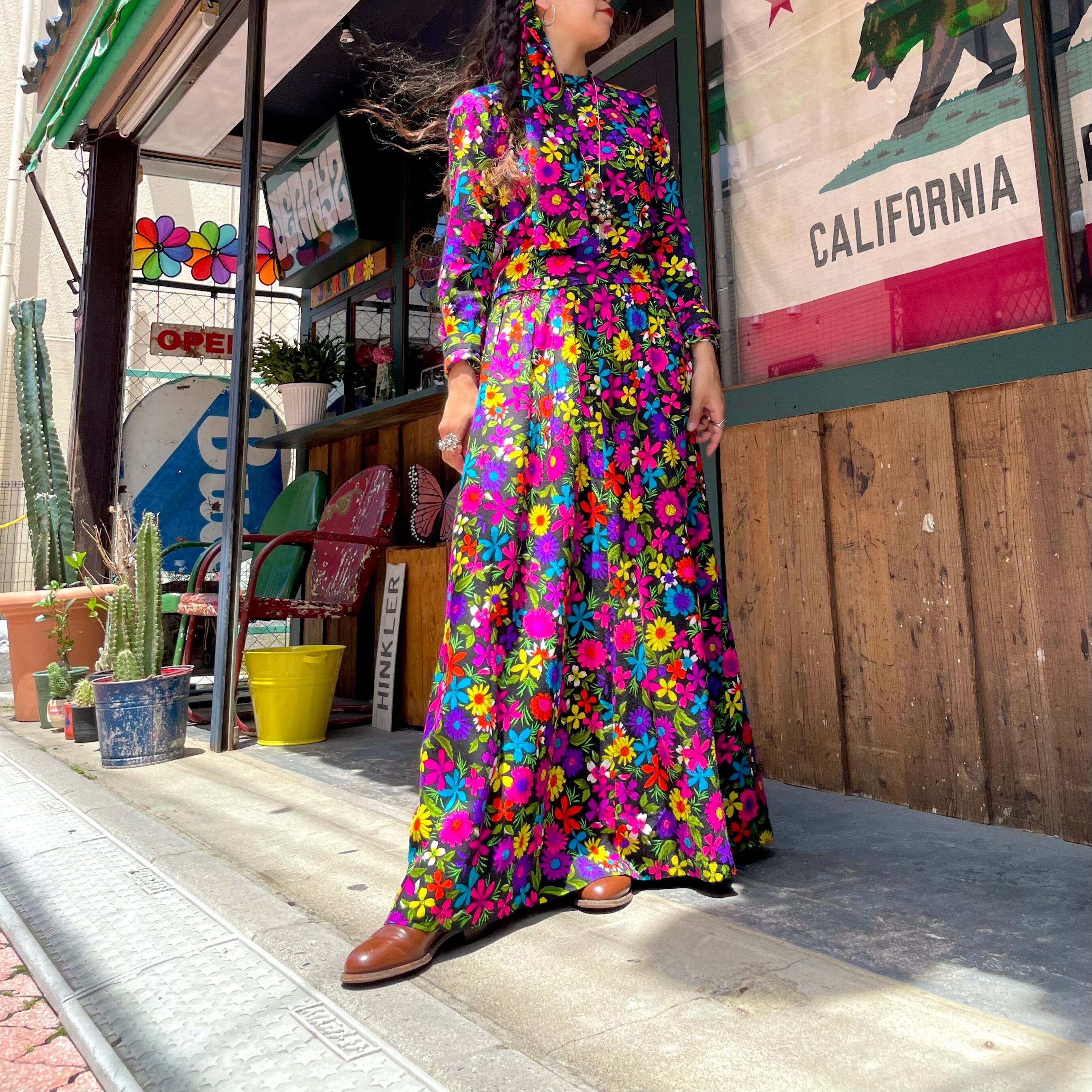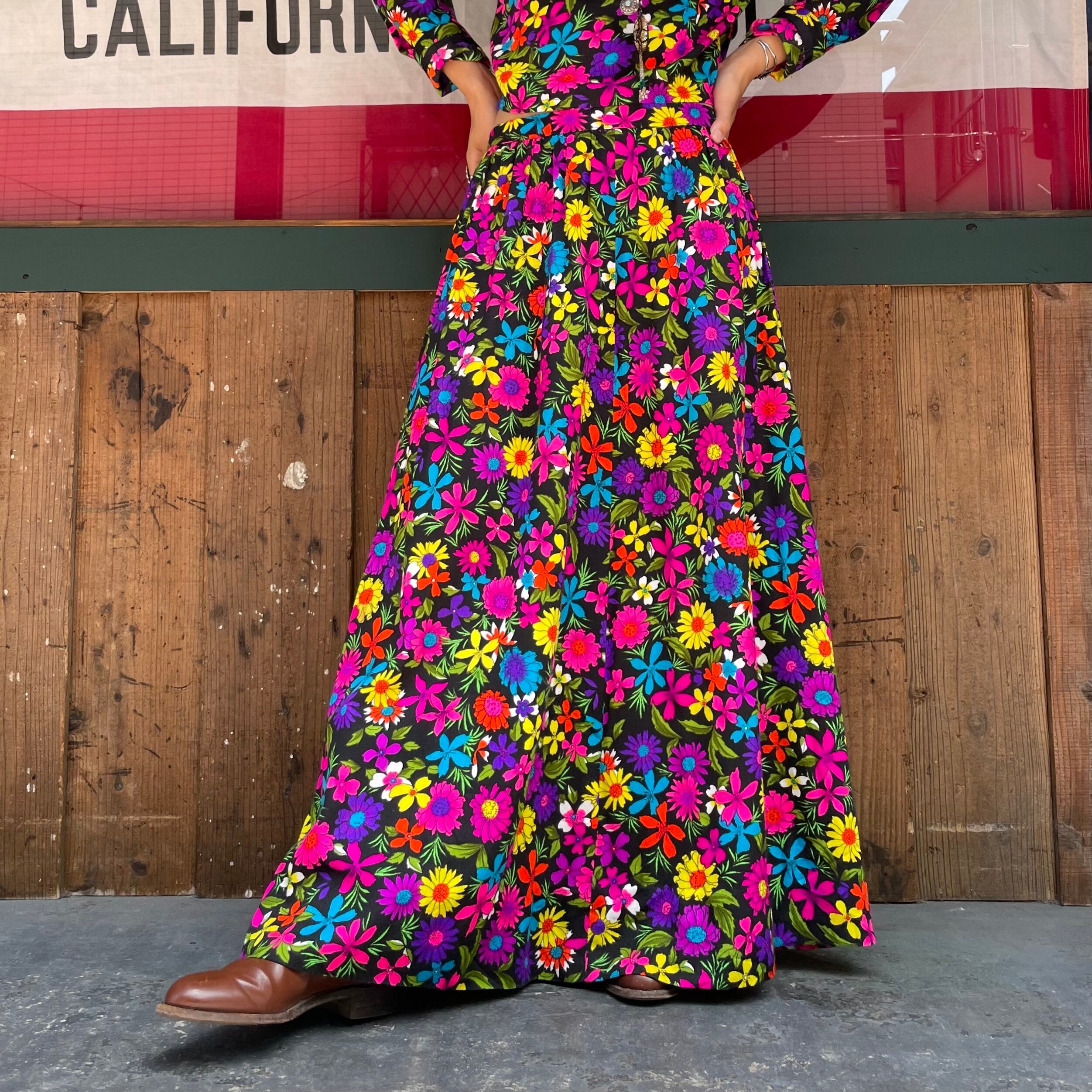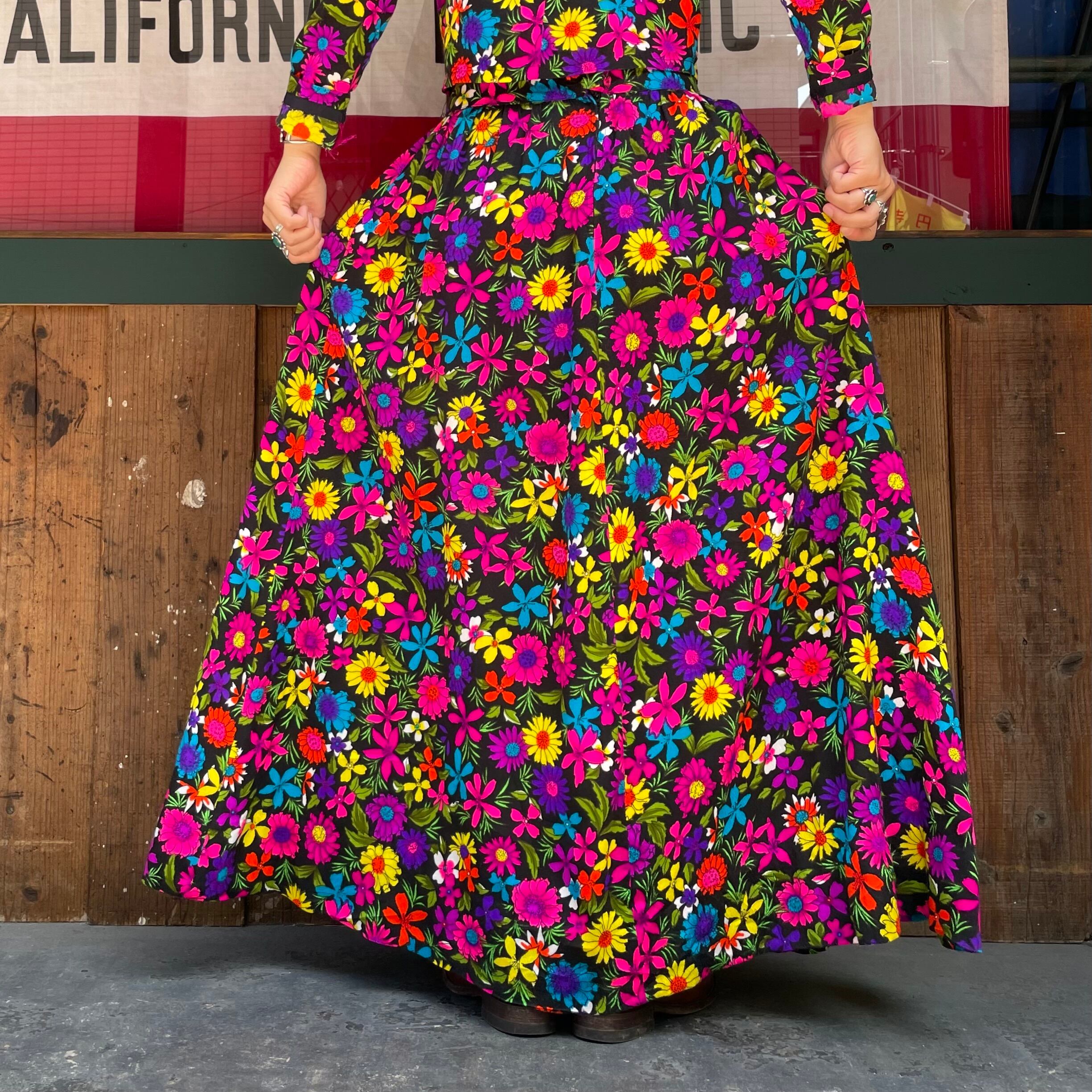 コンパクトなサイズ感と短い着丈がかわいい長袖のトップスと、きれいなAラインシルエットのロングスカート、太めで長めな紐のついた70年代頃のセットアップになります。