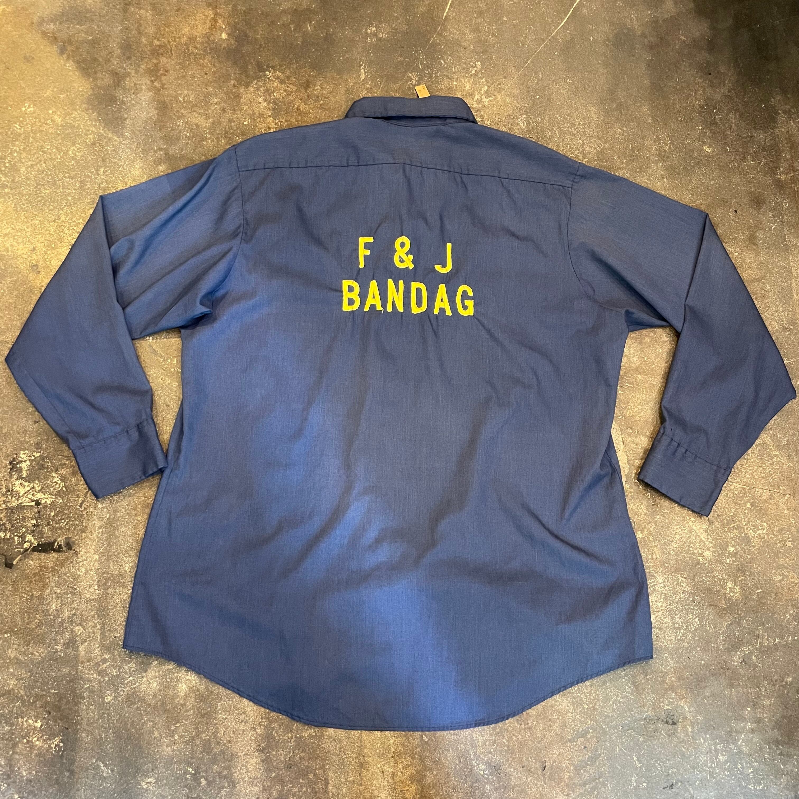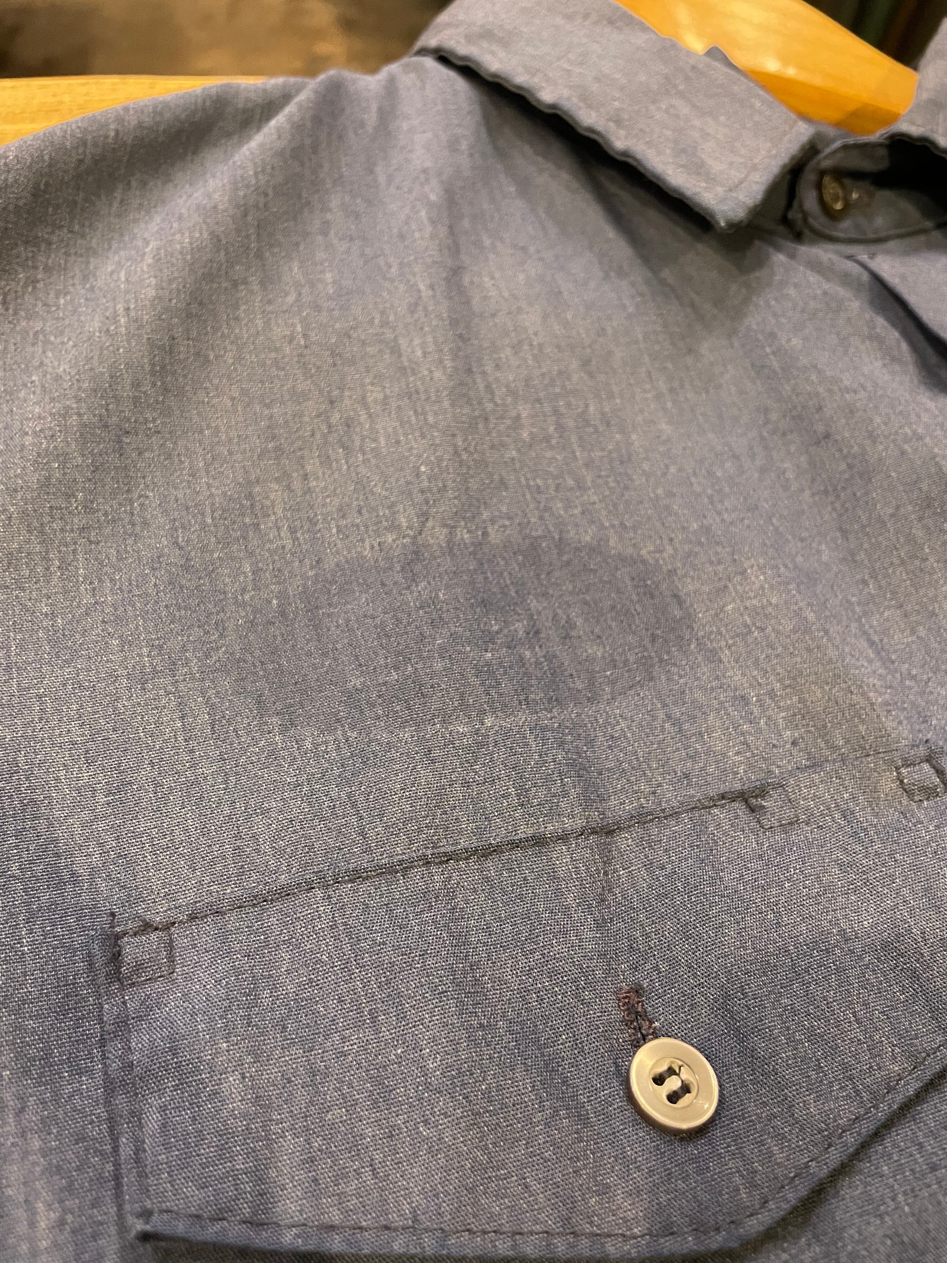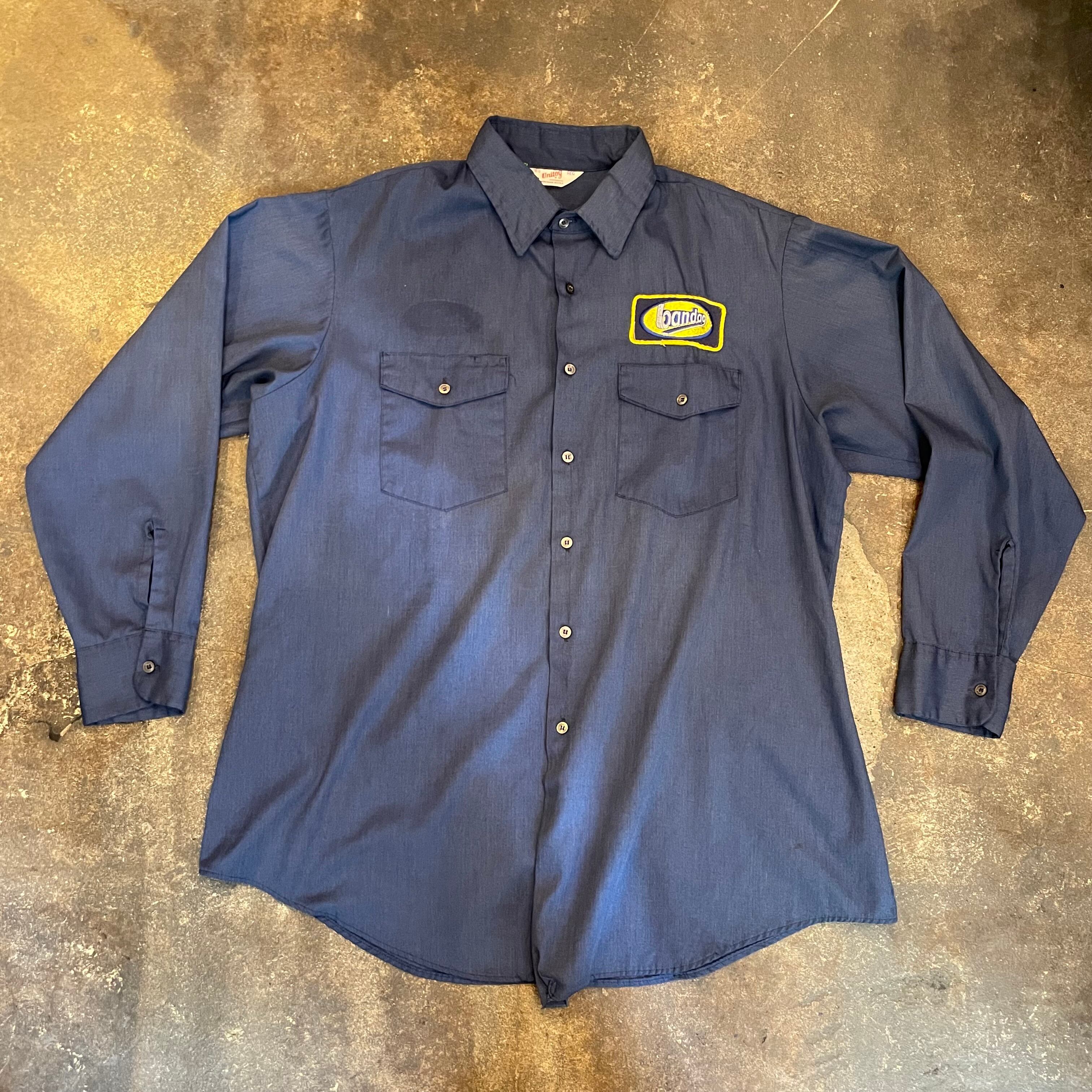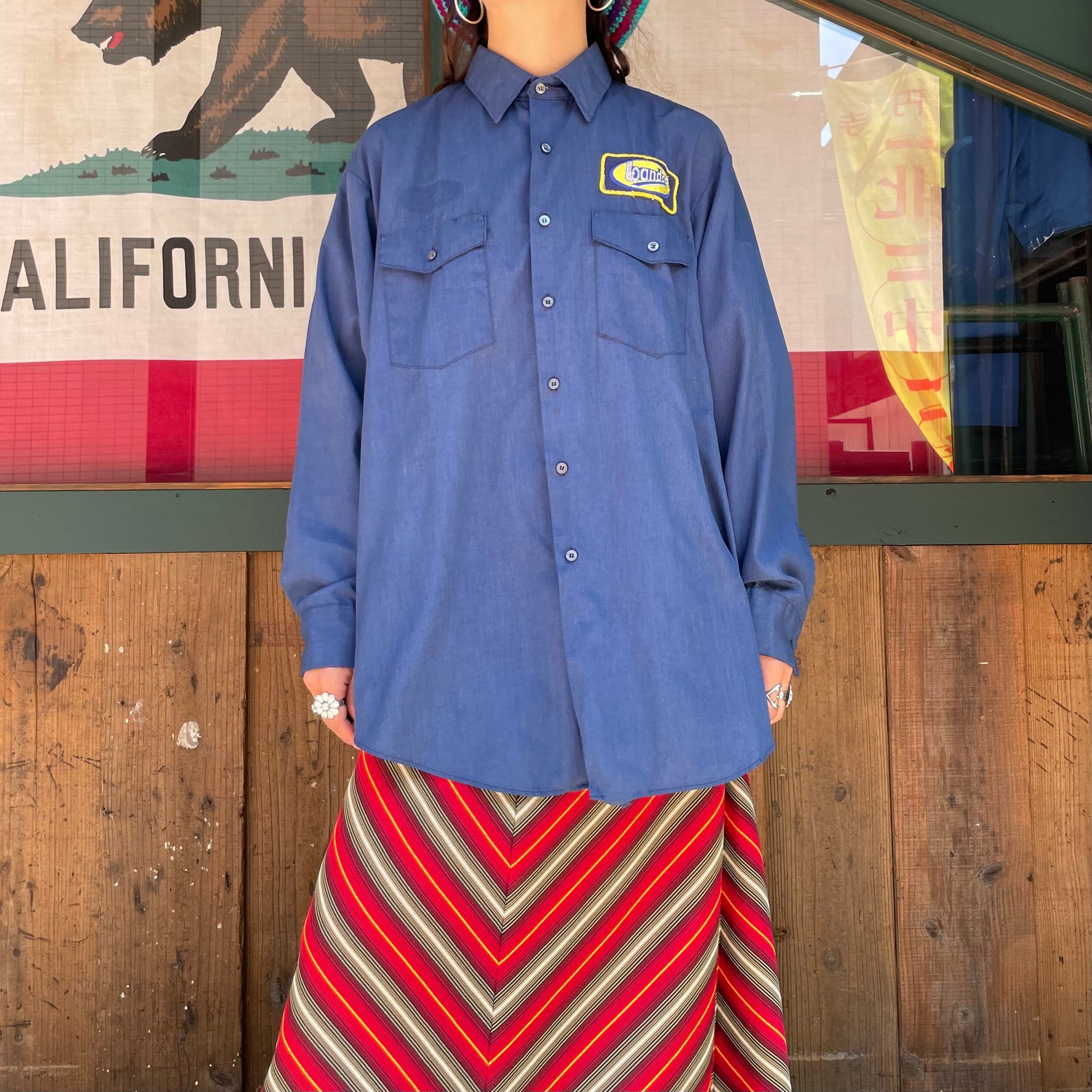 胸元のワッペン、背中の刺繍、ネイビー×黄色の配色がかっこいい80年代以降USA製のワークシャツです。
