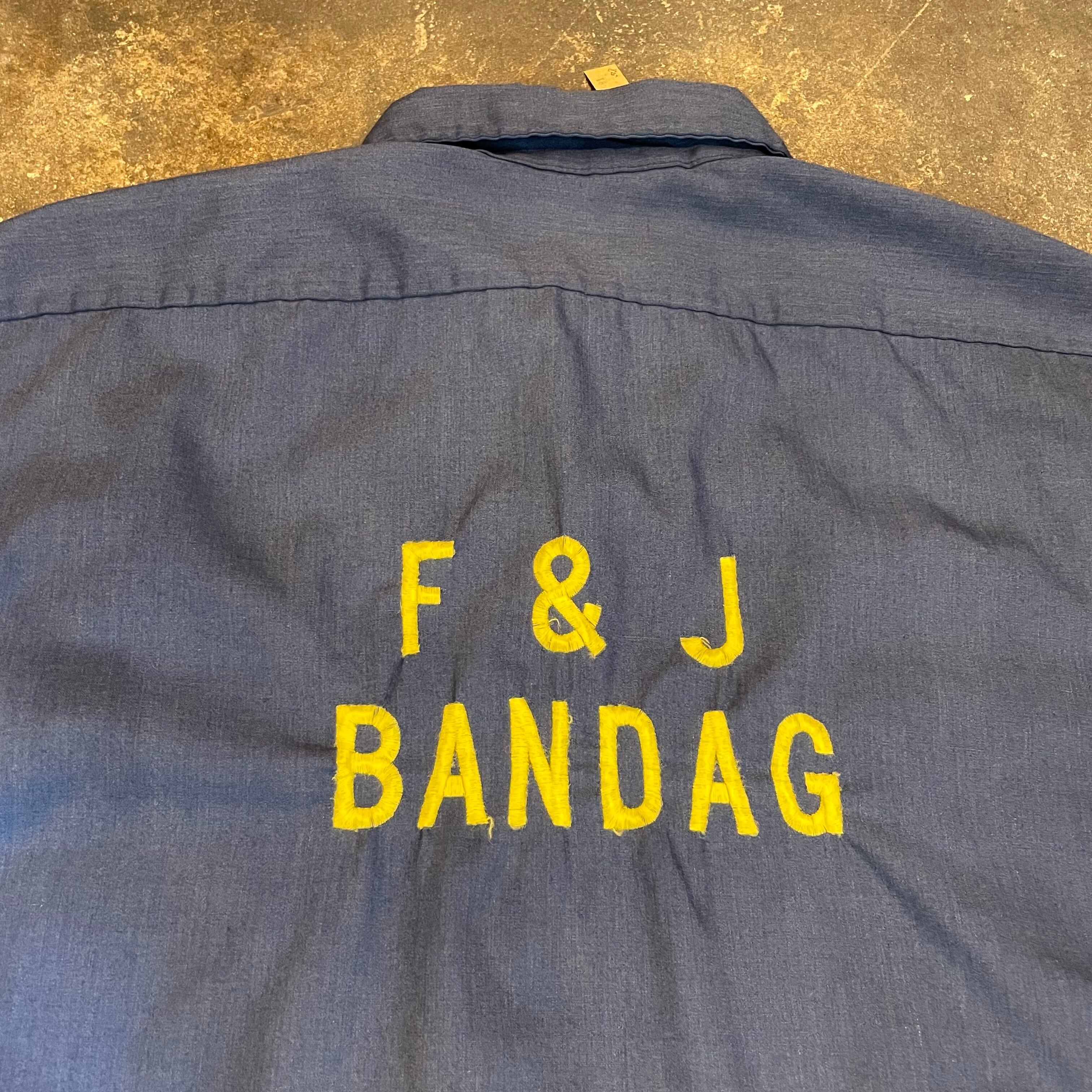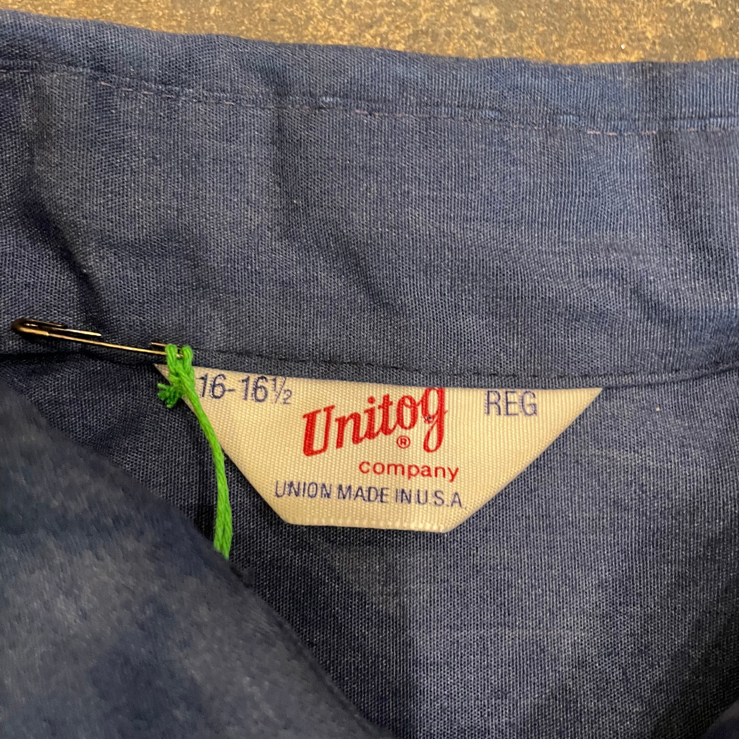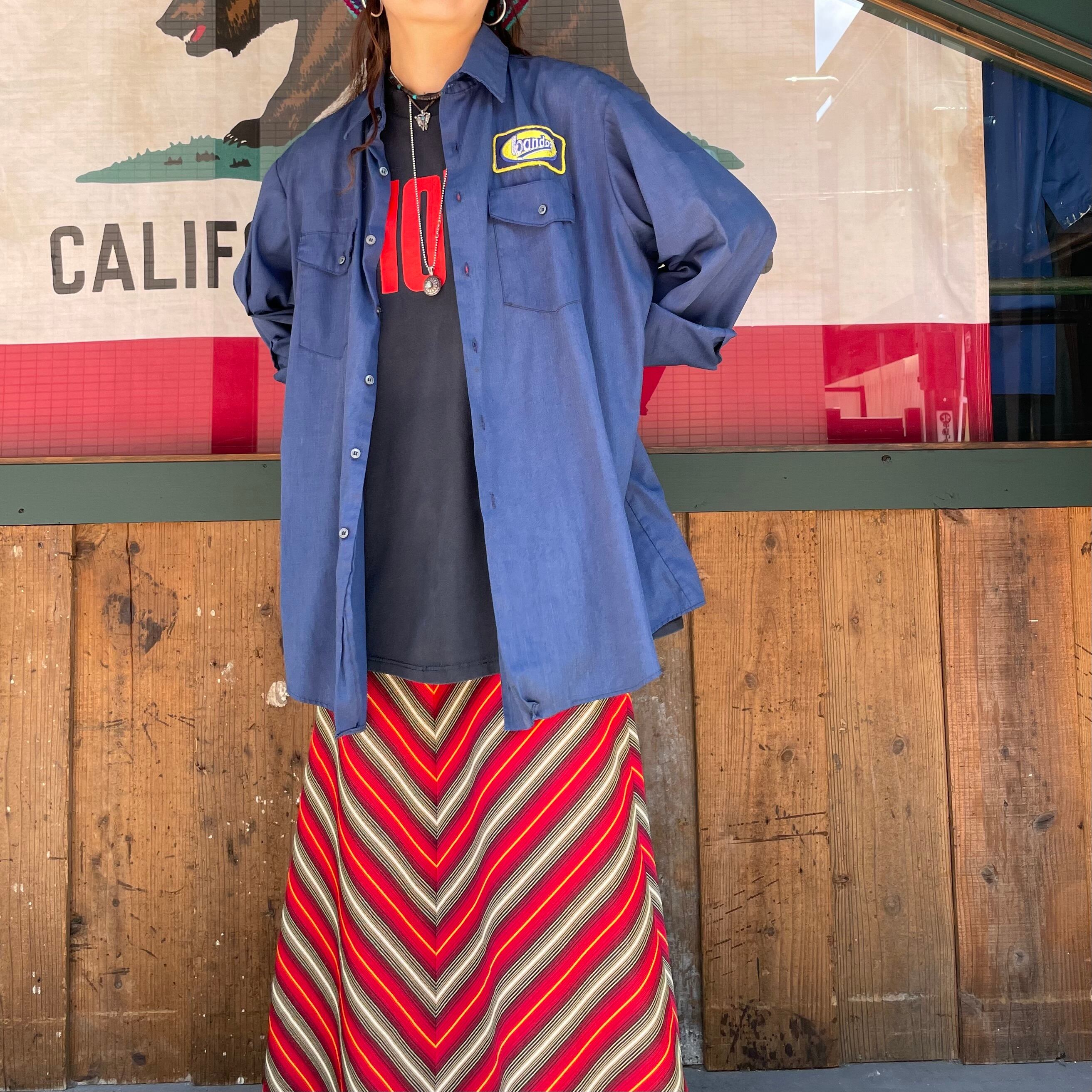 胸元のワッペン、背中の刺繍、ネイビー×黄色の配色がかっこいい80年代以降USA製のワークシャツです。