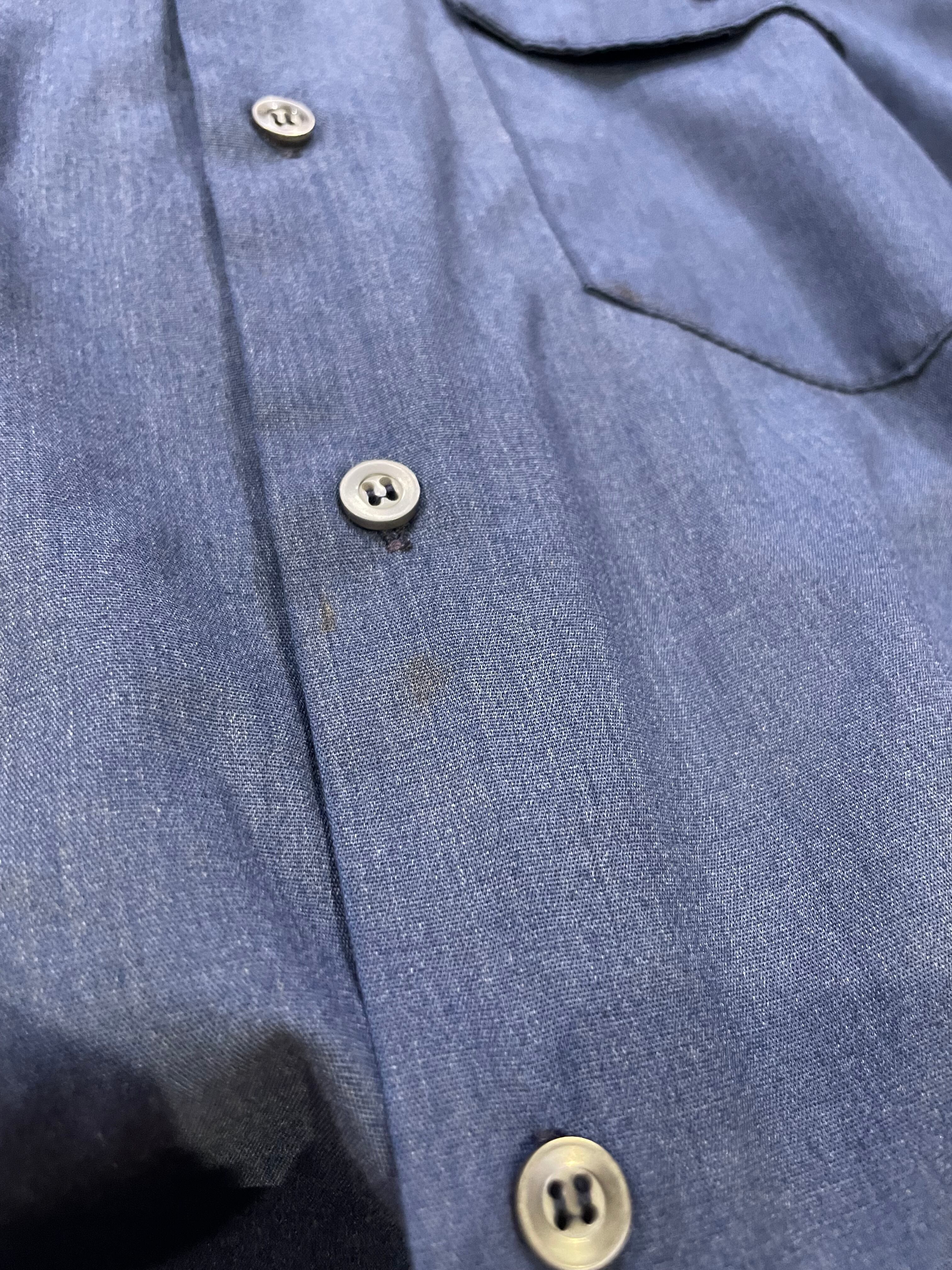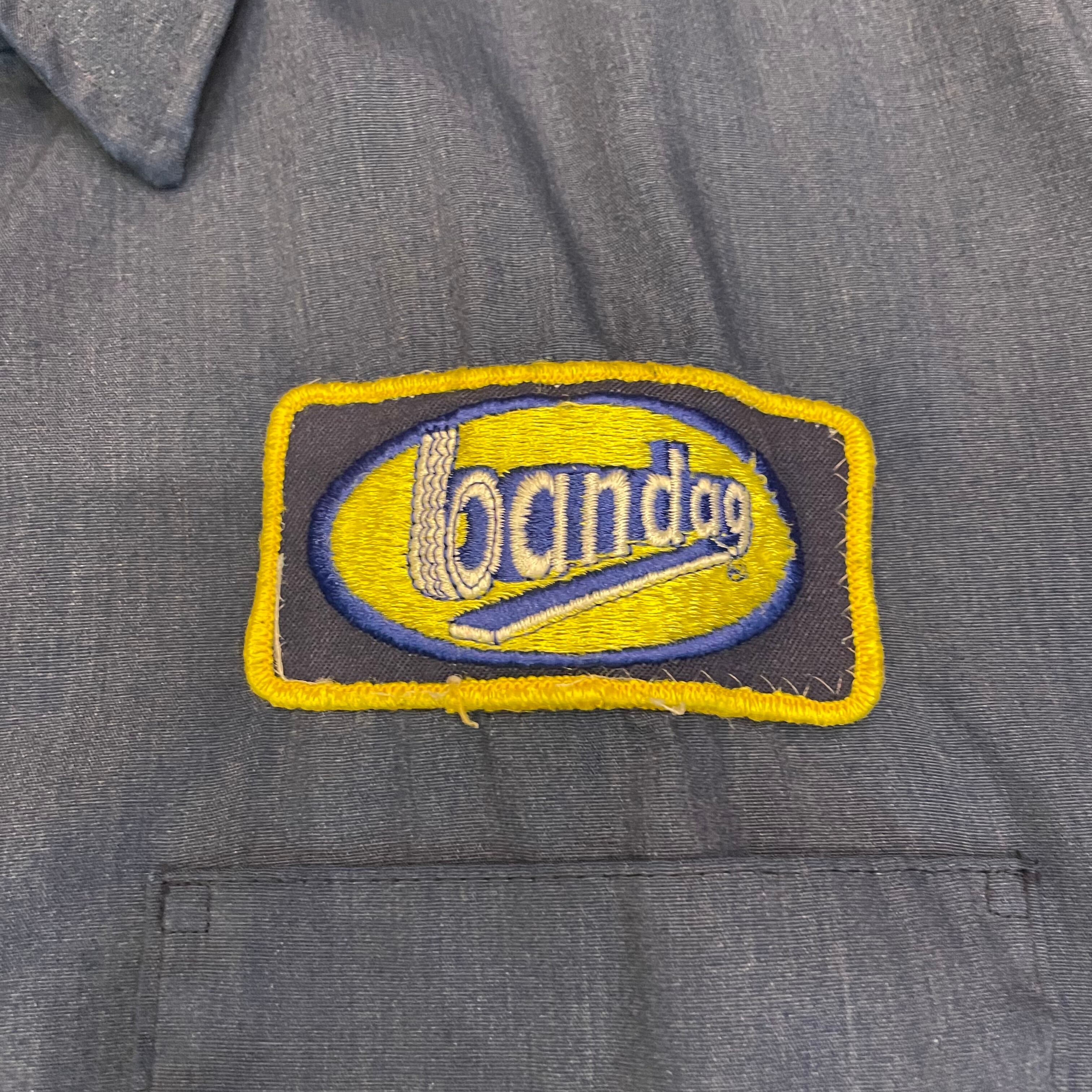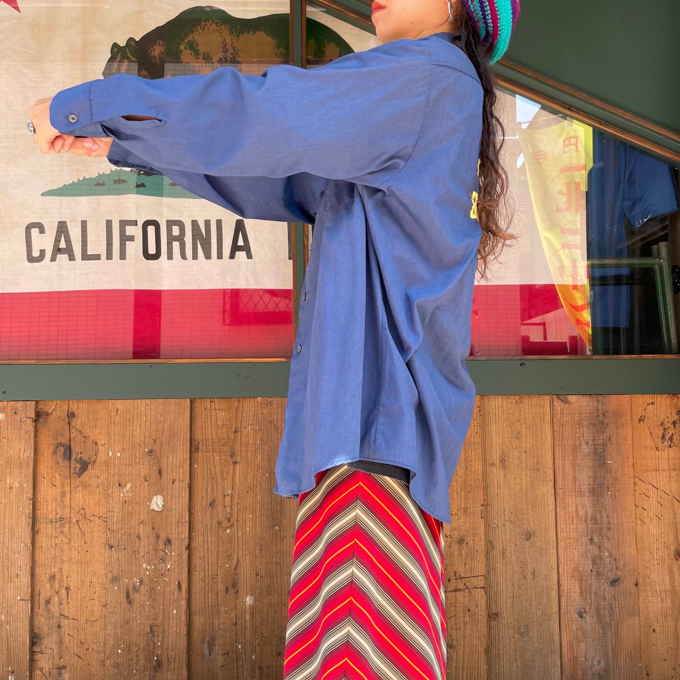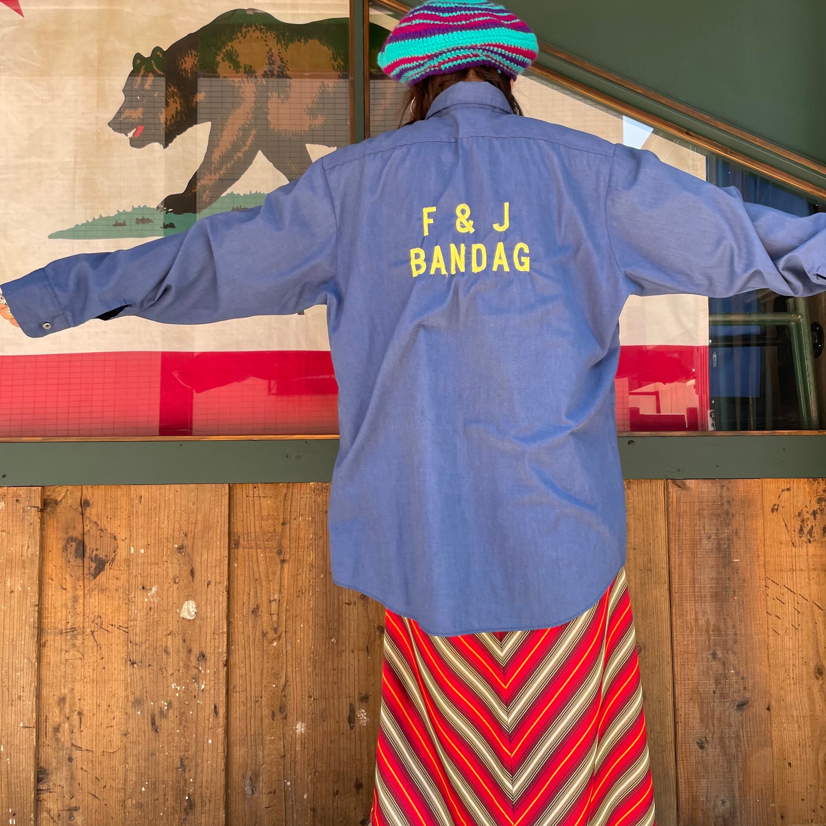 胸元のワッペン、背中の刺繍、ネイビー×黄色の配色がかっこいい80年代以降USA製のワークシャツです。