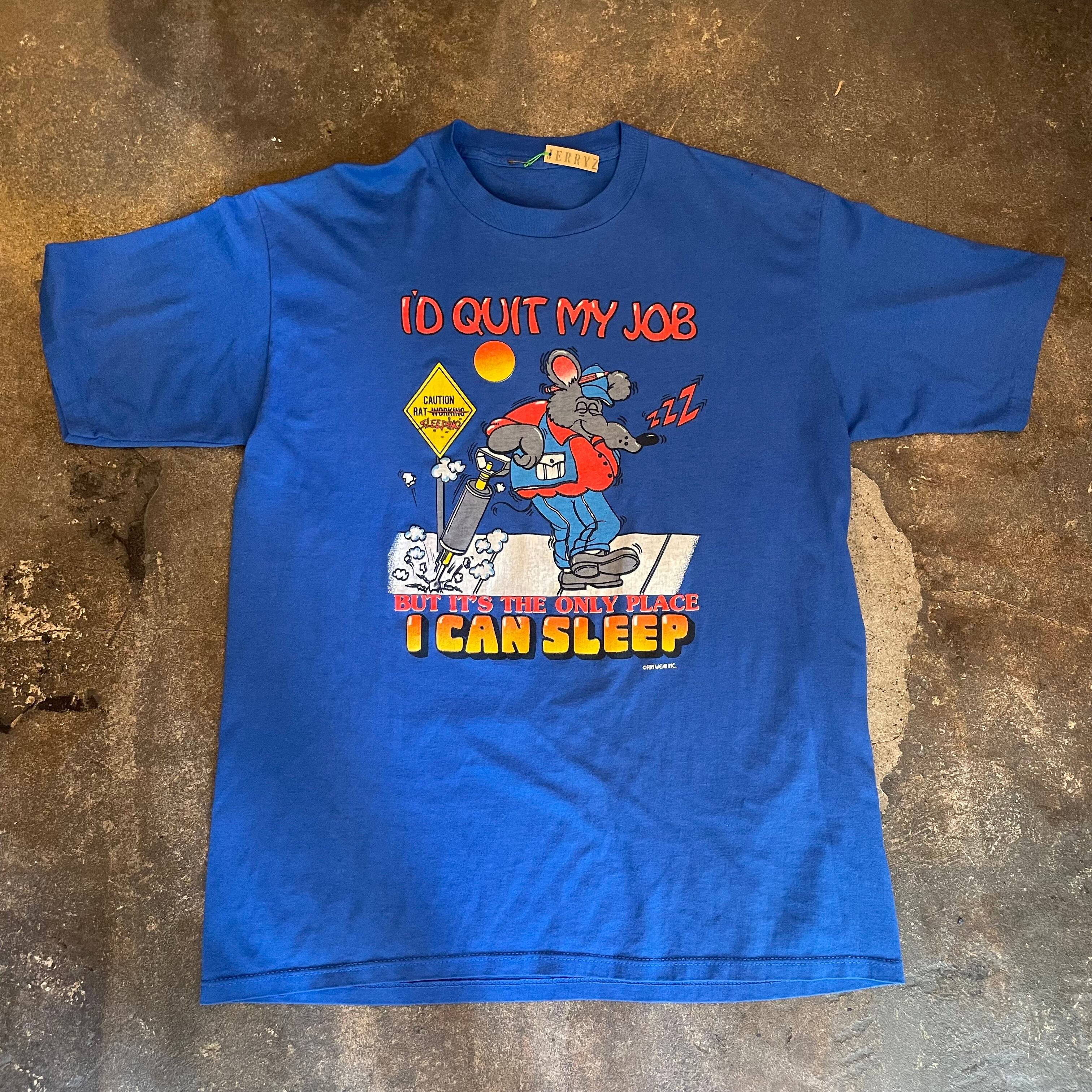 ネズミが仕事をサボって寝ているイラストがかわいいプリントTシャツです。