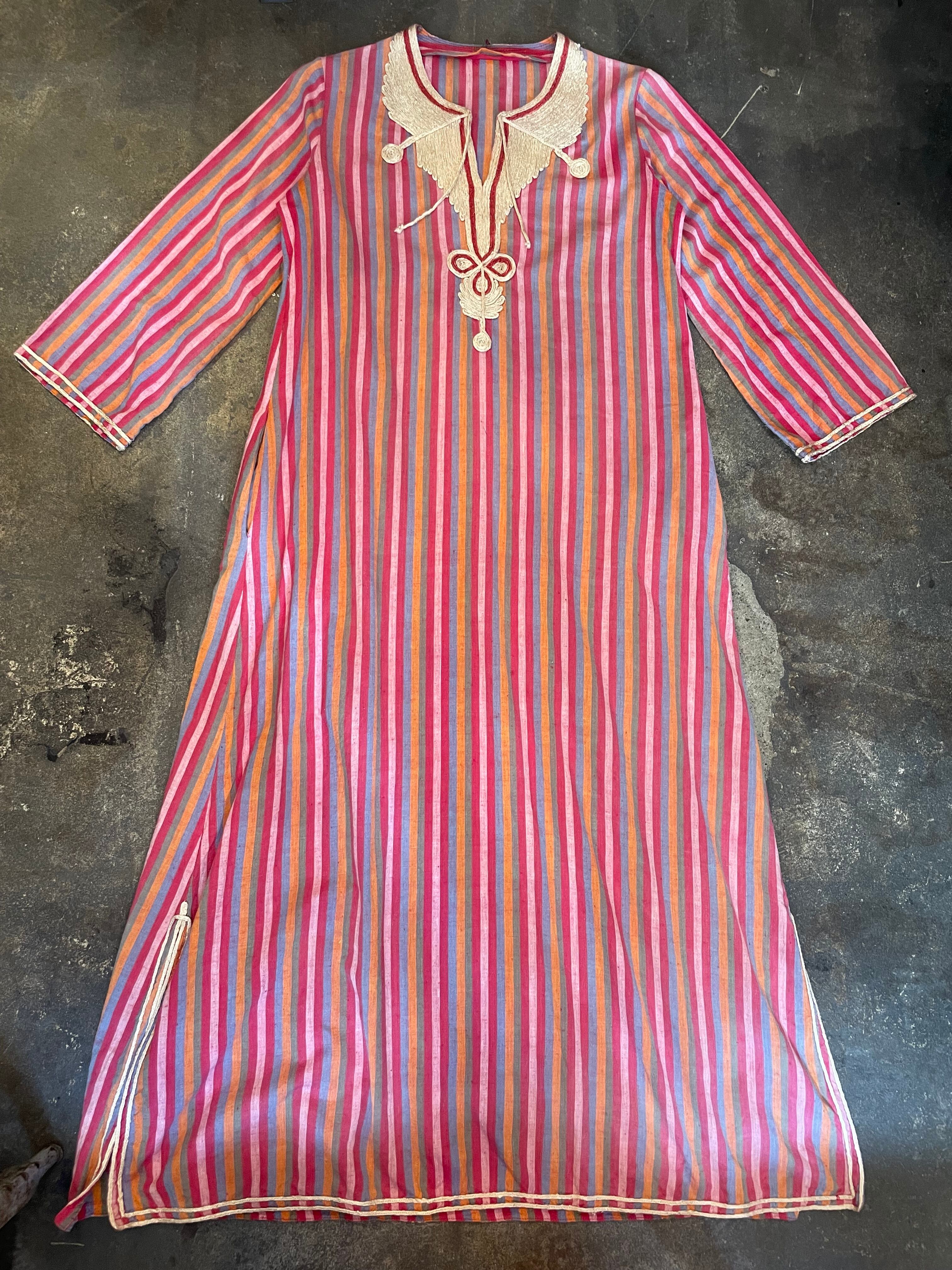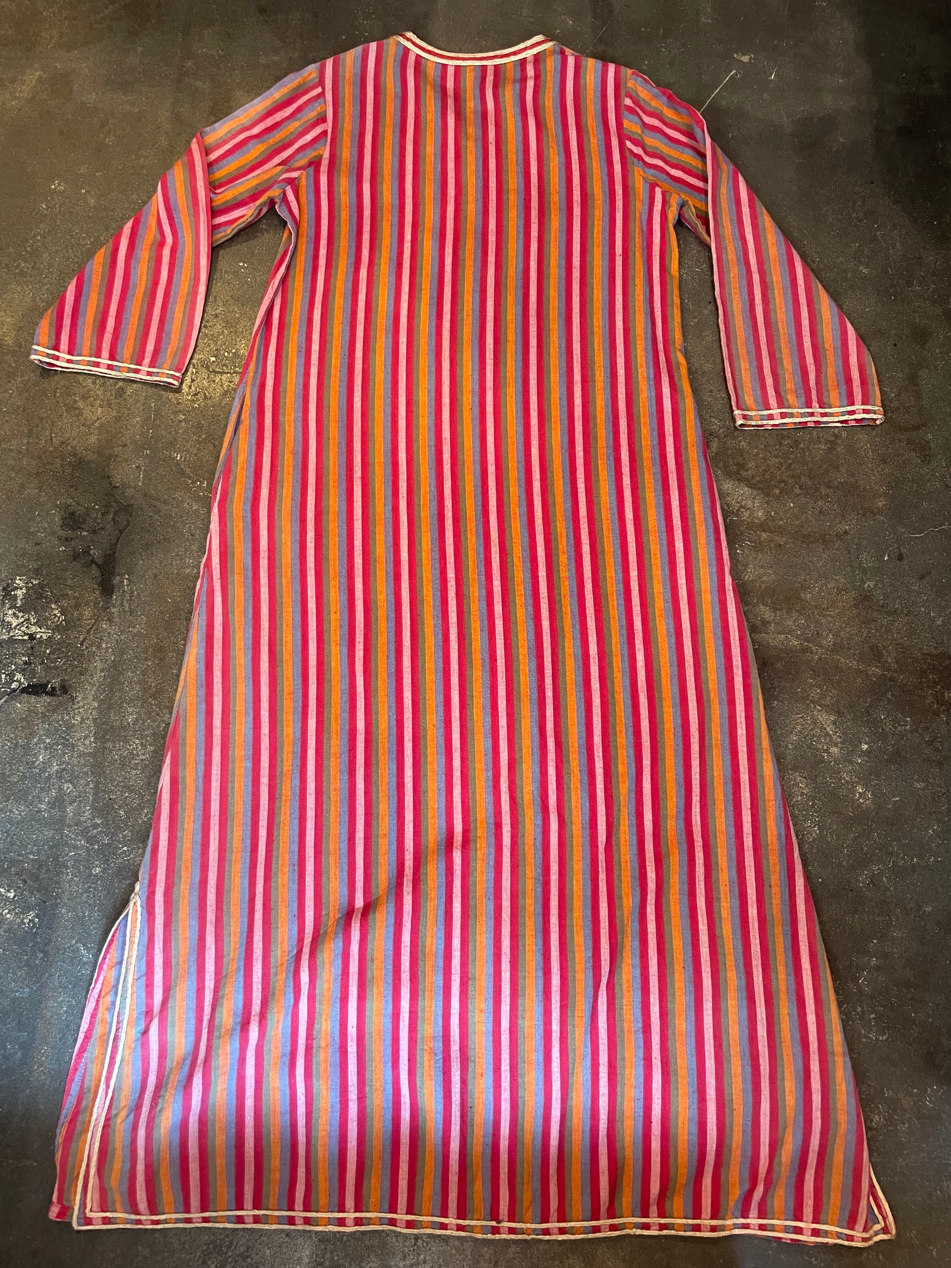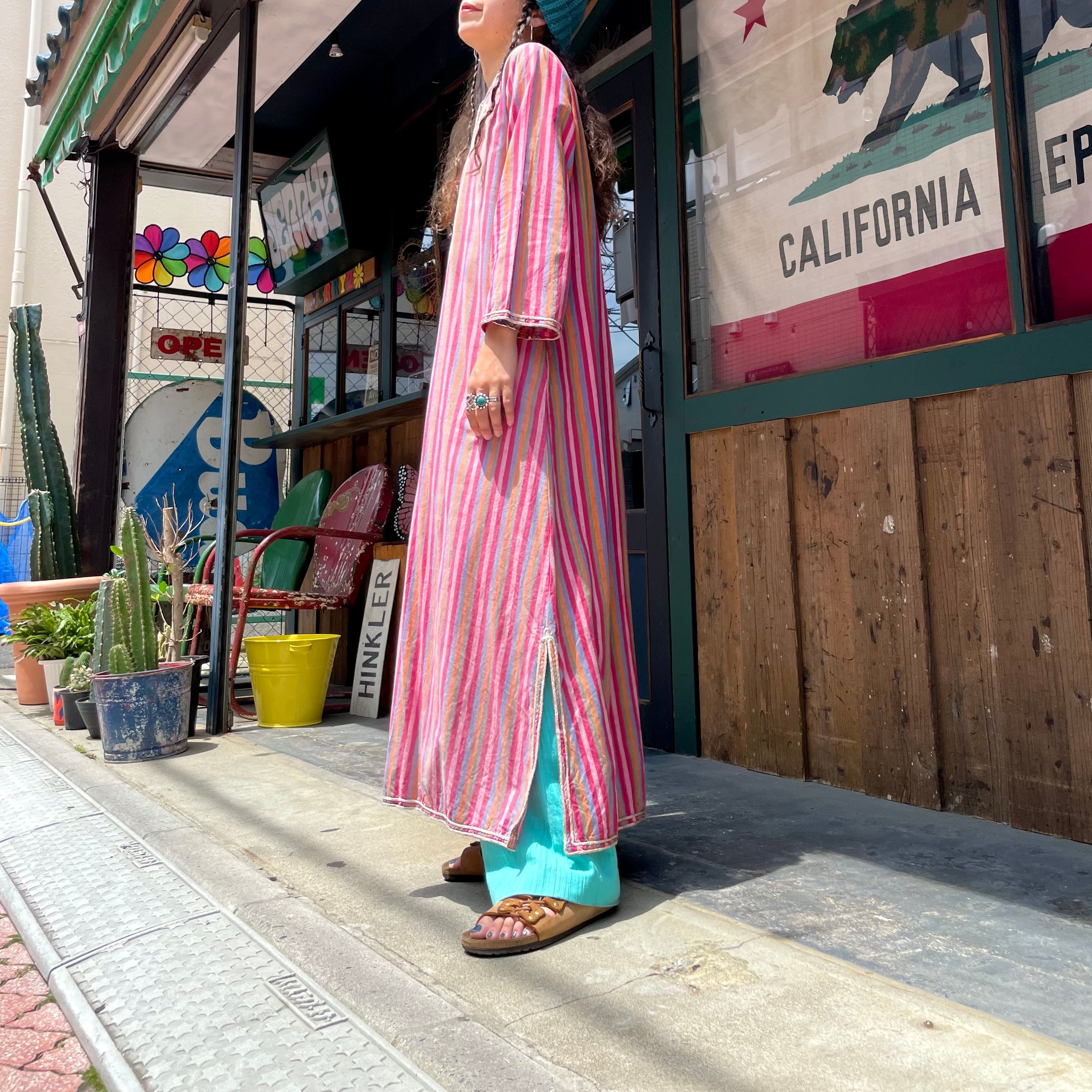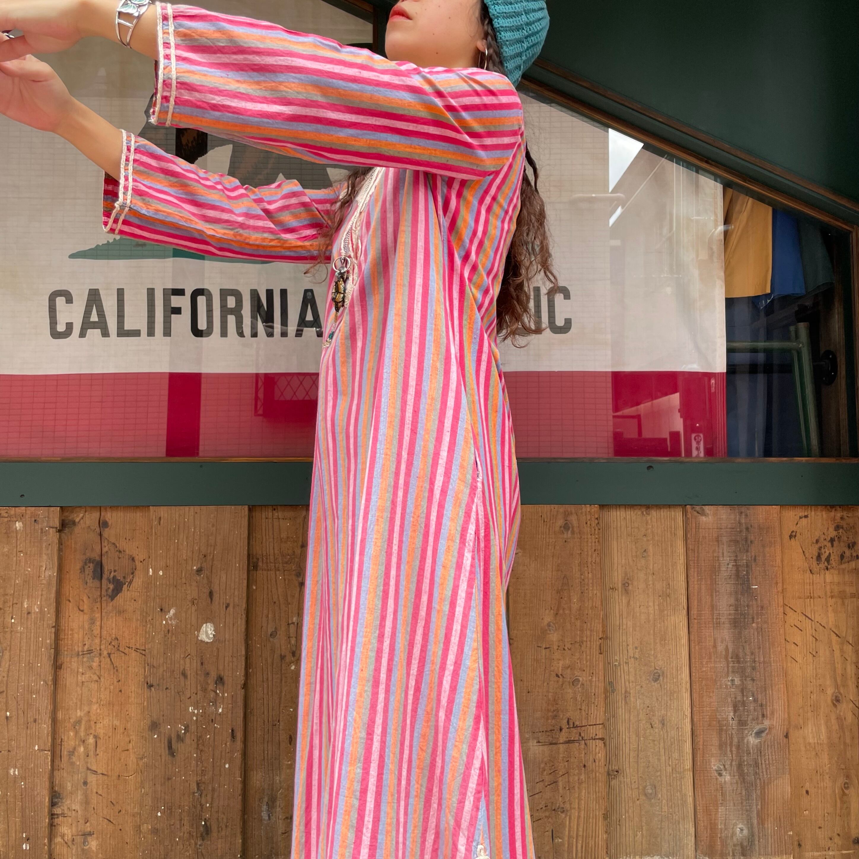 ピンクを基調としたカラフルなストライプがかわいいカフタンドレスです。