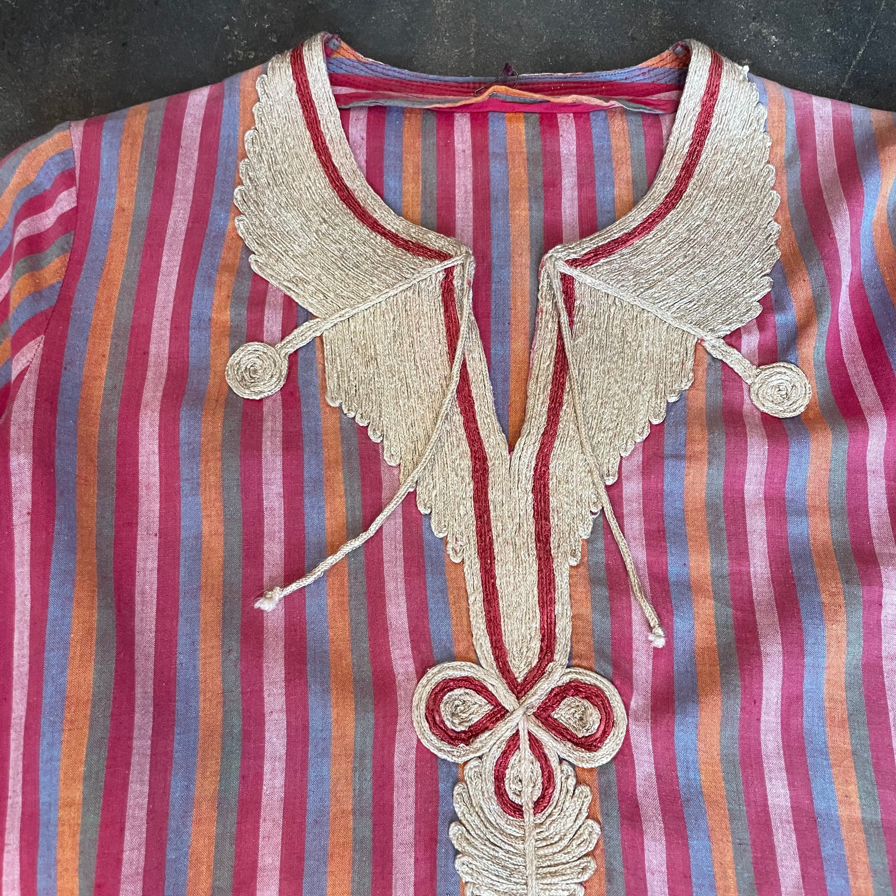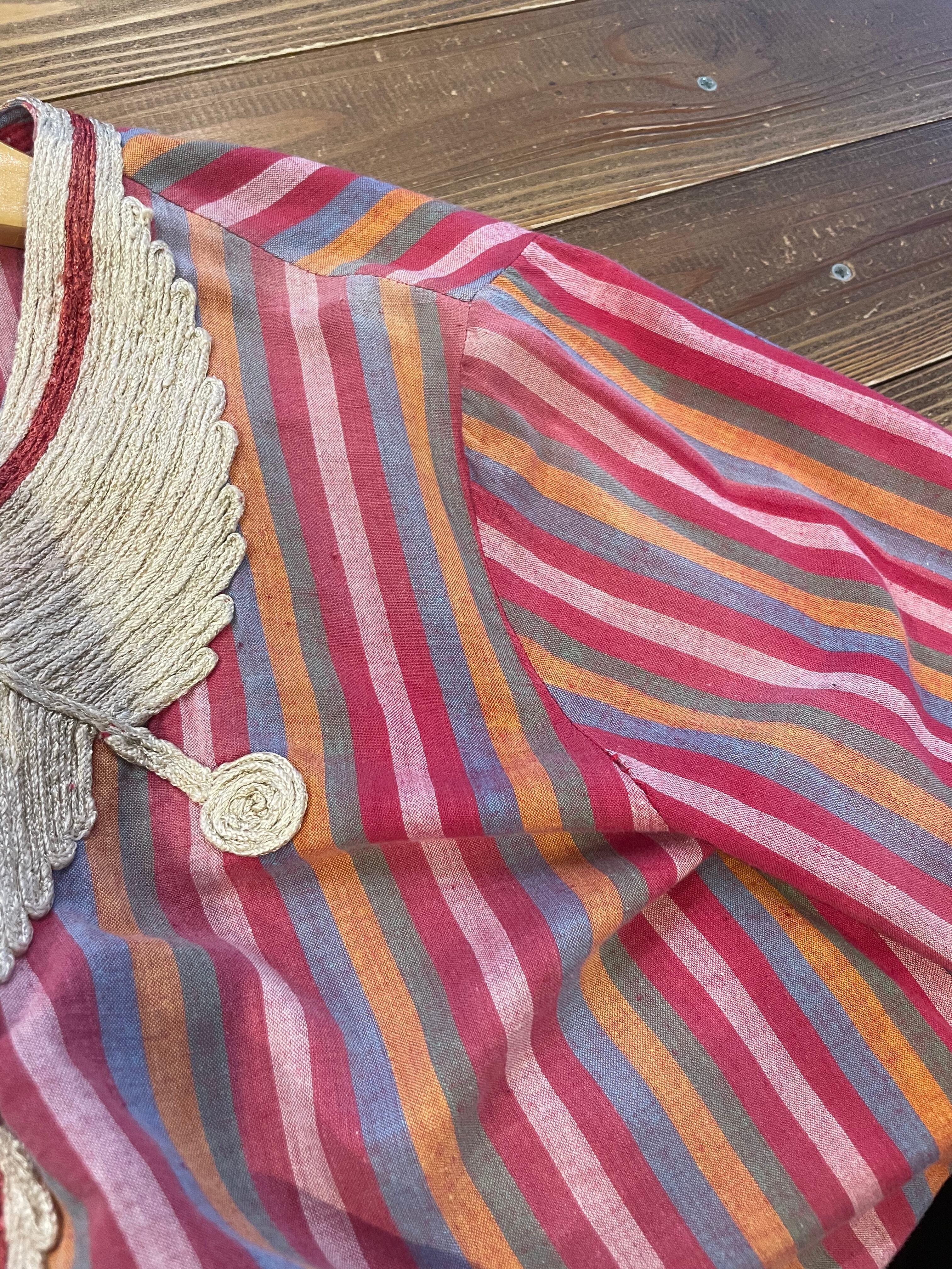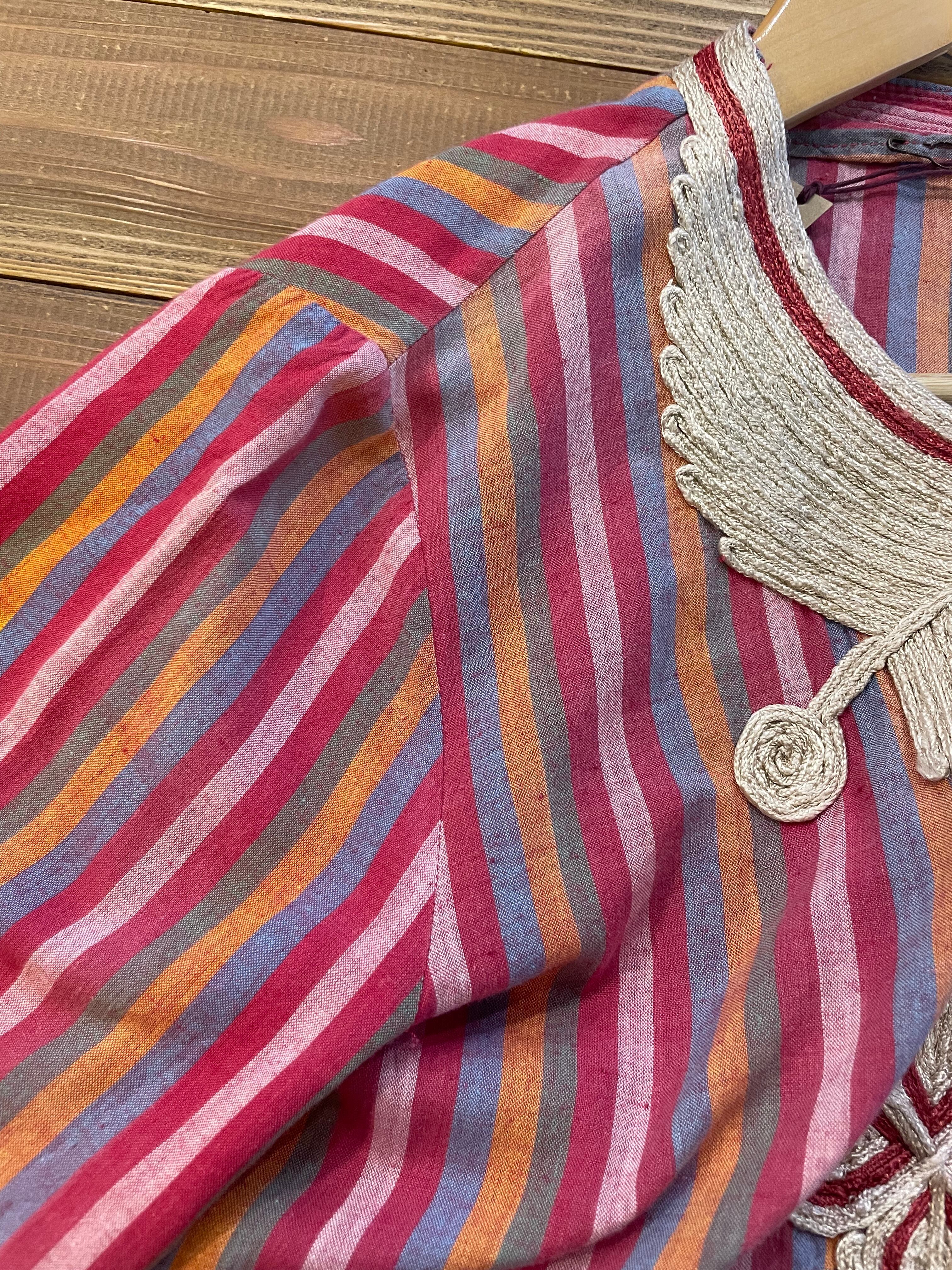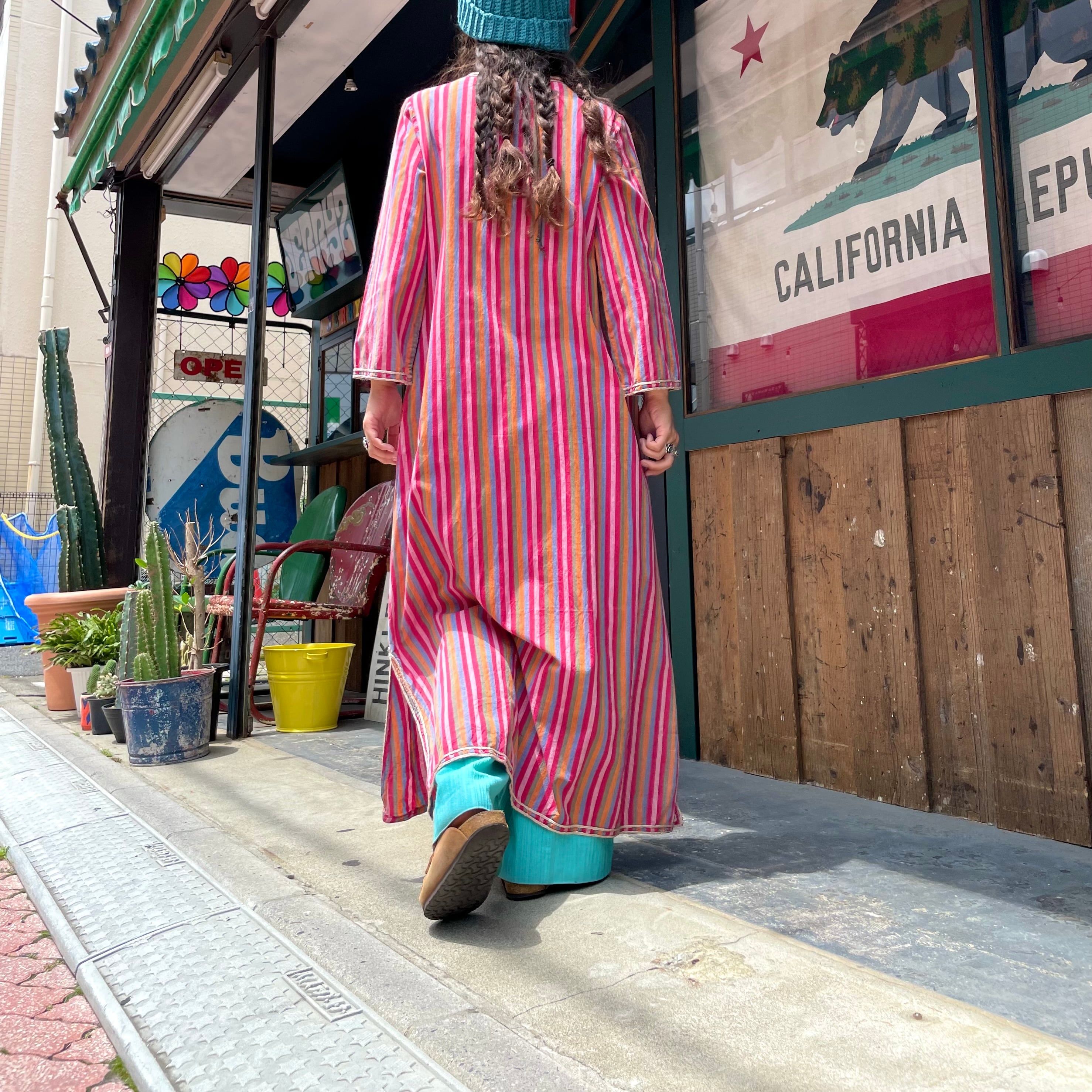 ピンクを基調としたカラフルなストライプがかわいいカフタンドレスです。