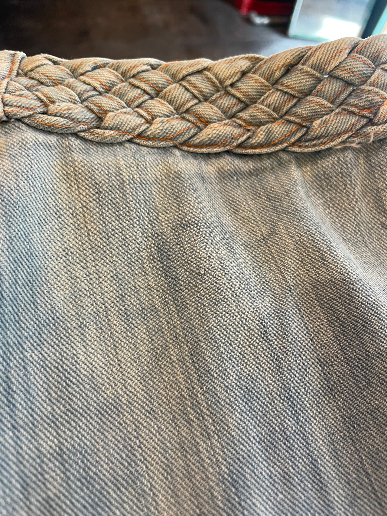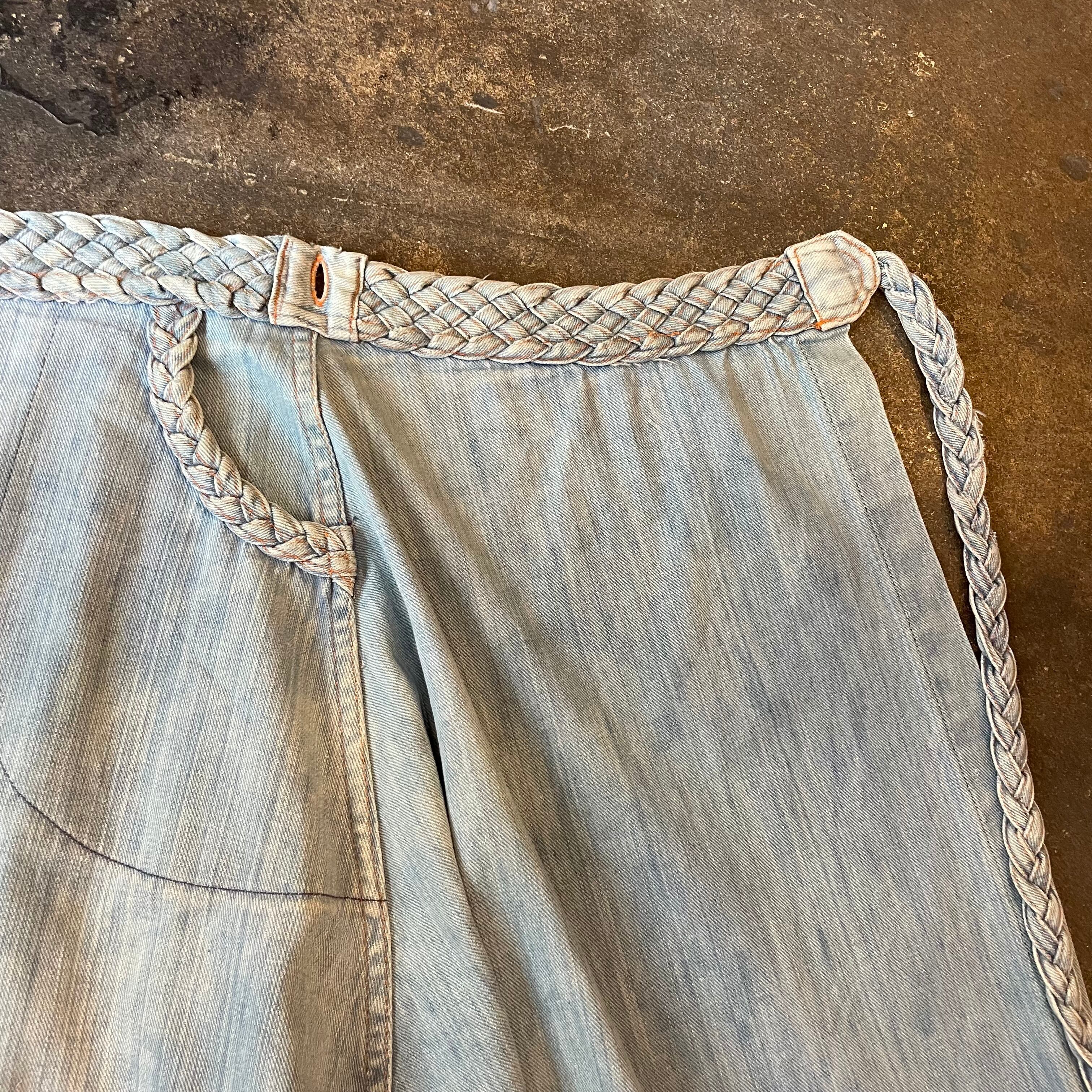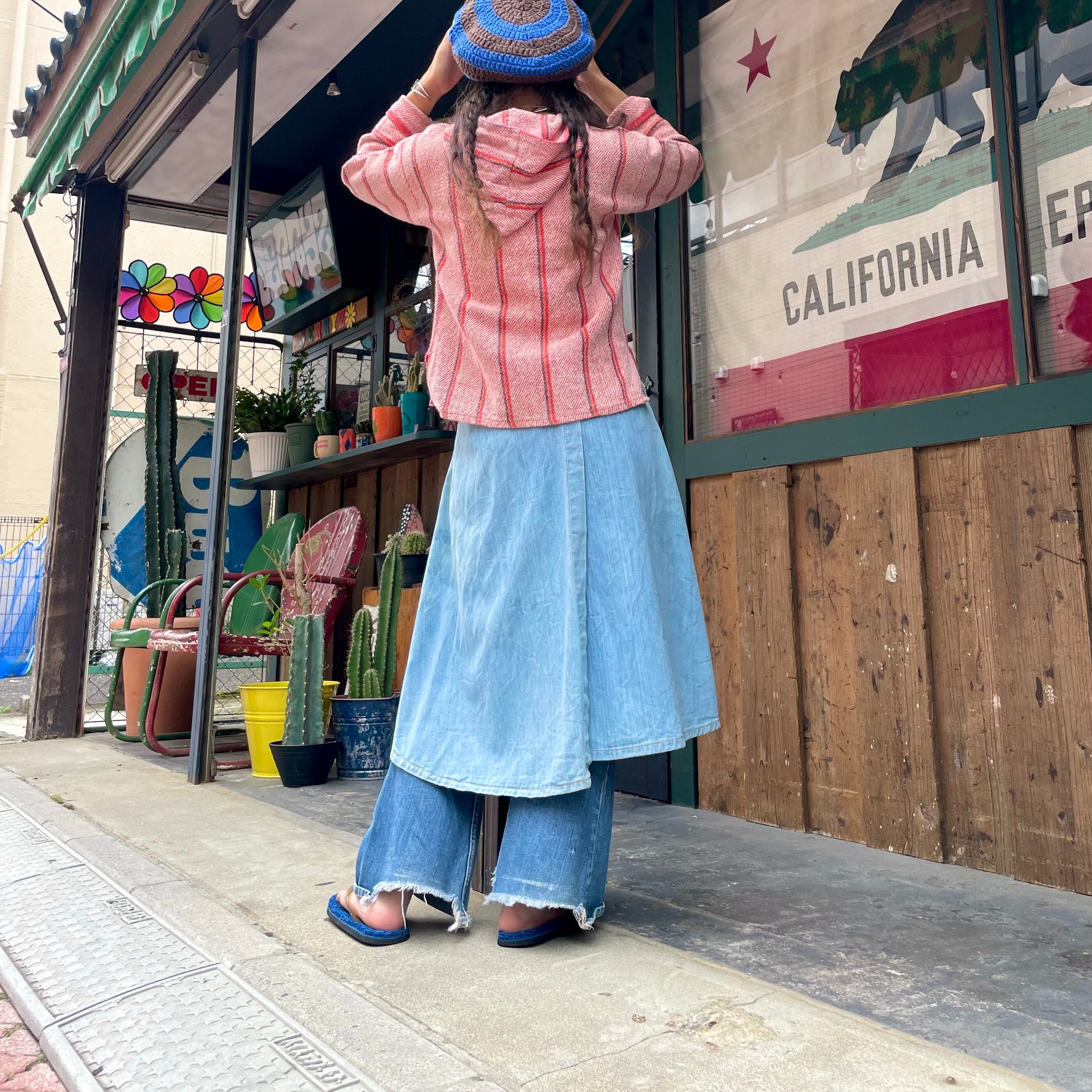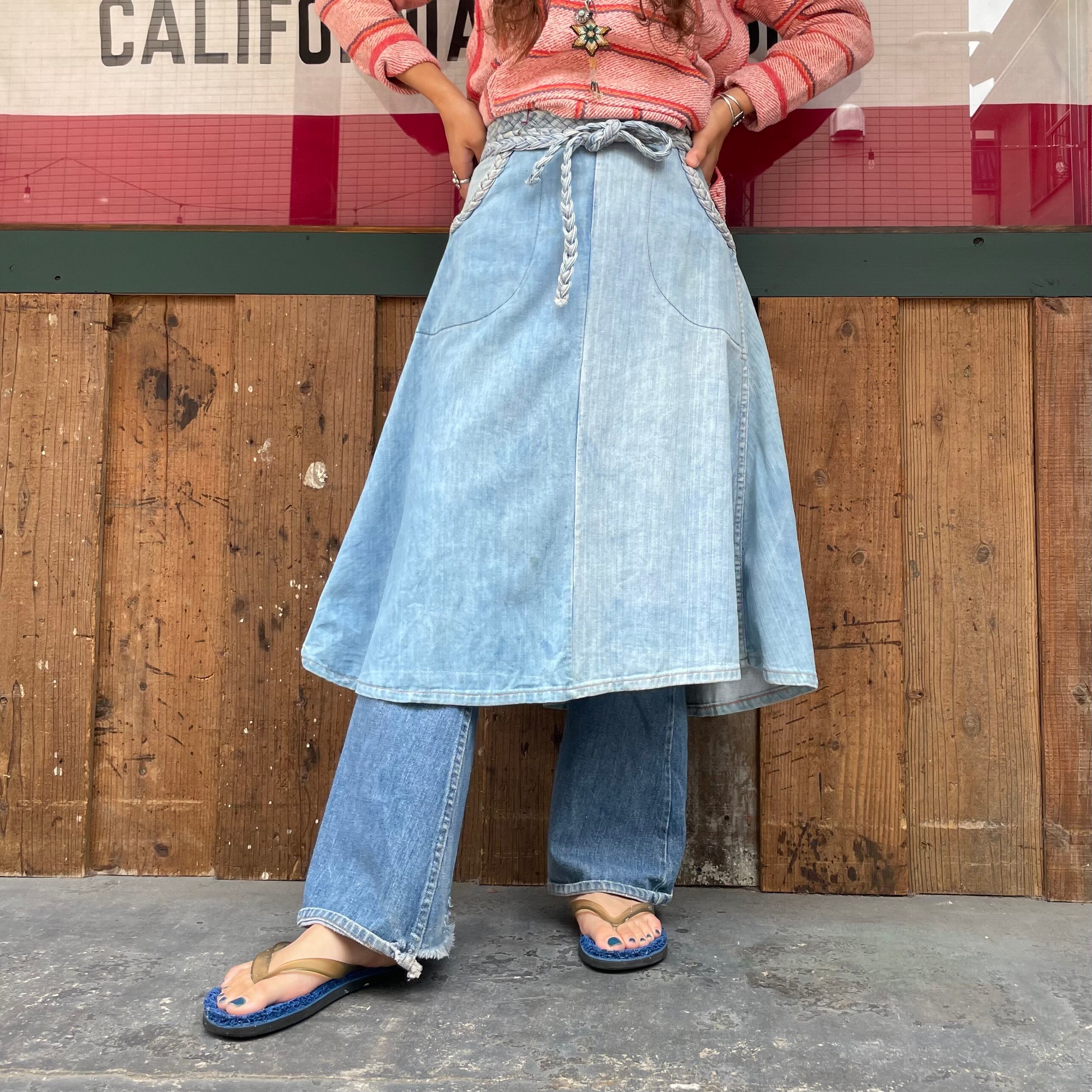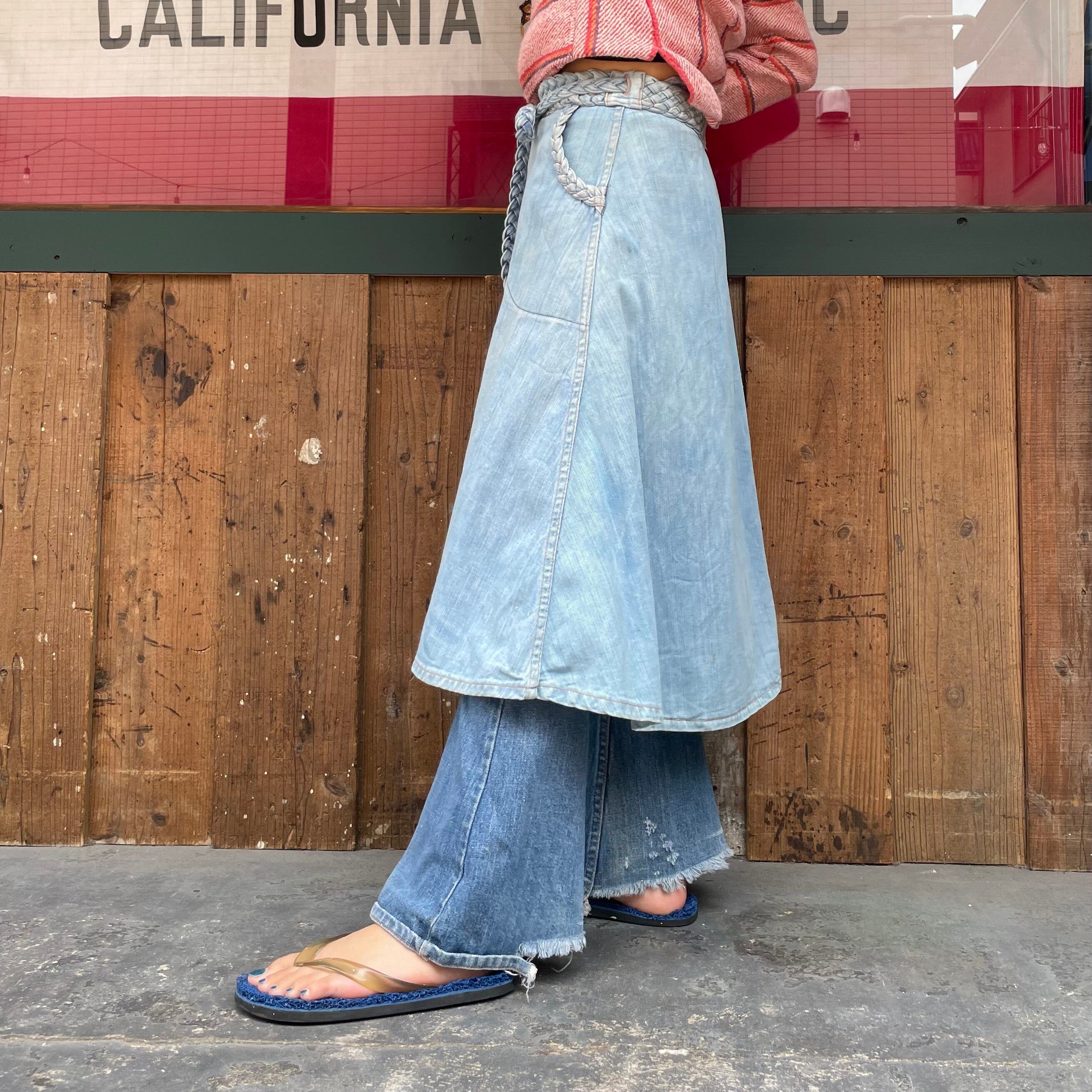 薄い色のデニムにオレンジのステッチ、三つ編みになっている紐がかわいいデニムの巻きスカートです。