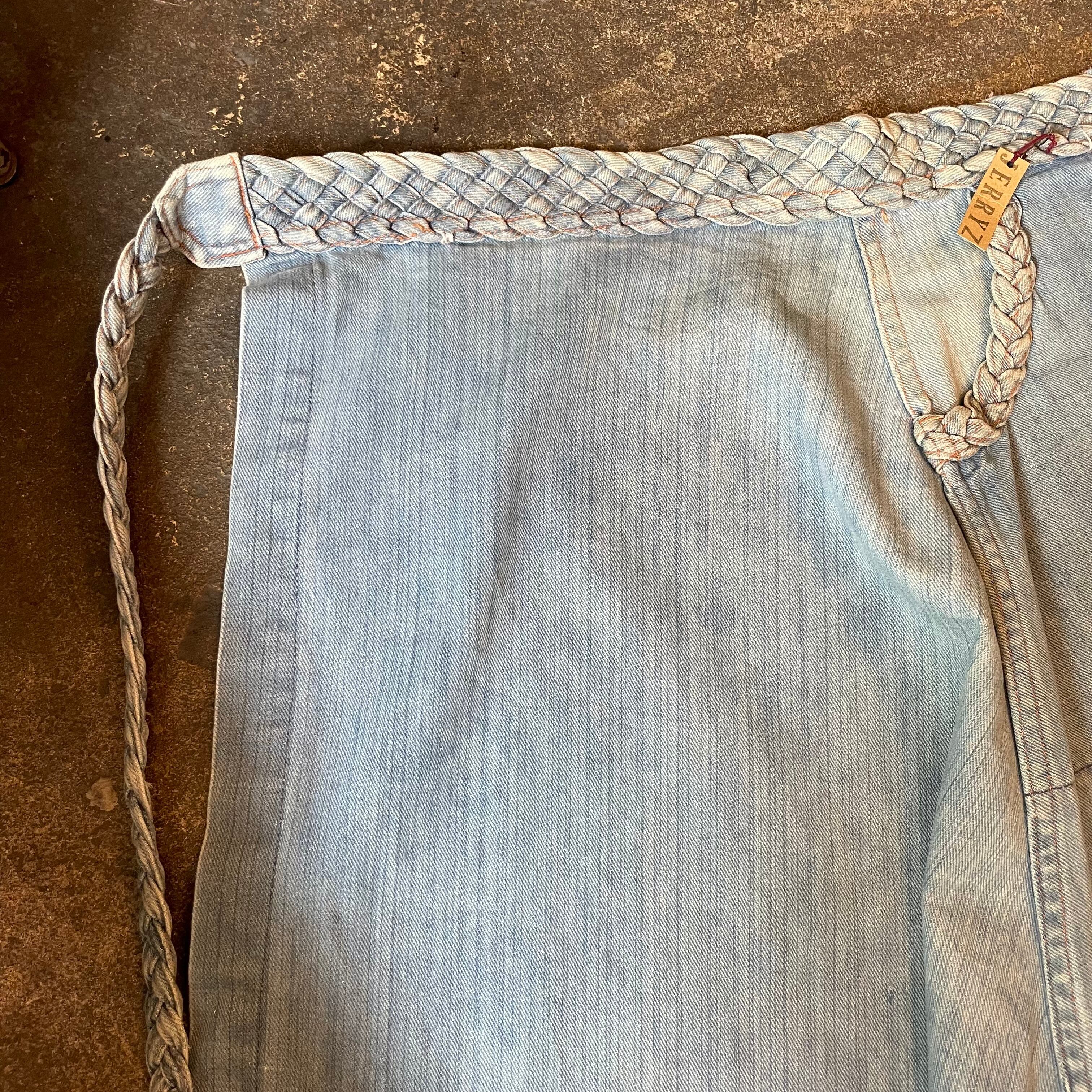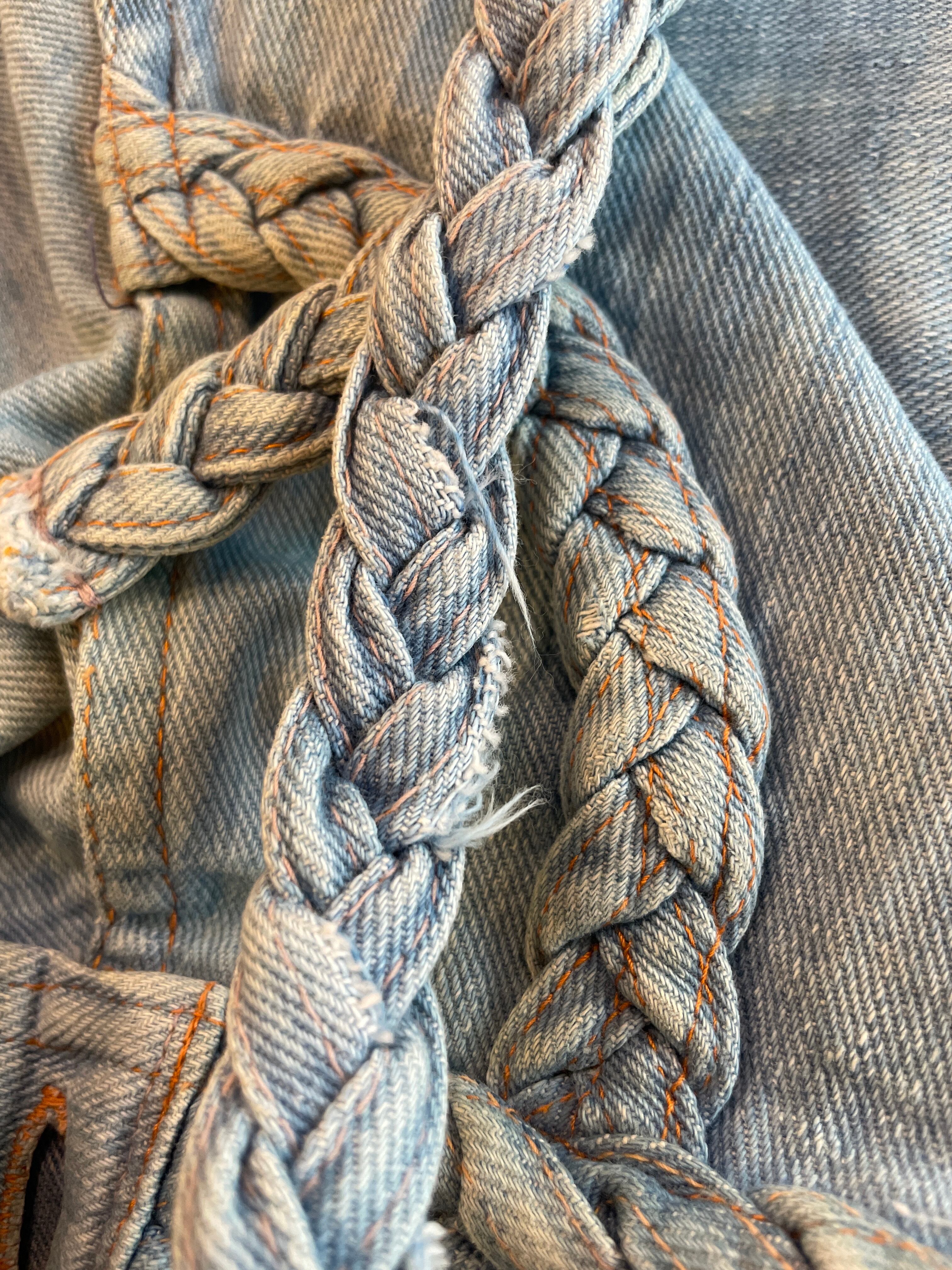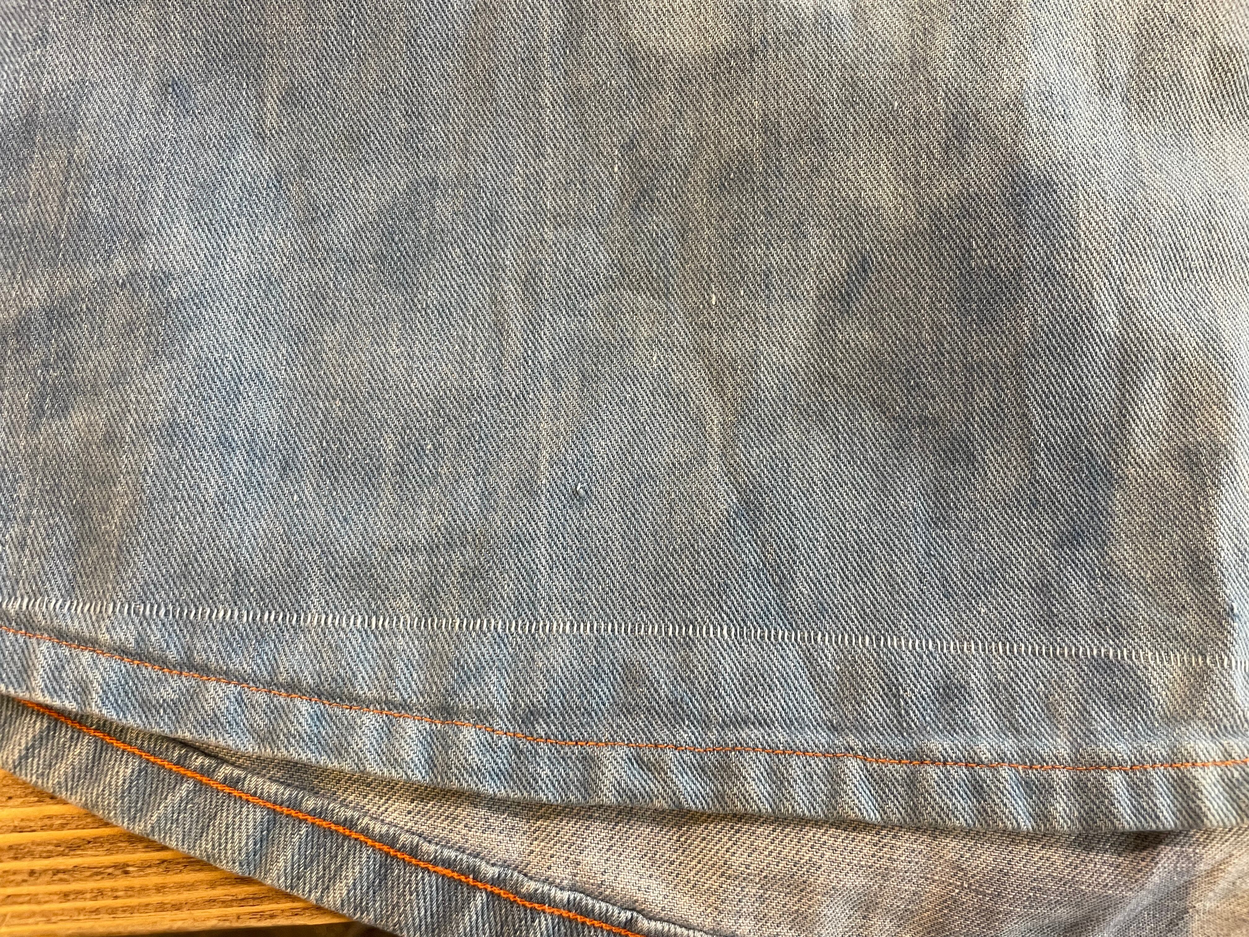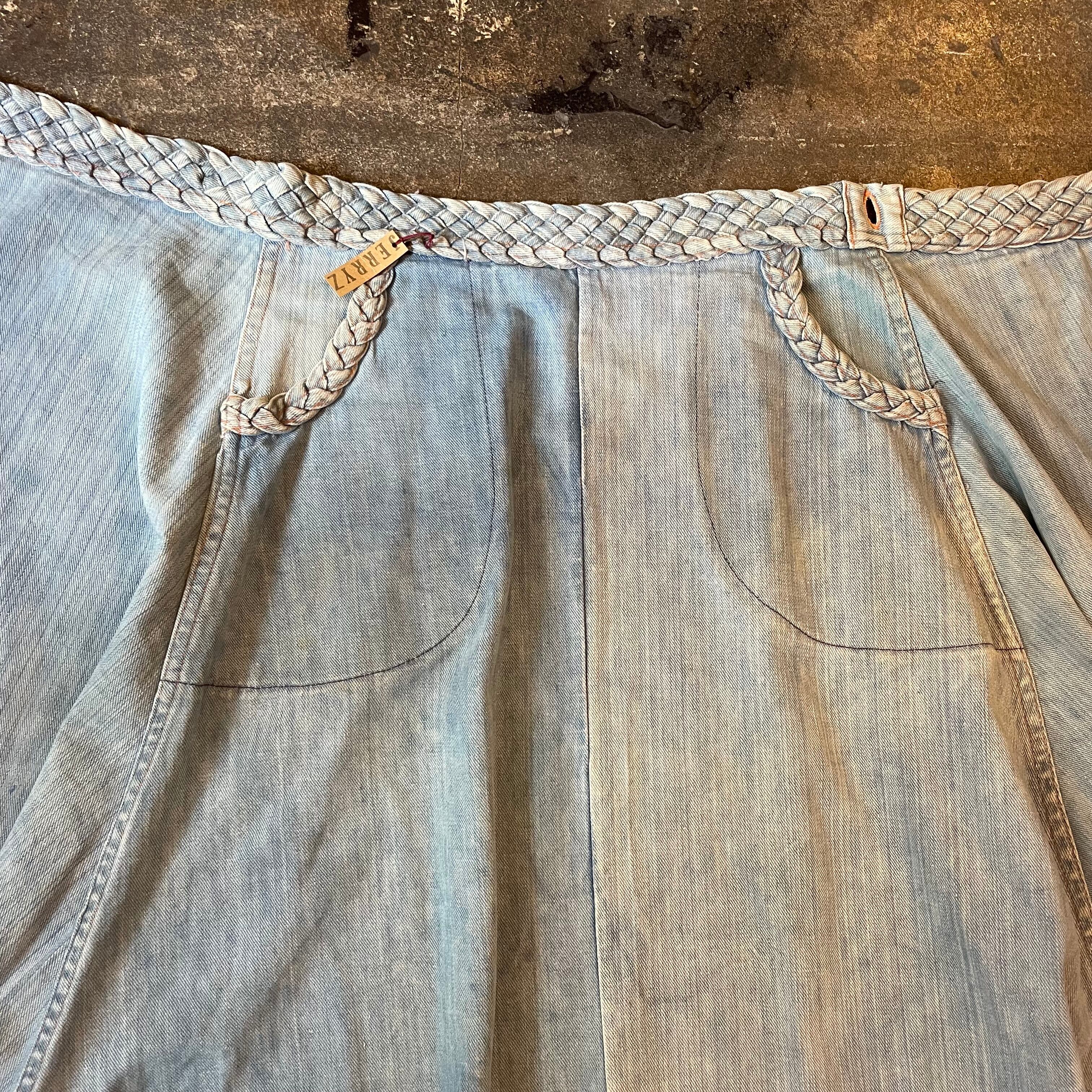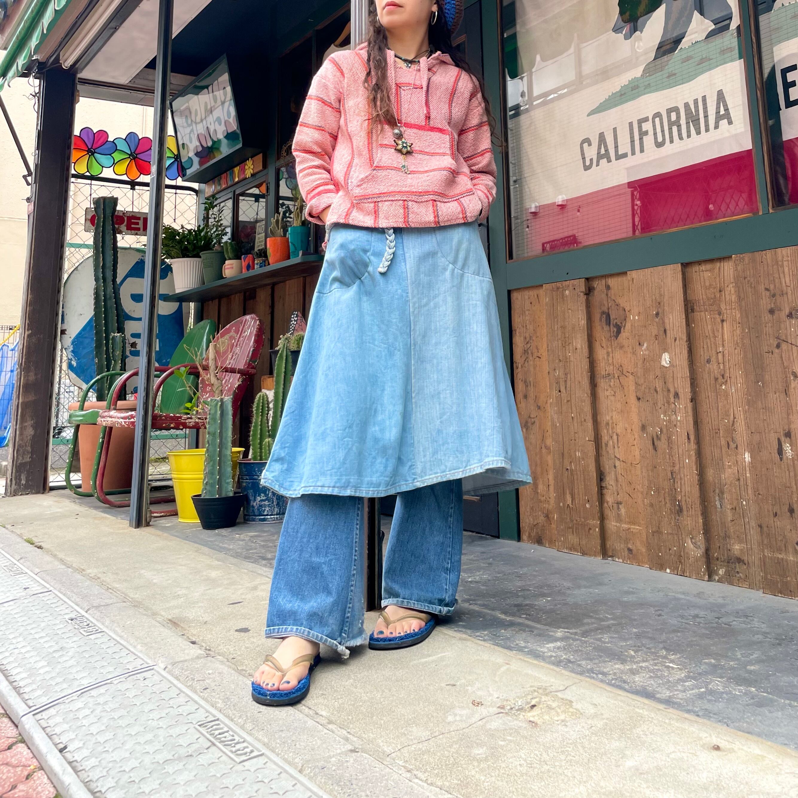 薄い色のデニムにオレンジのステッチ、三つ編みになっている紐がかわいいデニムの巻きスカートです。