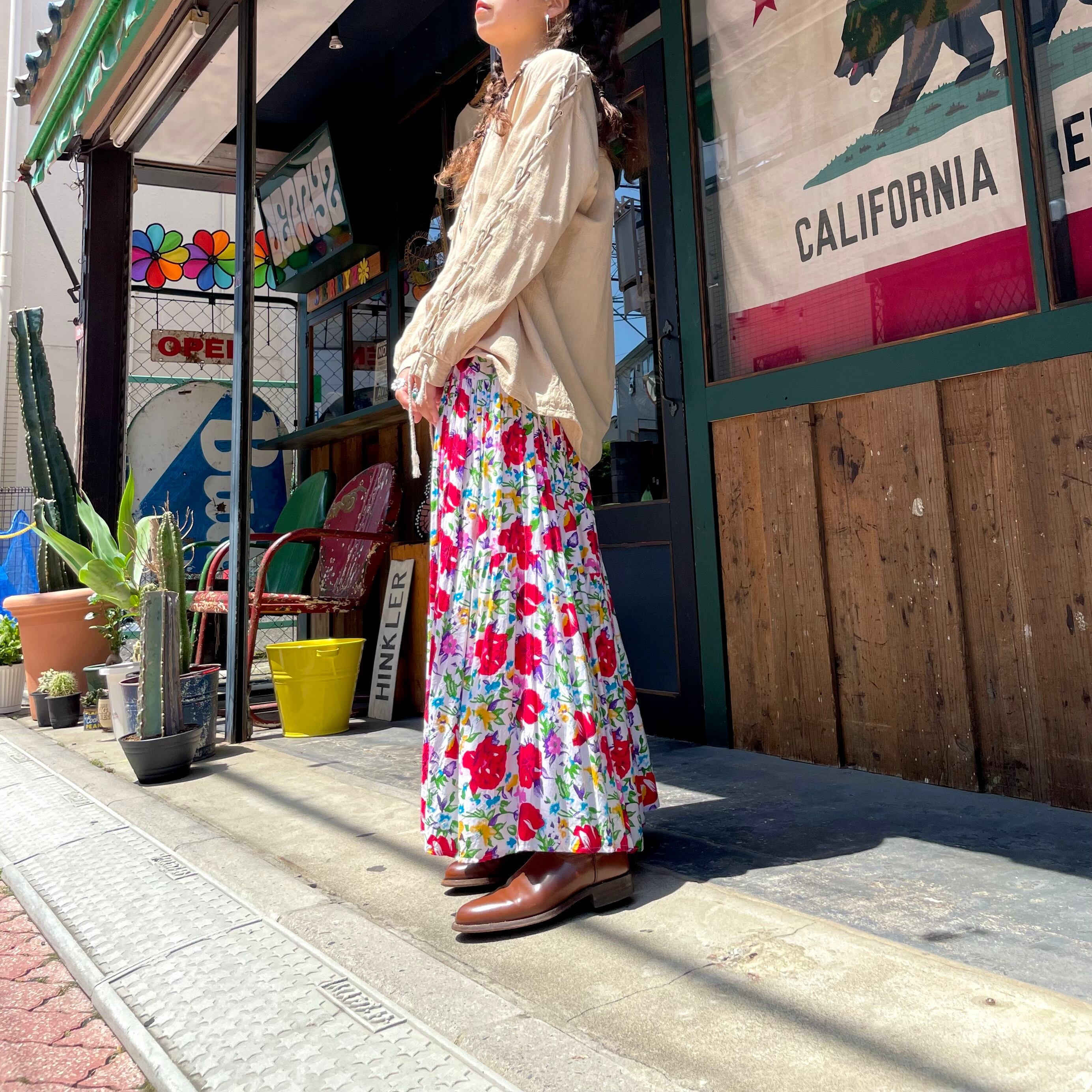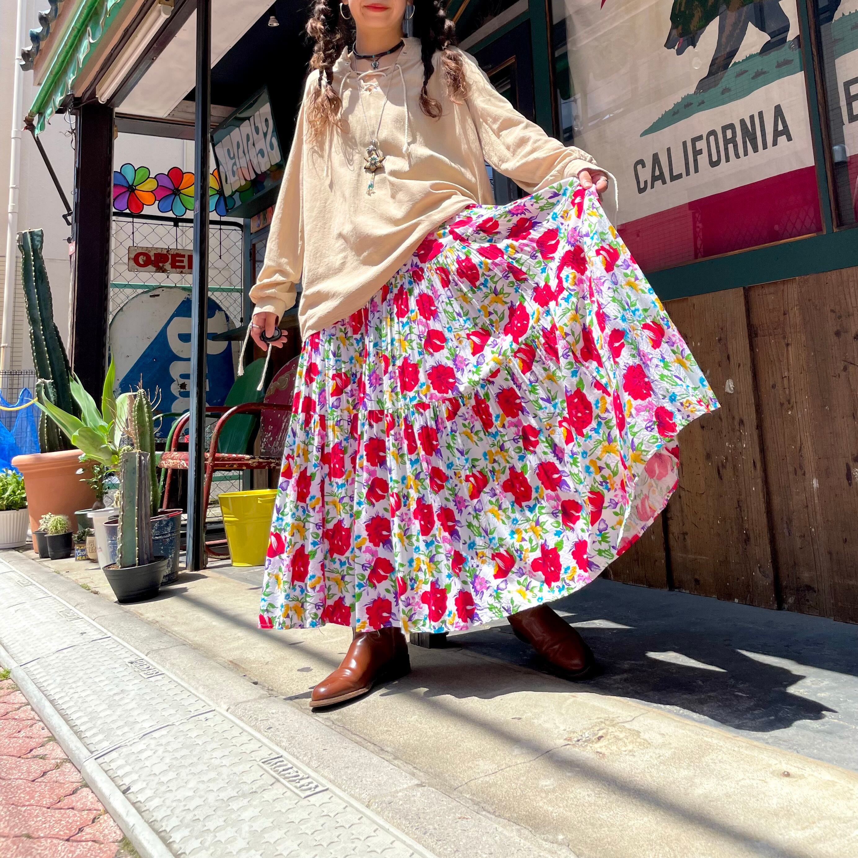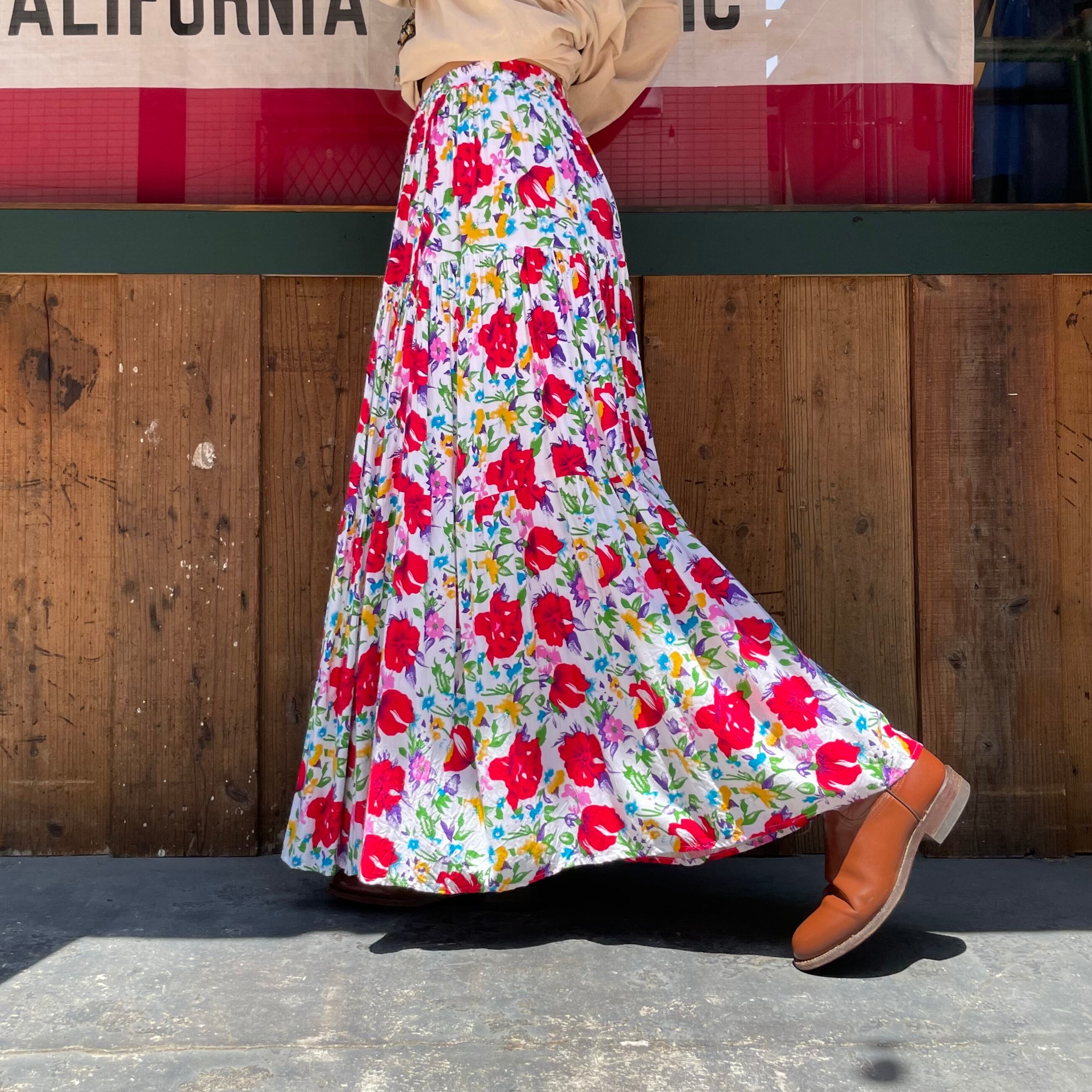 白地に華やかなお花たちが爽やかで涼しげでかわいい、レーヨン素材のロングスカートです。