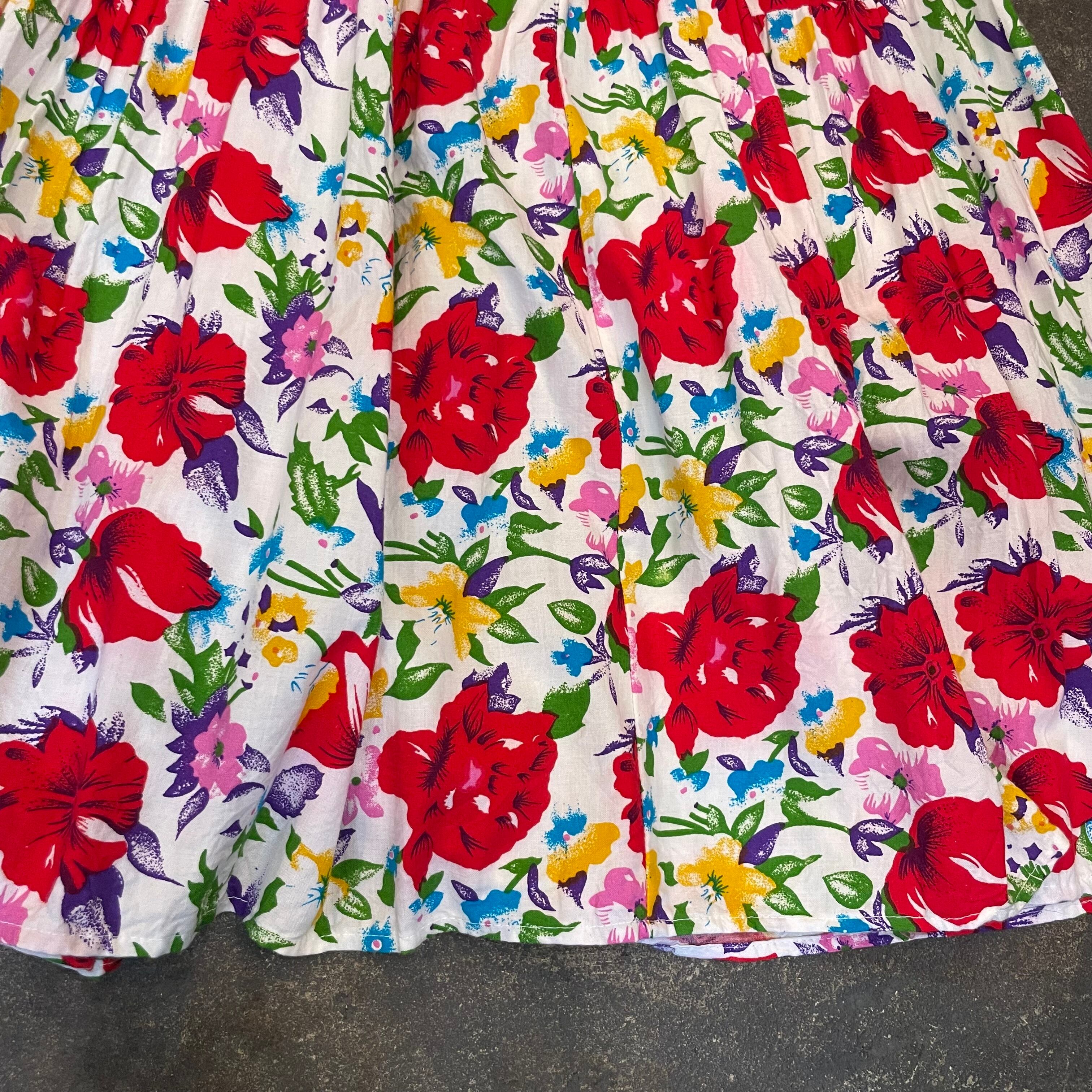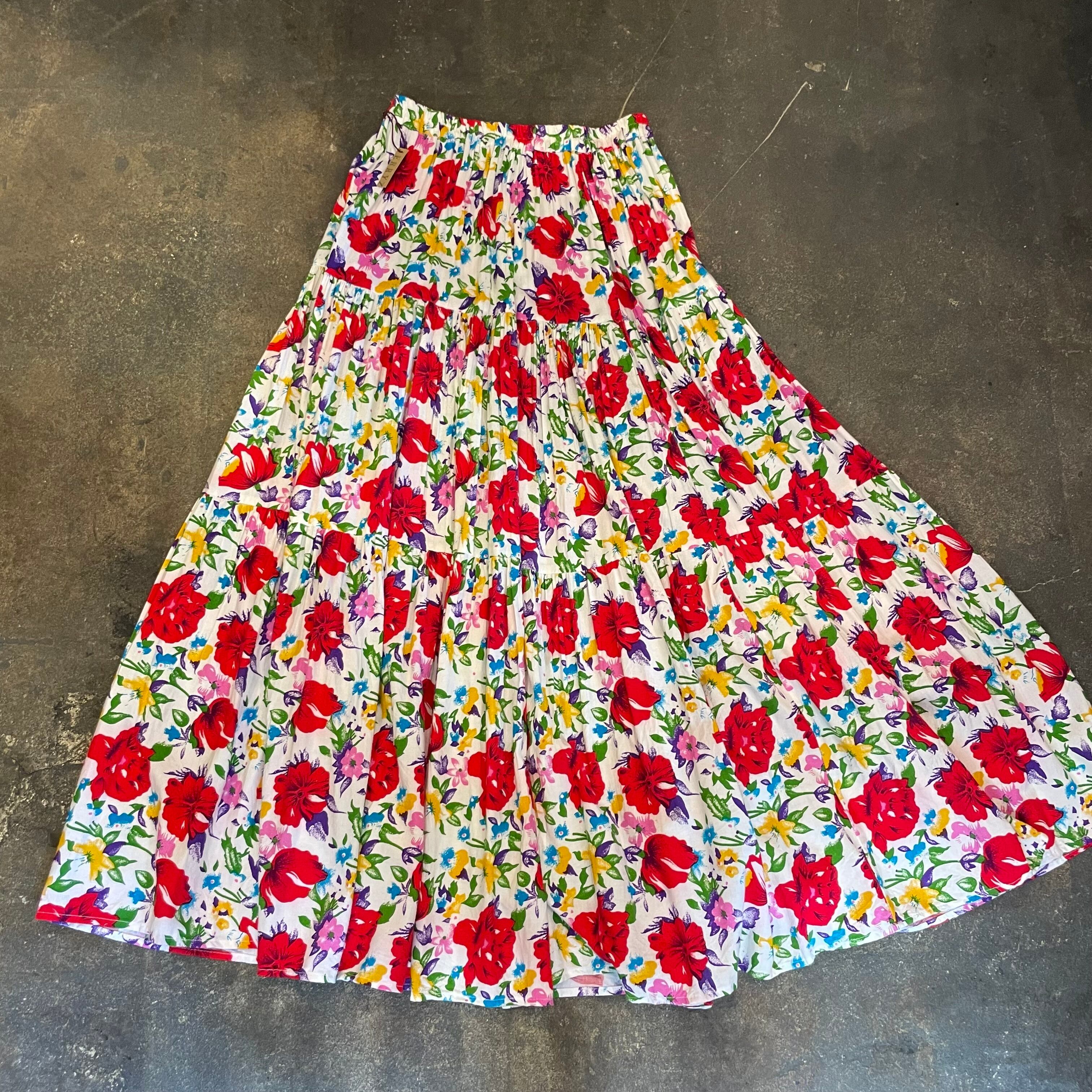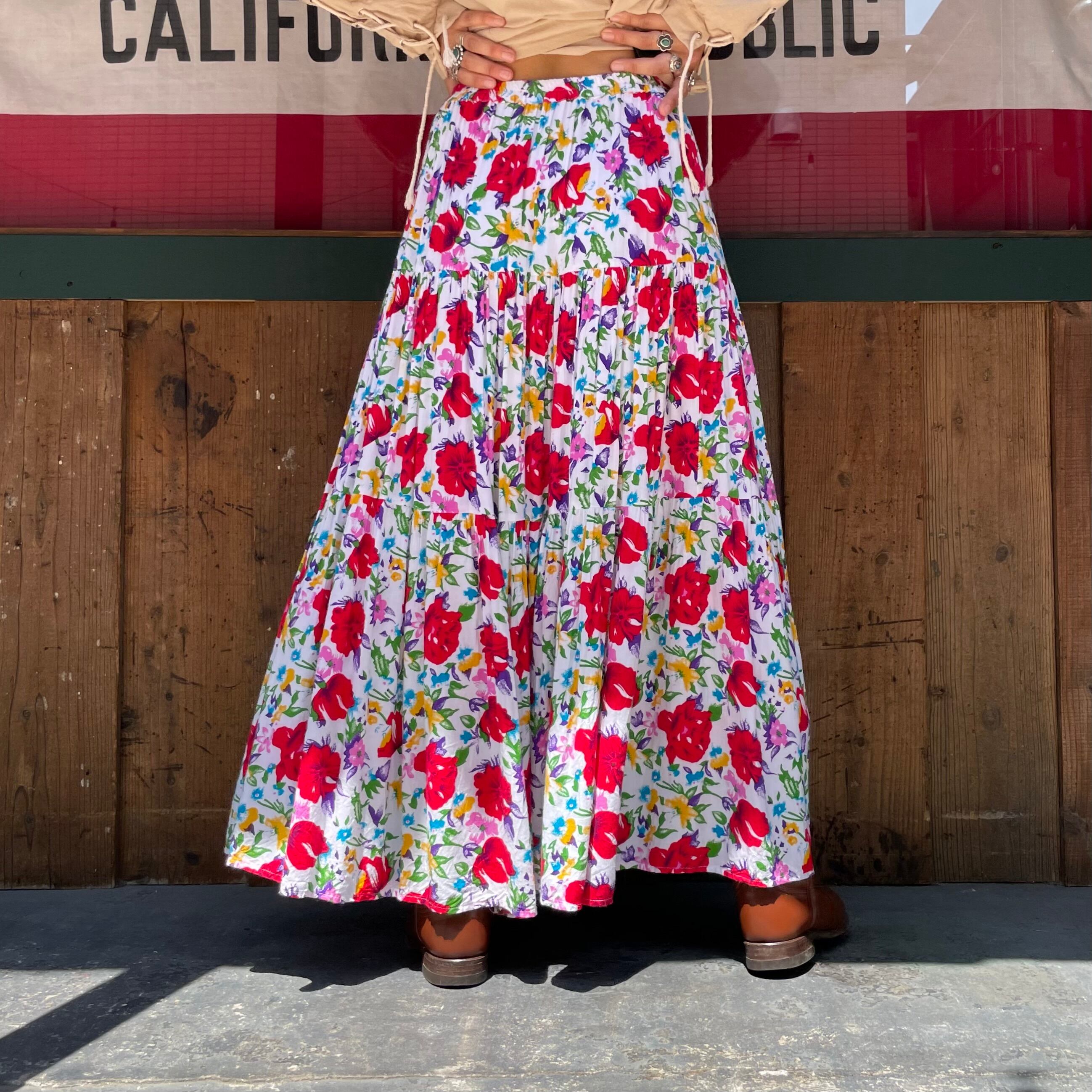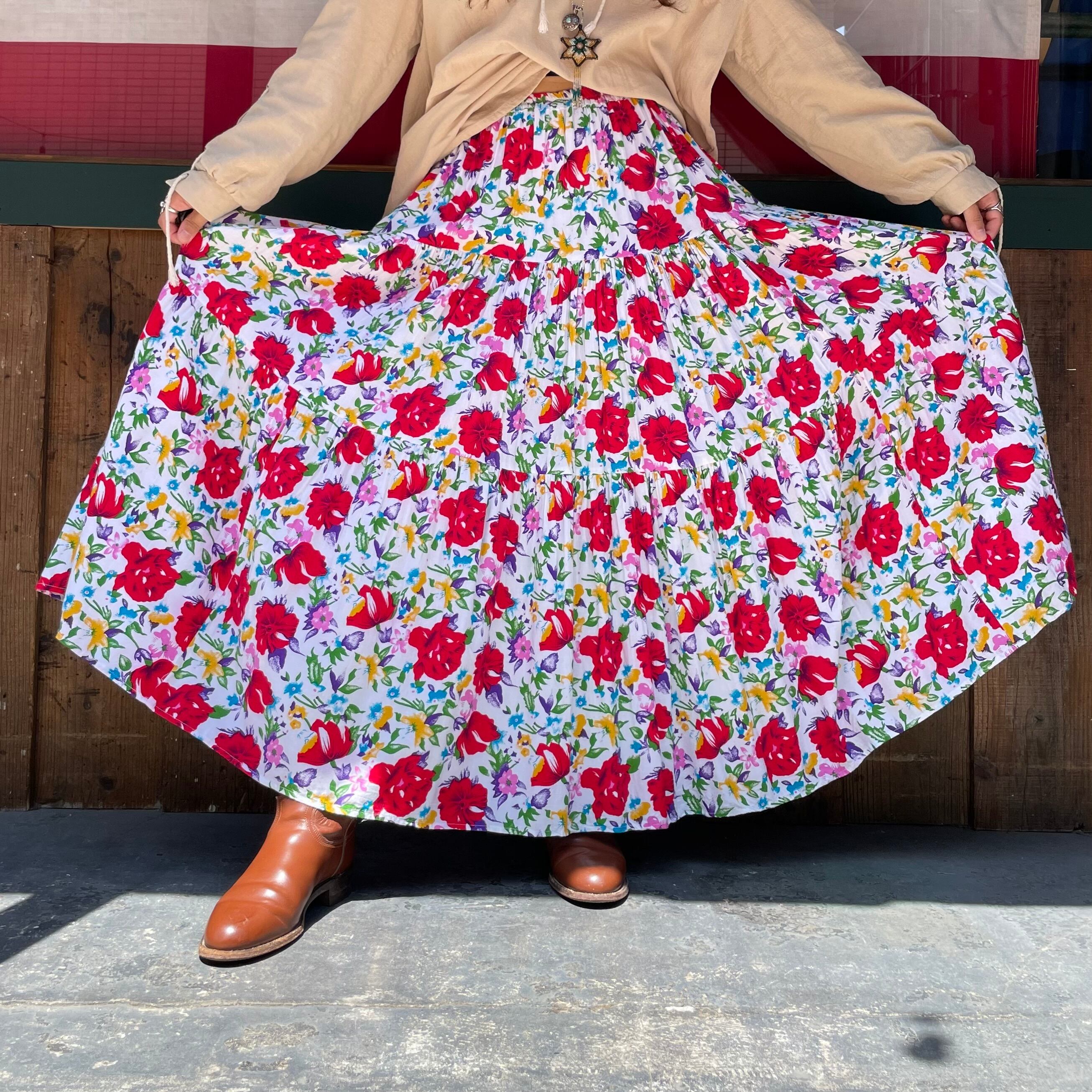 白地に華やかなお花たちが爽やかで涼しげでかわいい、レーヨン素材のロングスカートです。