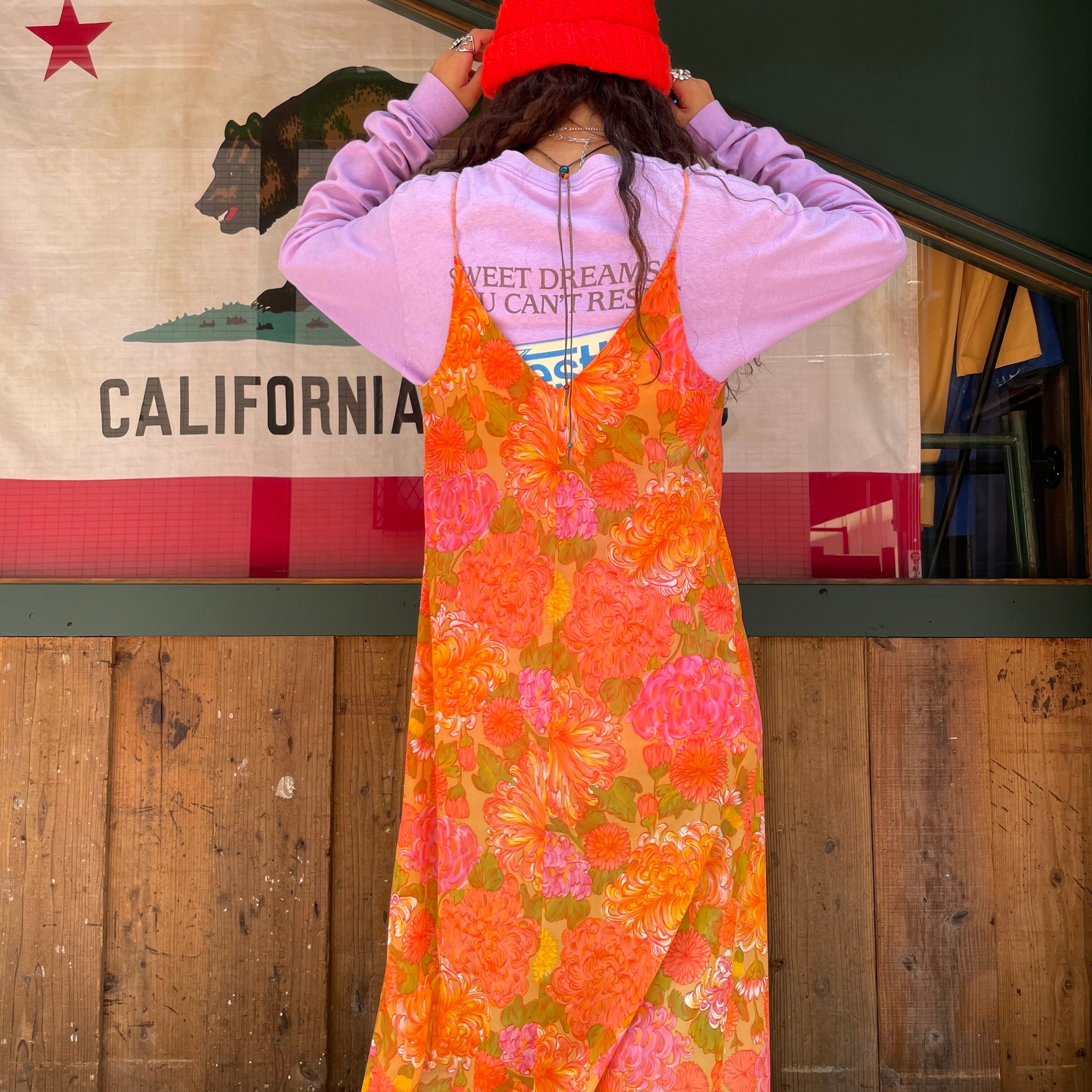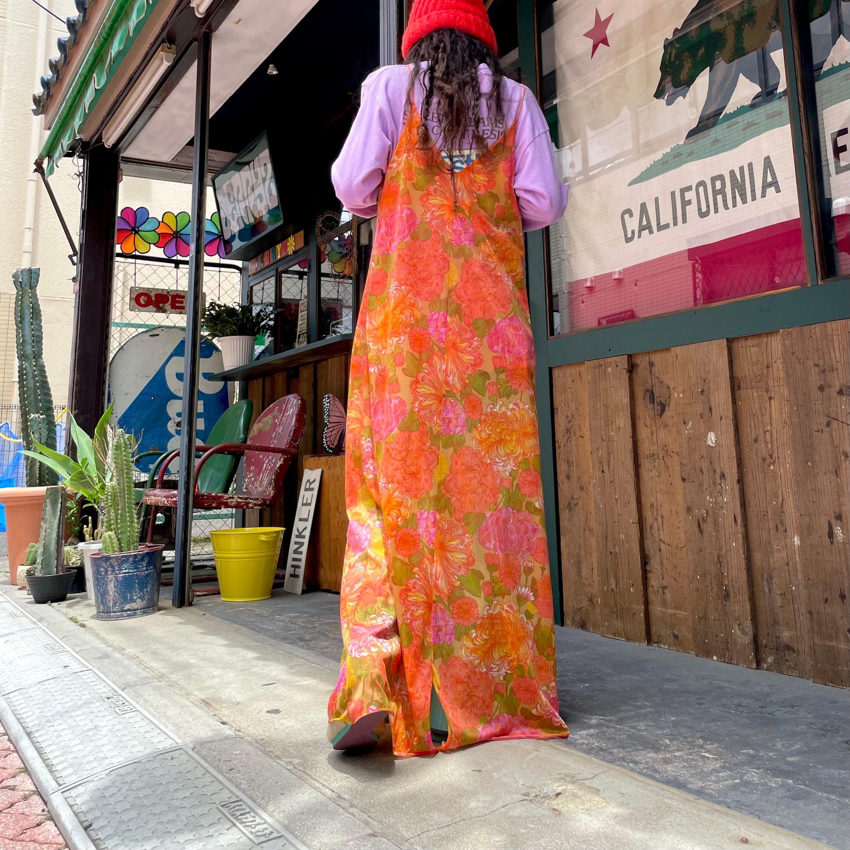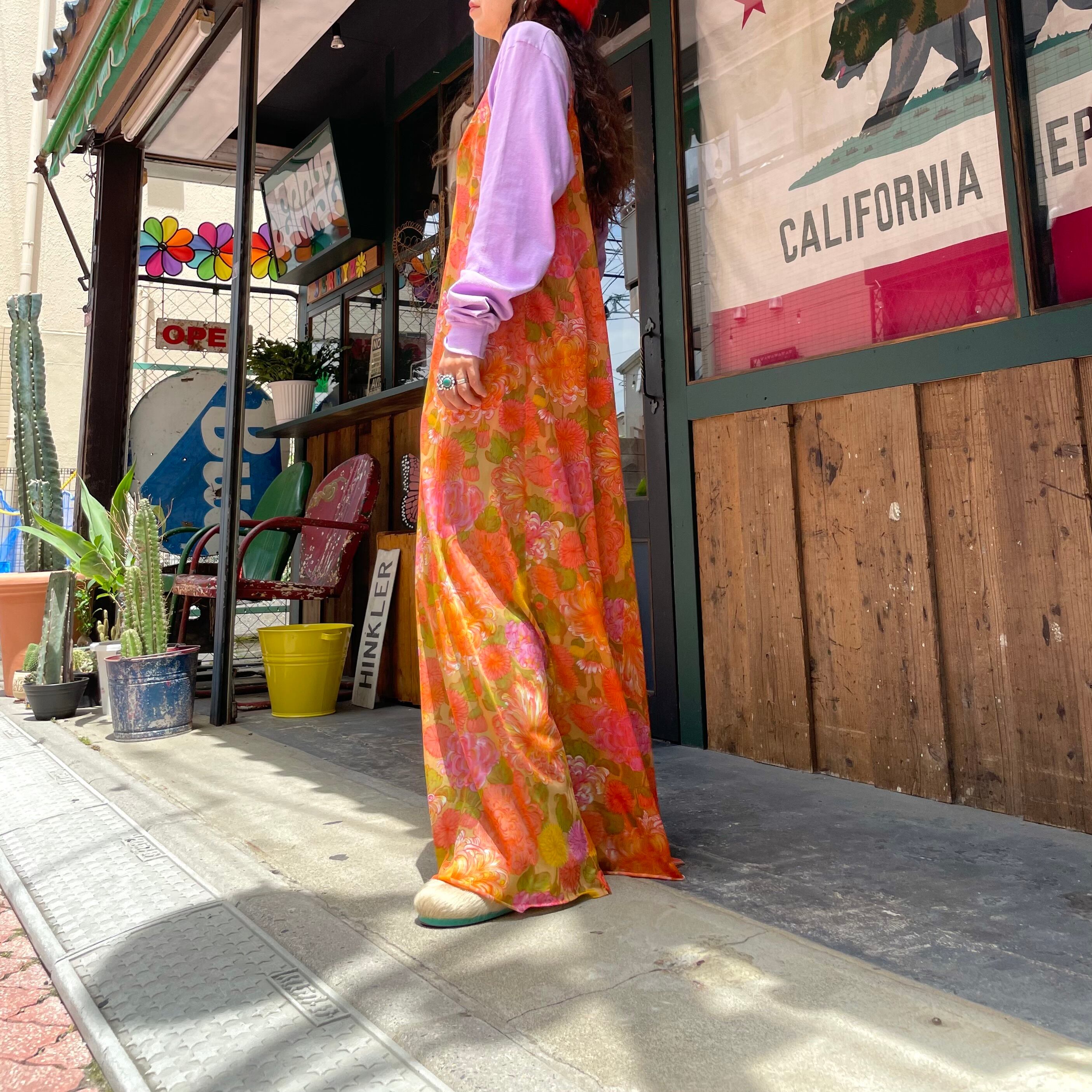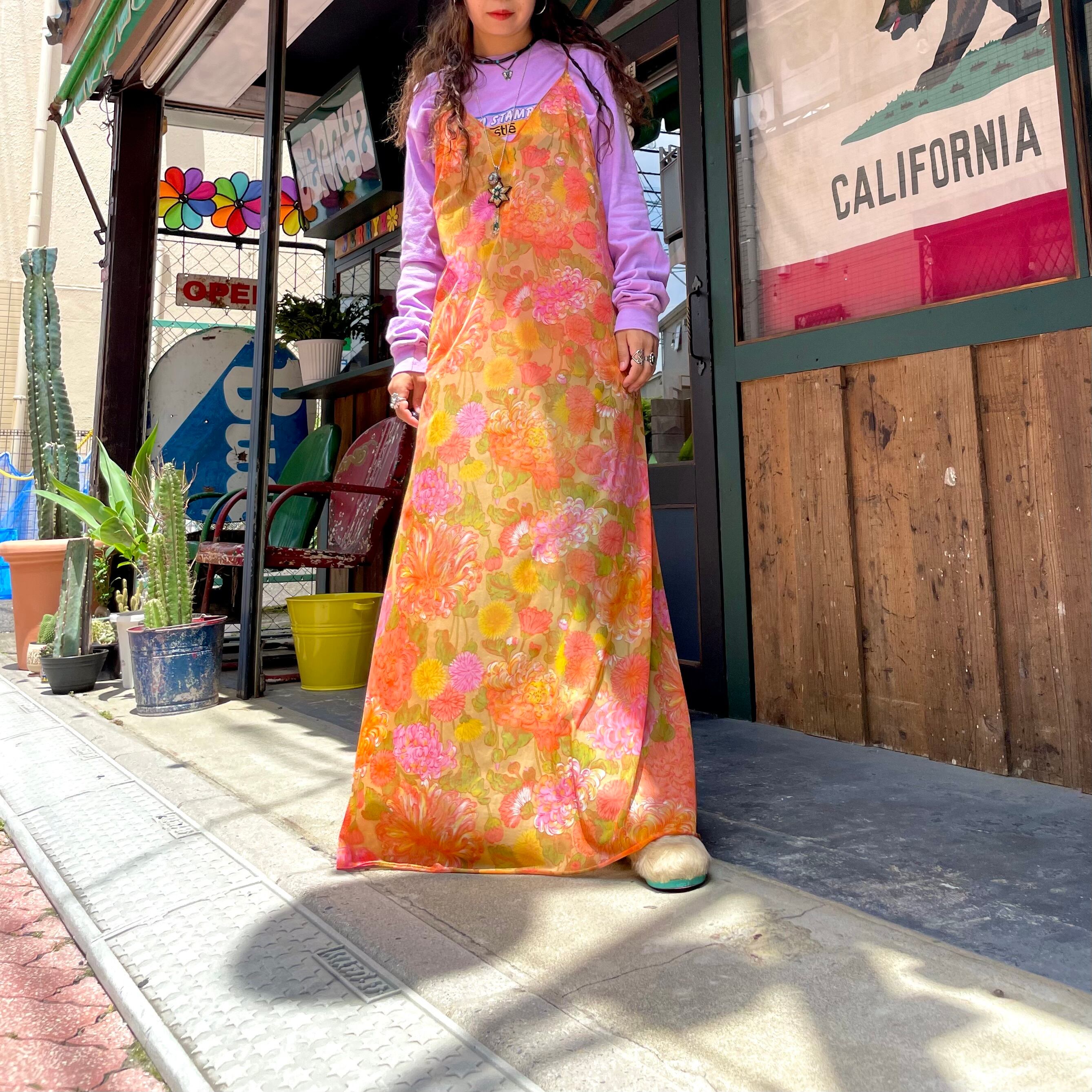 オレンジピンクの花柄がかわいいシースルーのキャミソールワンピースです。