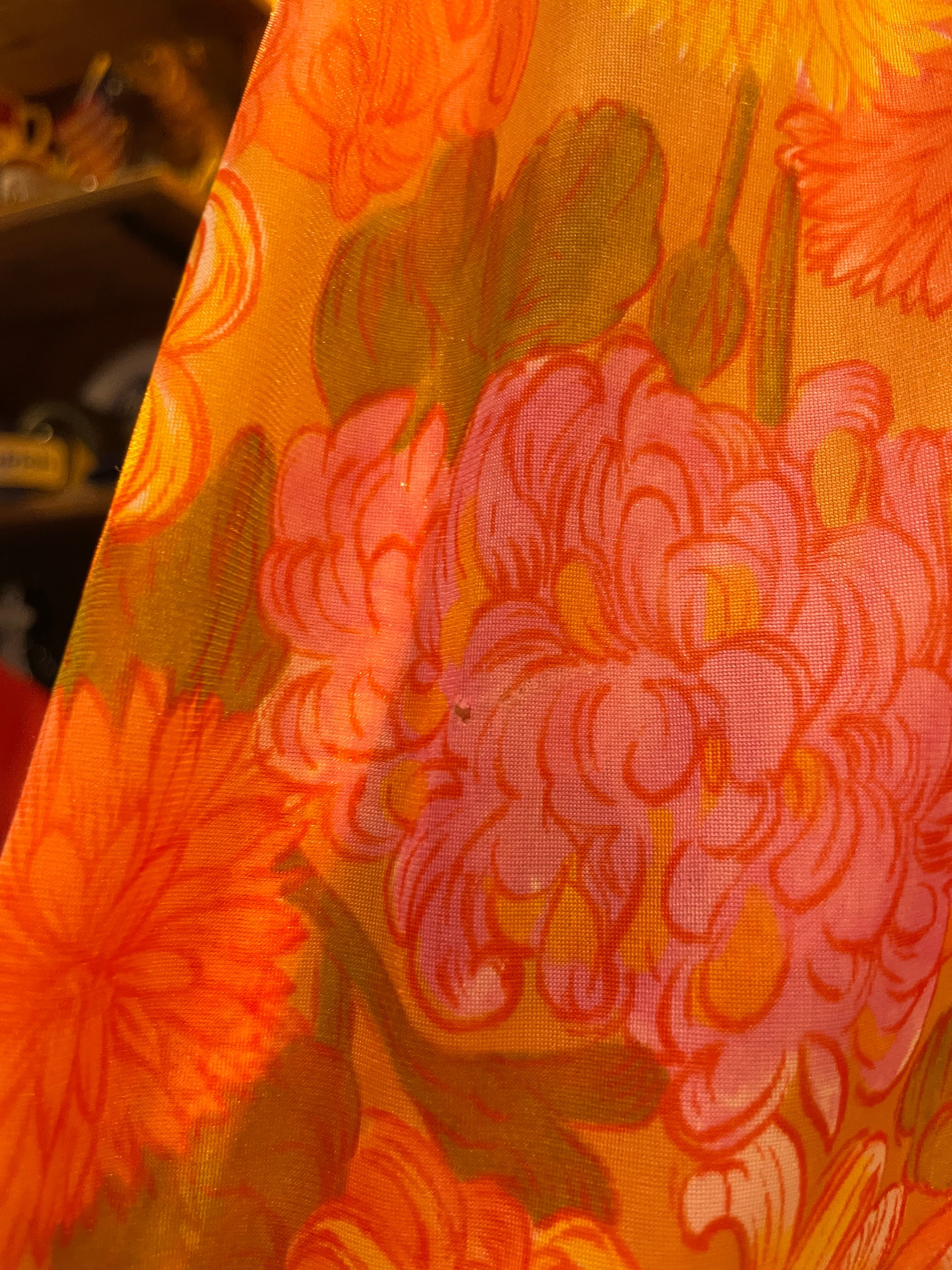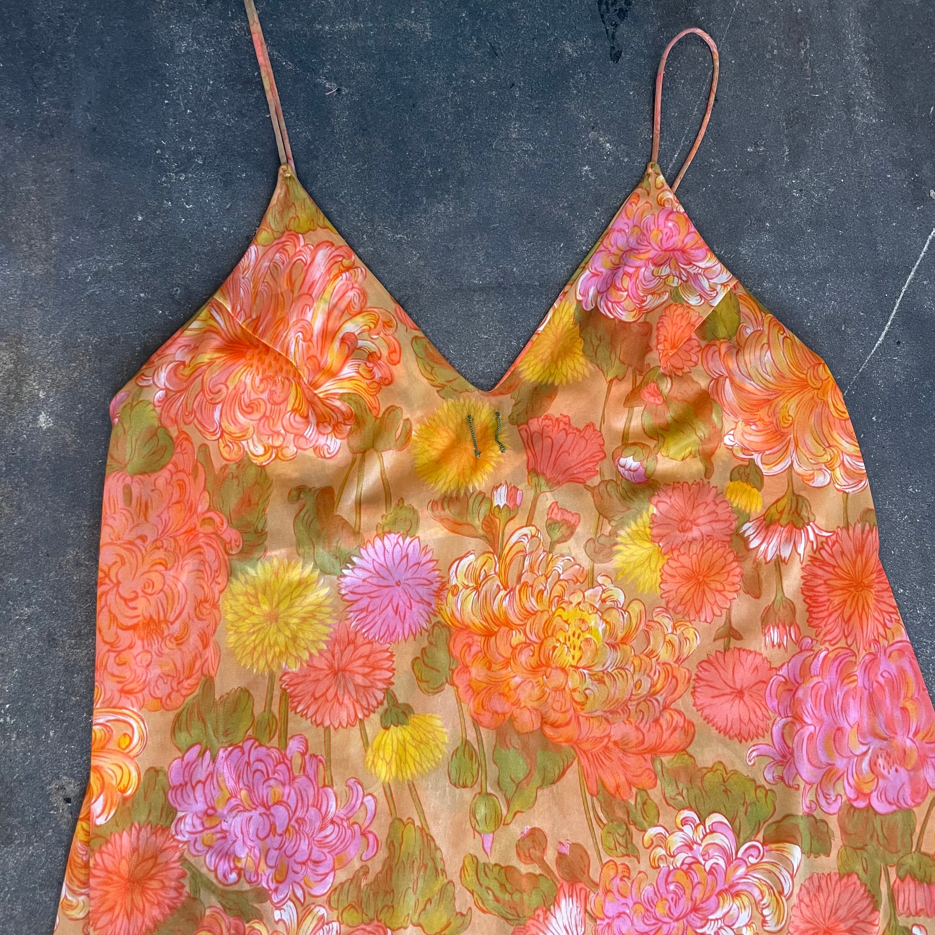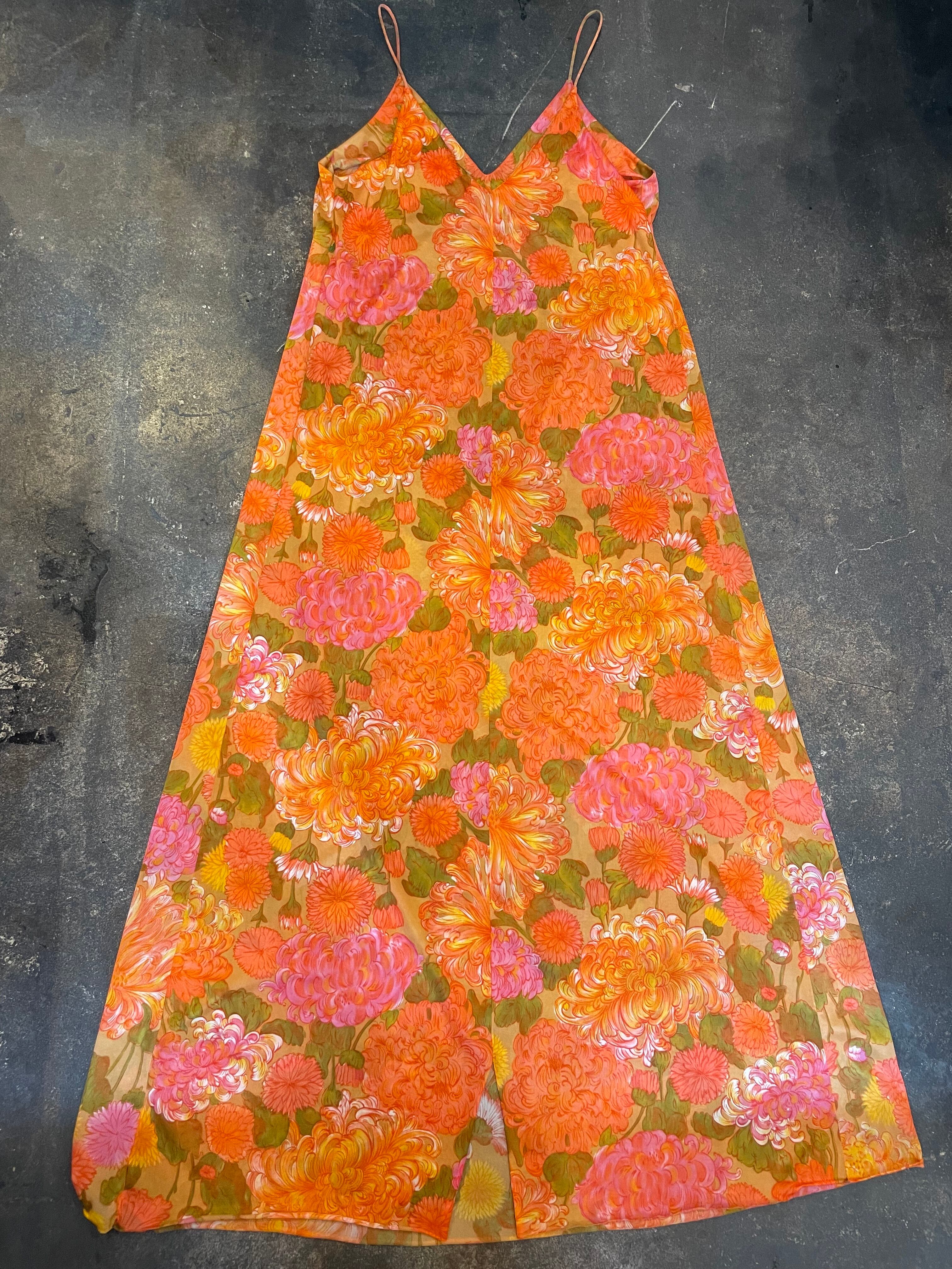 オレンジピンクの花柄がかわいいシースルーのキャミソールワンピースです。