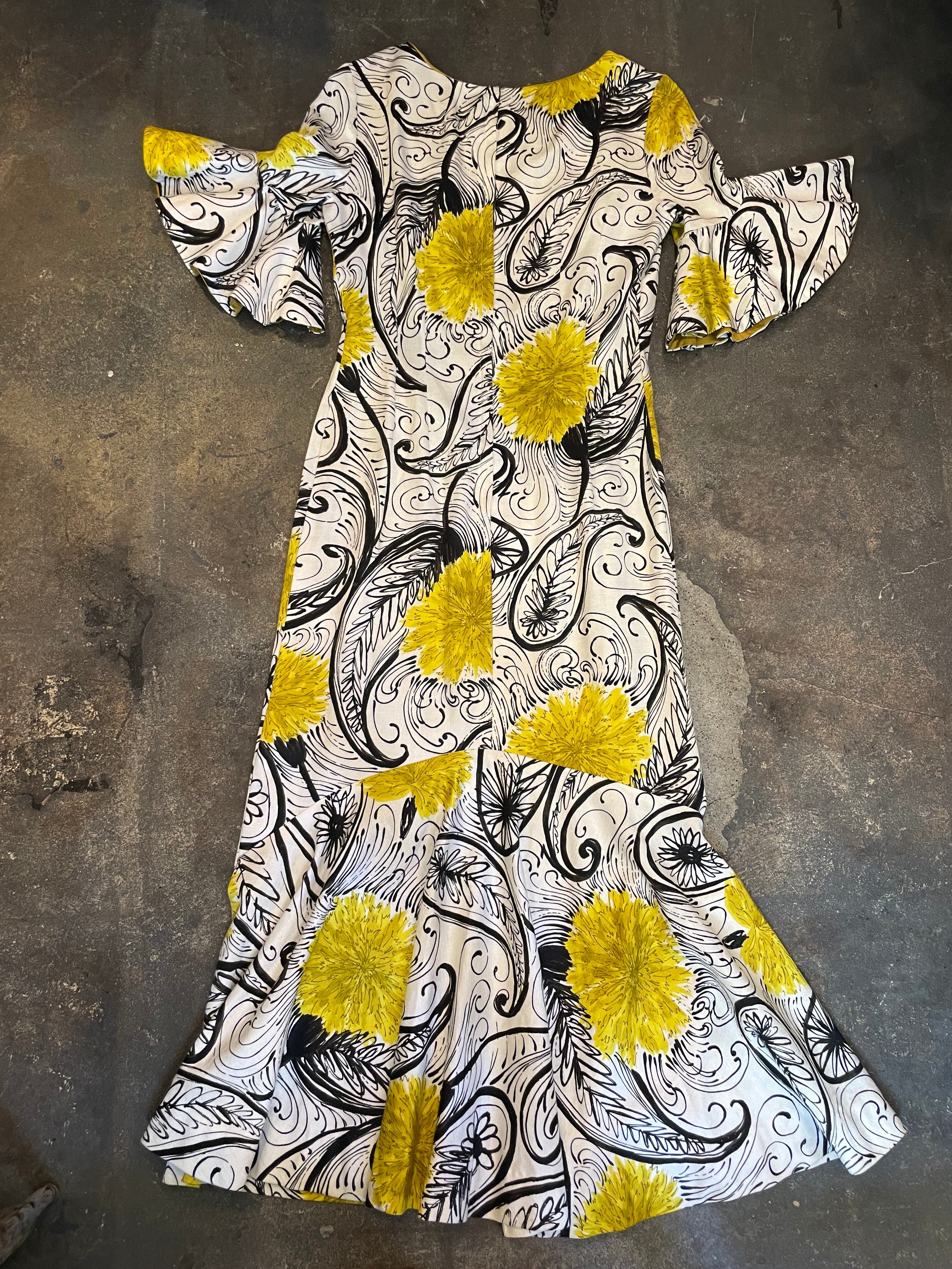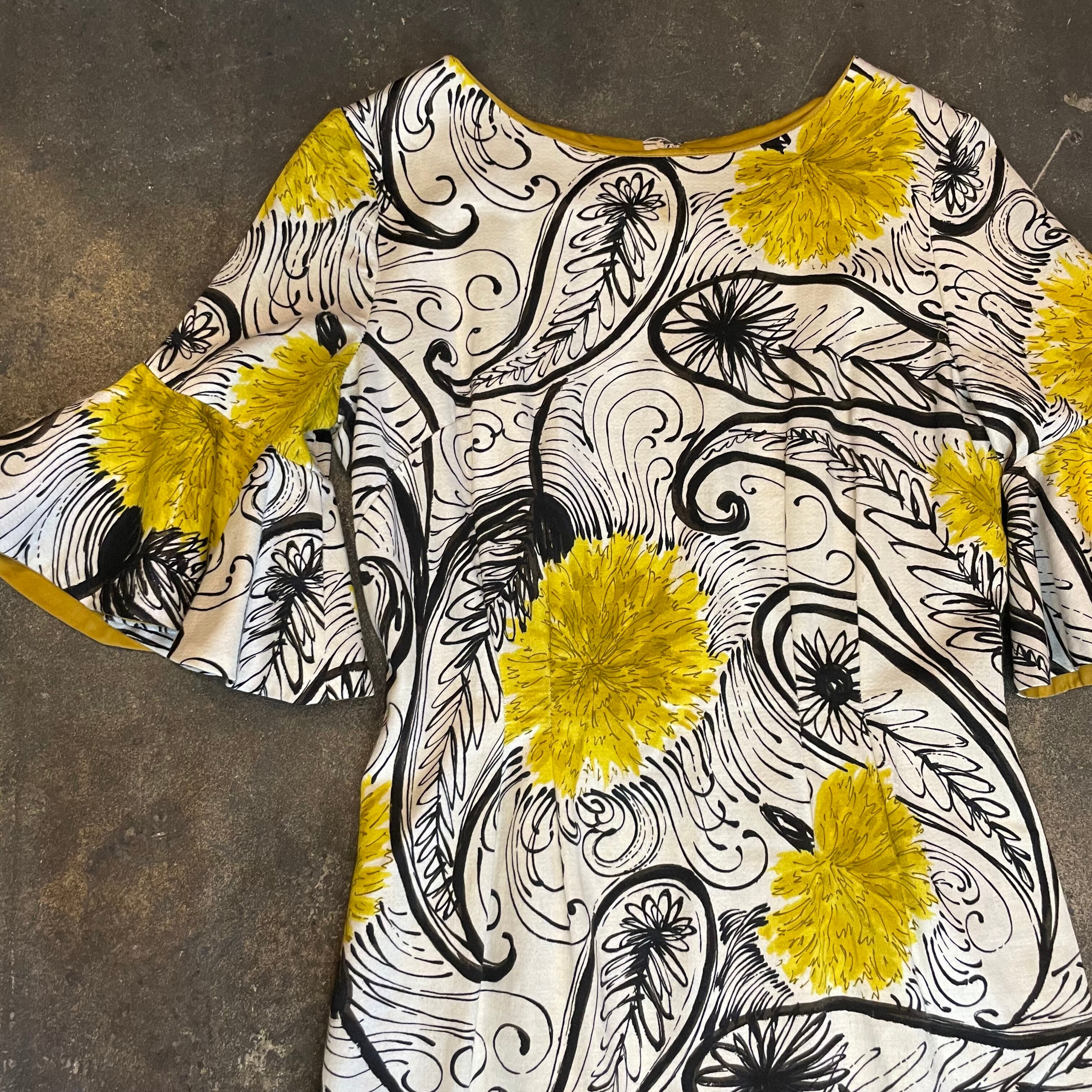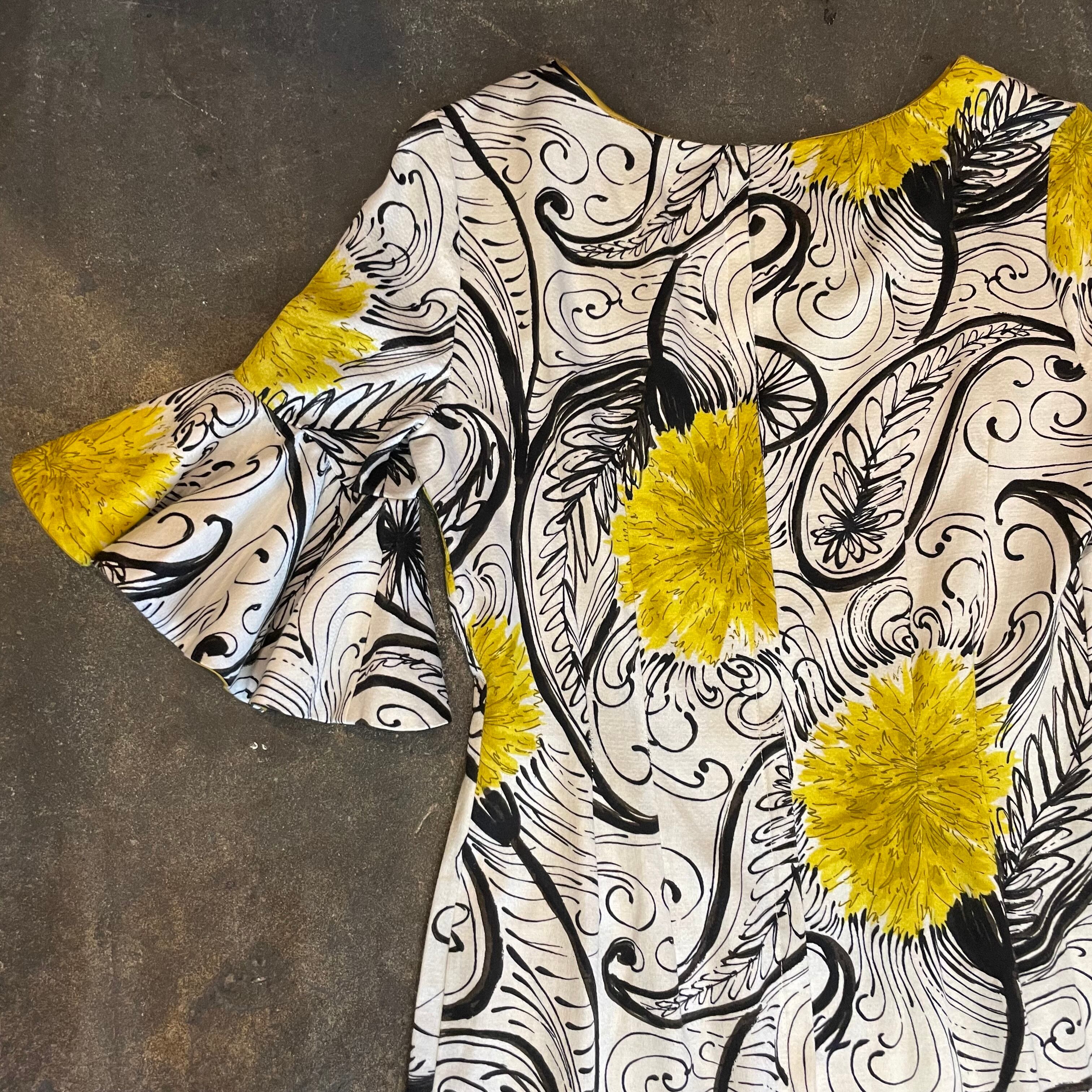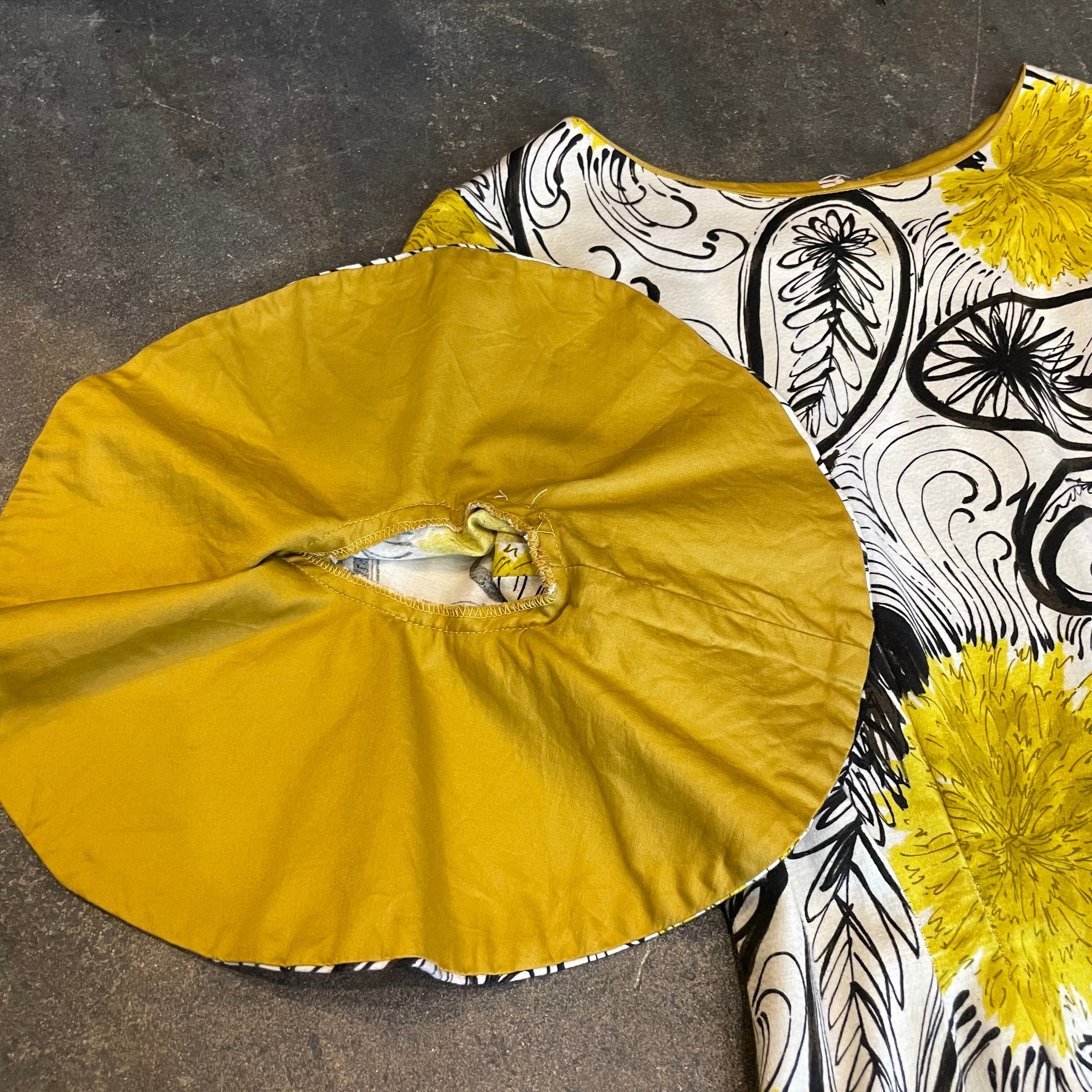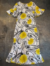 白ベースに黒の線描、黄色のお花がとてもクールな印象です。一見マーメイドっぽいシルエットですが、前はスッキリ切り替えもなくシンプルで、後ろの膝裏あたりからきれいにフレアな切り替えになっているのも素敵ですし、お袖のサーキュラーな切り替えもとてもかわいいですね。