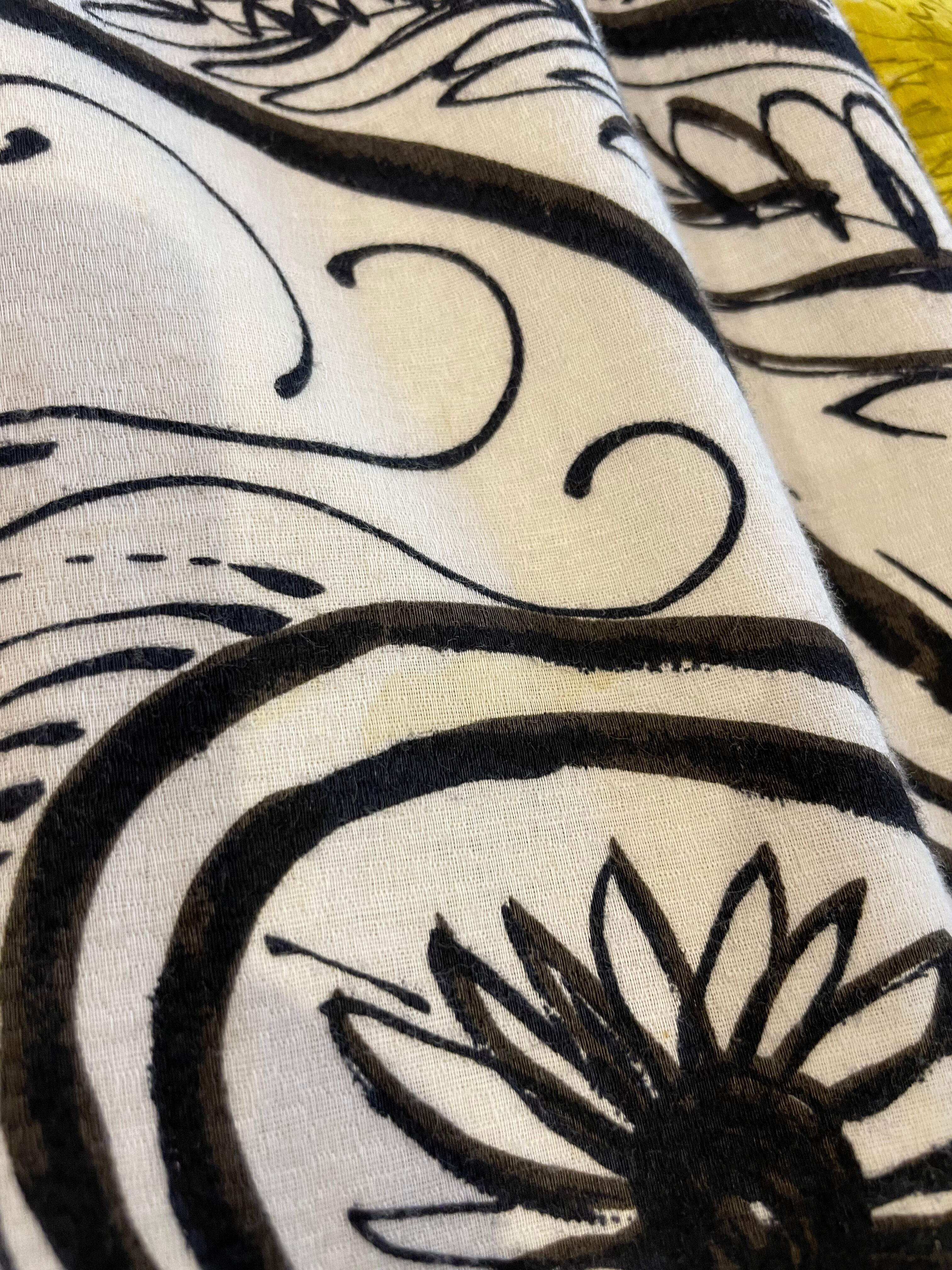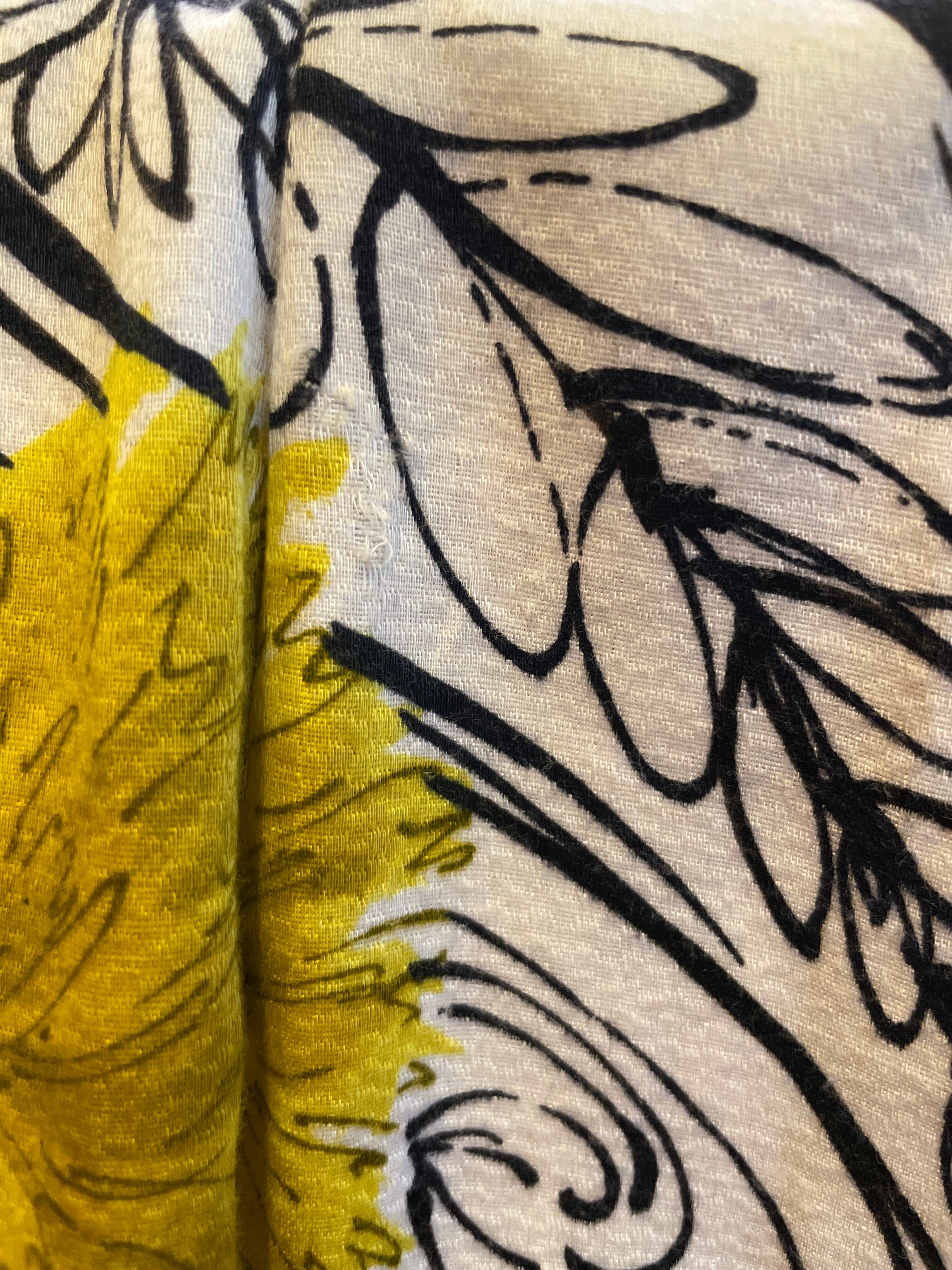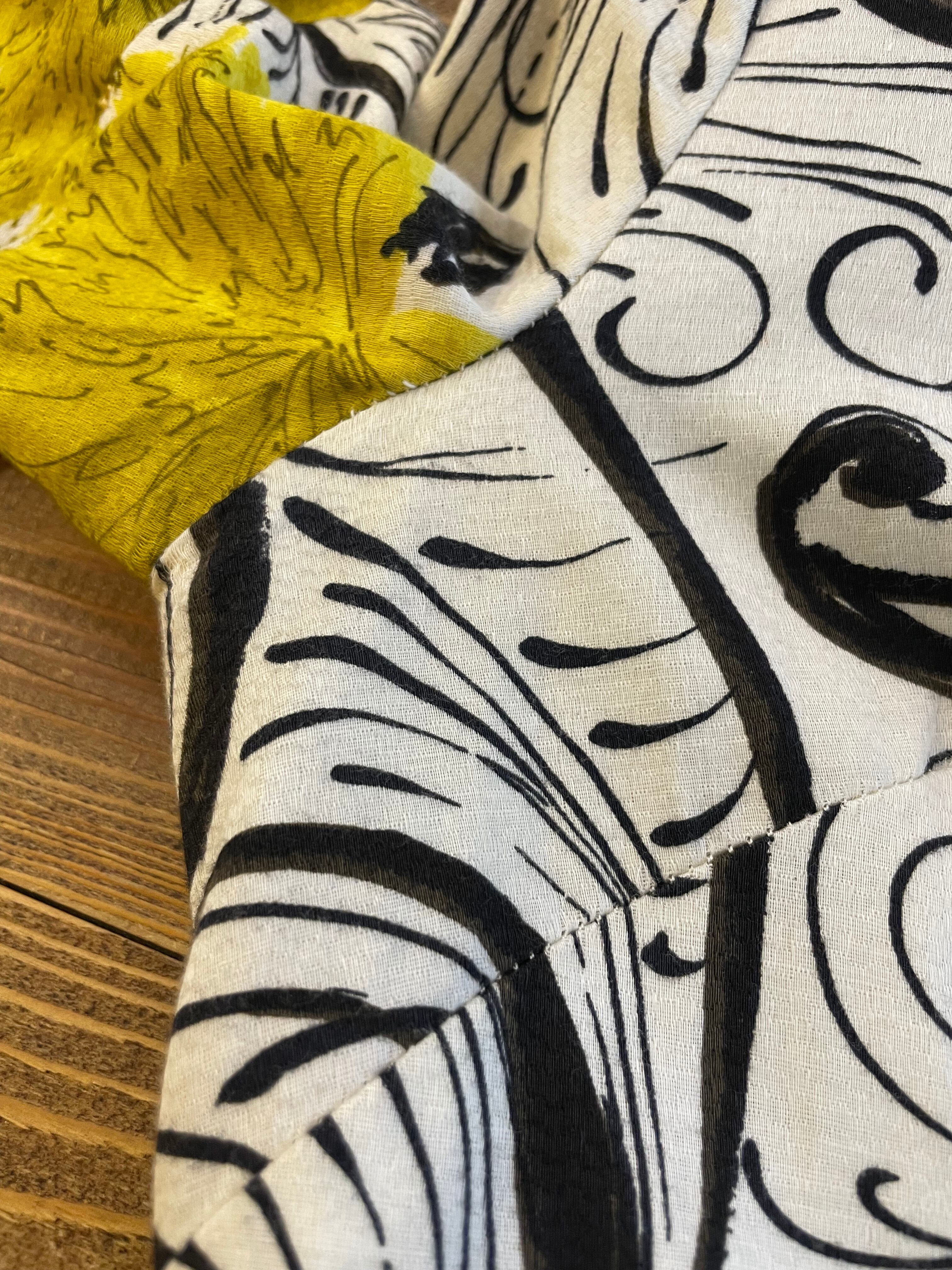 白ベースに黒の線描、黄色のお花がとてもクールな印象です。一見マーメイドっぽいシルエットですが、前はスッキリ切り替えもなくシンプルで、後ろの膝裏あたりからきれいにフレアな切り替えになっているのも素敵ですし、お袖のサーキュラーな切り替えもとてもかわいいですね。