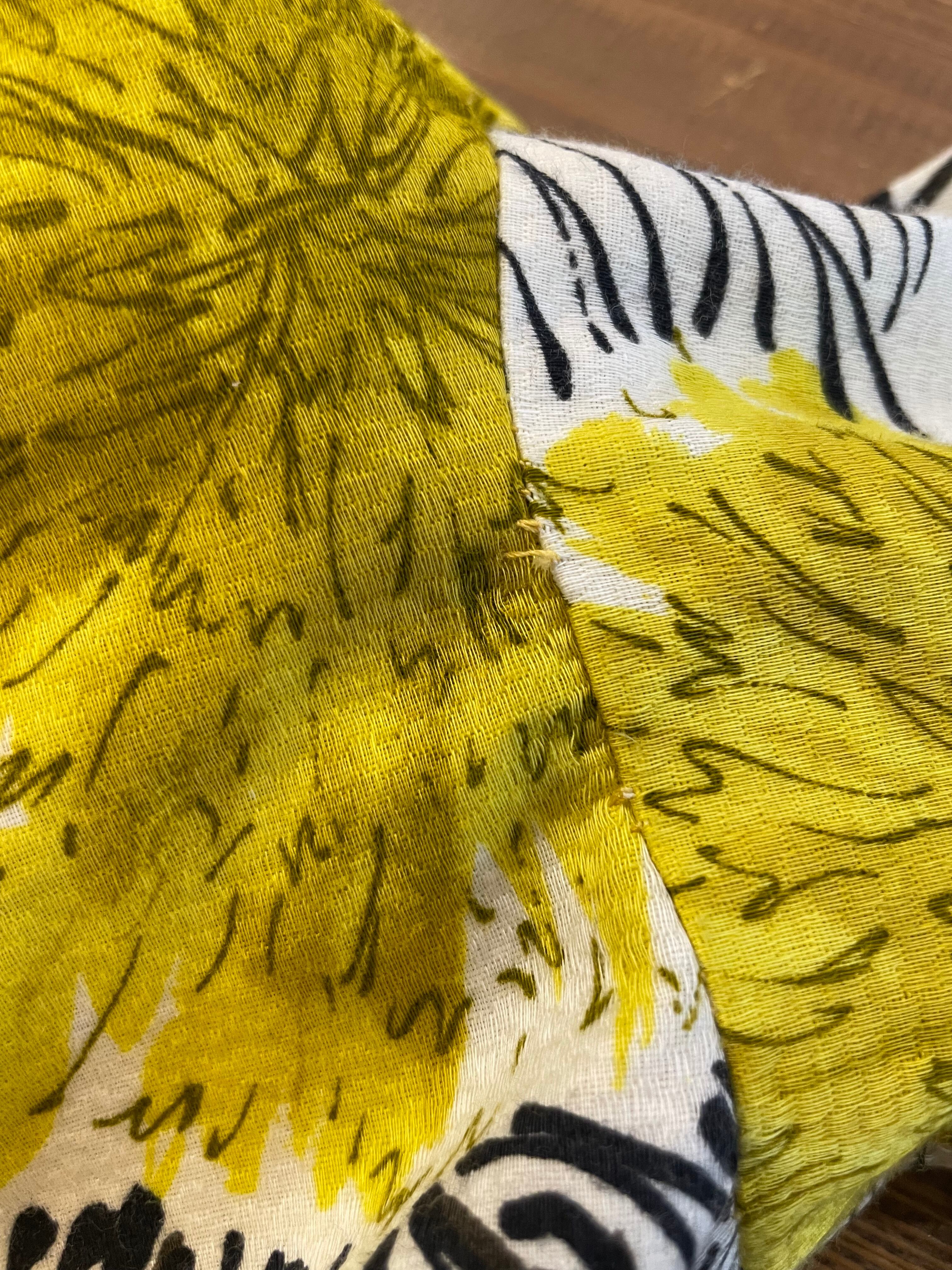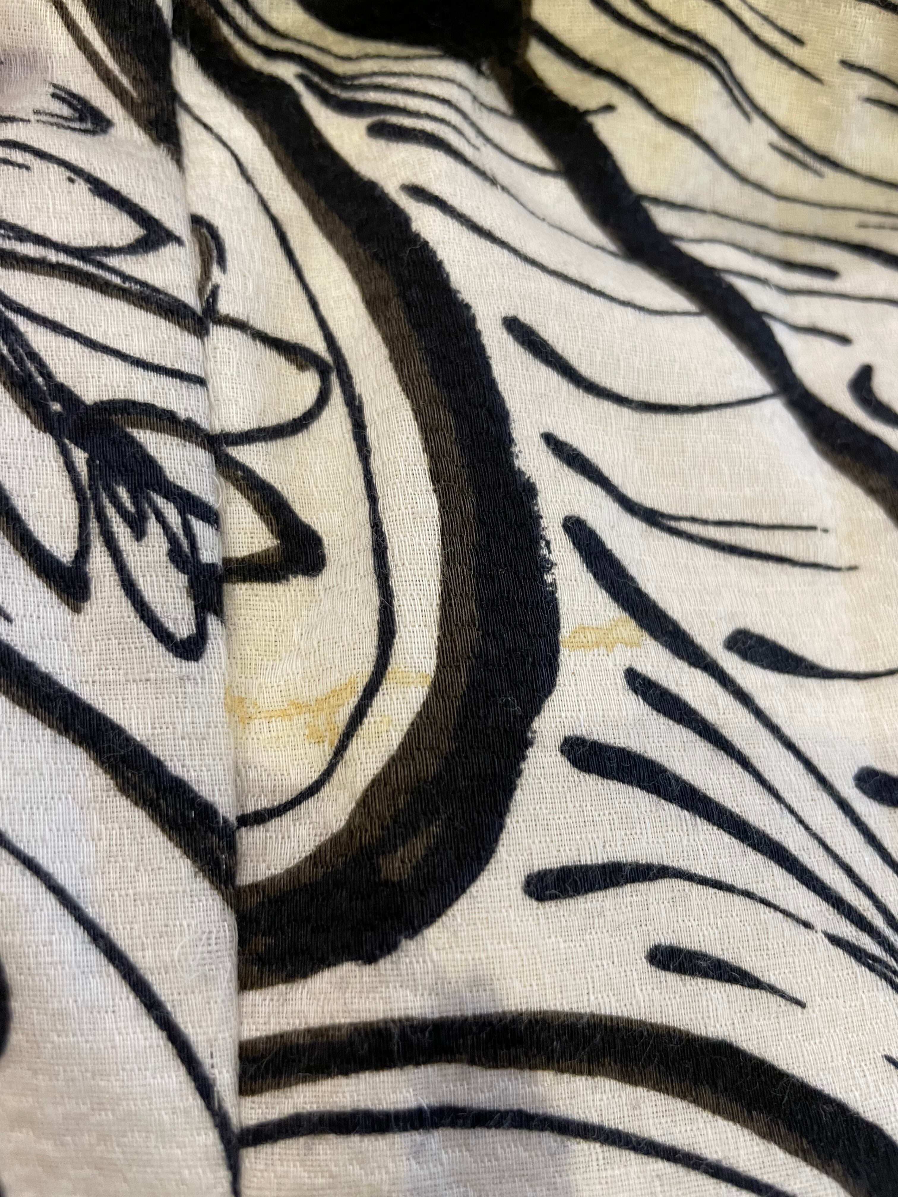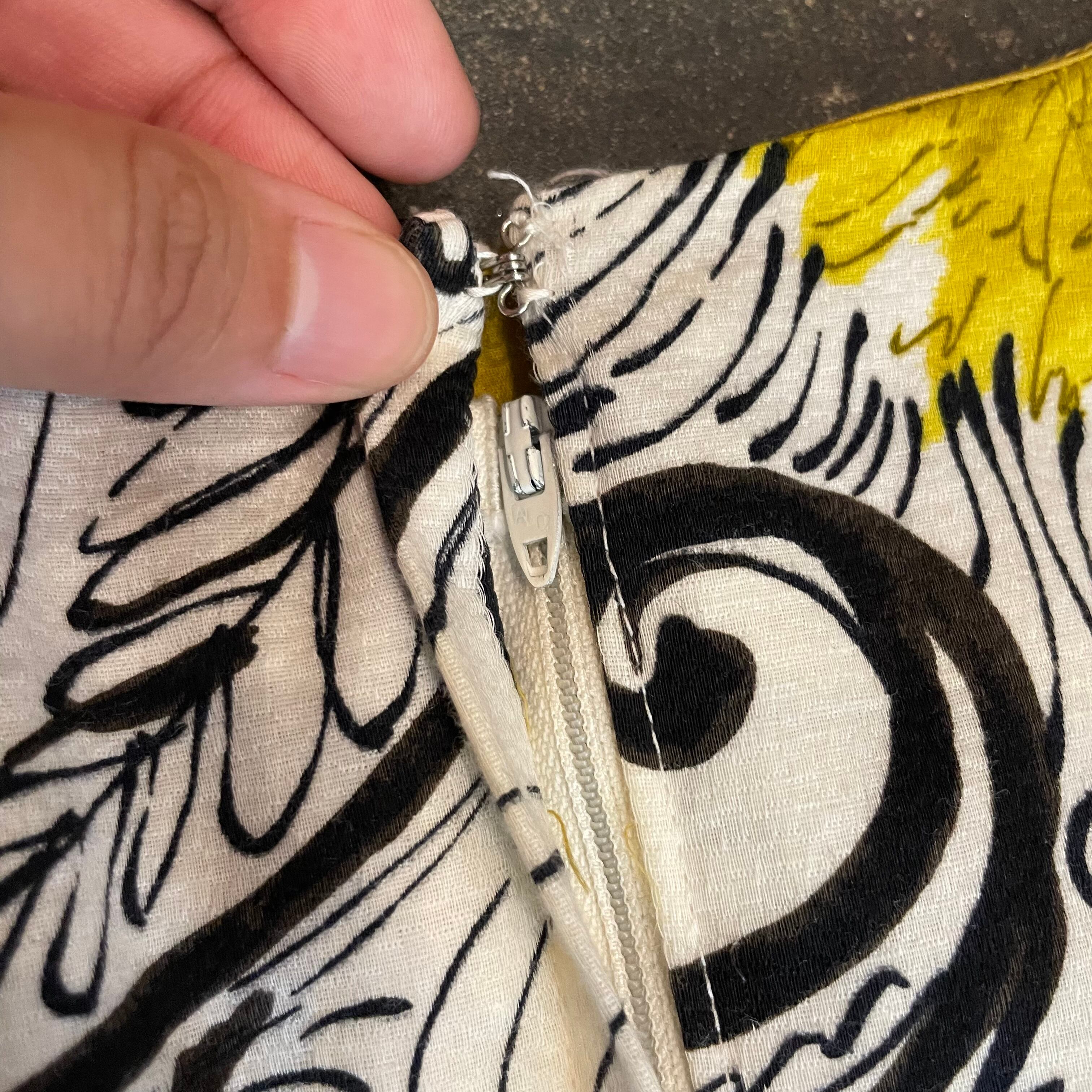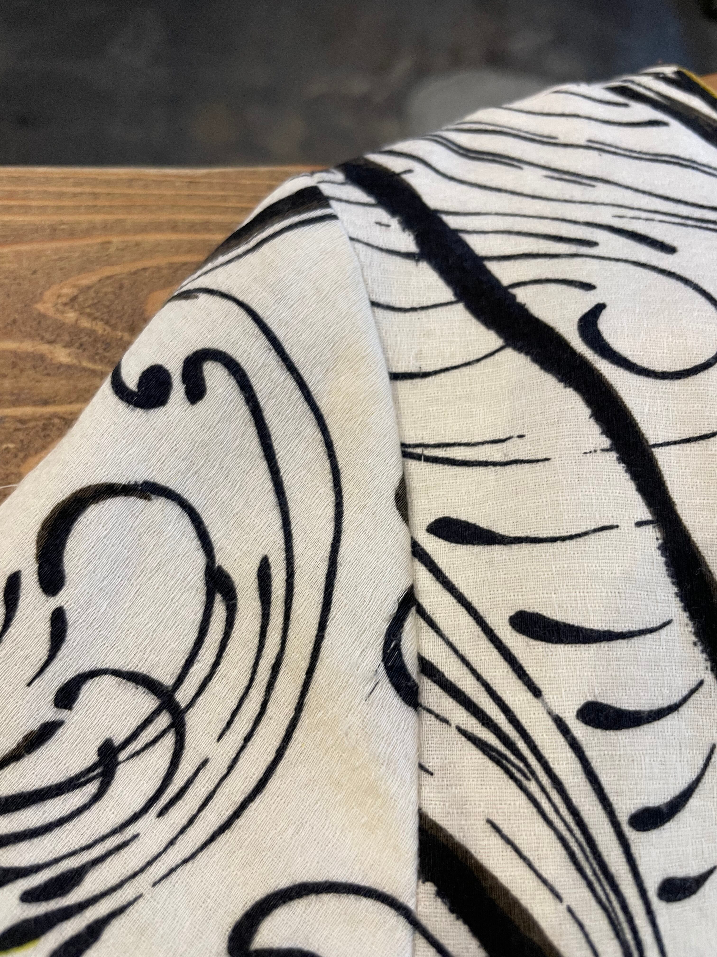 白ベースに黒の線描、黄色のお花がとてもクールな印象です。一見マーメイドっぽいシルエットですが、前はスッキリ切り替えもなくシンプルで、後ろの膝裏あたりからきれいにフレアな切り替えになっているのも素敵ですし、お袖のサーキュラーな切り替えもとてもかわいいですね。