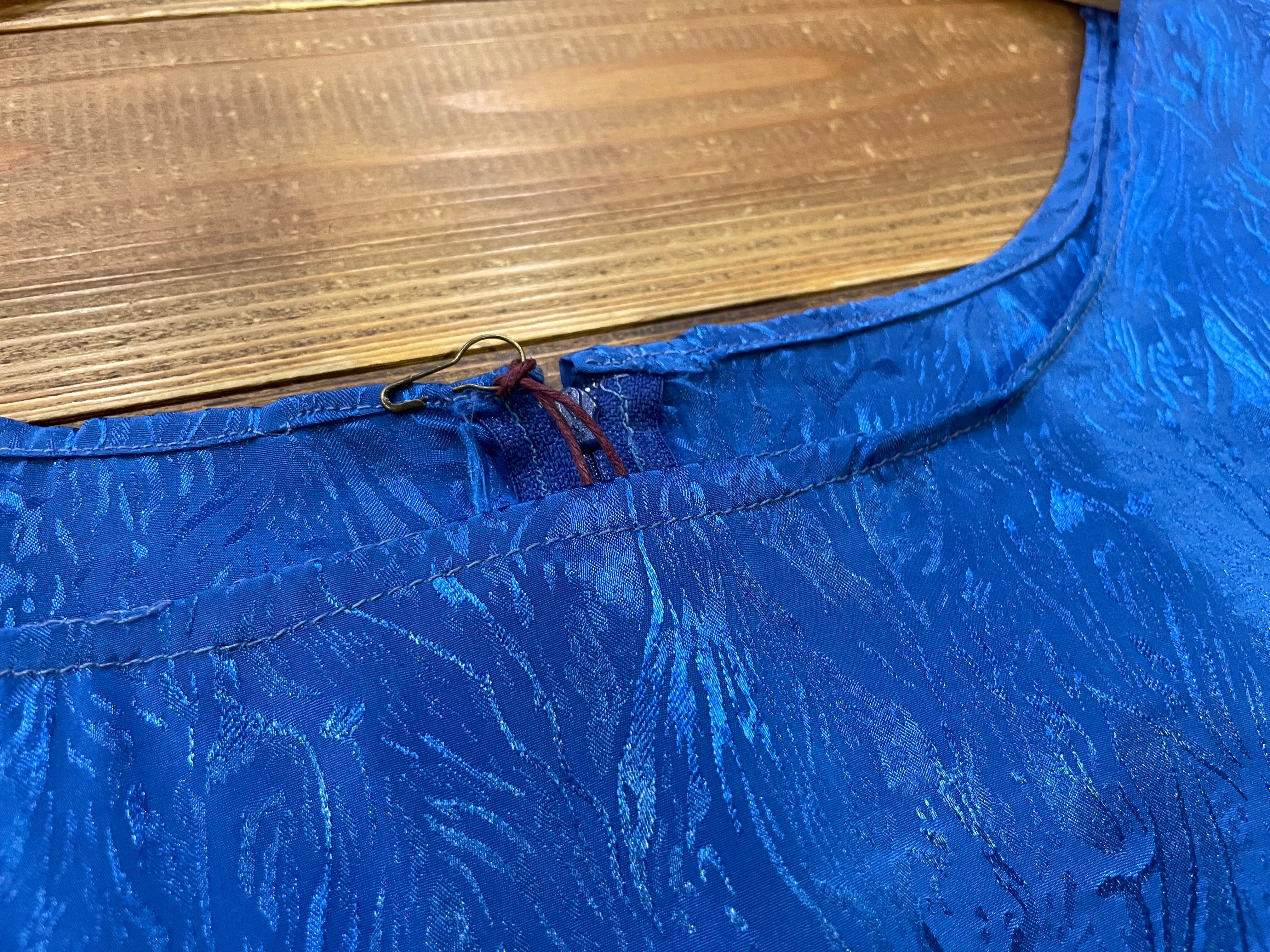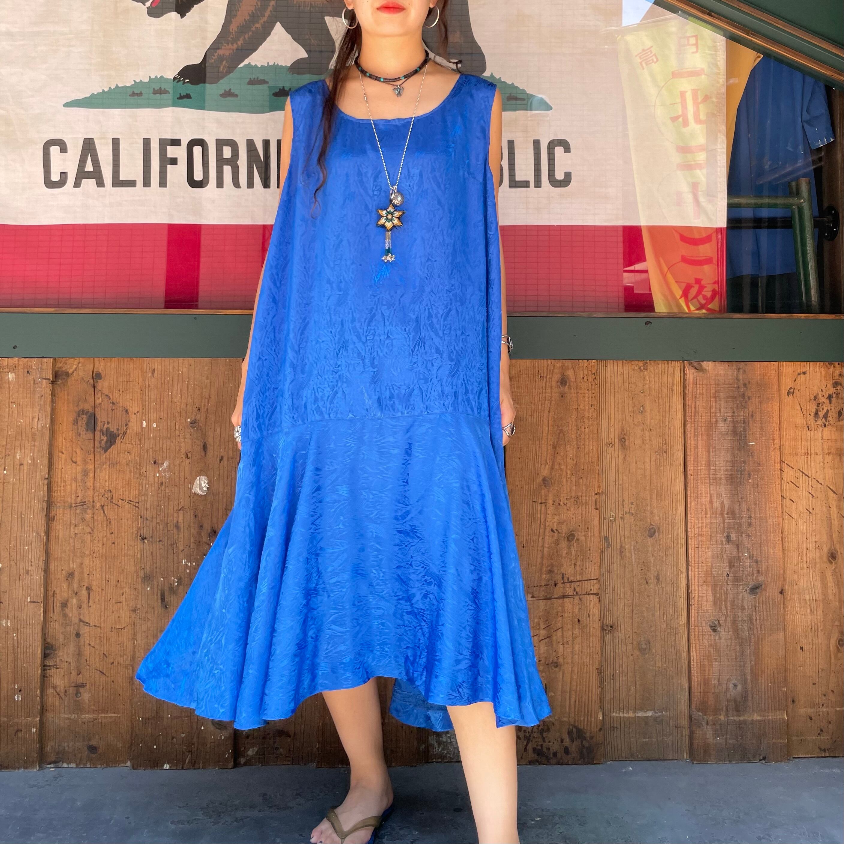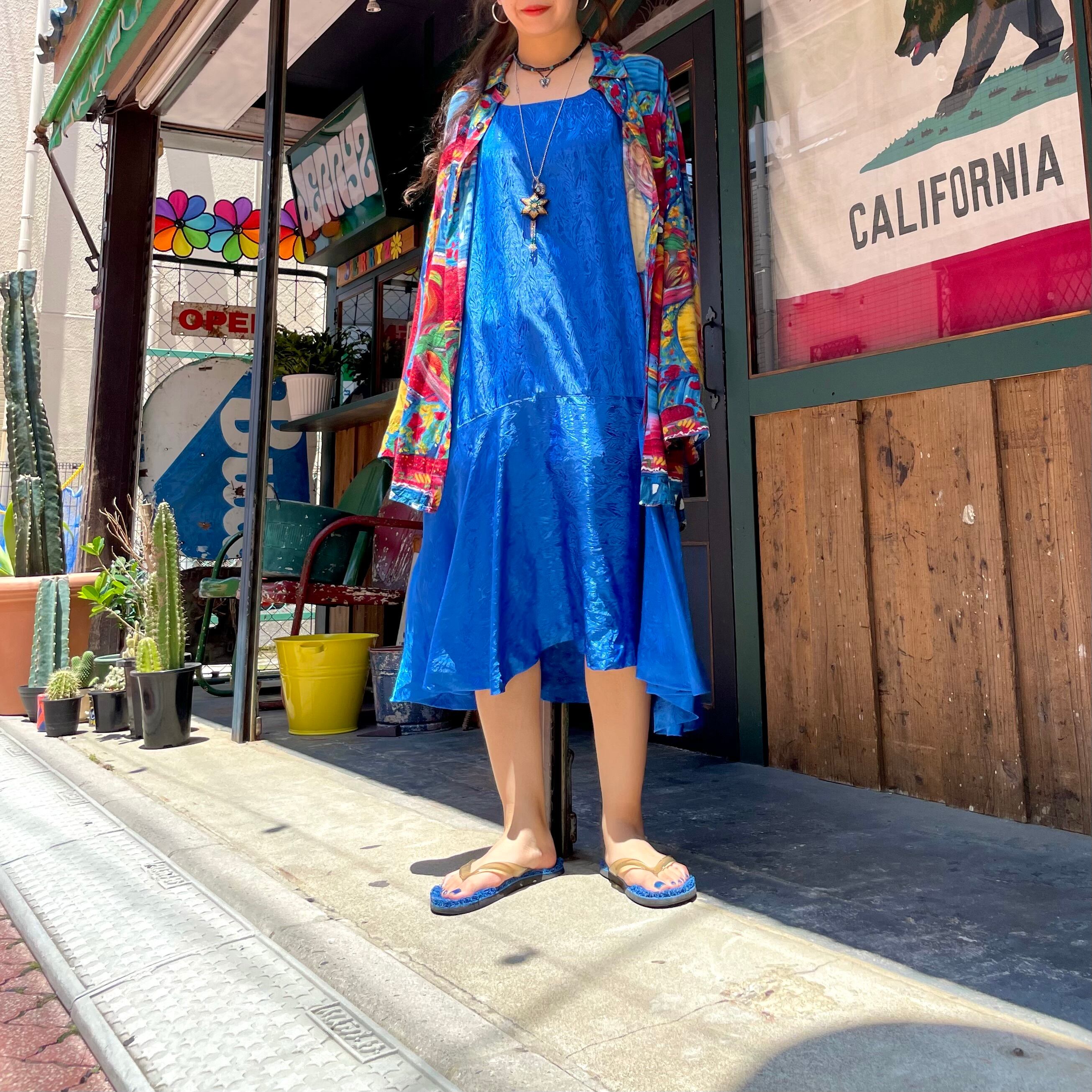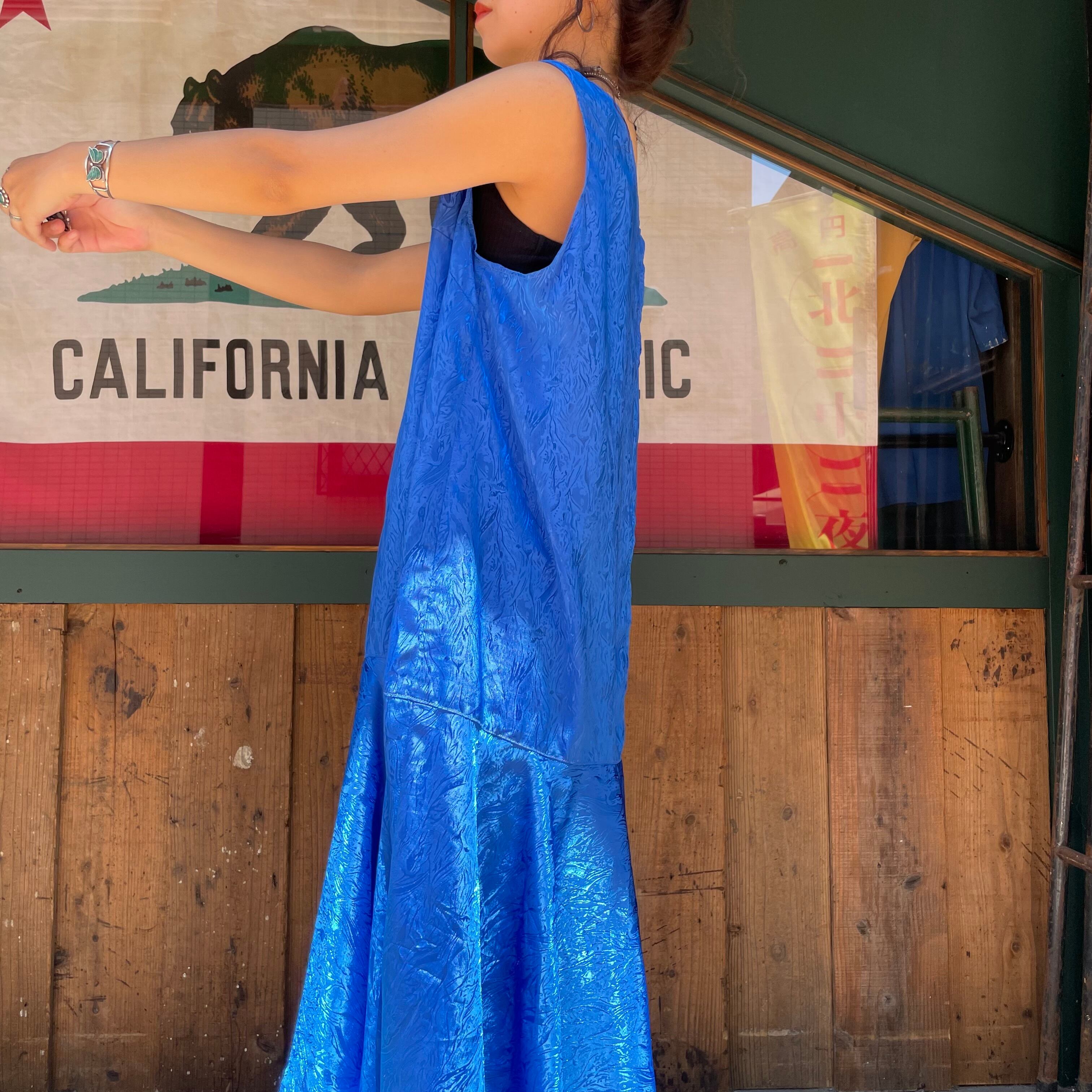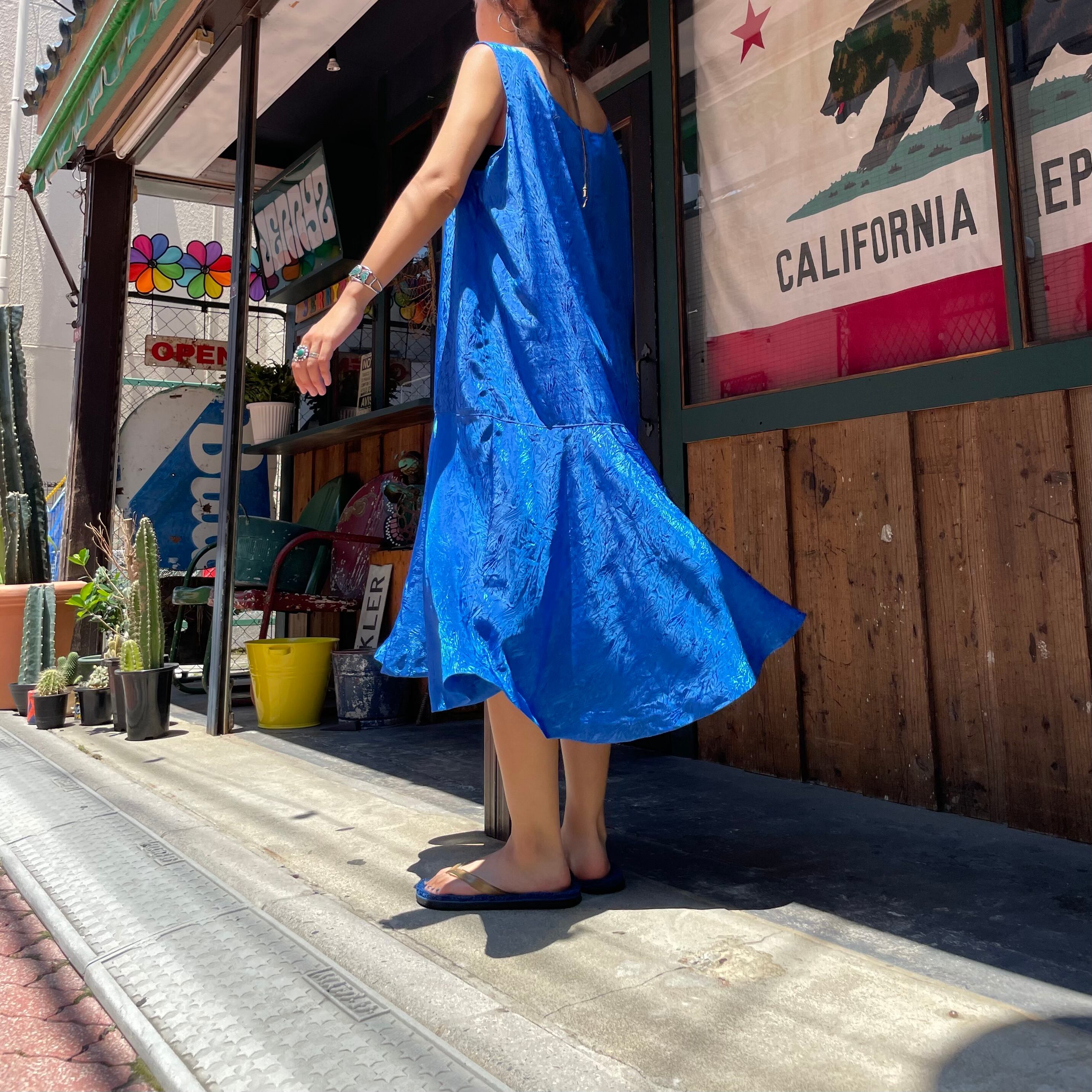 光沢感のある薄手でテロテロの素材感がかわいい、真っ青なワンピースです。