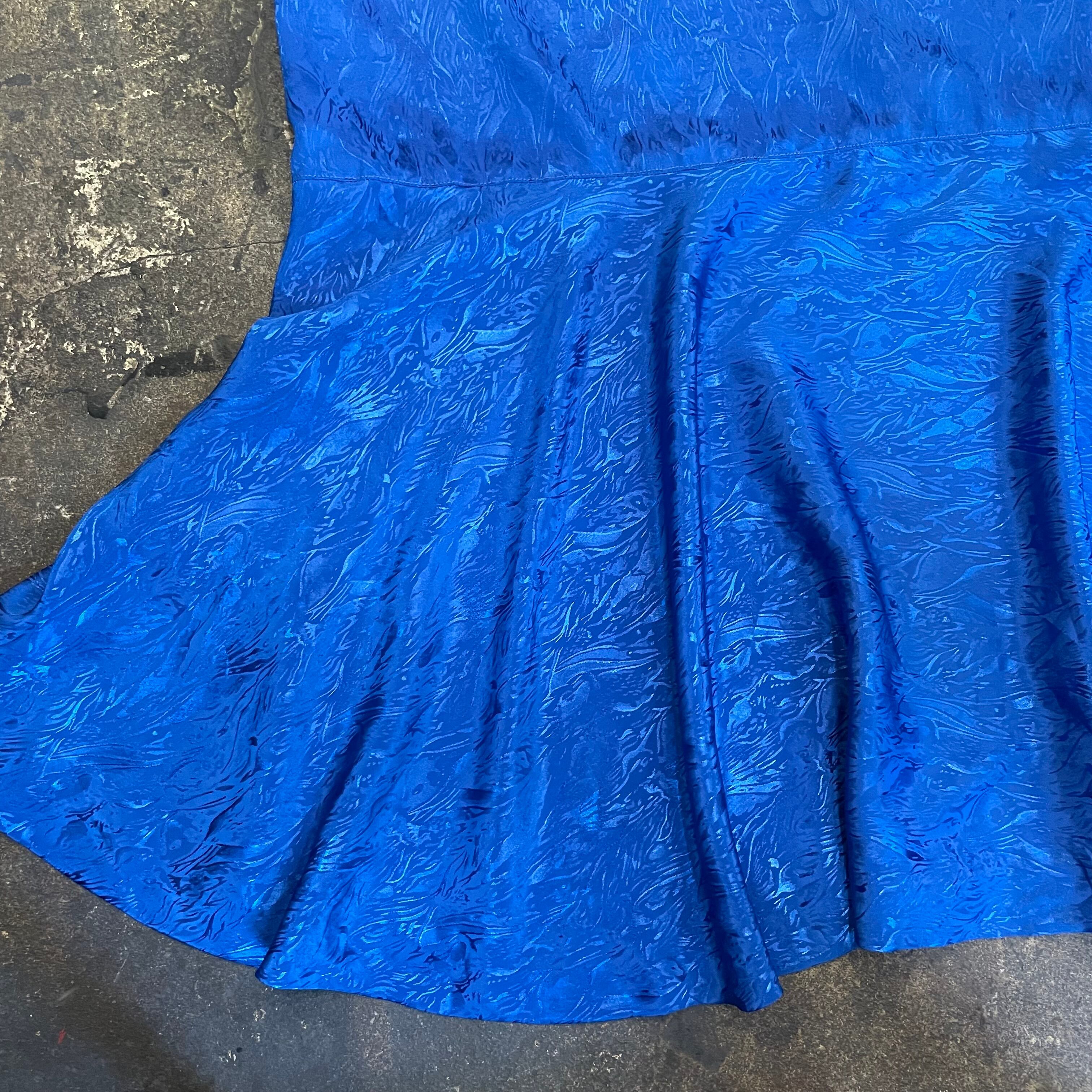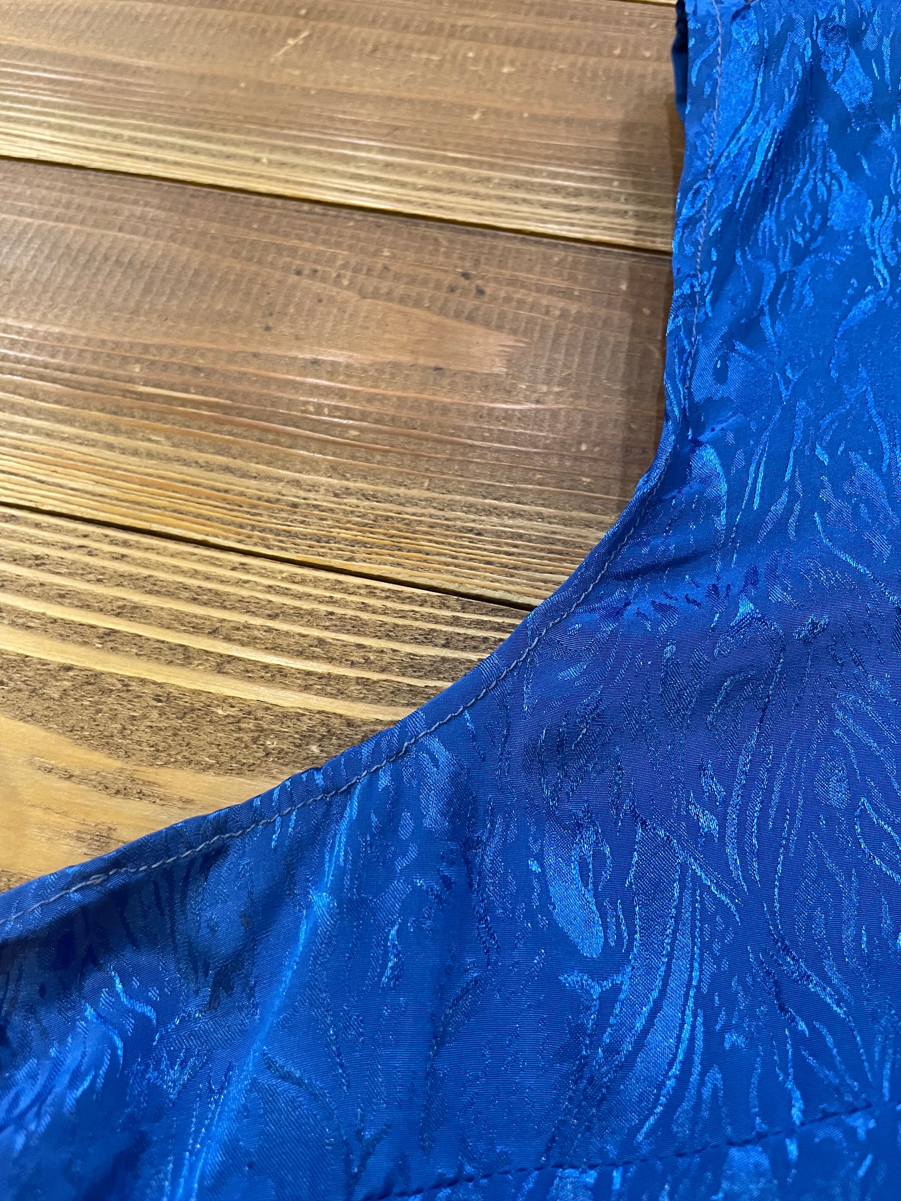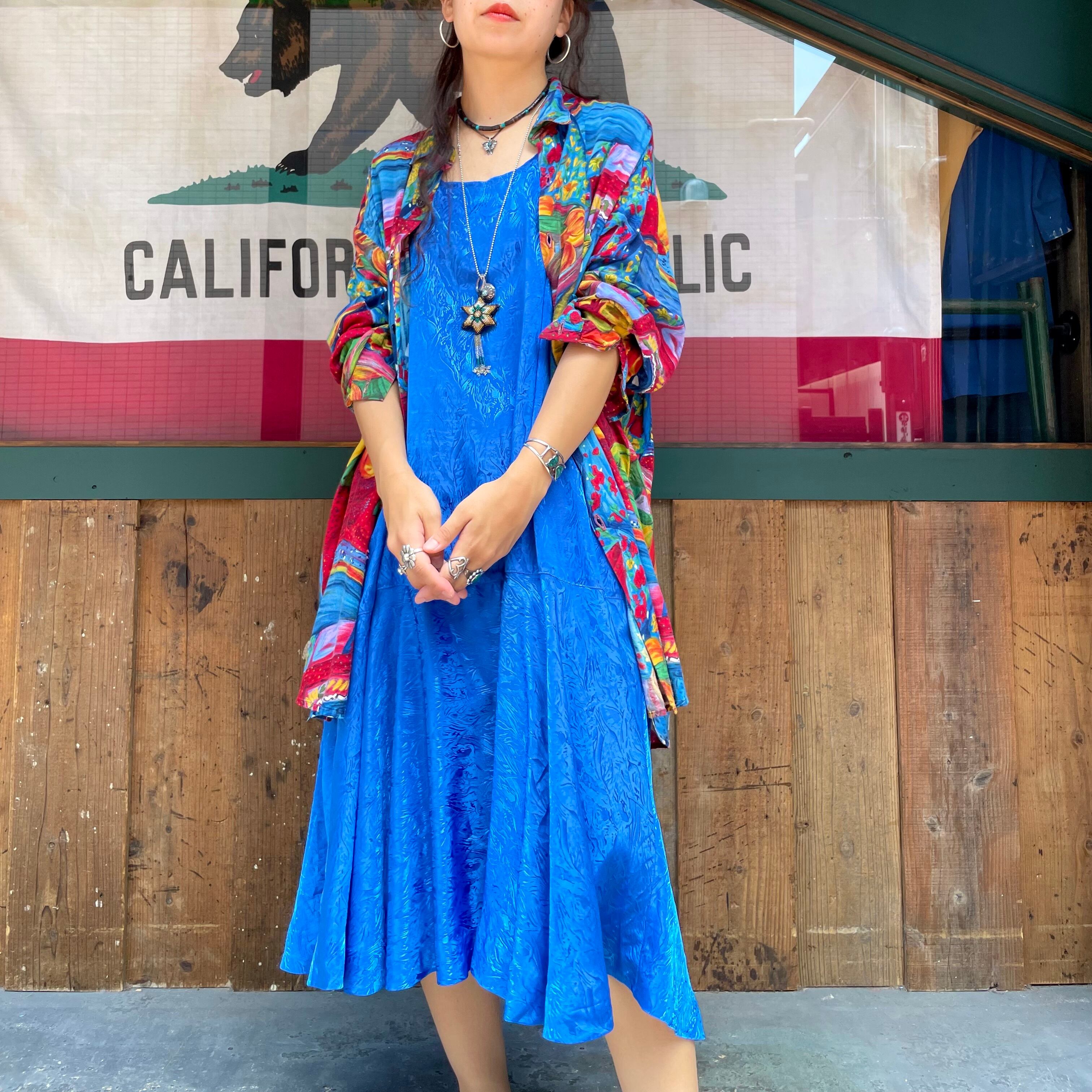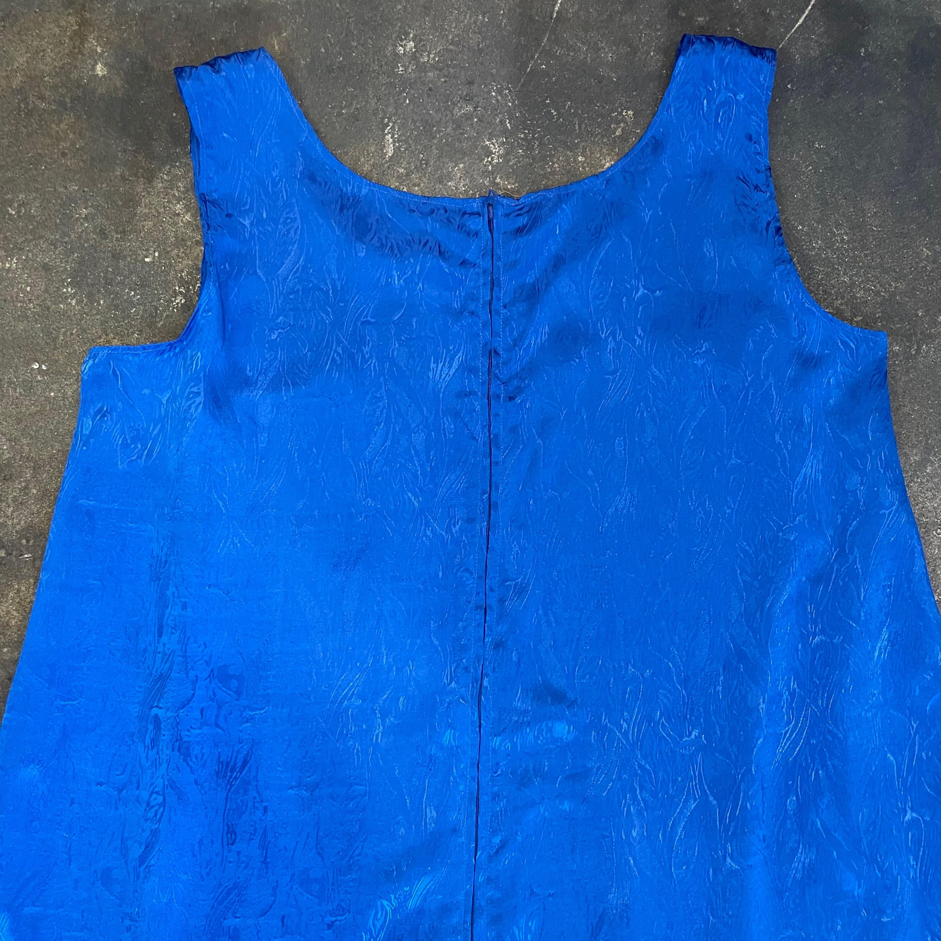 光沢感のある薄手でテロテロの素材感がかわいい、真っ青なワンピースです。
