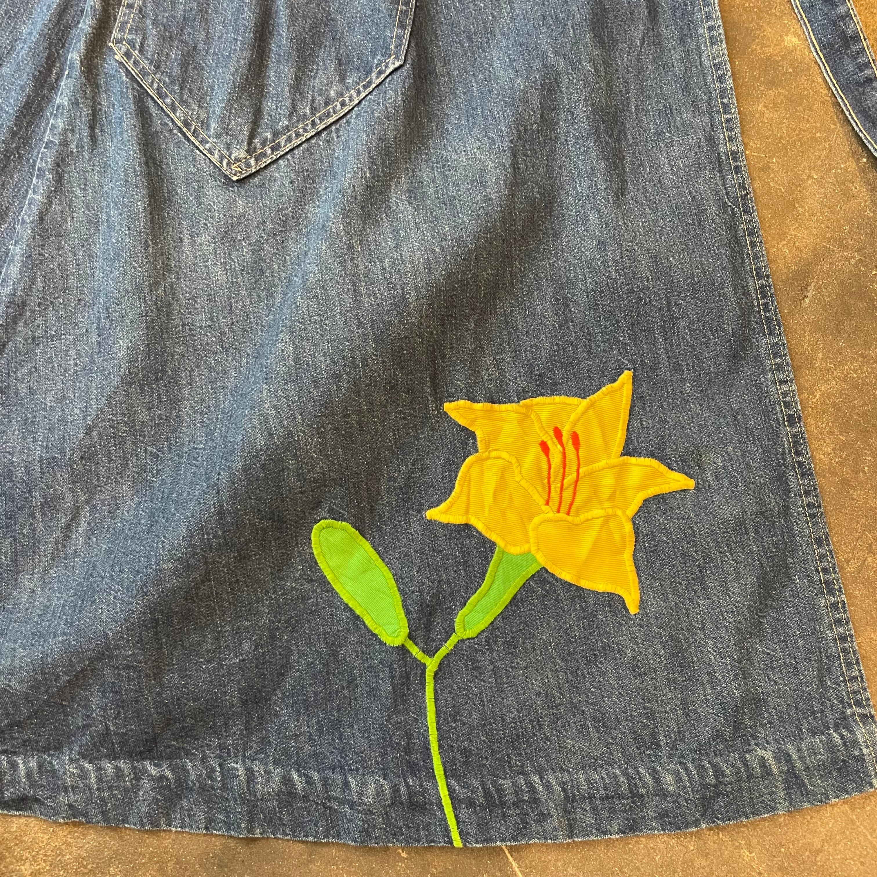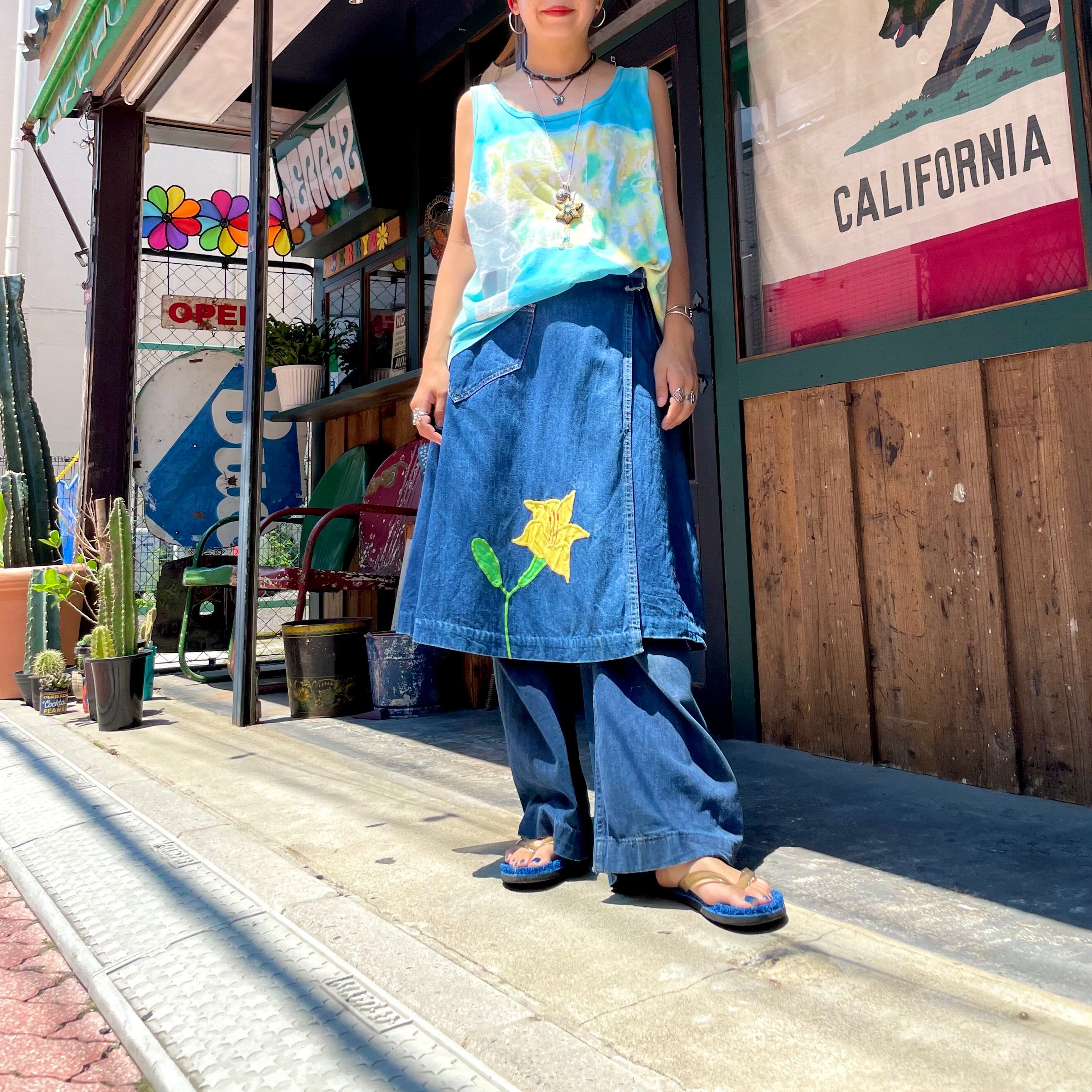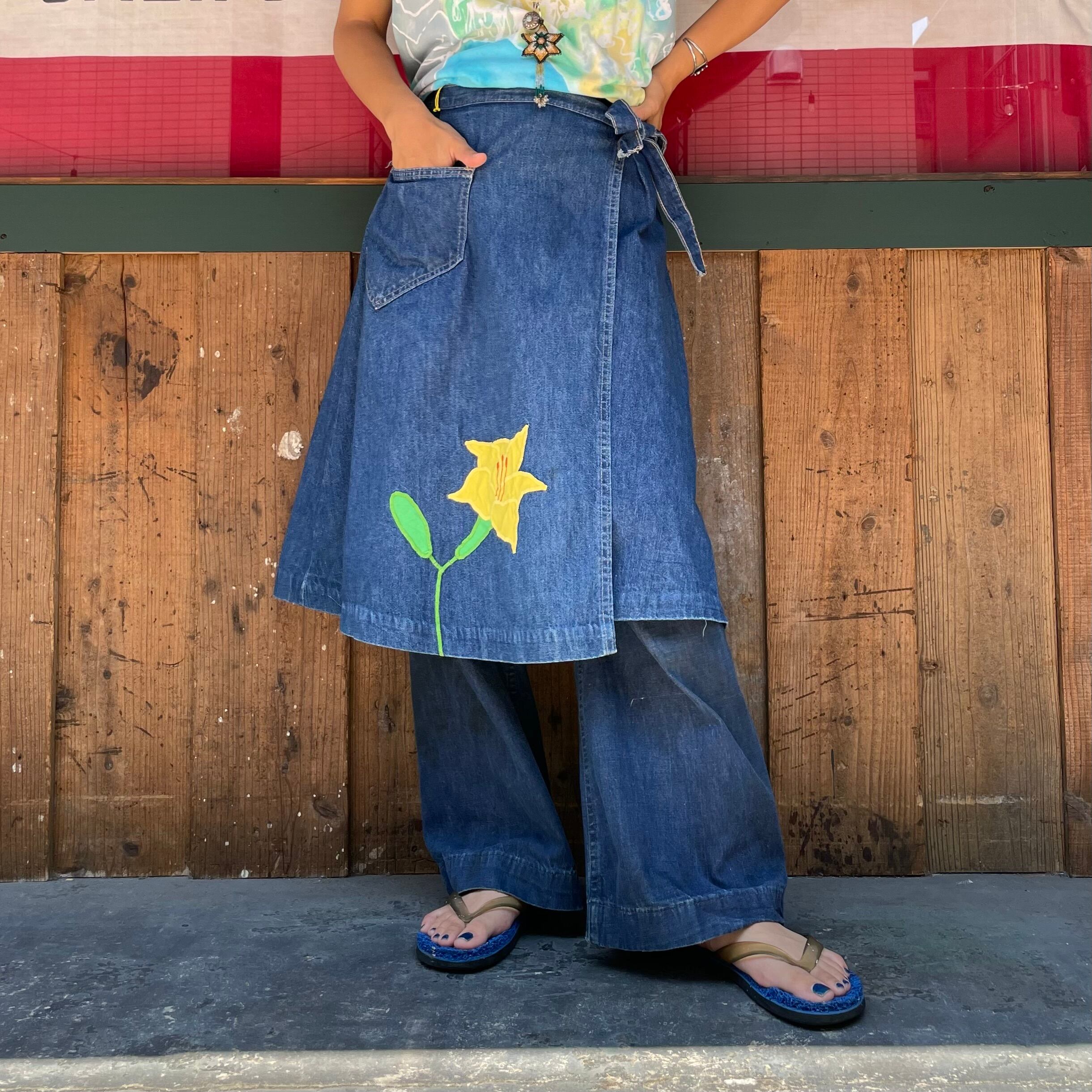 黄色の百合の花?のパッチワークがかわいいデニムの巻きスカートです。