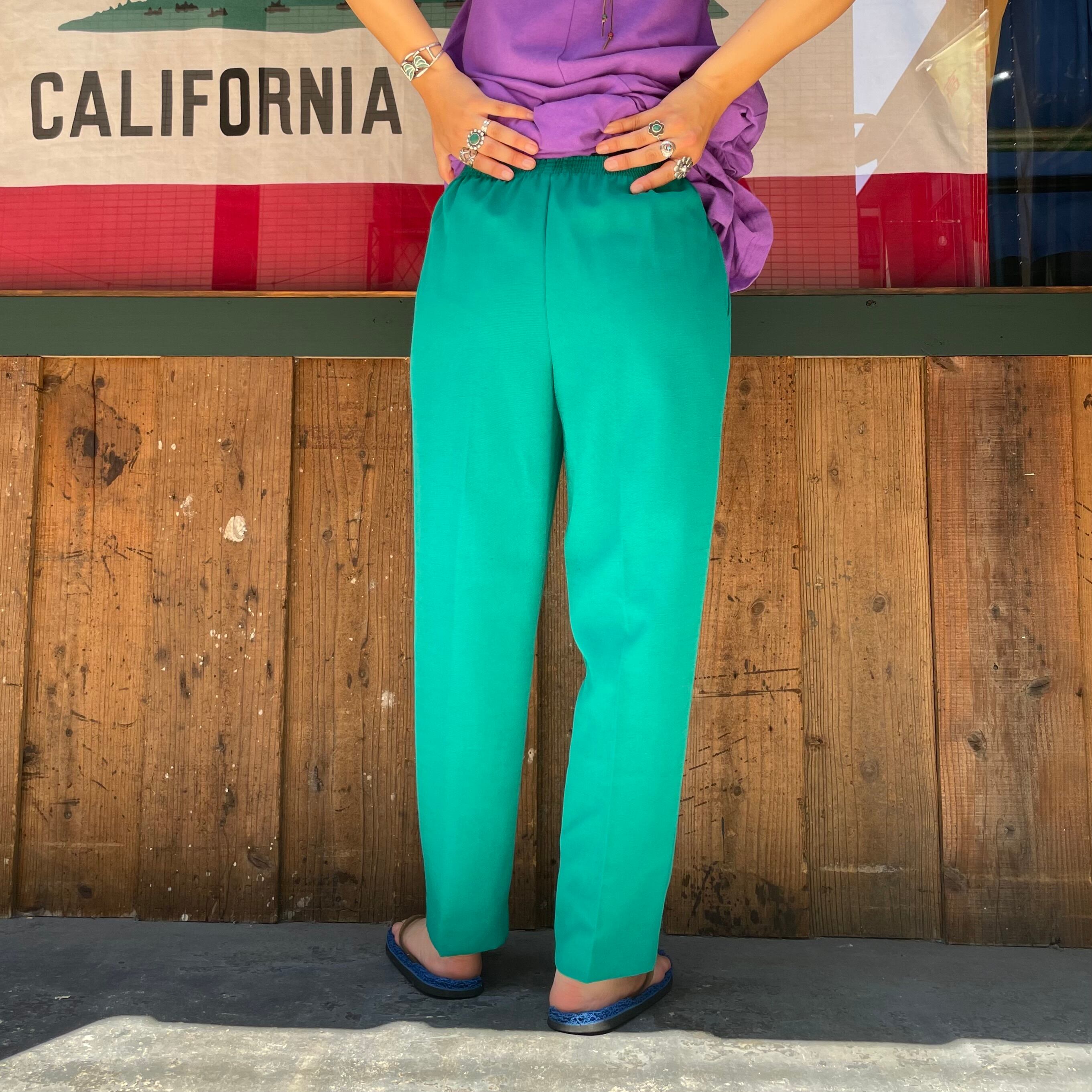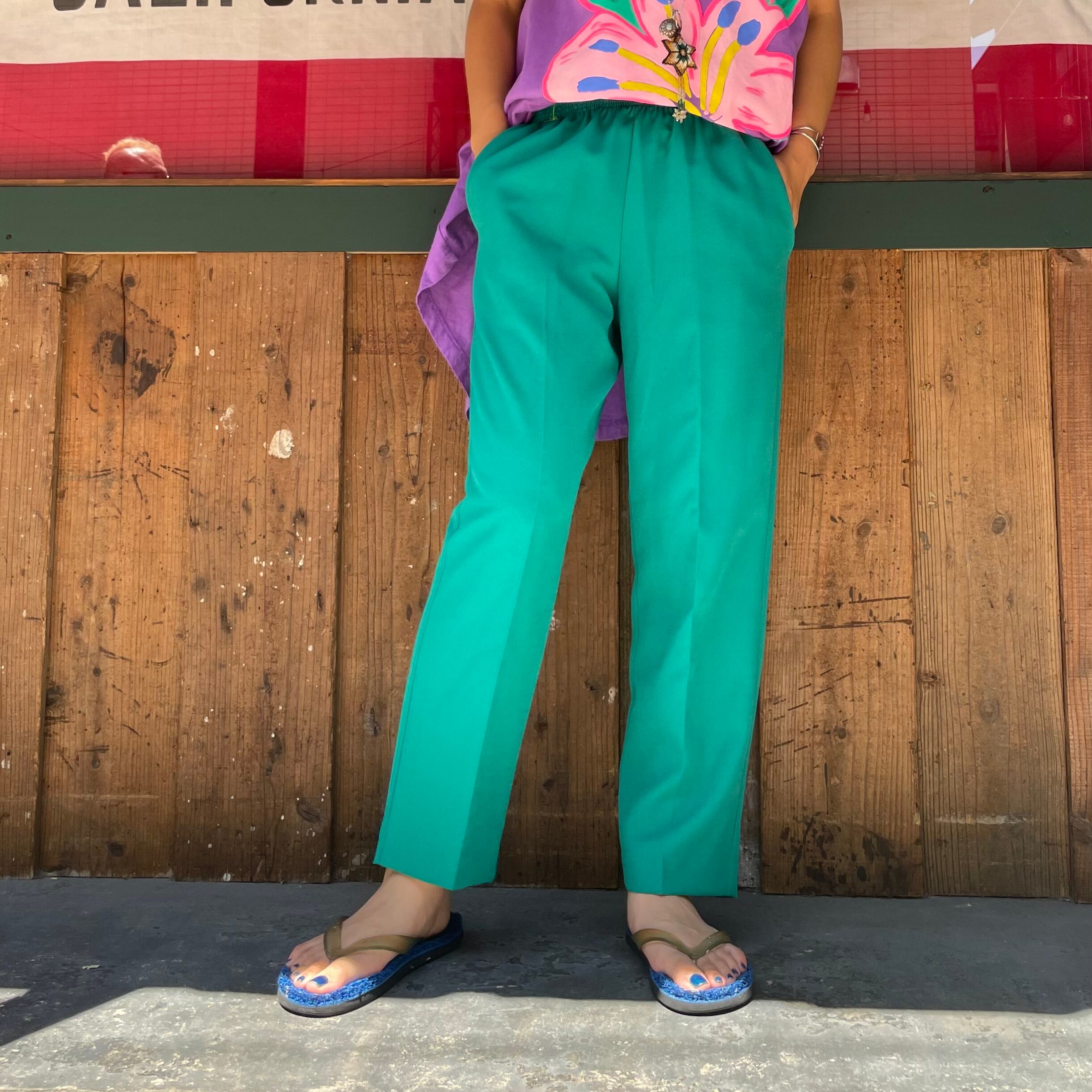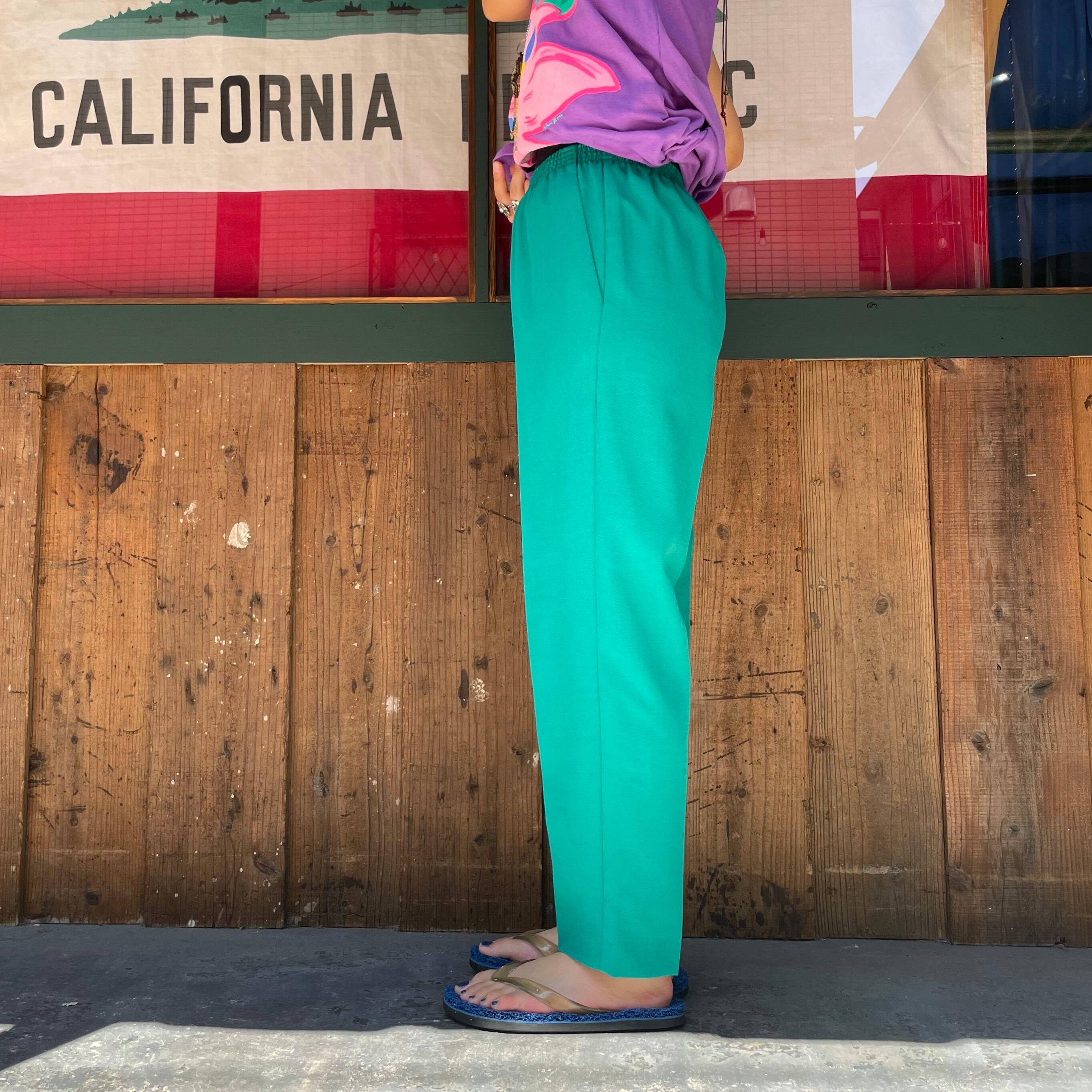鮮やかなグリーンがかわいいイージーパンツです。パサっと薄手でウエストがゴムでとても楽ちんで、テーパードしたシルエットなので自転車にも乗りやすく動きやすい一枚です。