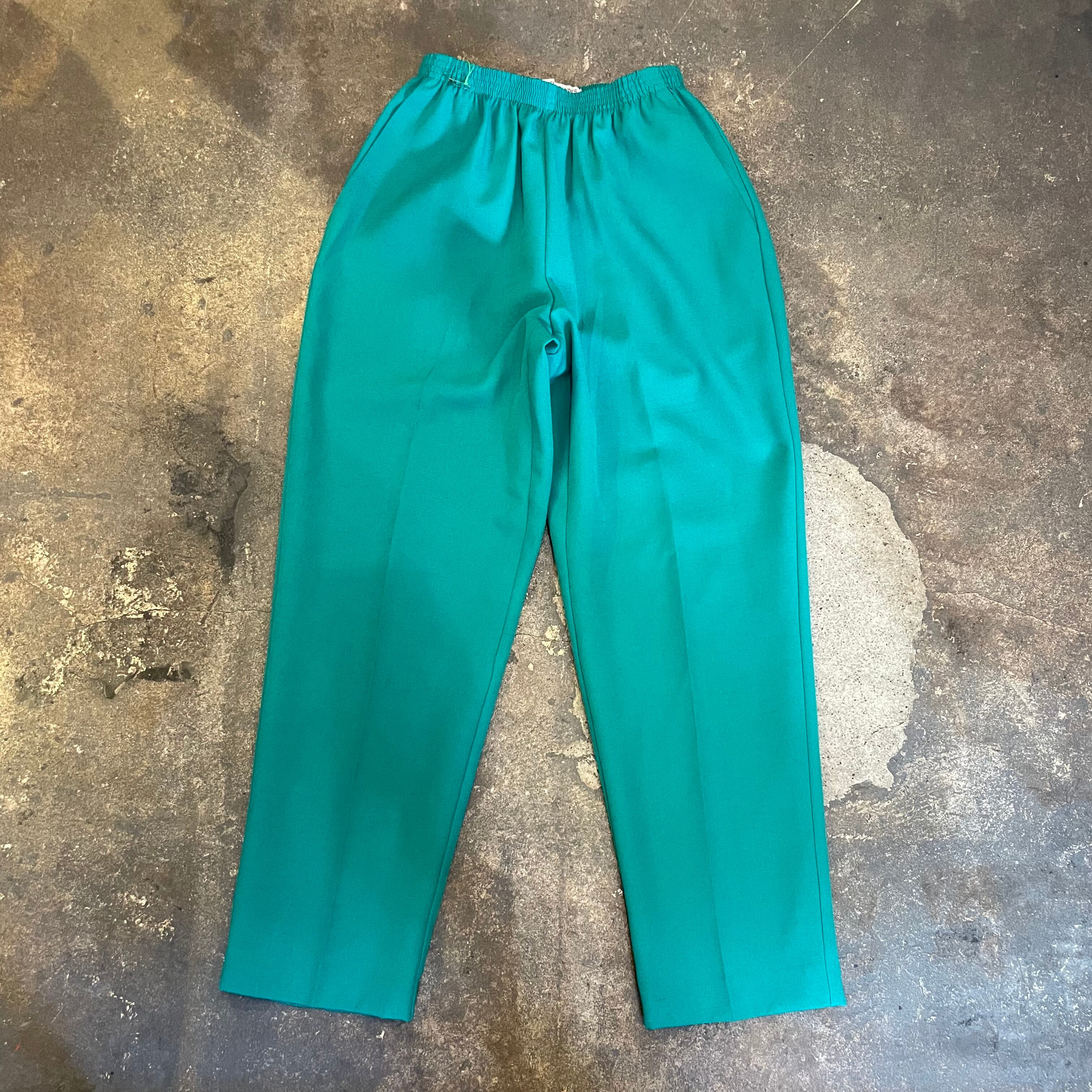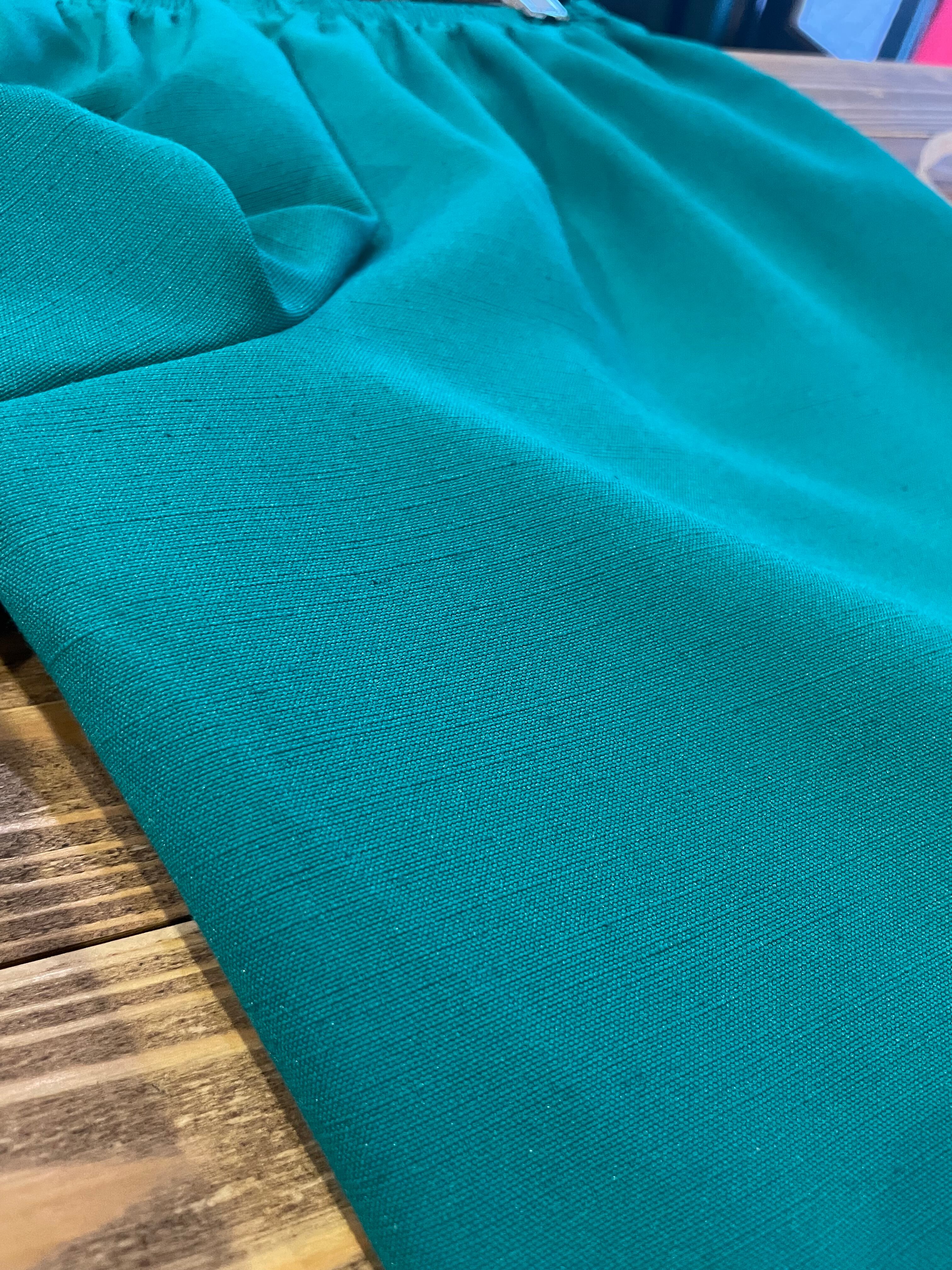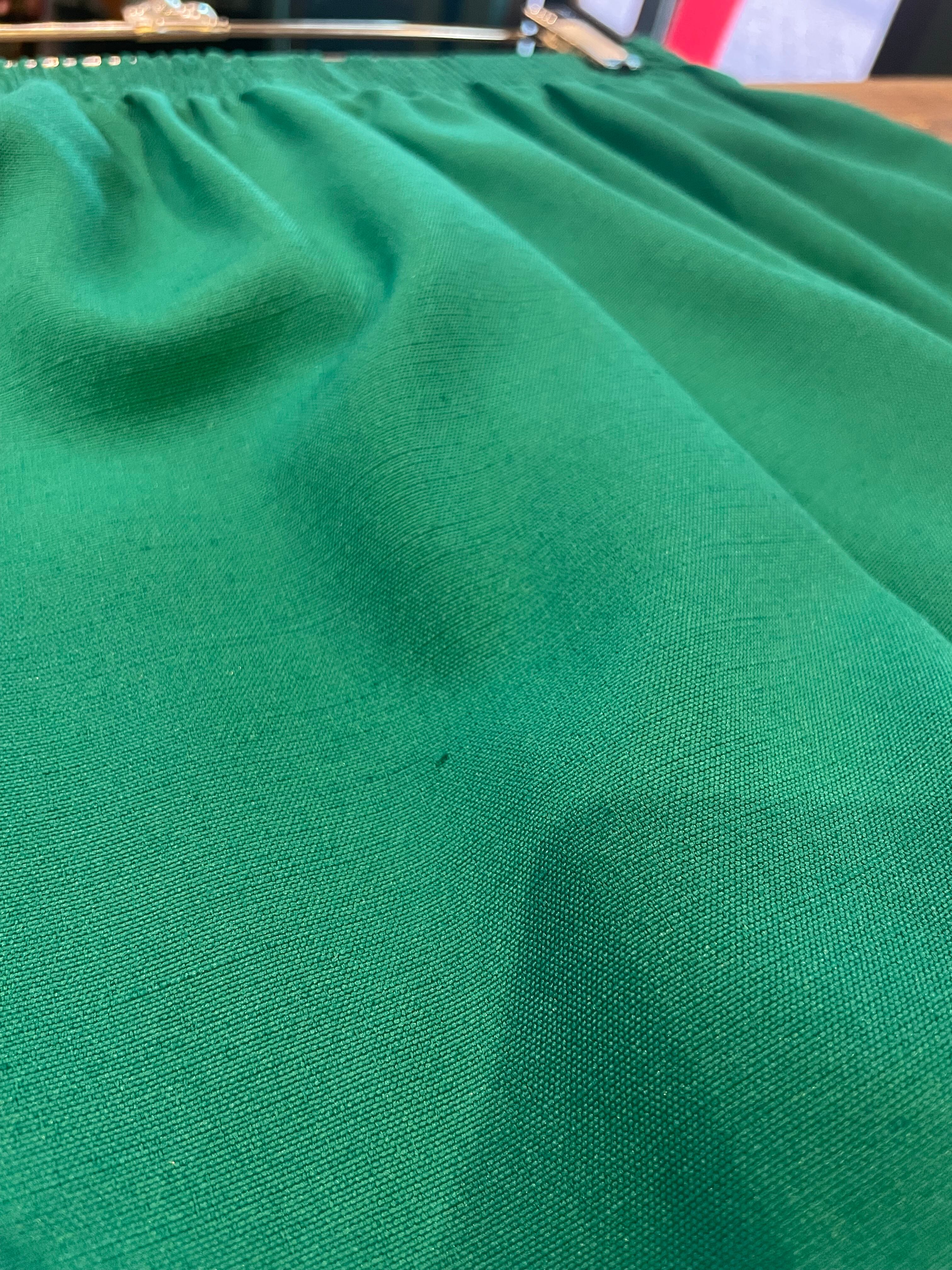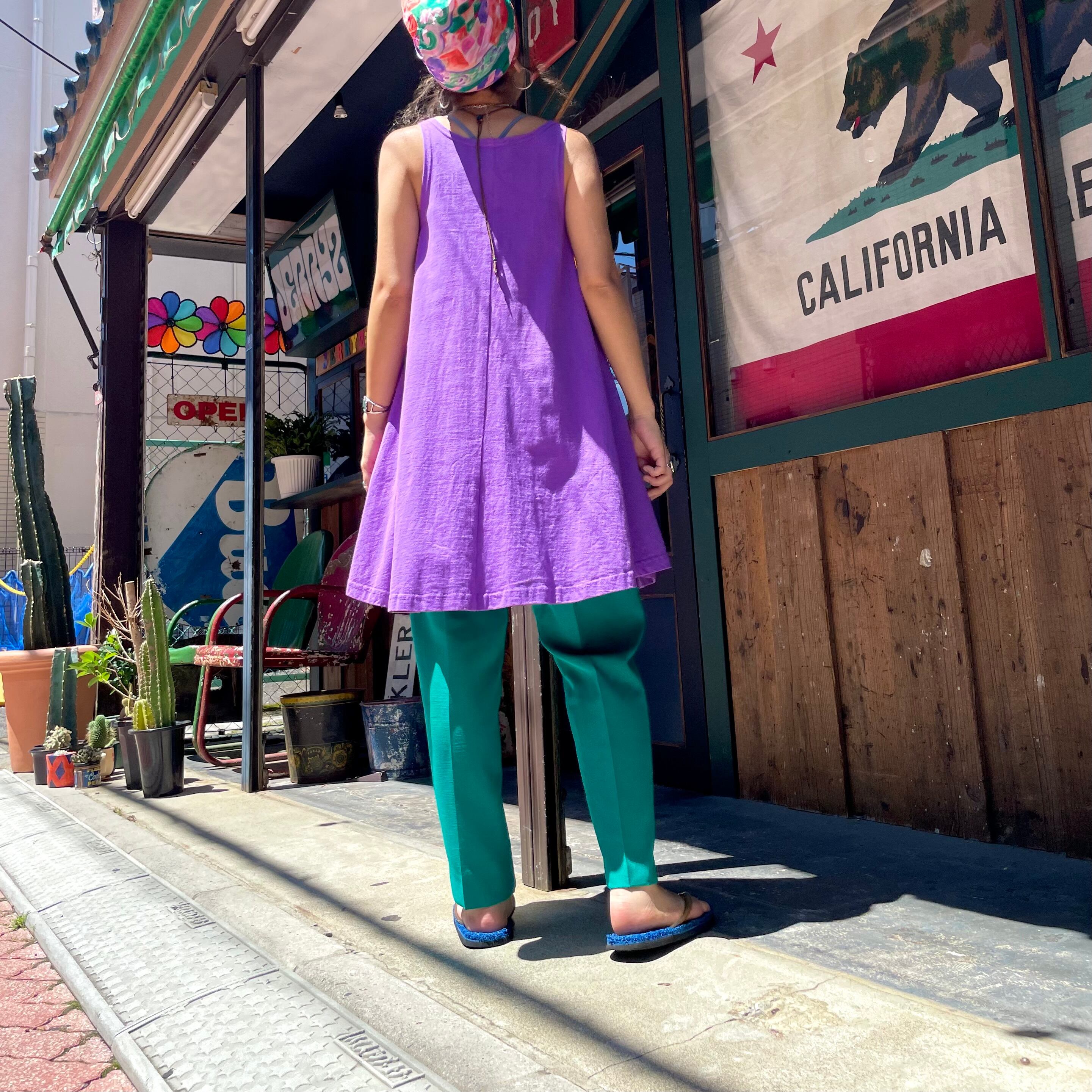 鮮やかなグリーンがかわいいイージーパンツです。パサっと薄手でウエストがゴムでとても楽ちんで、テーパードしたシルエットなので自転車にも乗りやすく動きやすい一枚です。