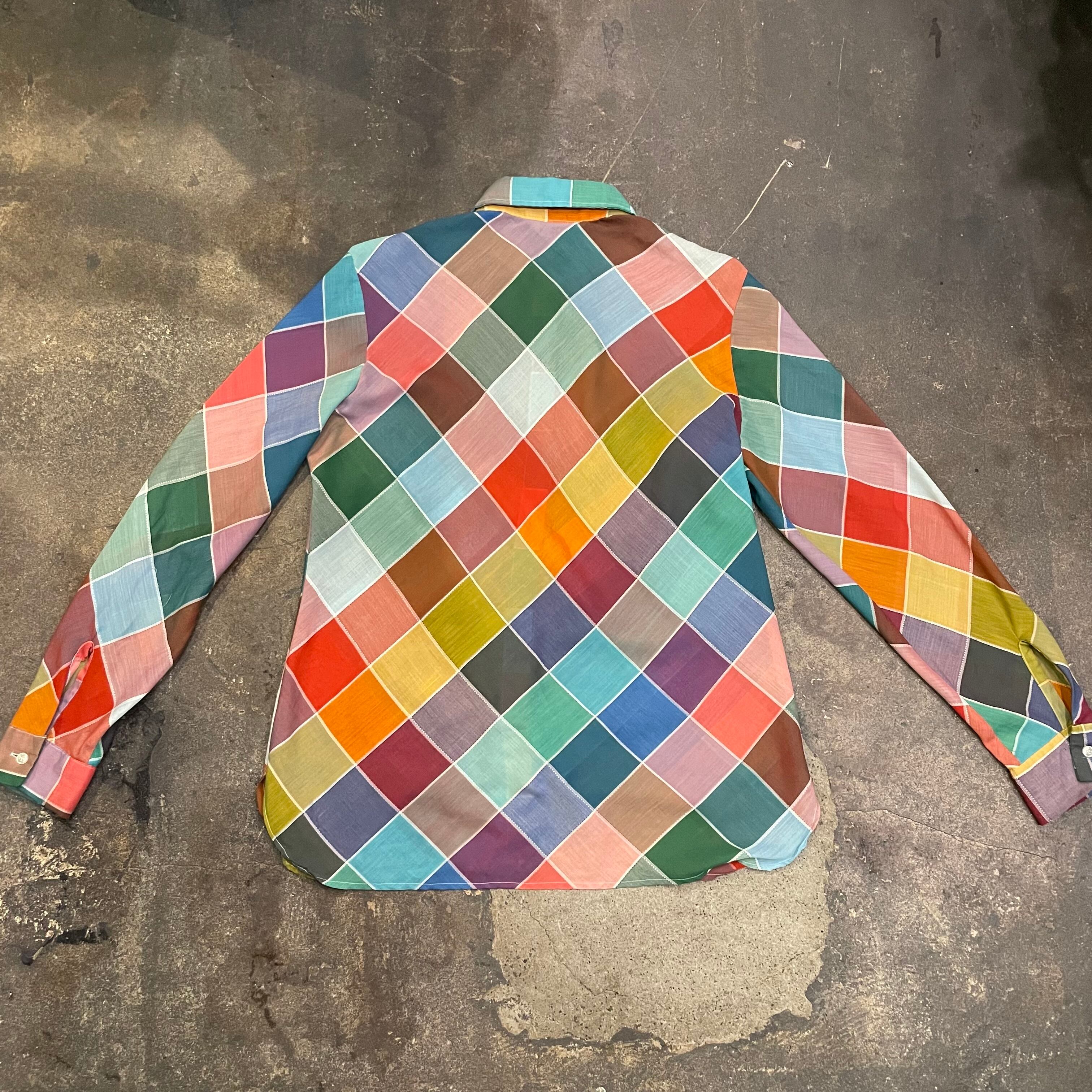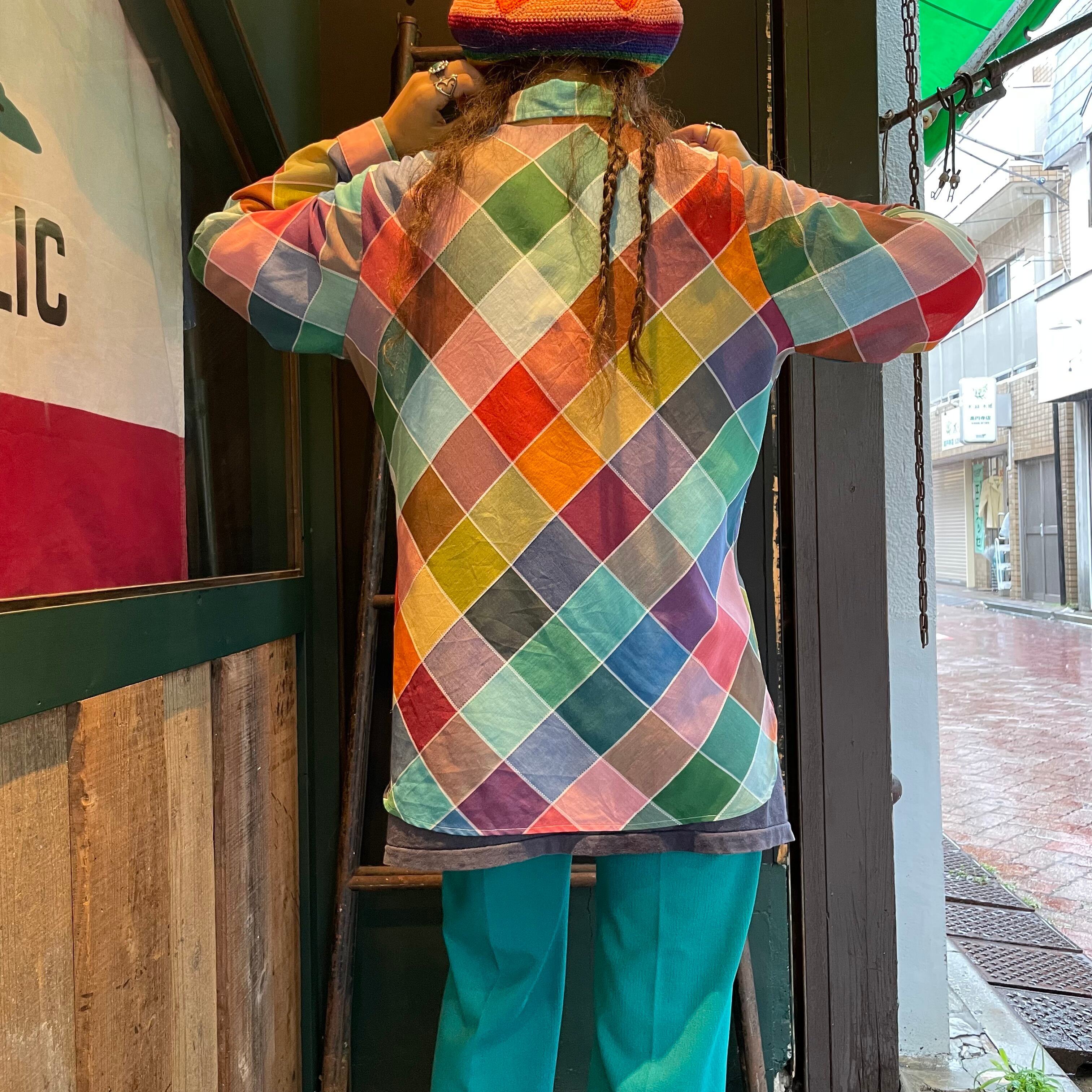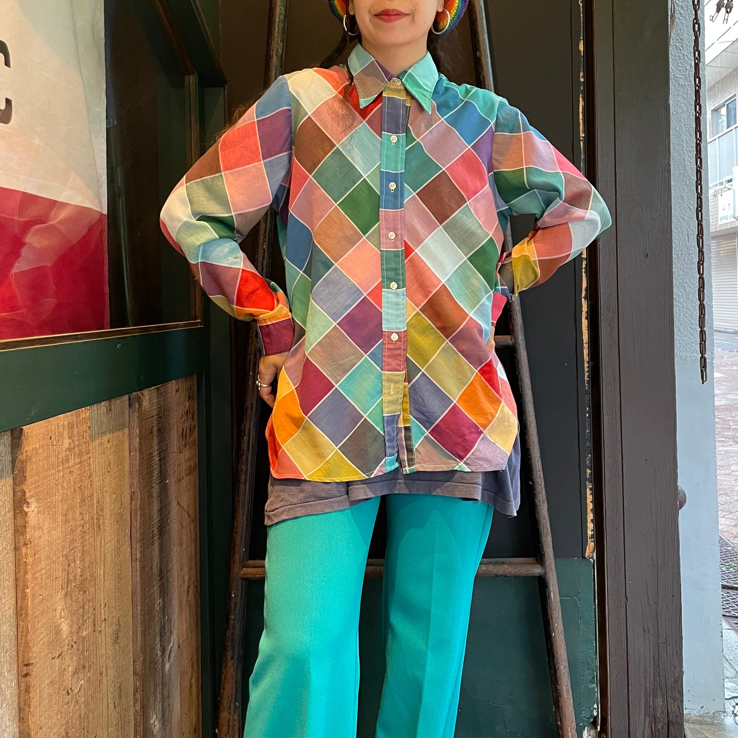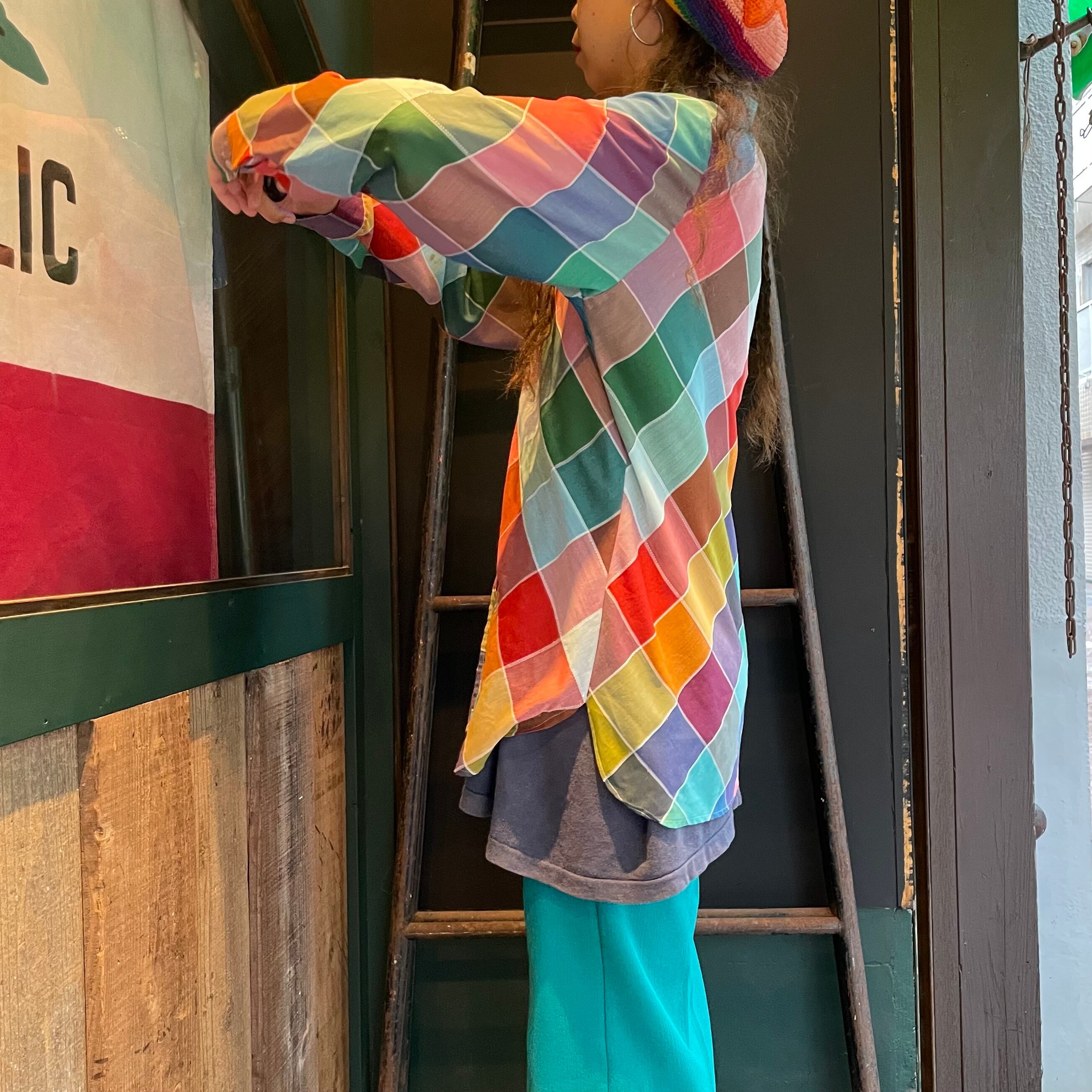 カラフルなチェック?というかパッチワーク柄のようなデザインがかわいいシースルーの長袖シャツです。