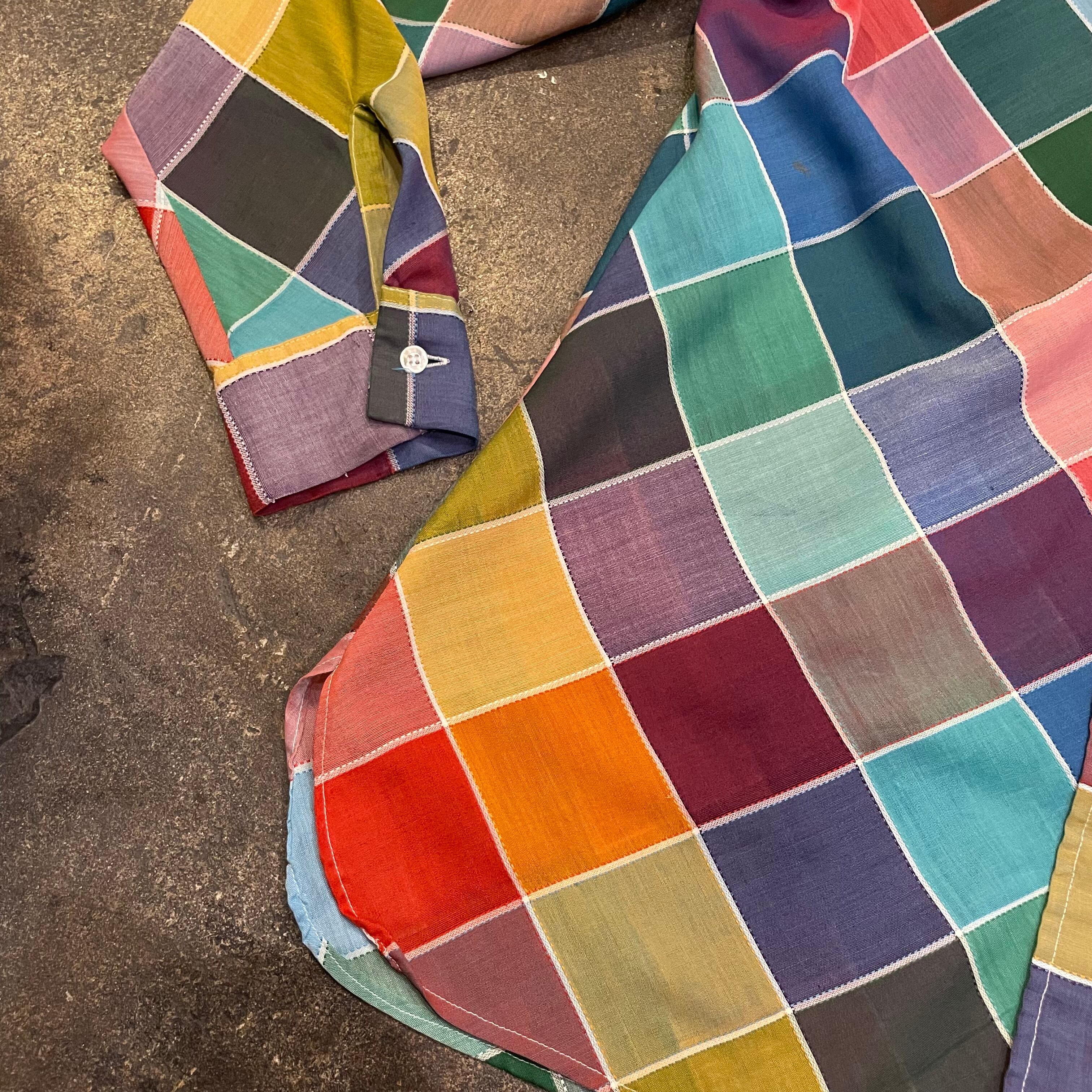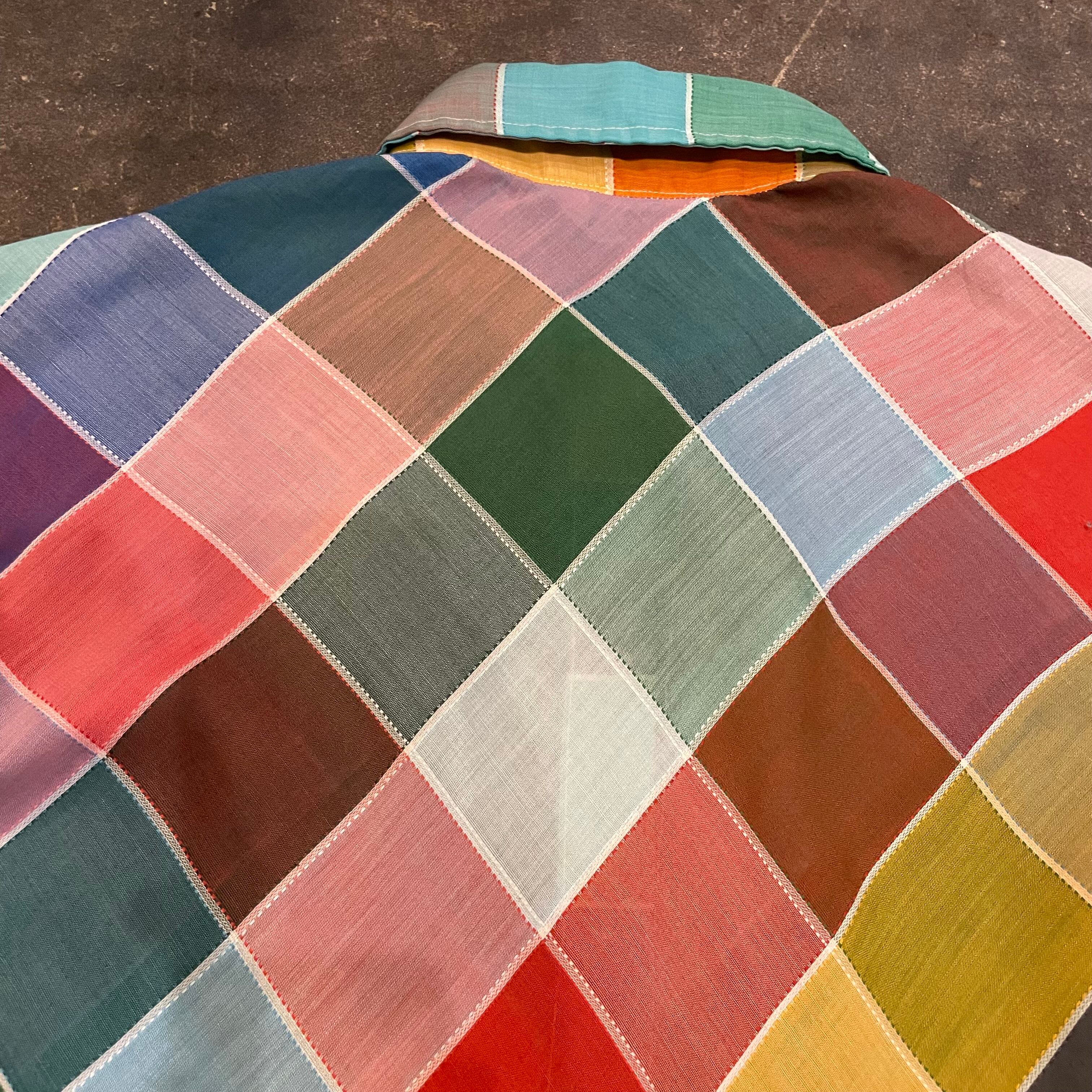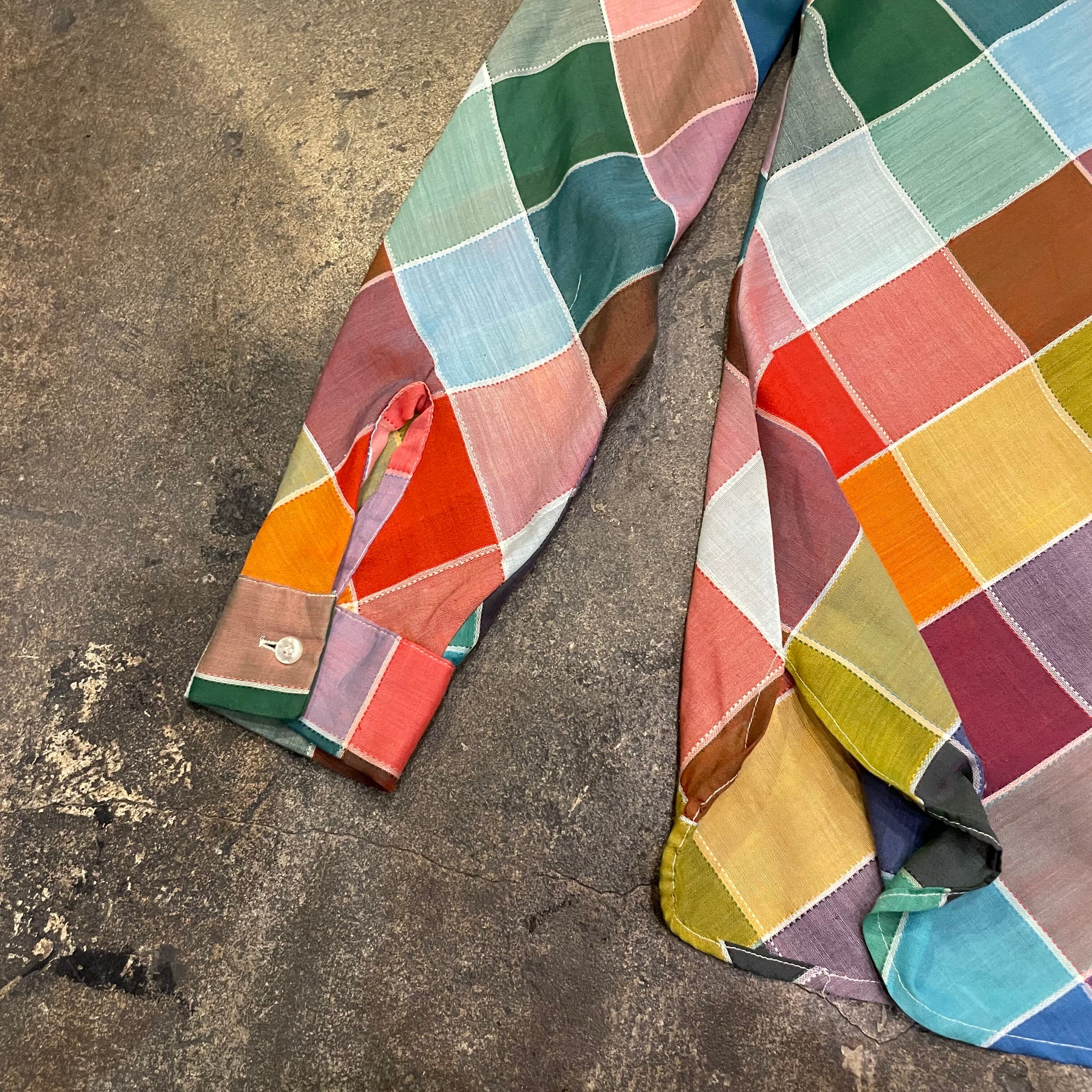 カラフルなチェック?というかパッチワーク柄のようなデザインがかわいいシースルーの長袖シャツです。
