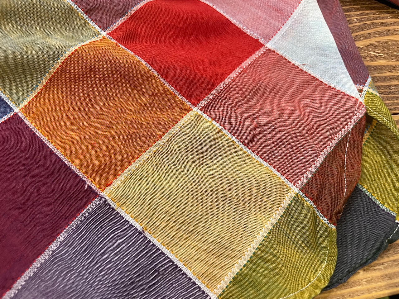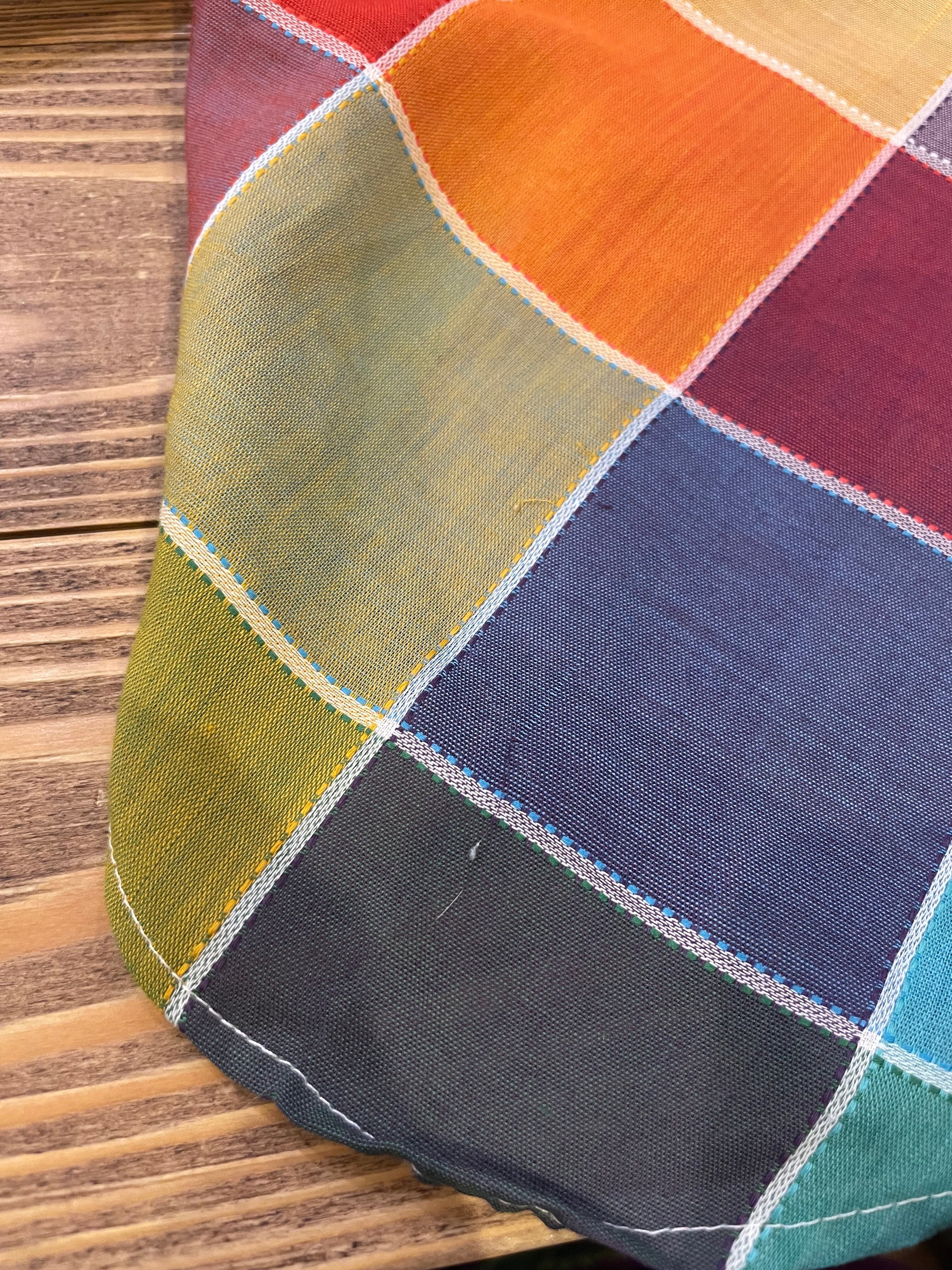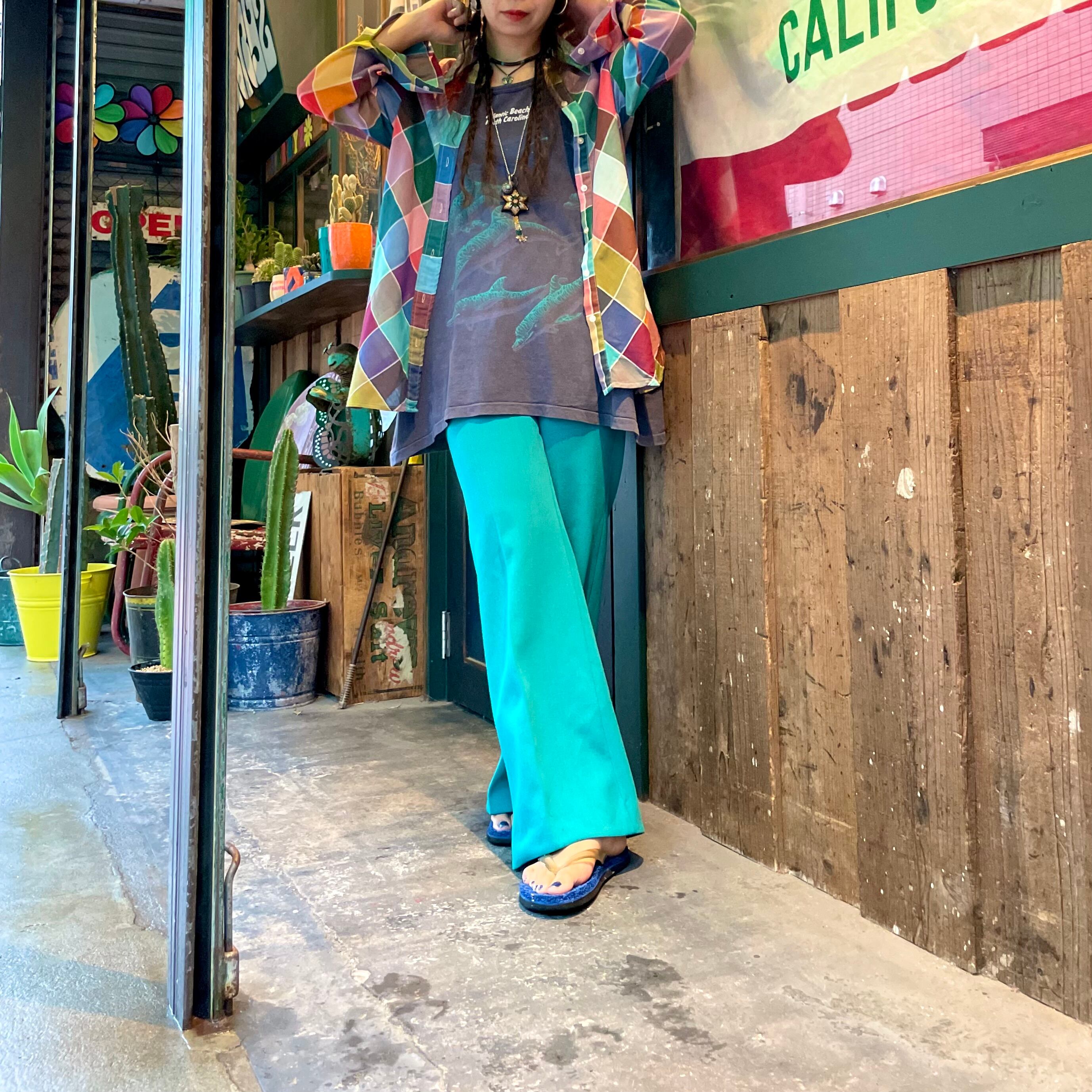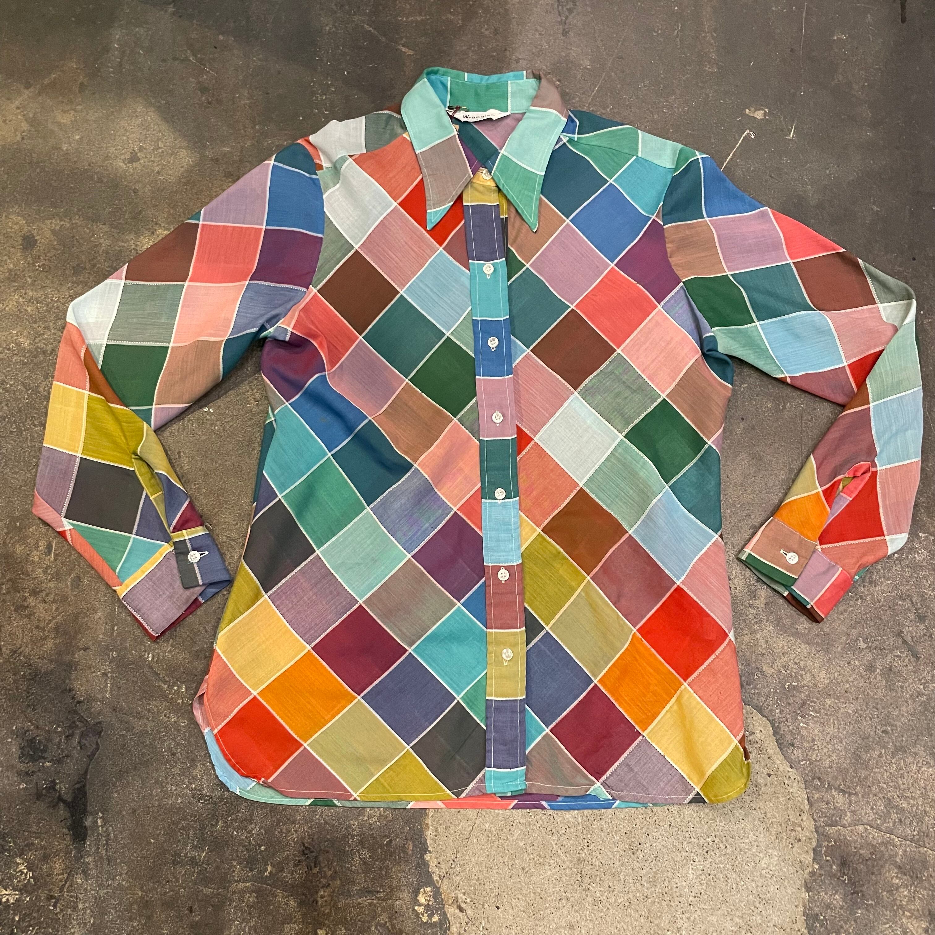 カラフルなチェック?というかパッチワーク柄のようなデザインがかわいいシースルーの長袖シャツです。