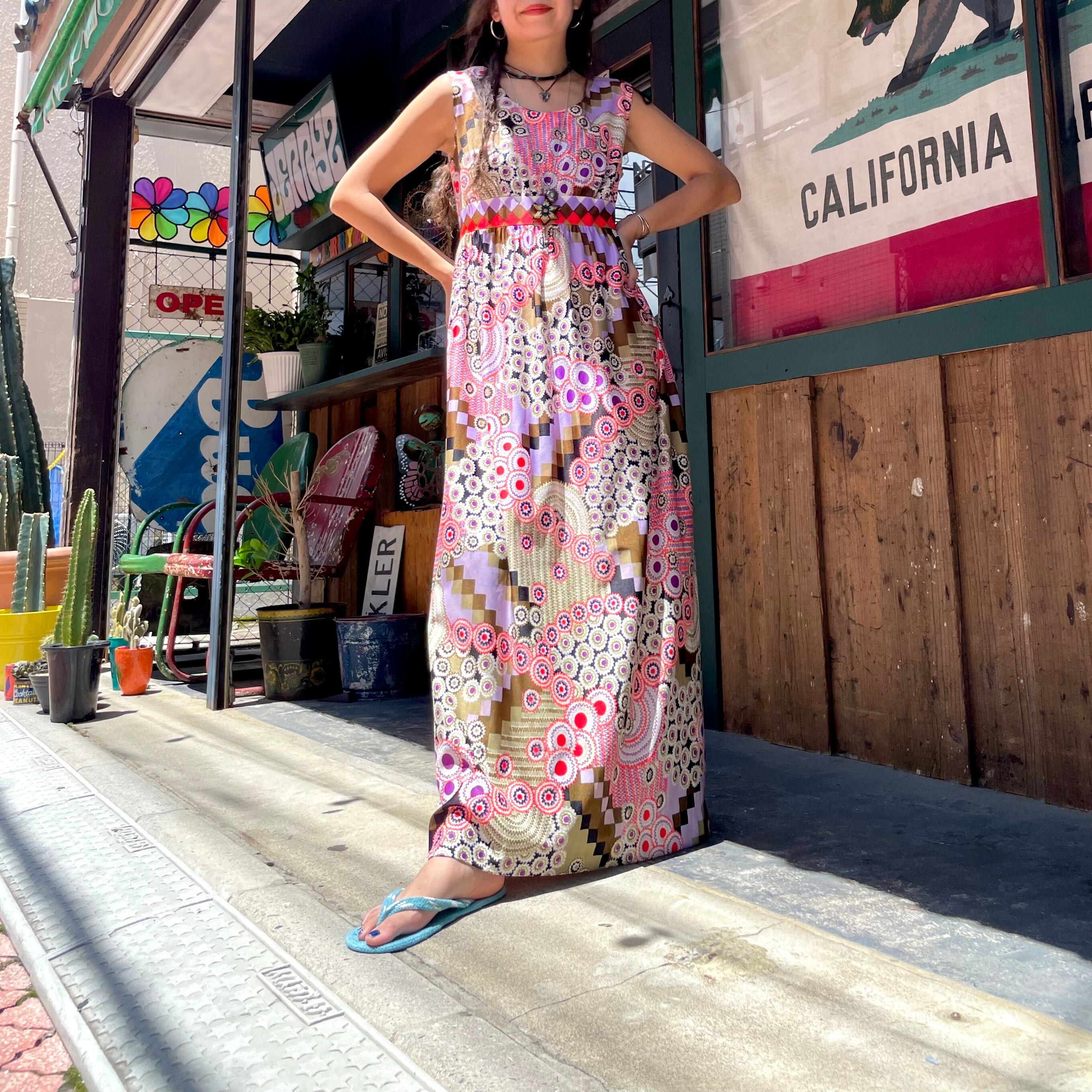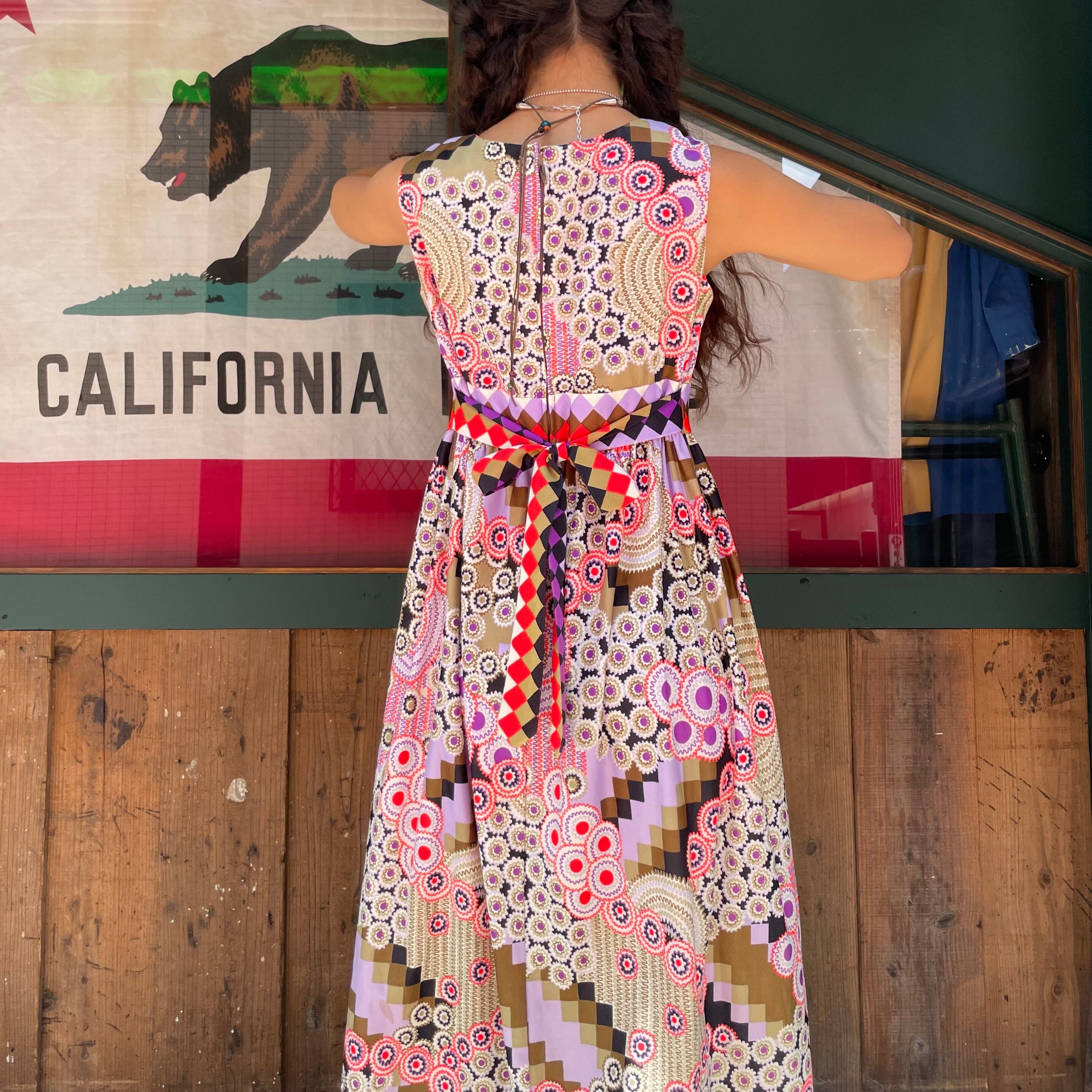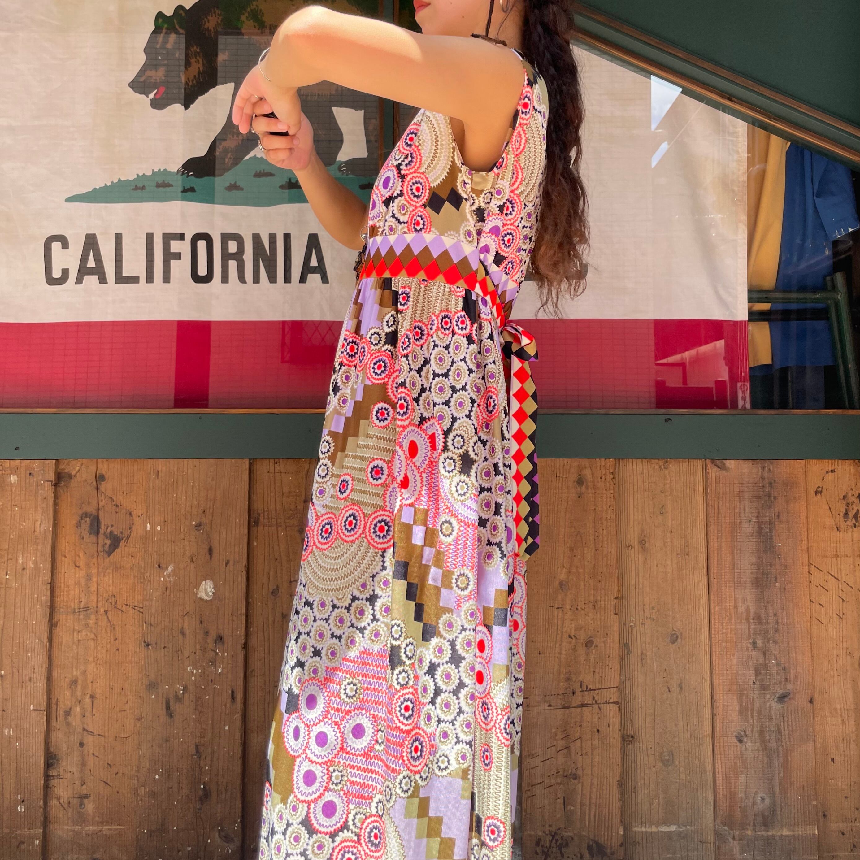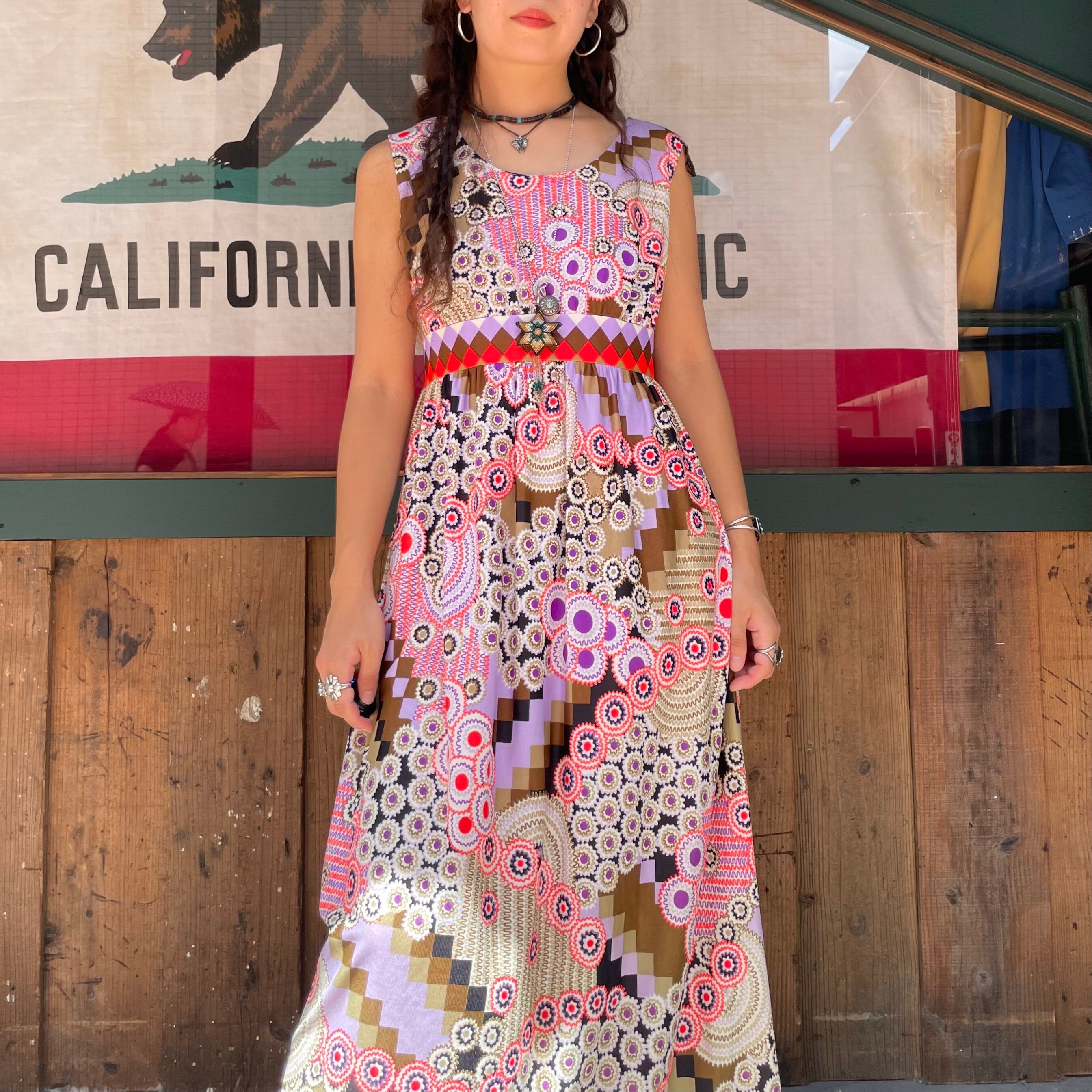 幾何学模様とお花柄の入り混じった感じがかわいい70年代頃のワンピースです。