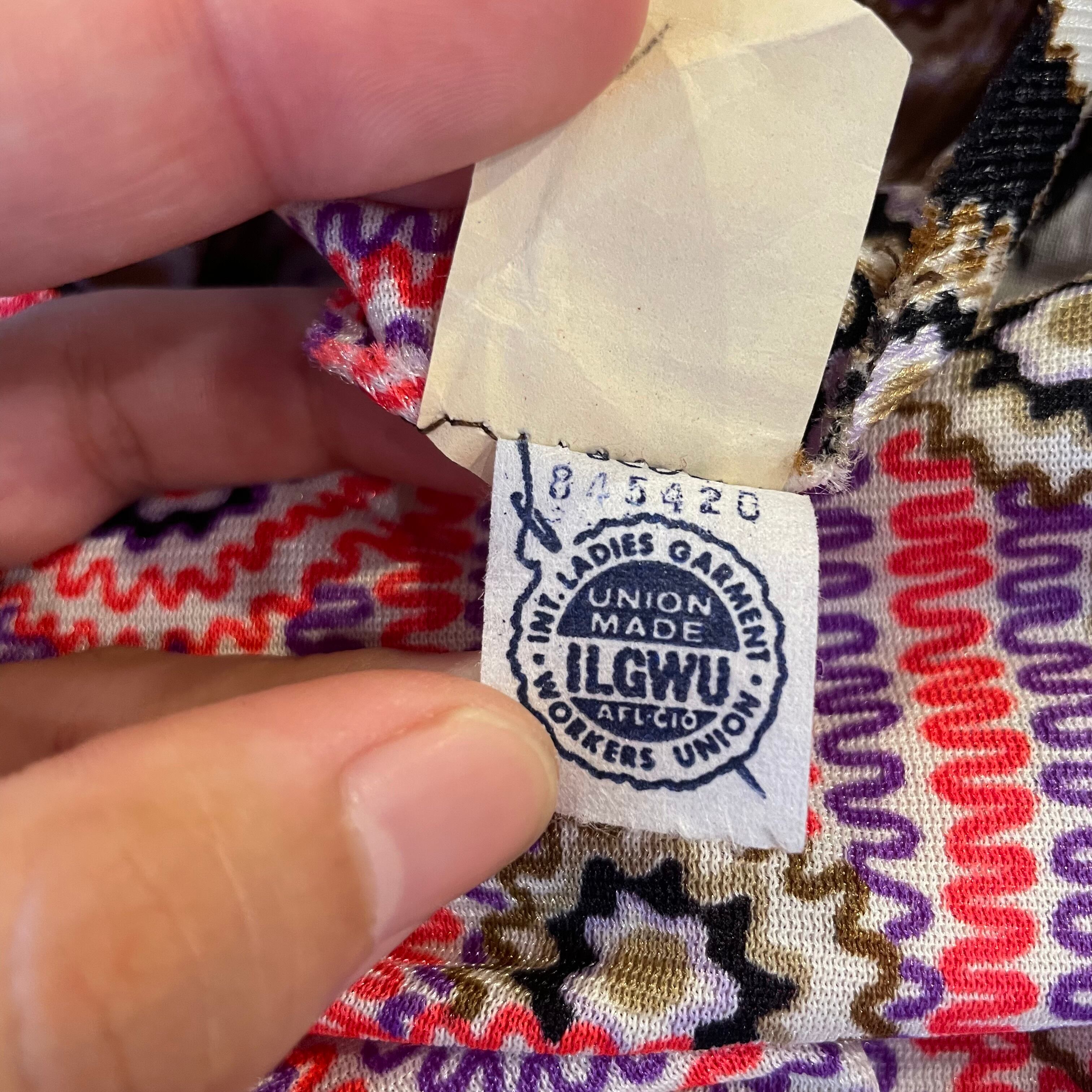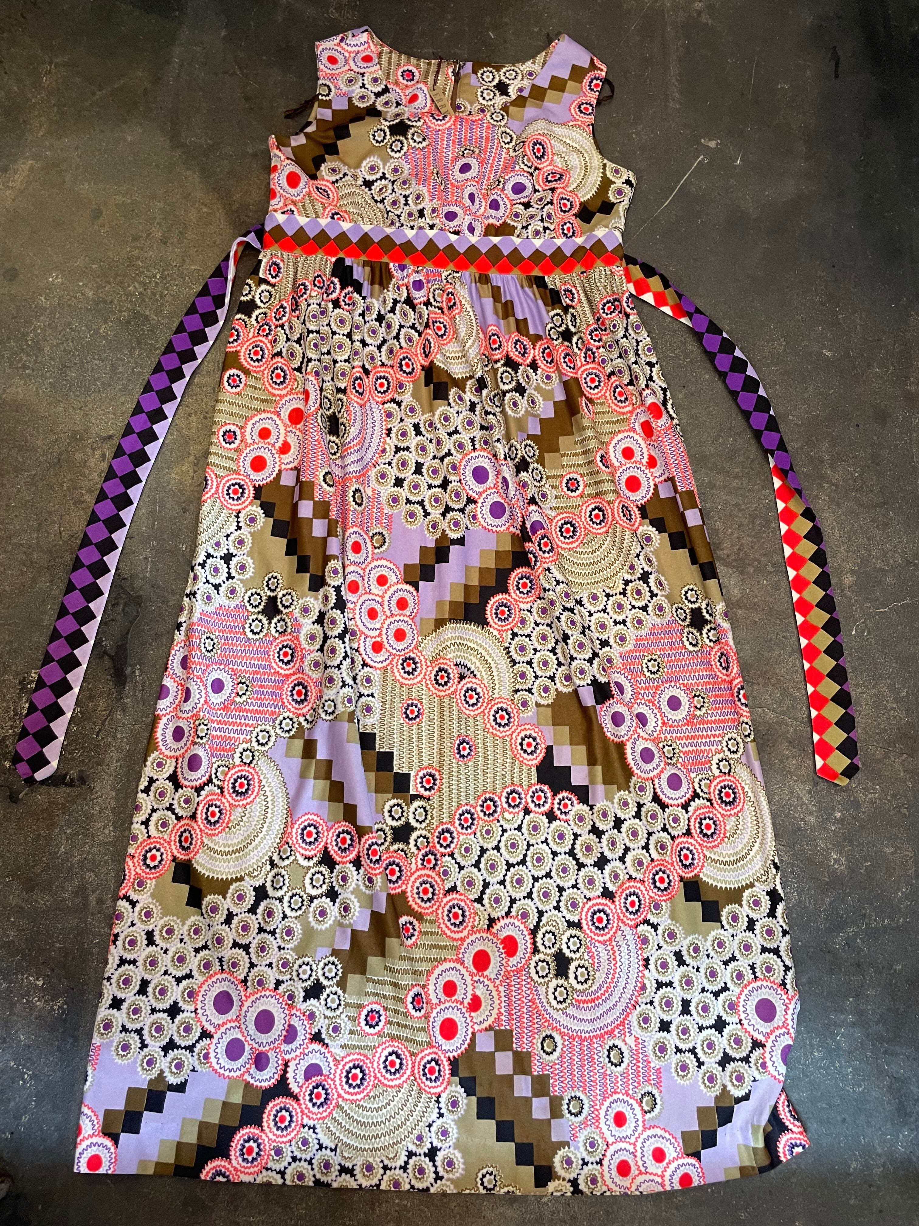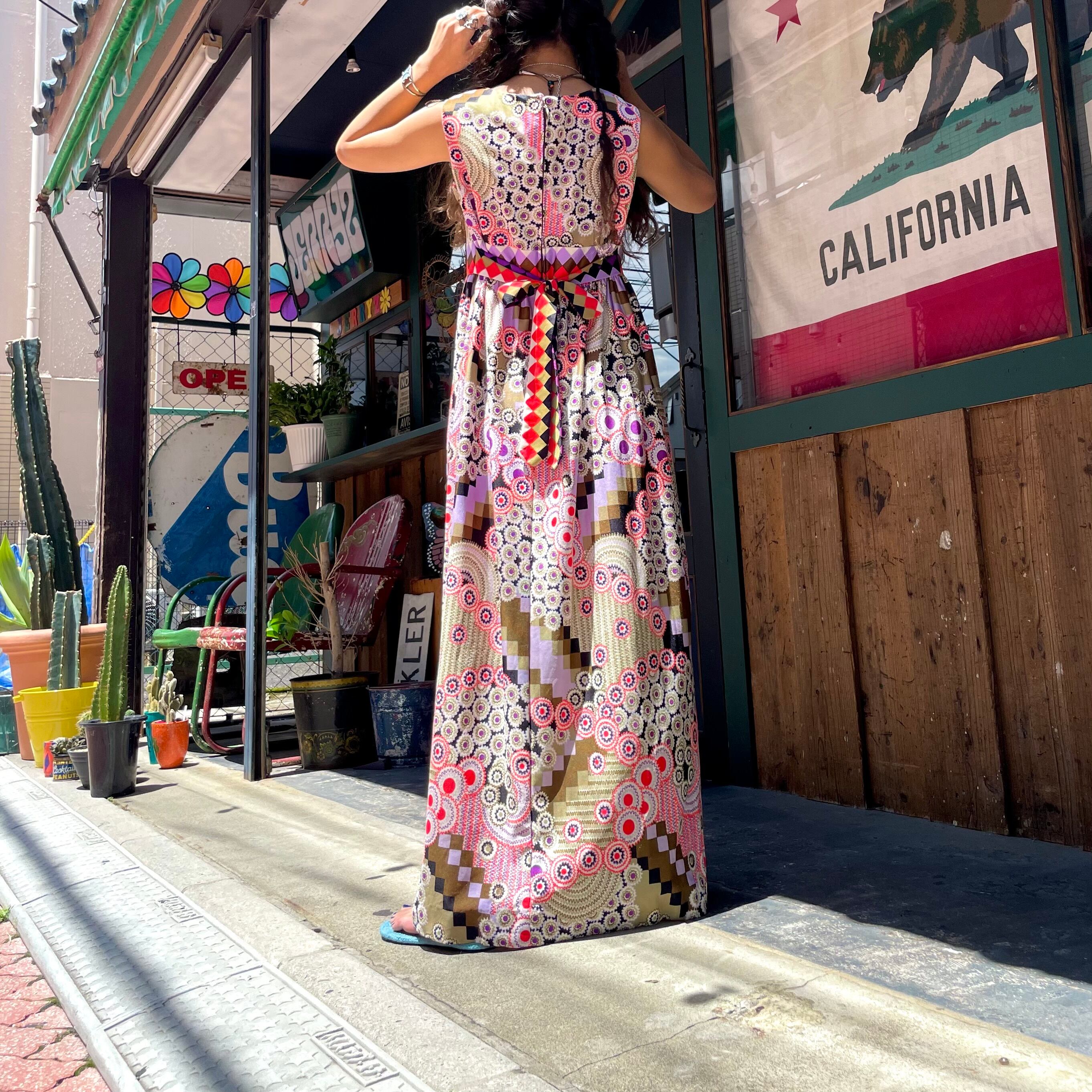 幾何学模様とお花柄の入り混じった感じがかわいい70年代頃のワンピースです。