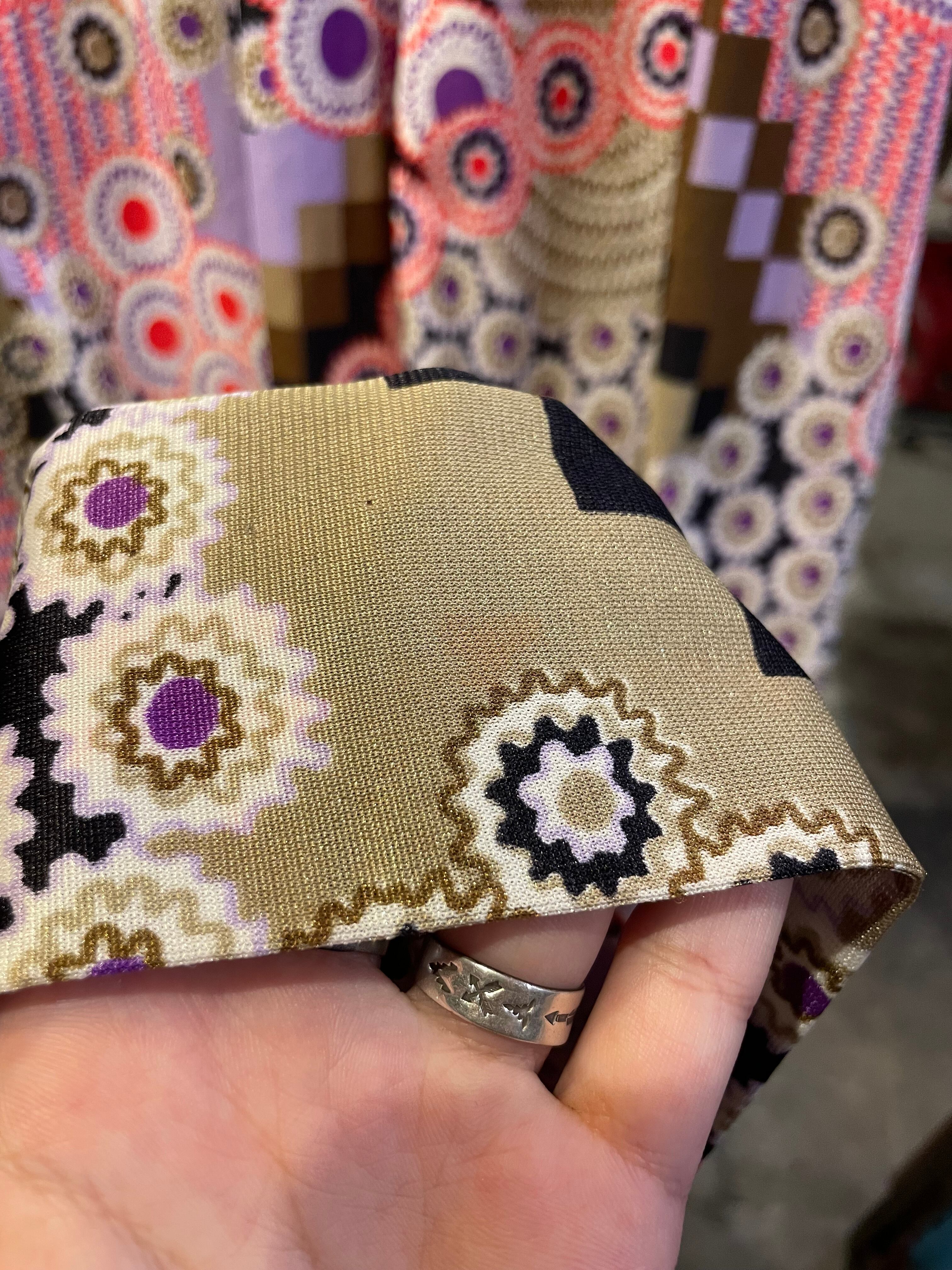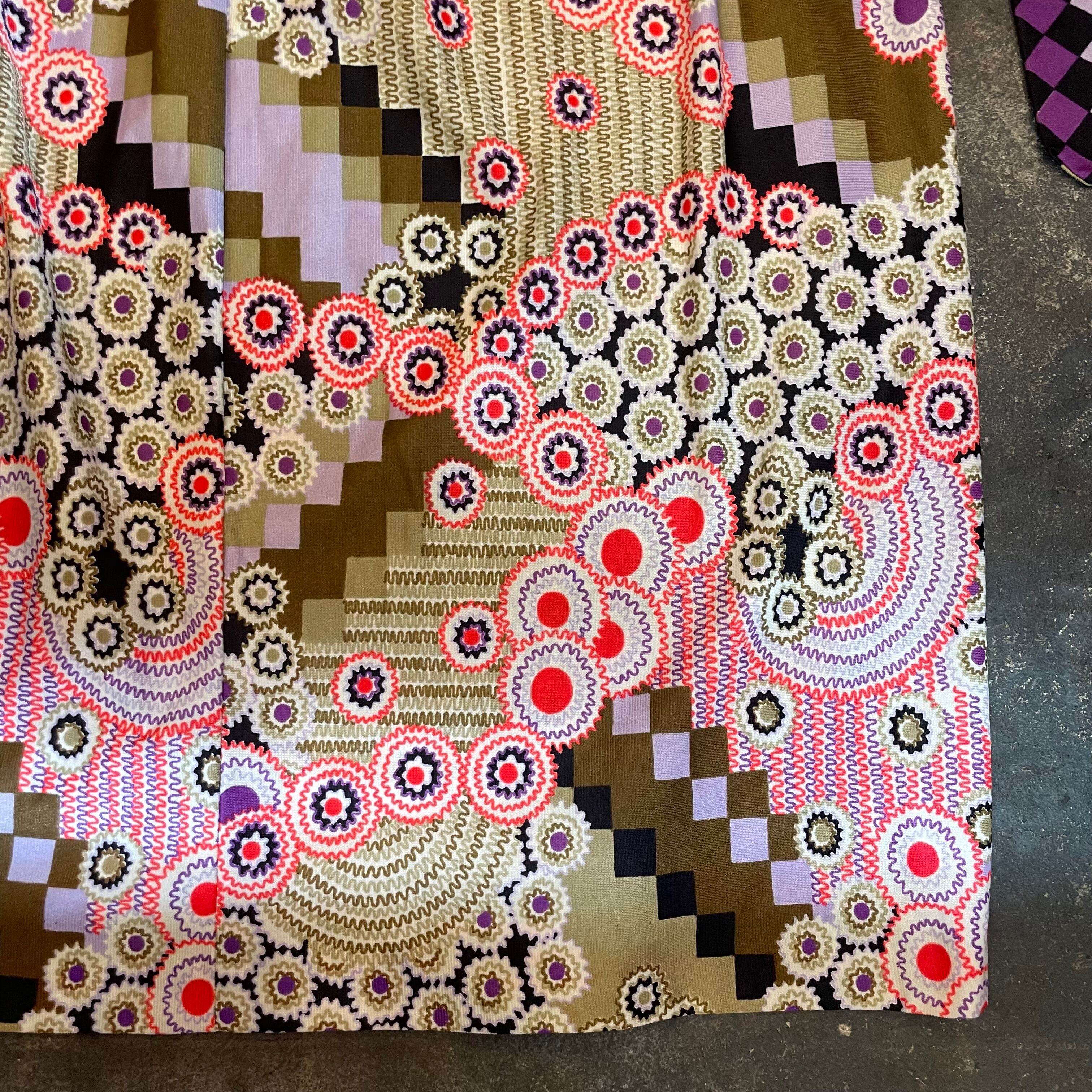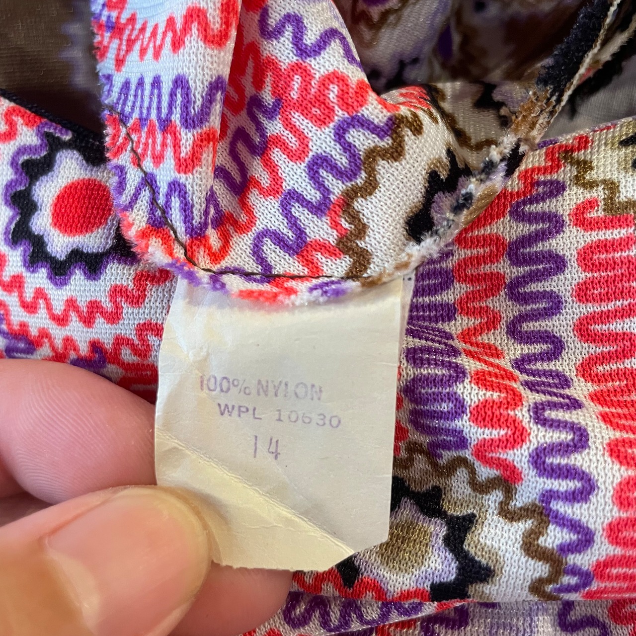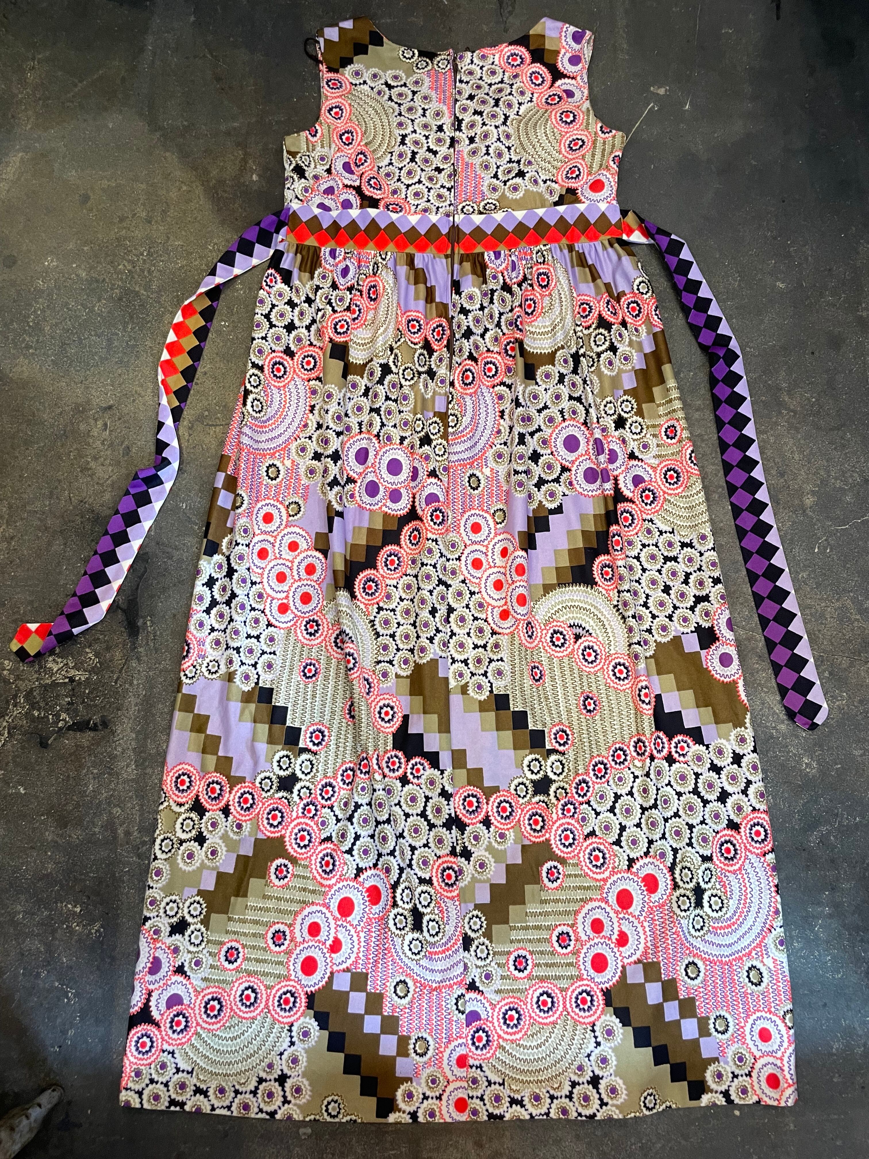 幾何学模様とお花柄の入り混じった感じがかわいい70年代頃のワンピースです。