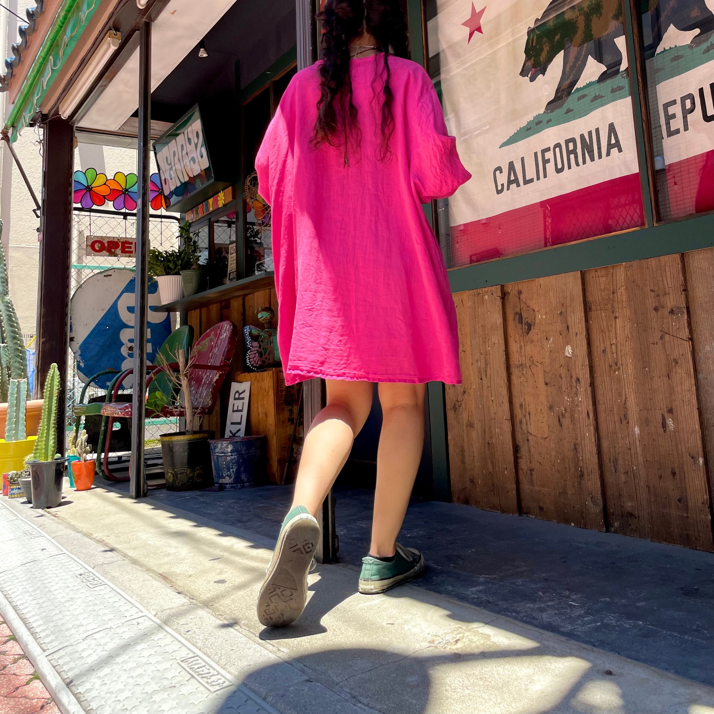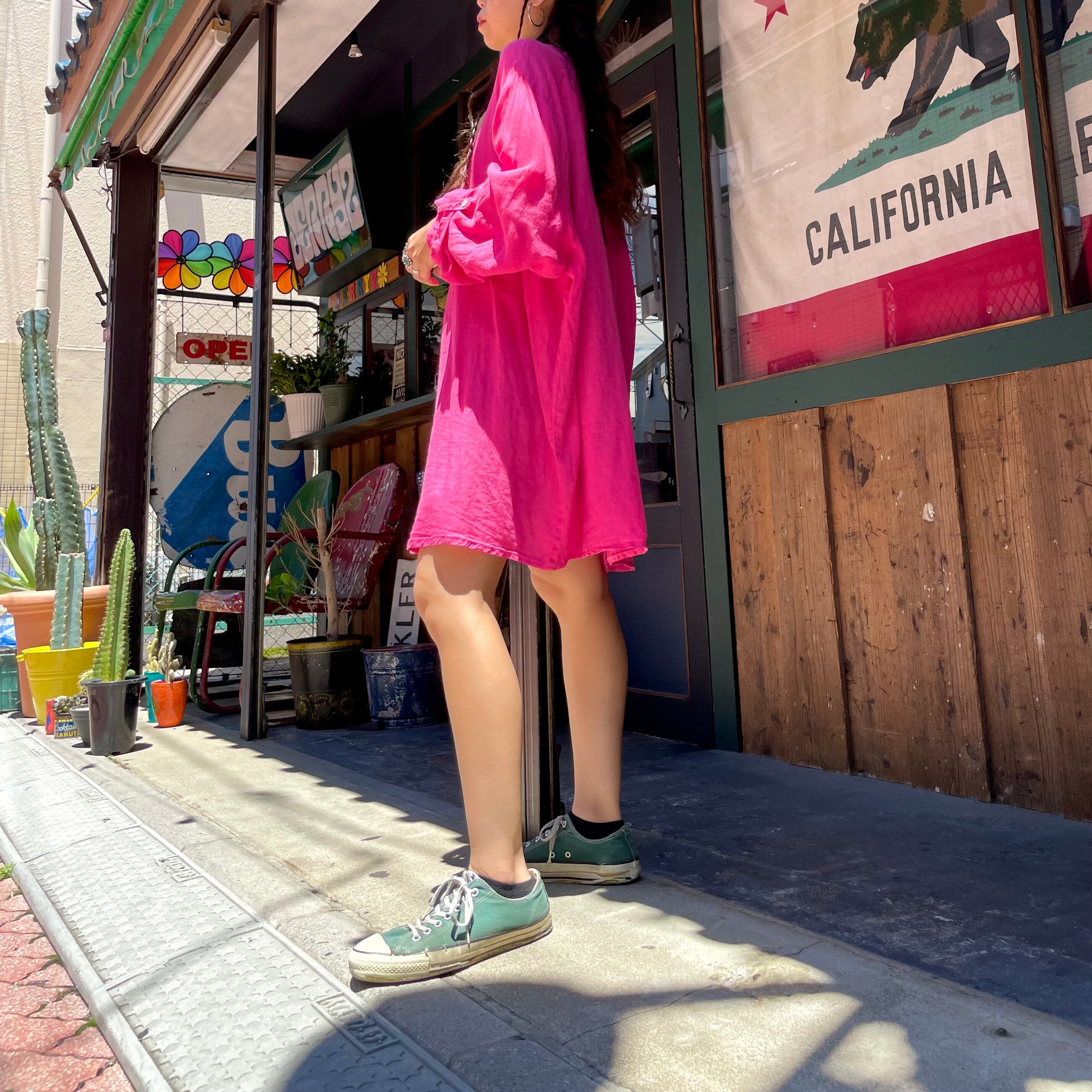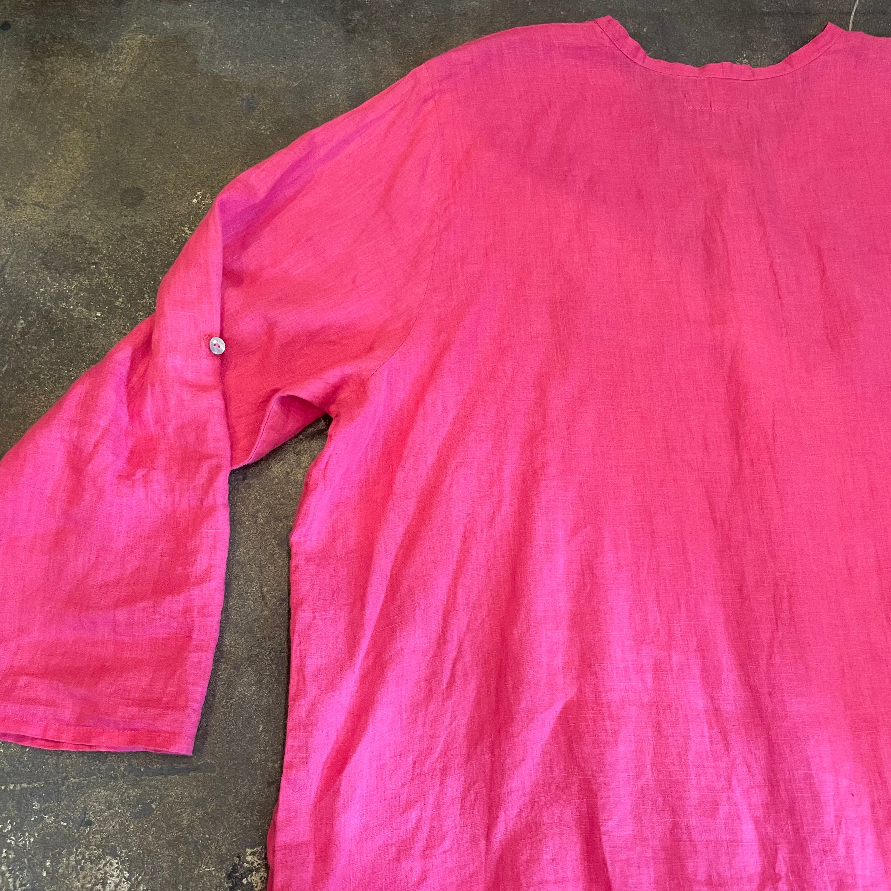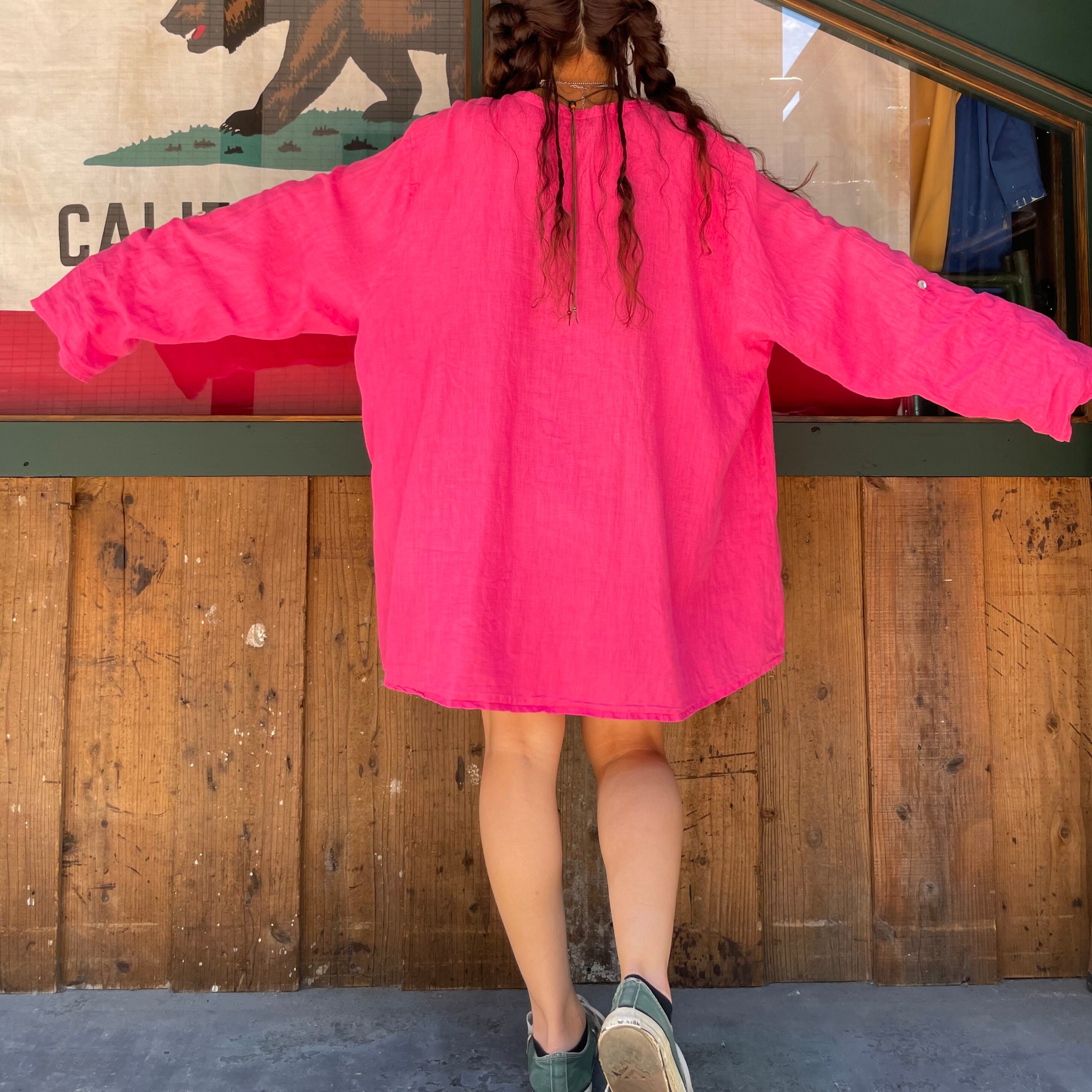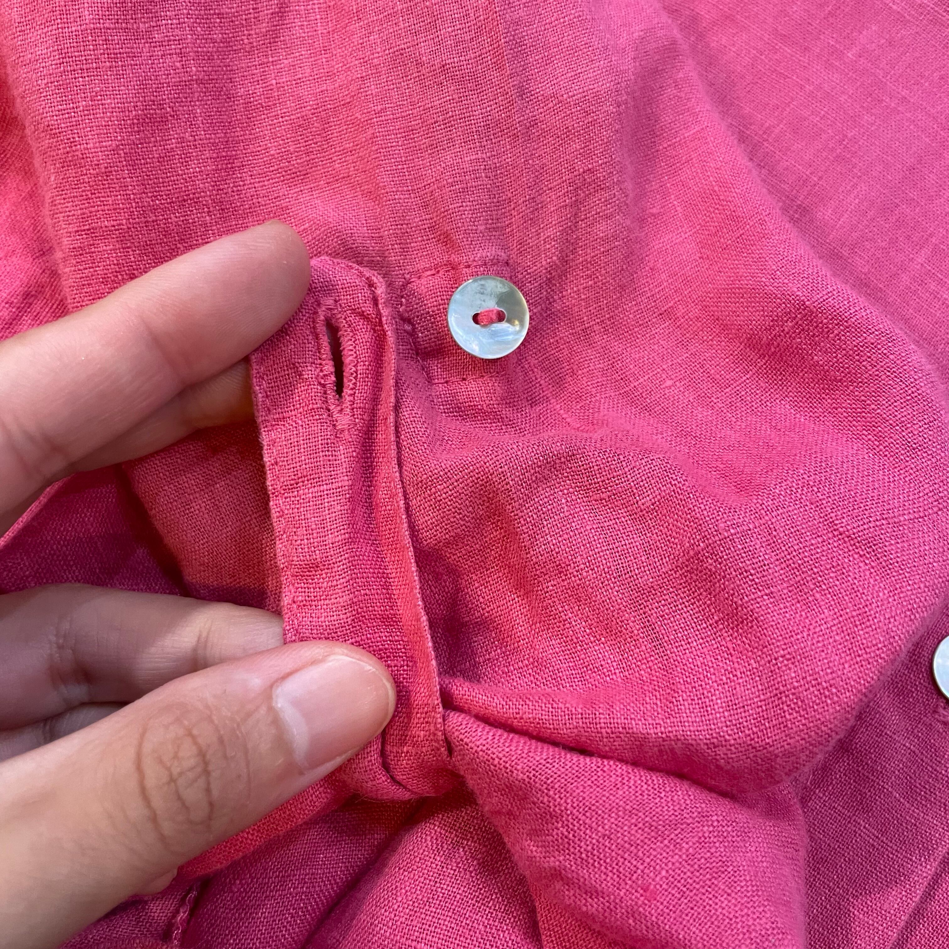 濃いめのピンクでやんちゃな印象なのに、素材はリネンで上品ですしかなりゆったりオーバーサイズなところもリラクシングな雰囲気で素敵ですね。