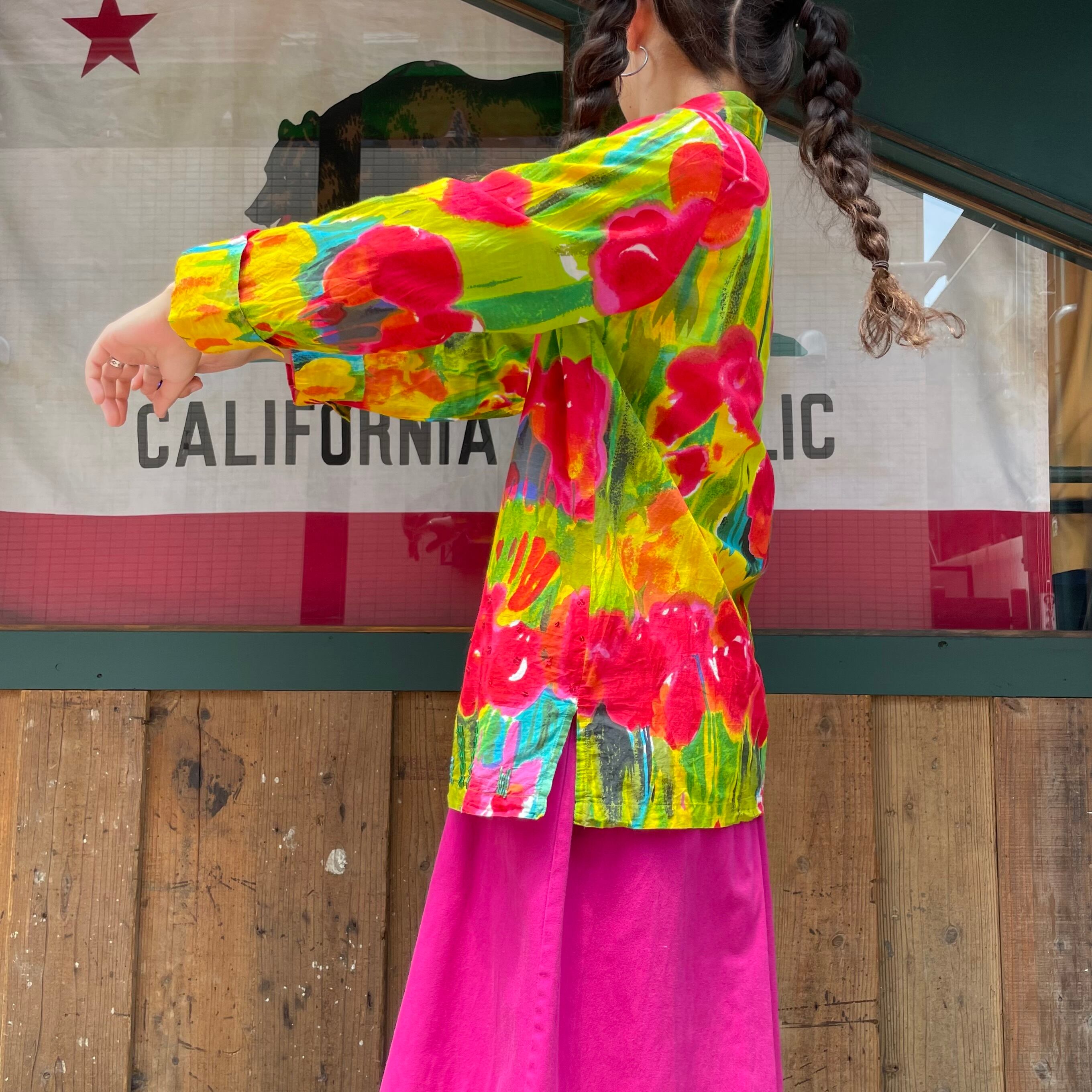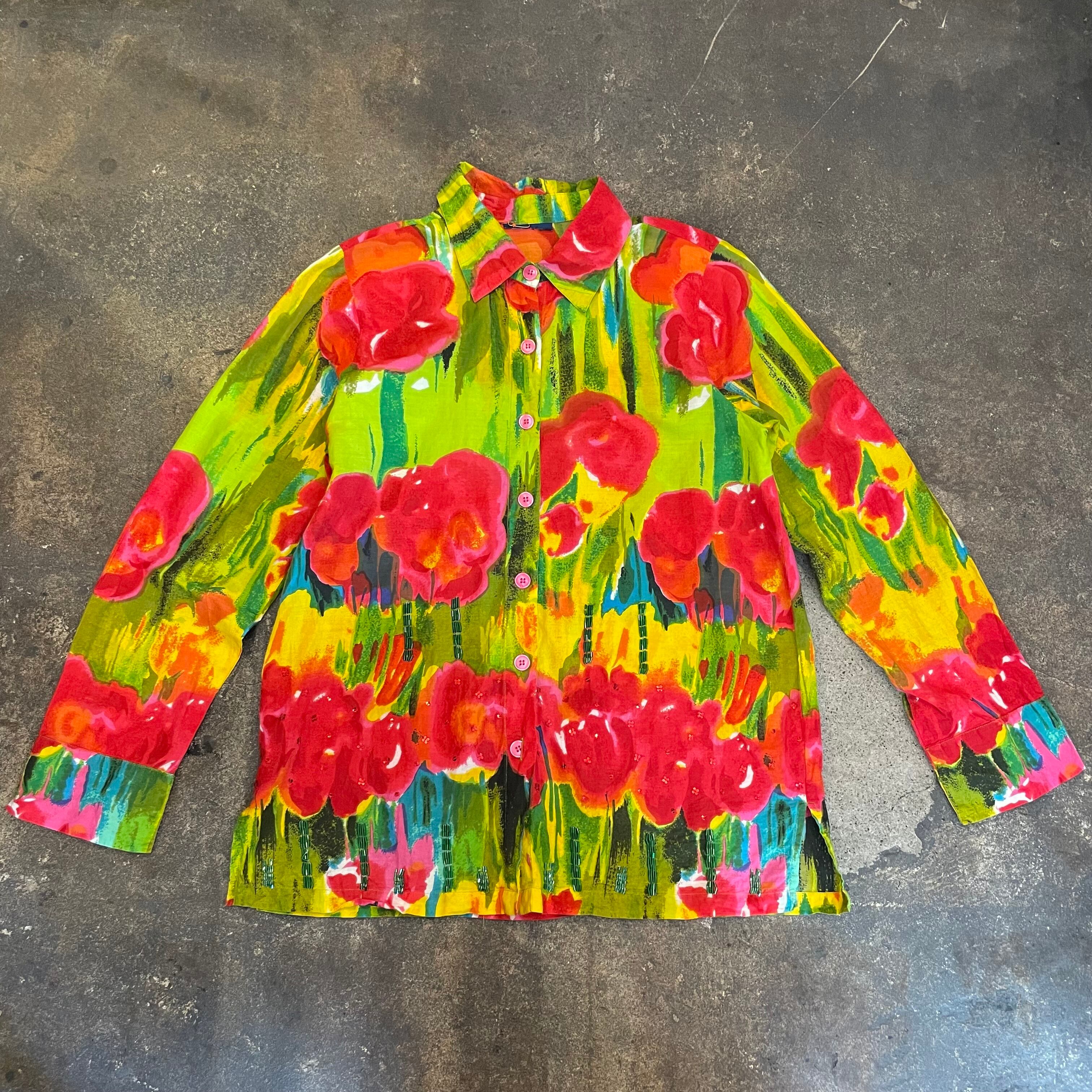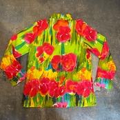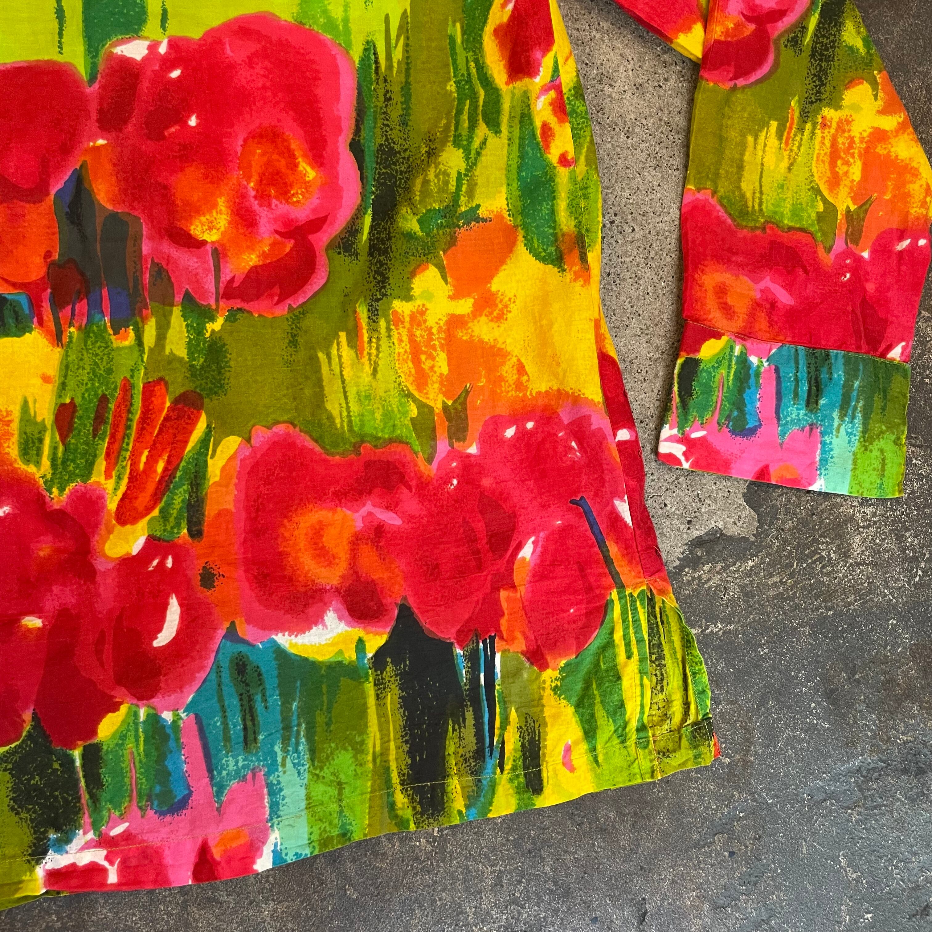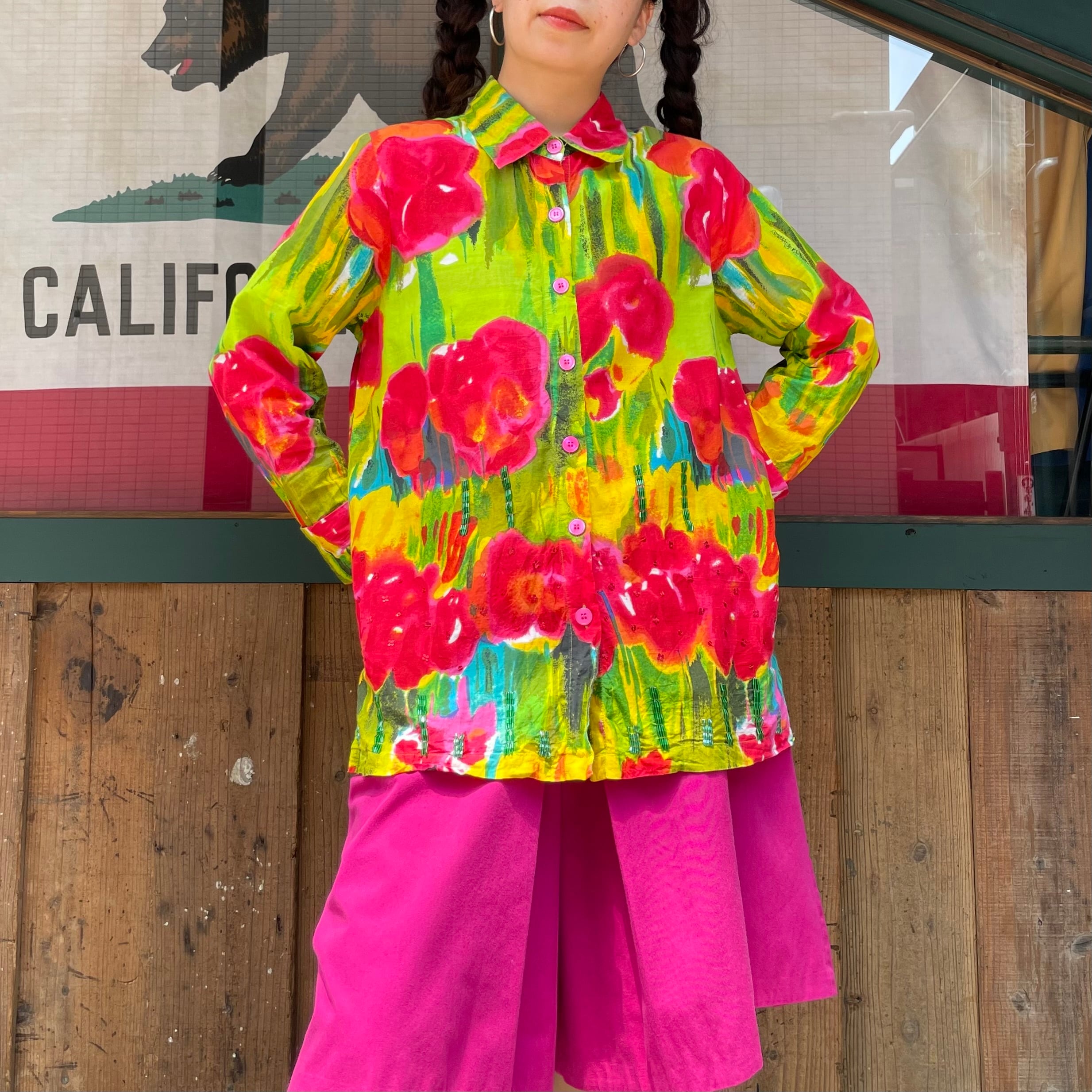チューリップ畑のような柄がかわいい長袖シャツです。