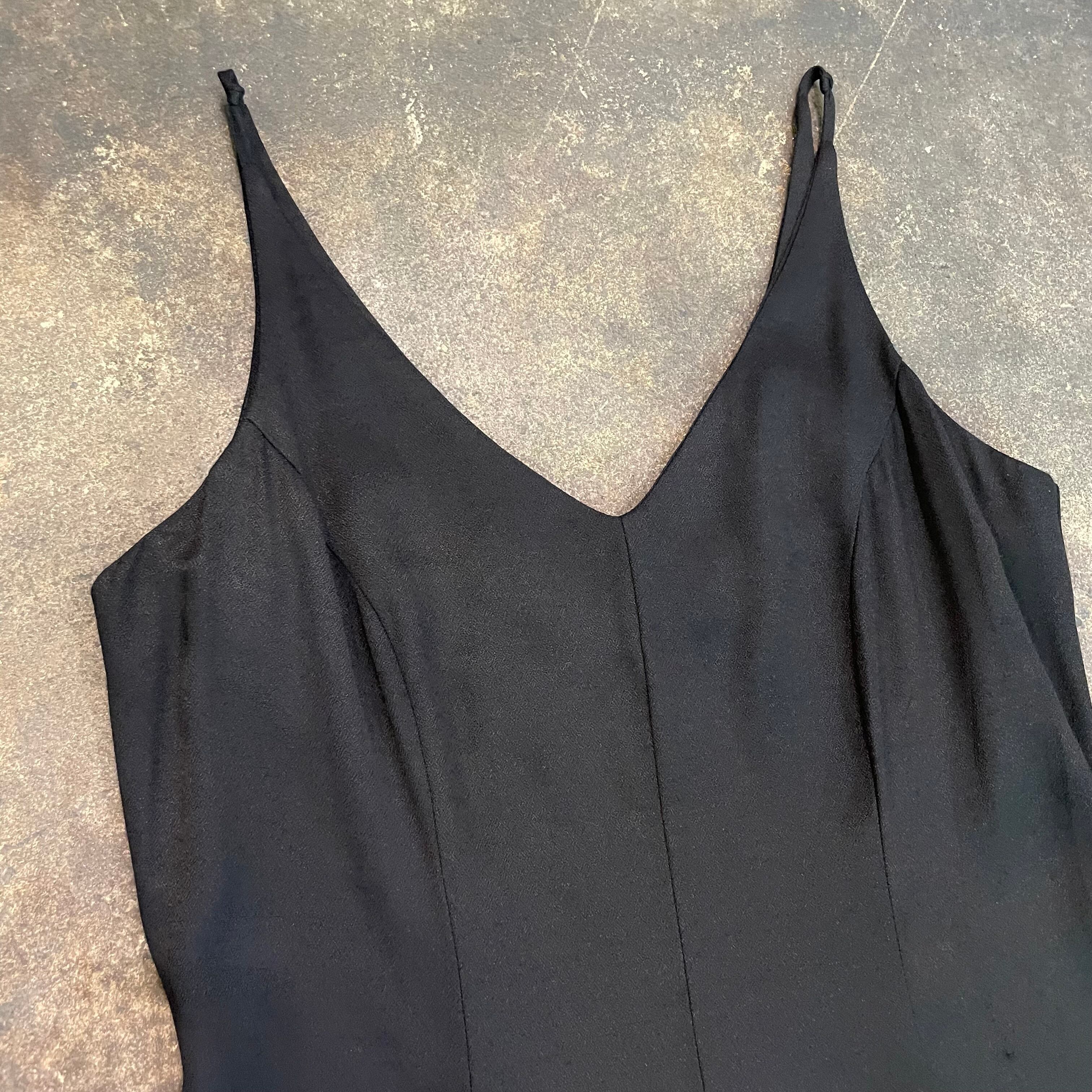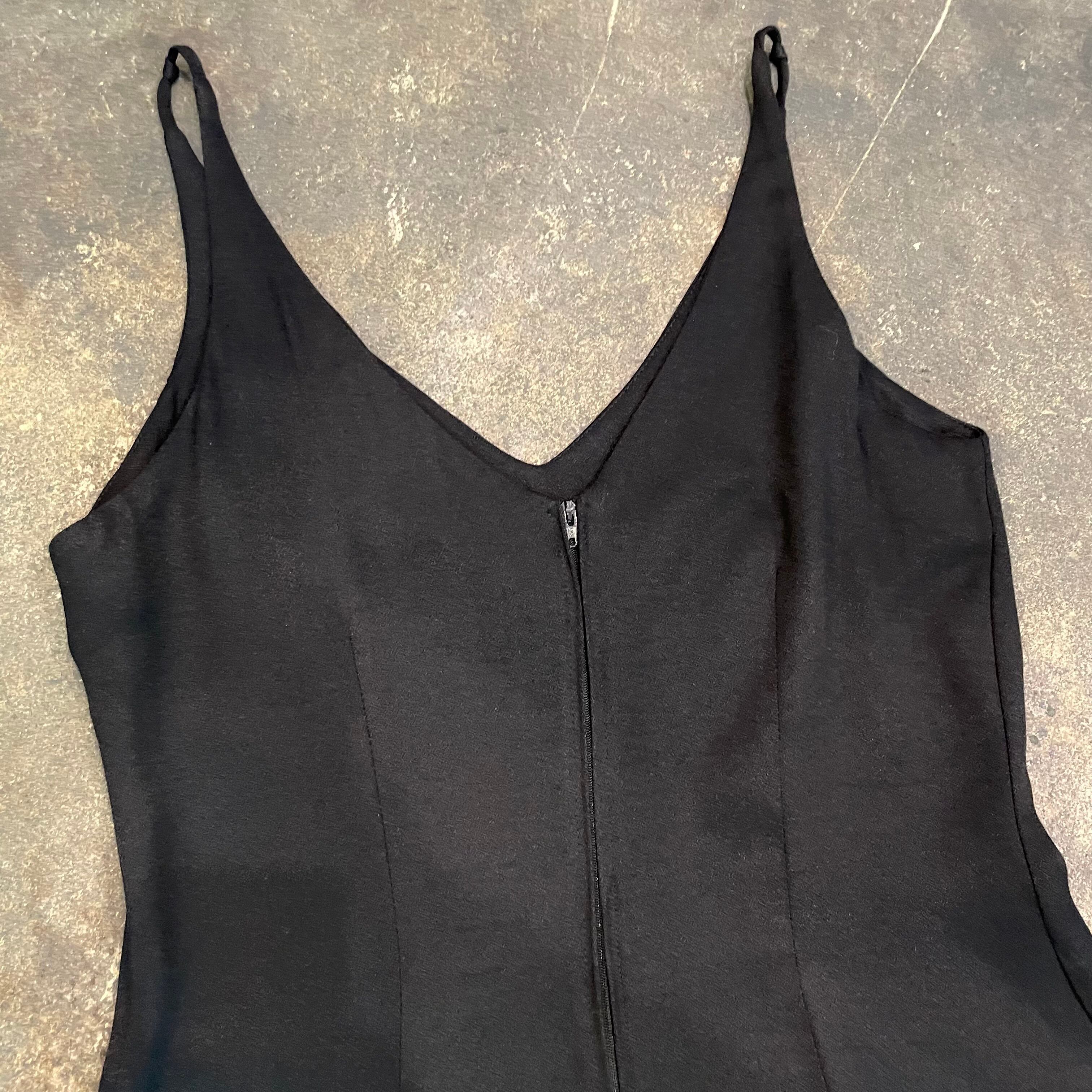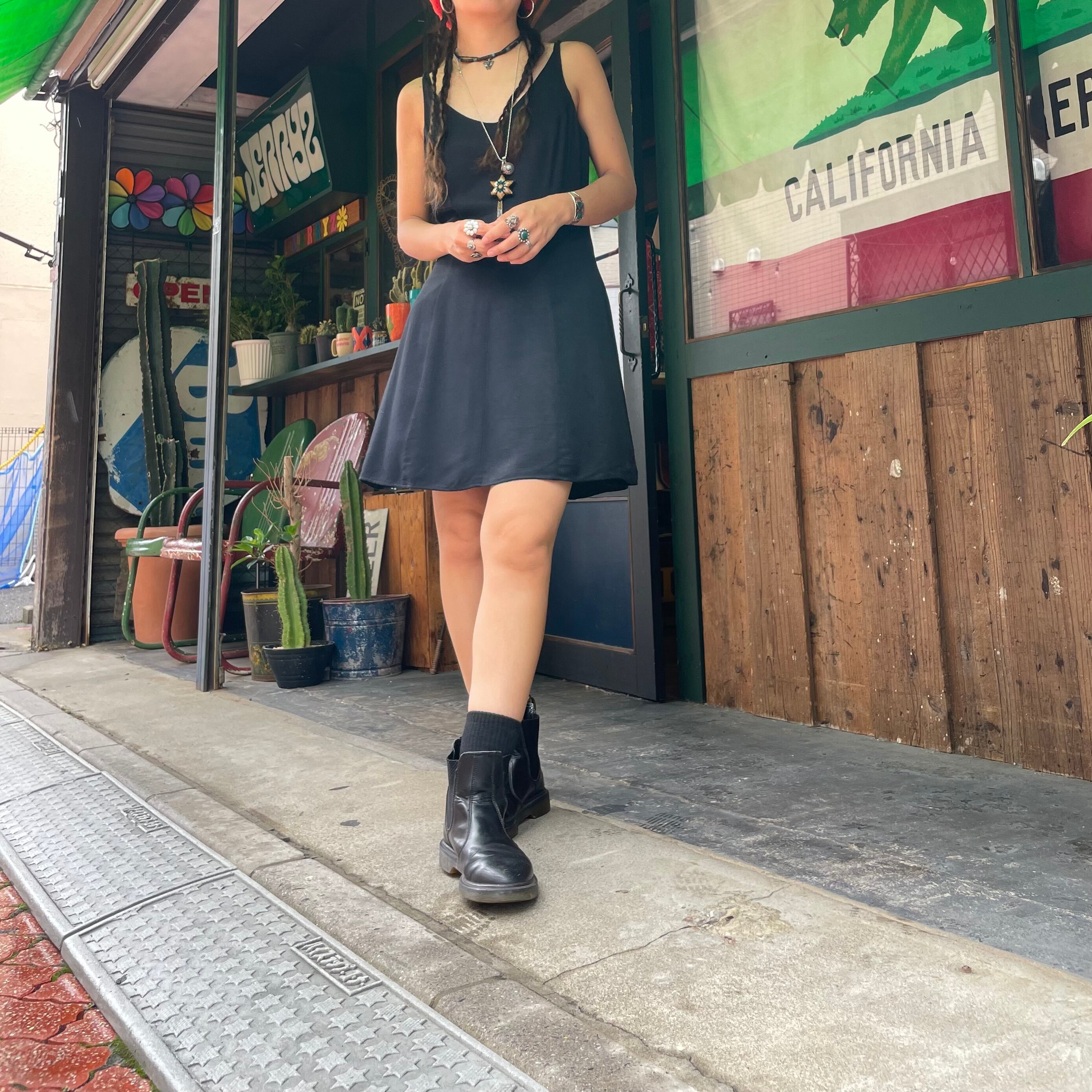 真っ黒のつるっとした生地感がかっこいい雰囲気のキャミソールワンピースです。