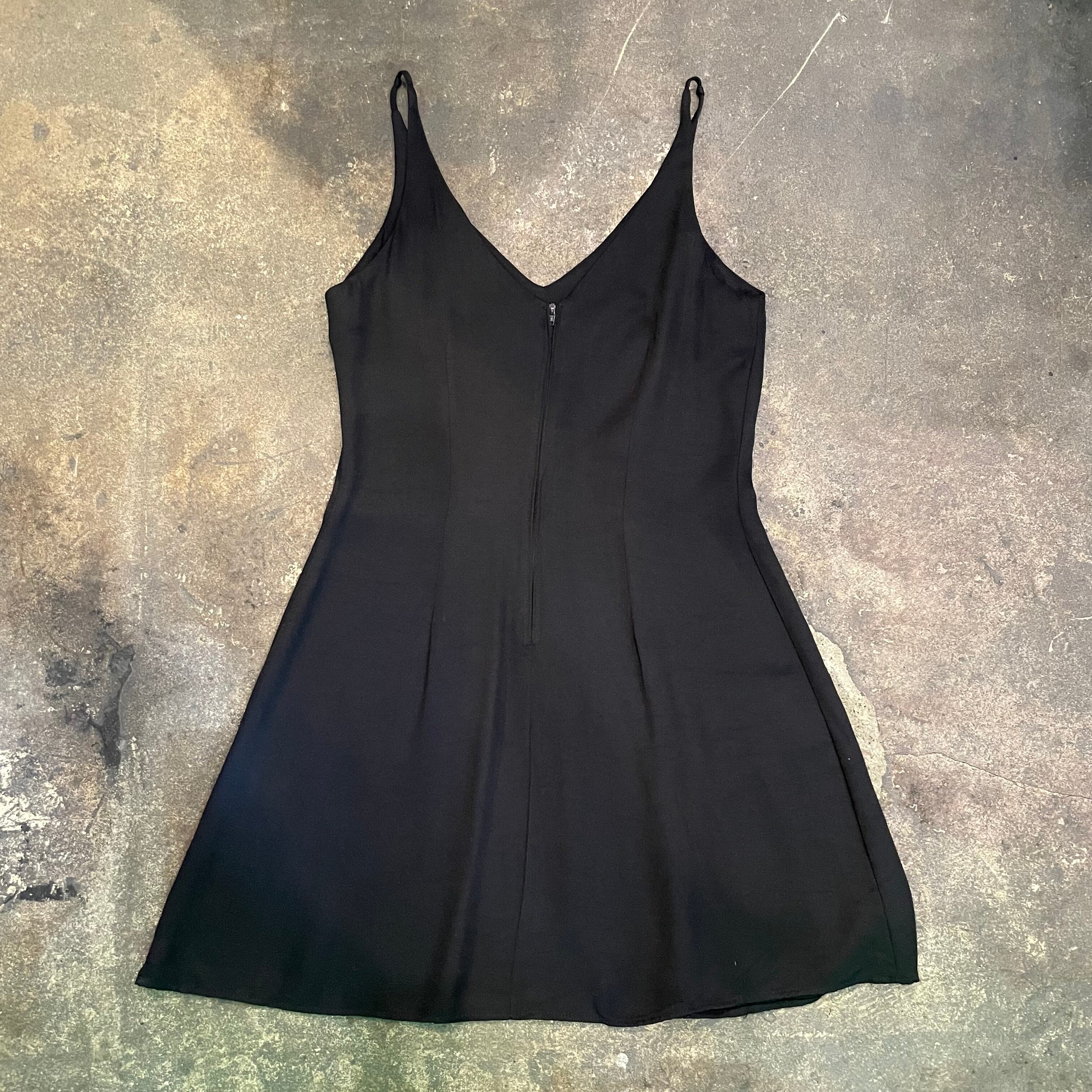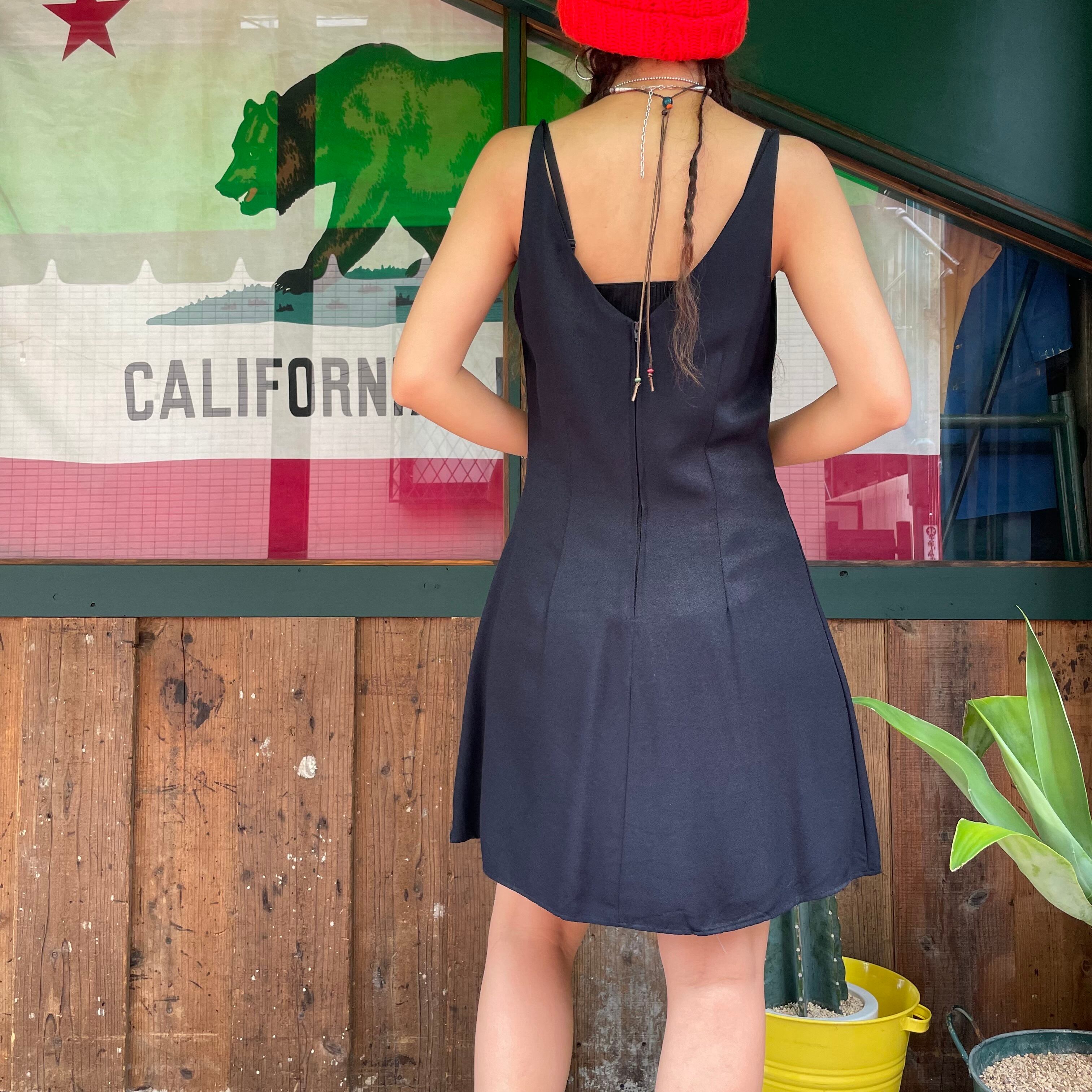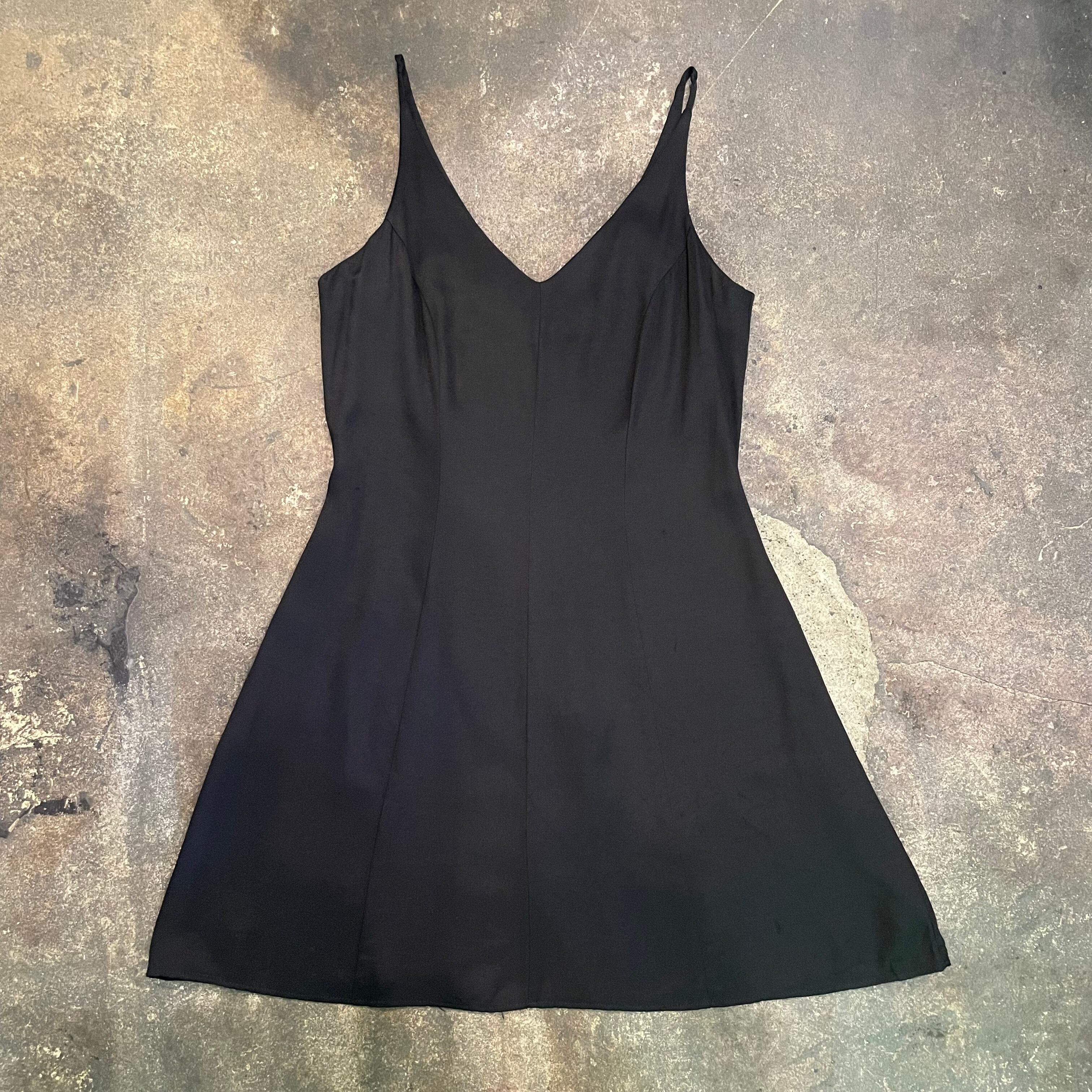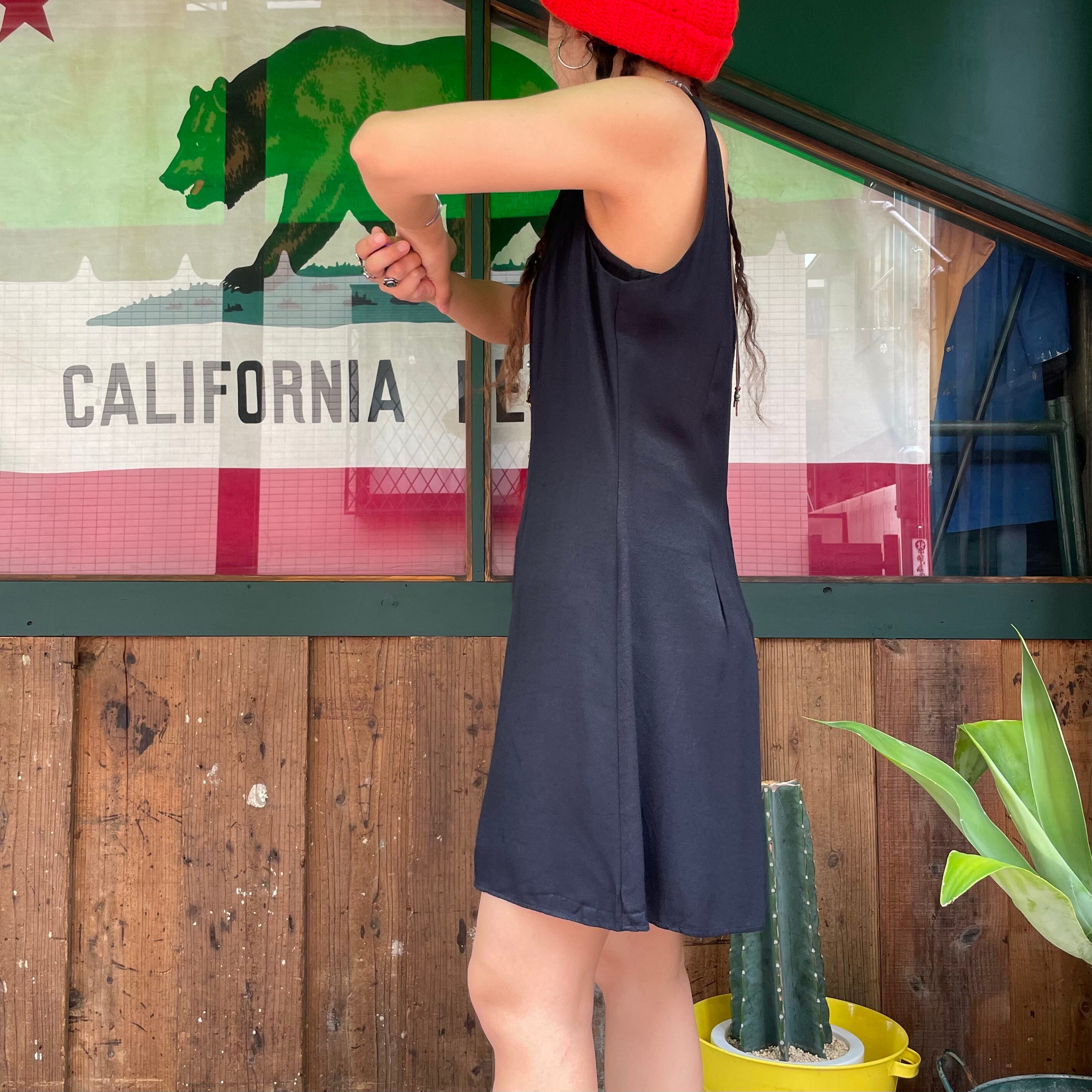 真っ黒のつるっとした生地感がかっこいい雰囲気のキャミソールワンピースです。