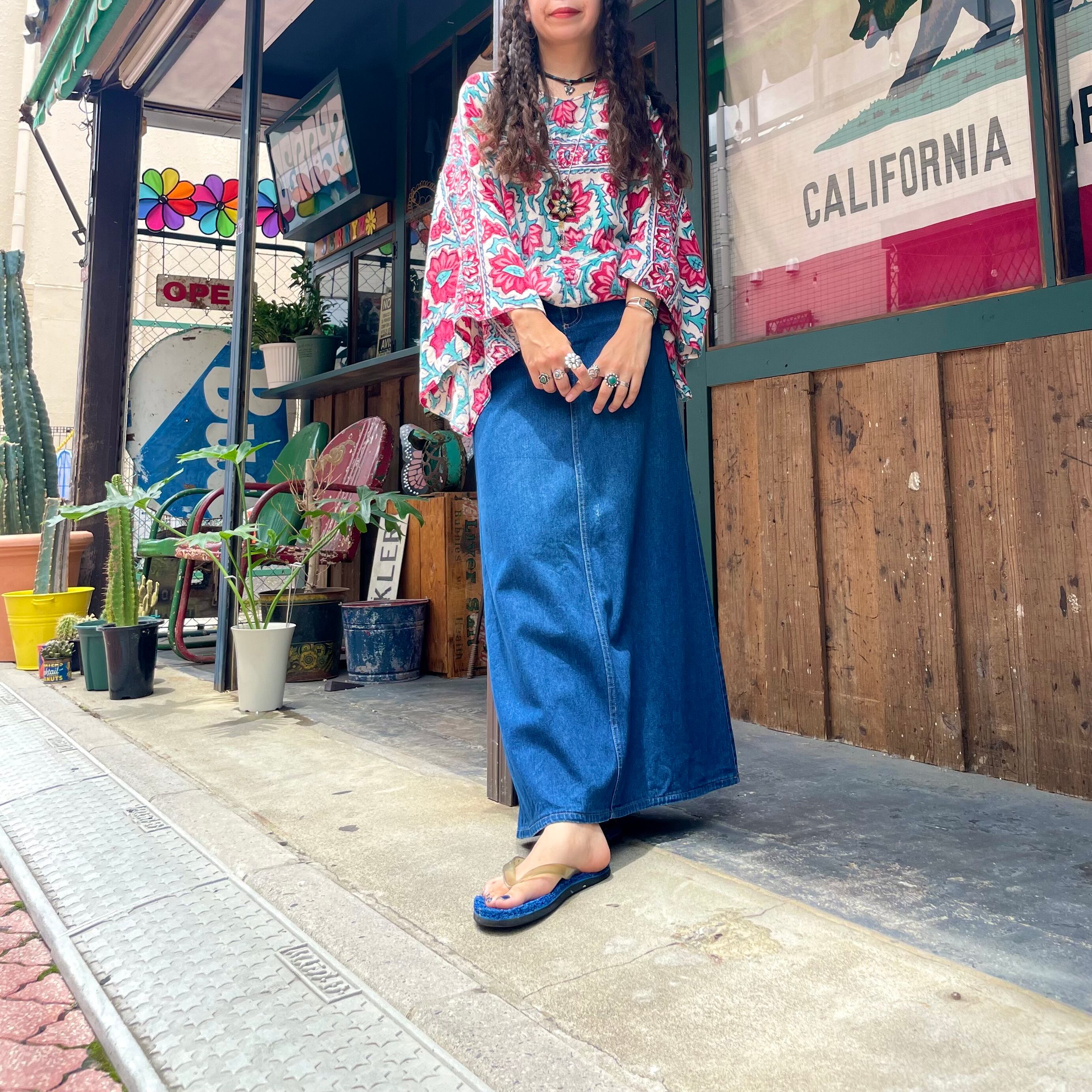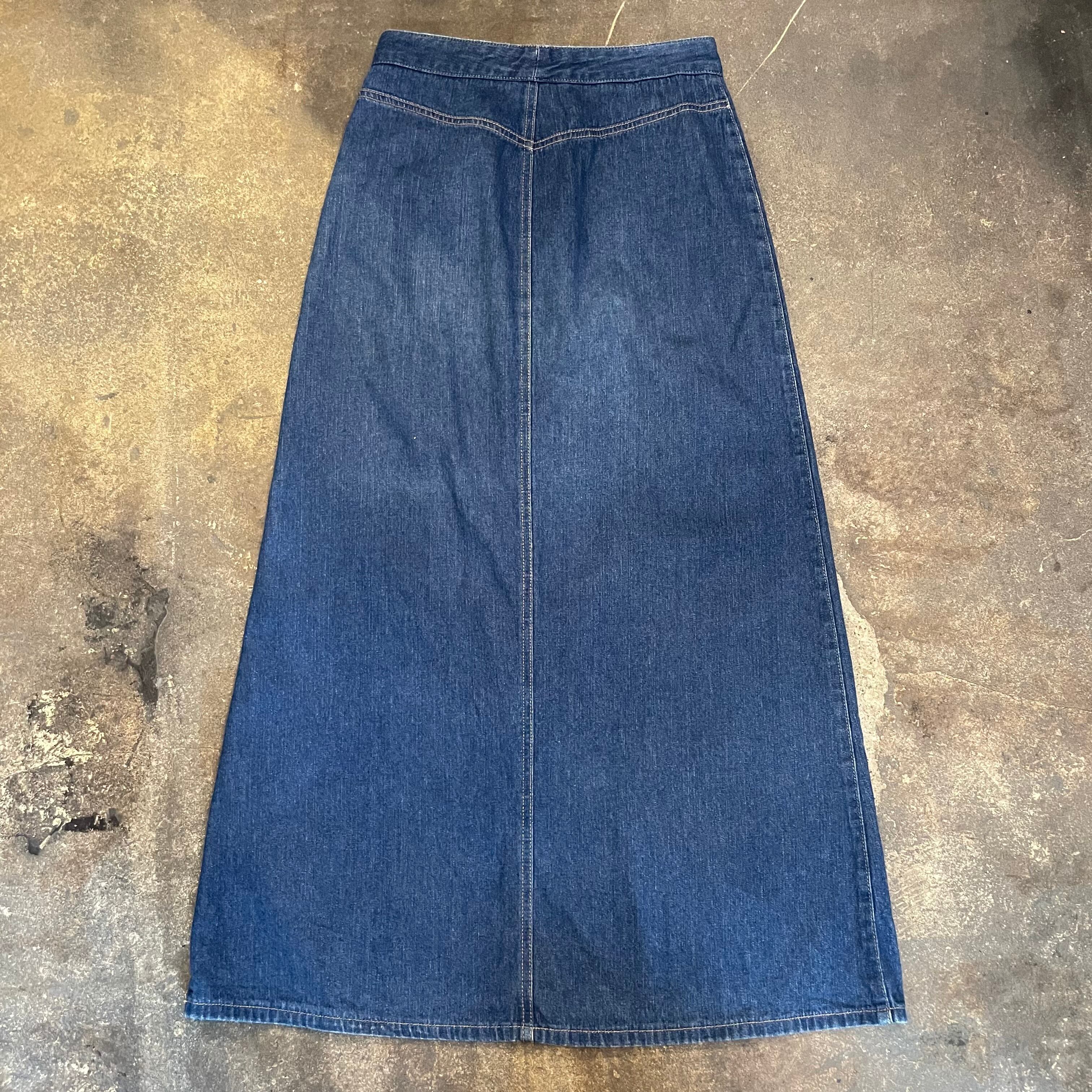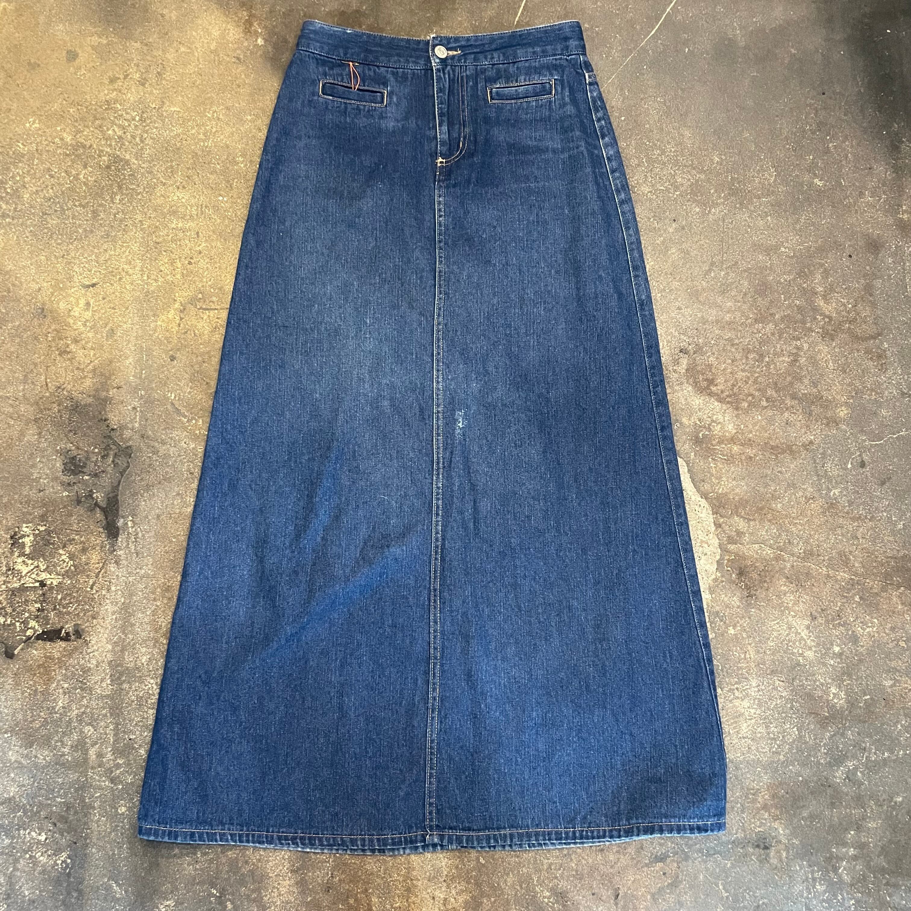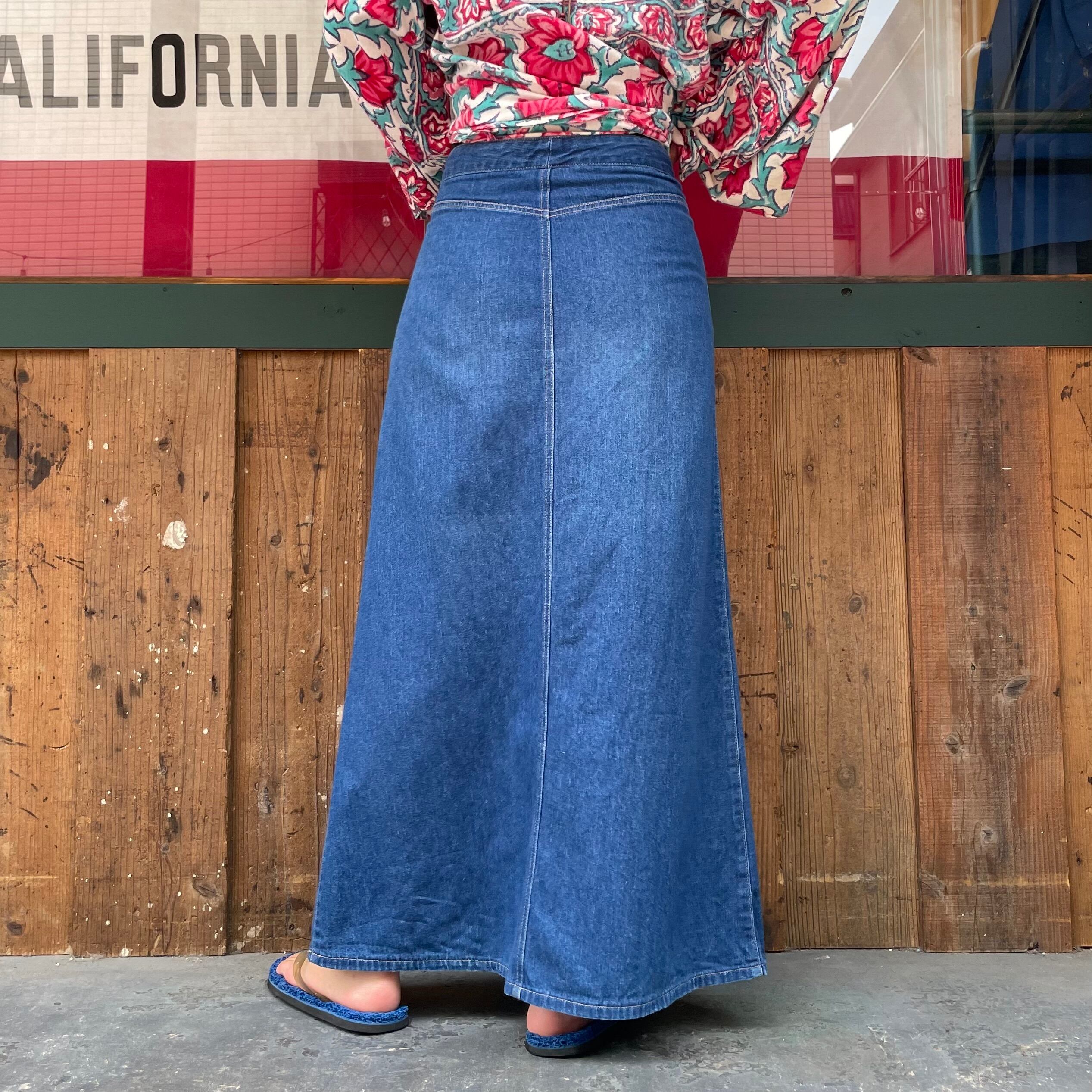 色が濃いめで細めなスッキリシルエットがかわいいデニムのロングスカートです。