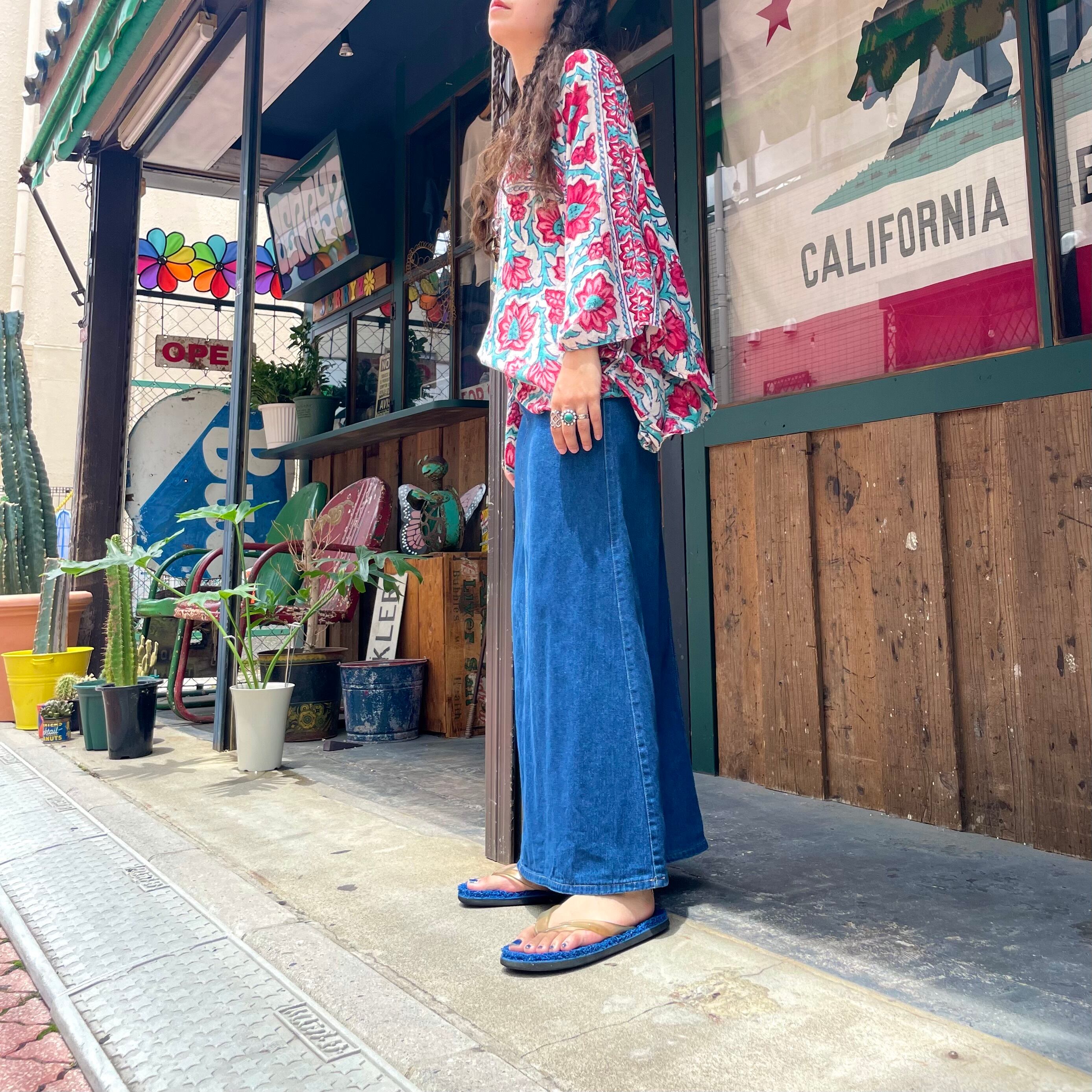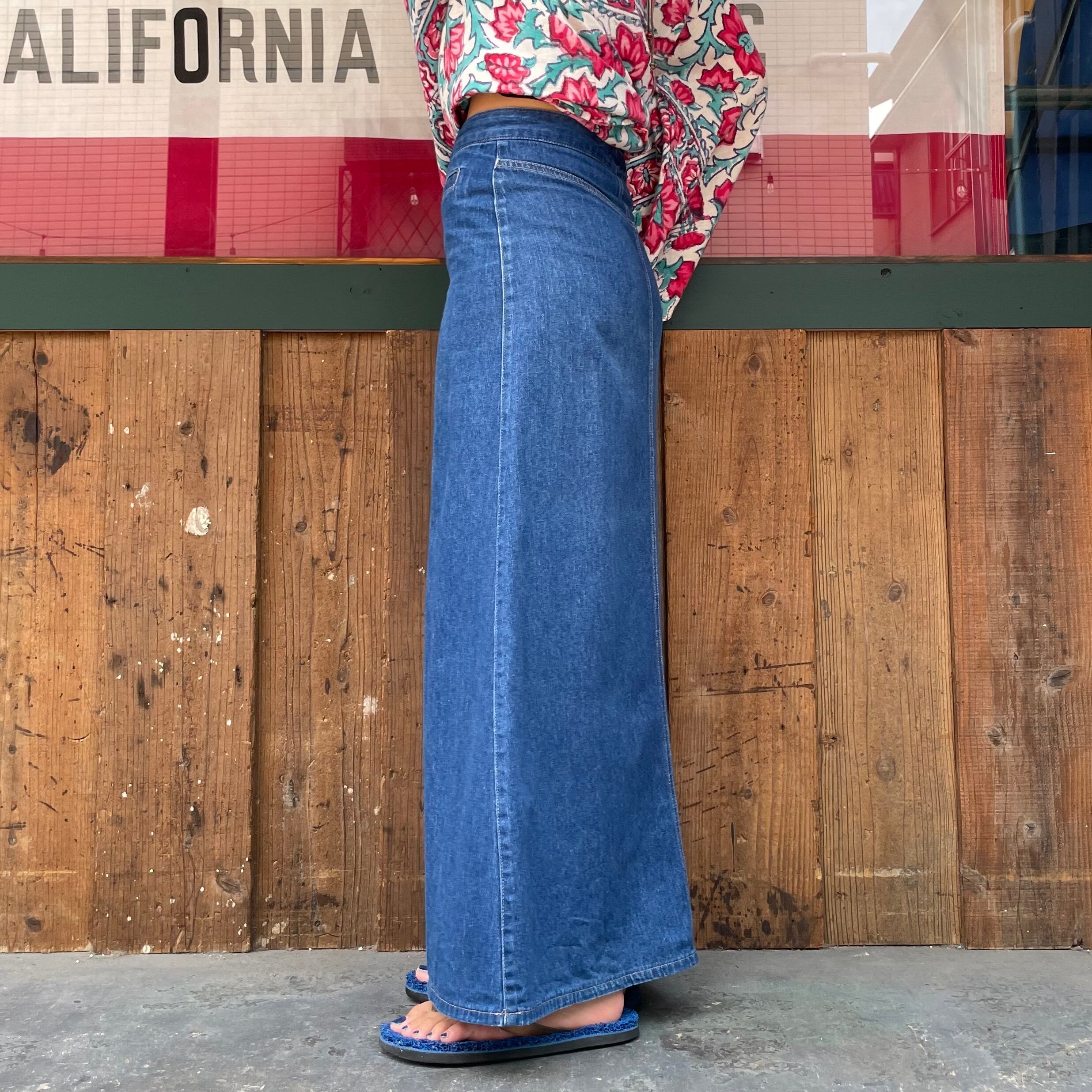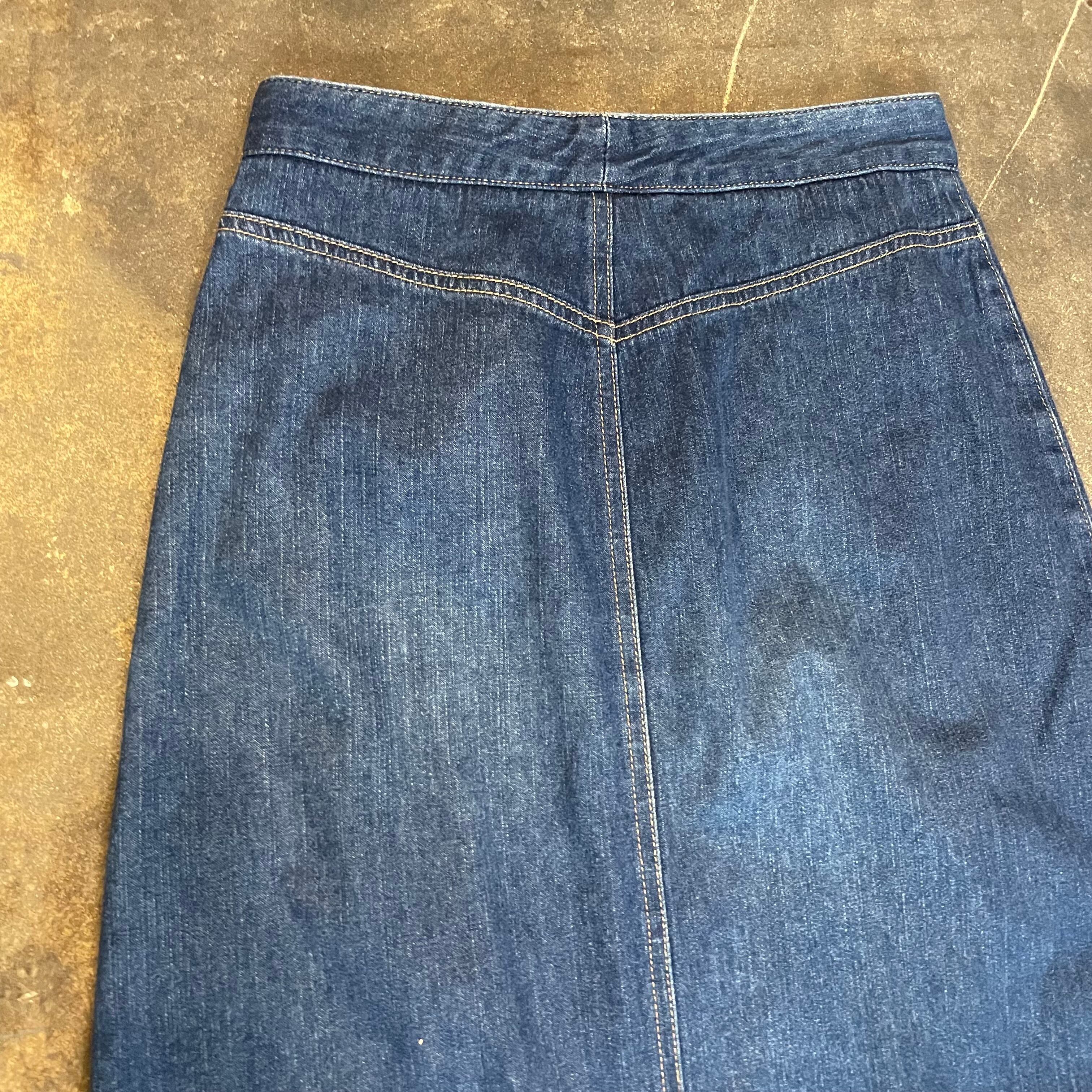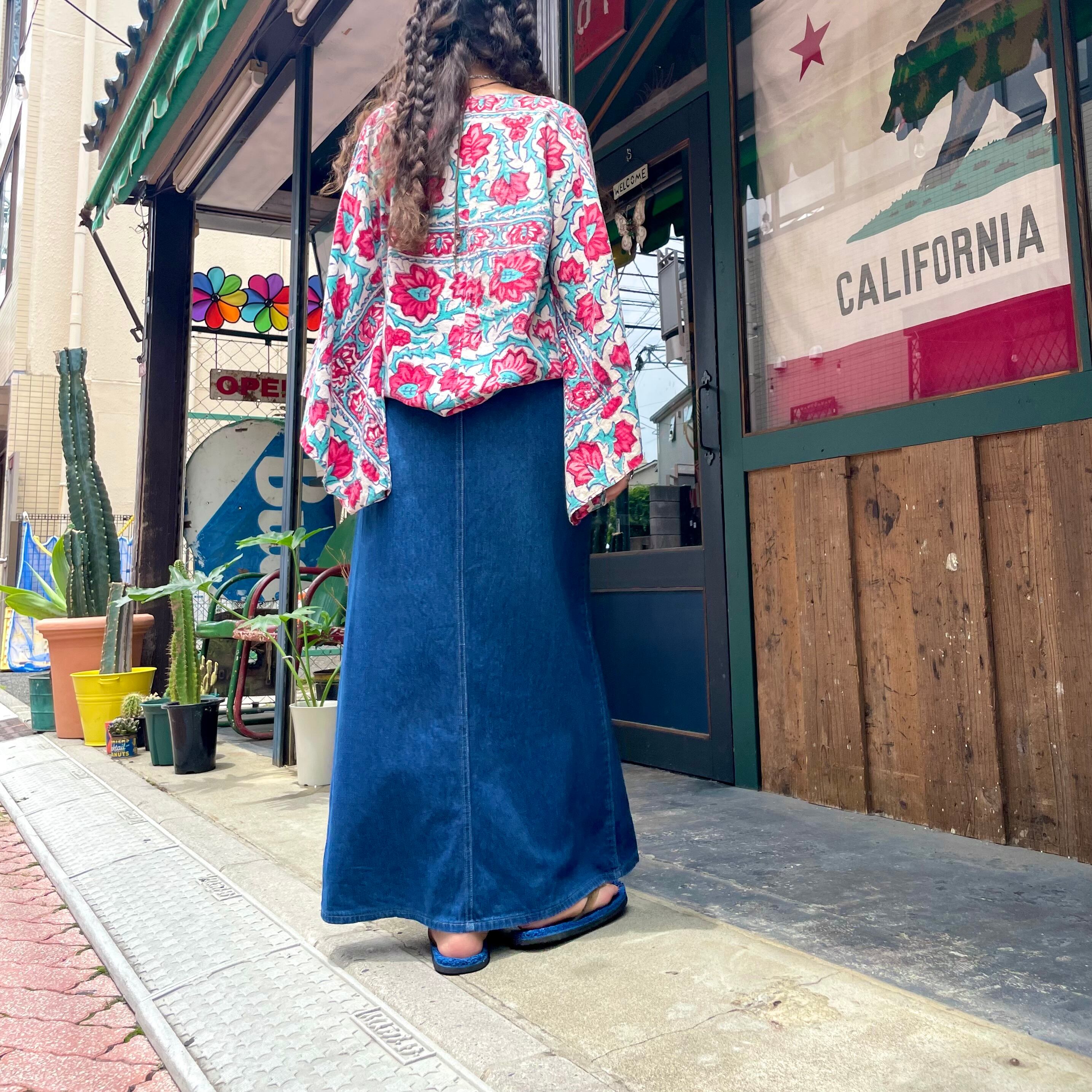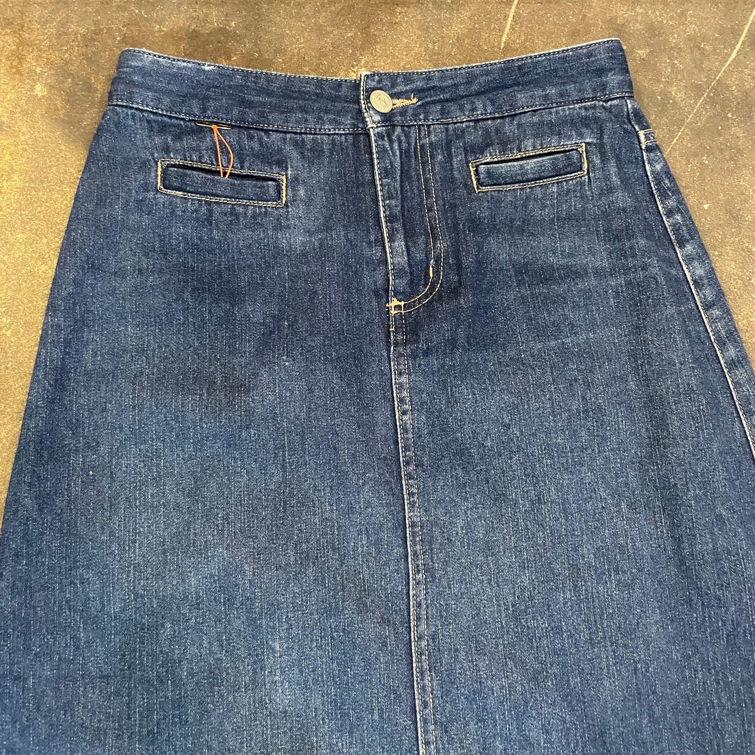 色が濃いめで細めなスッキリシルエットがかわいいデニムのロングスカートです。