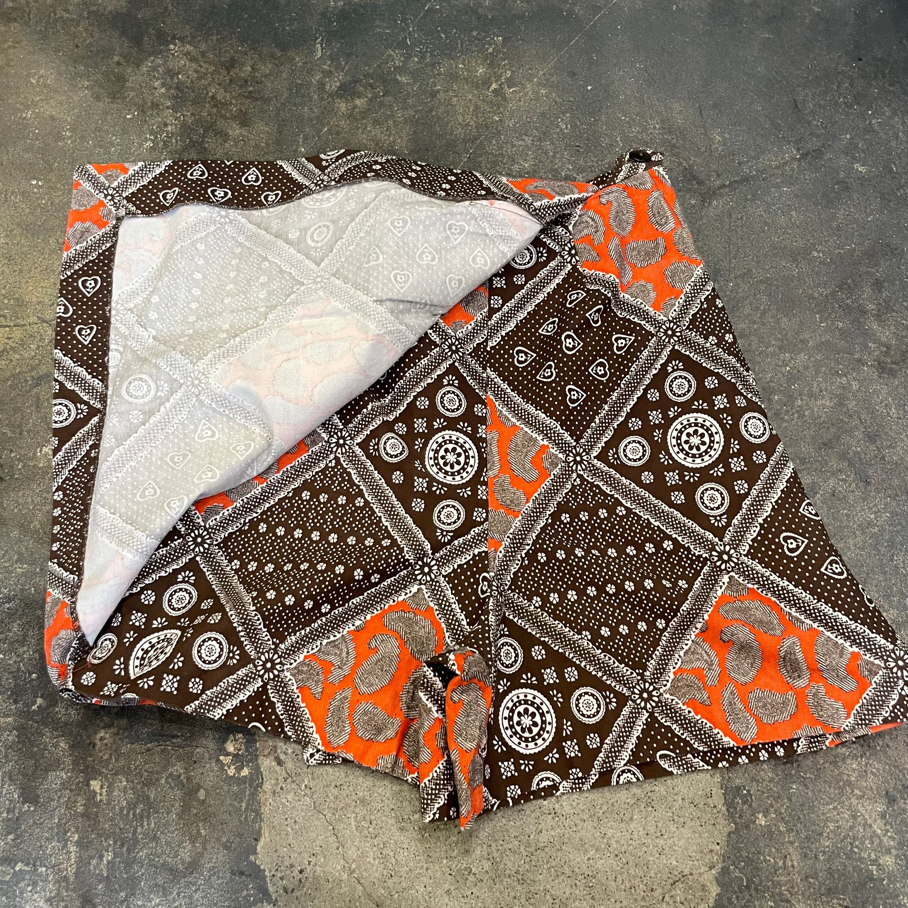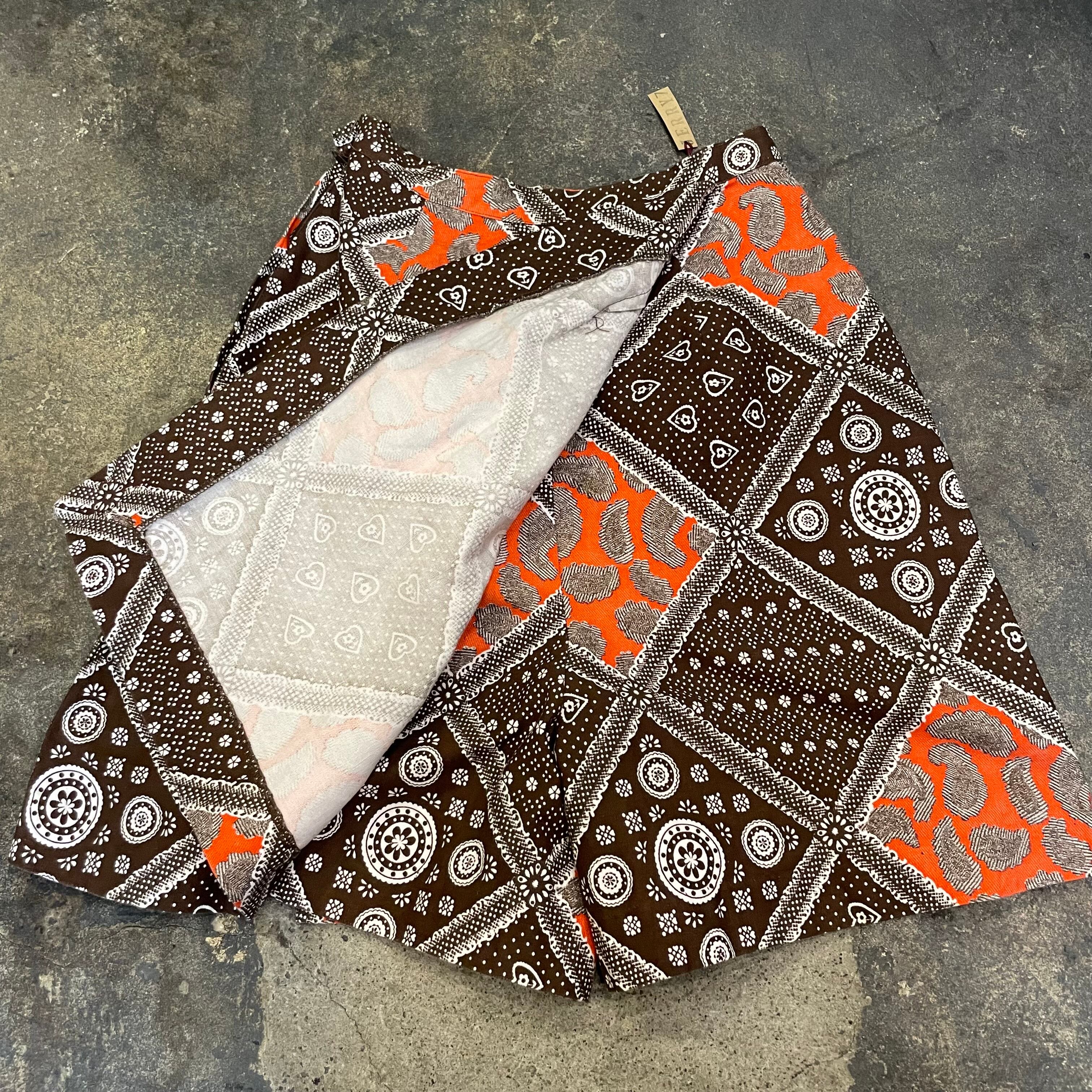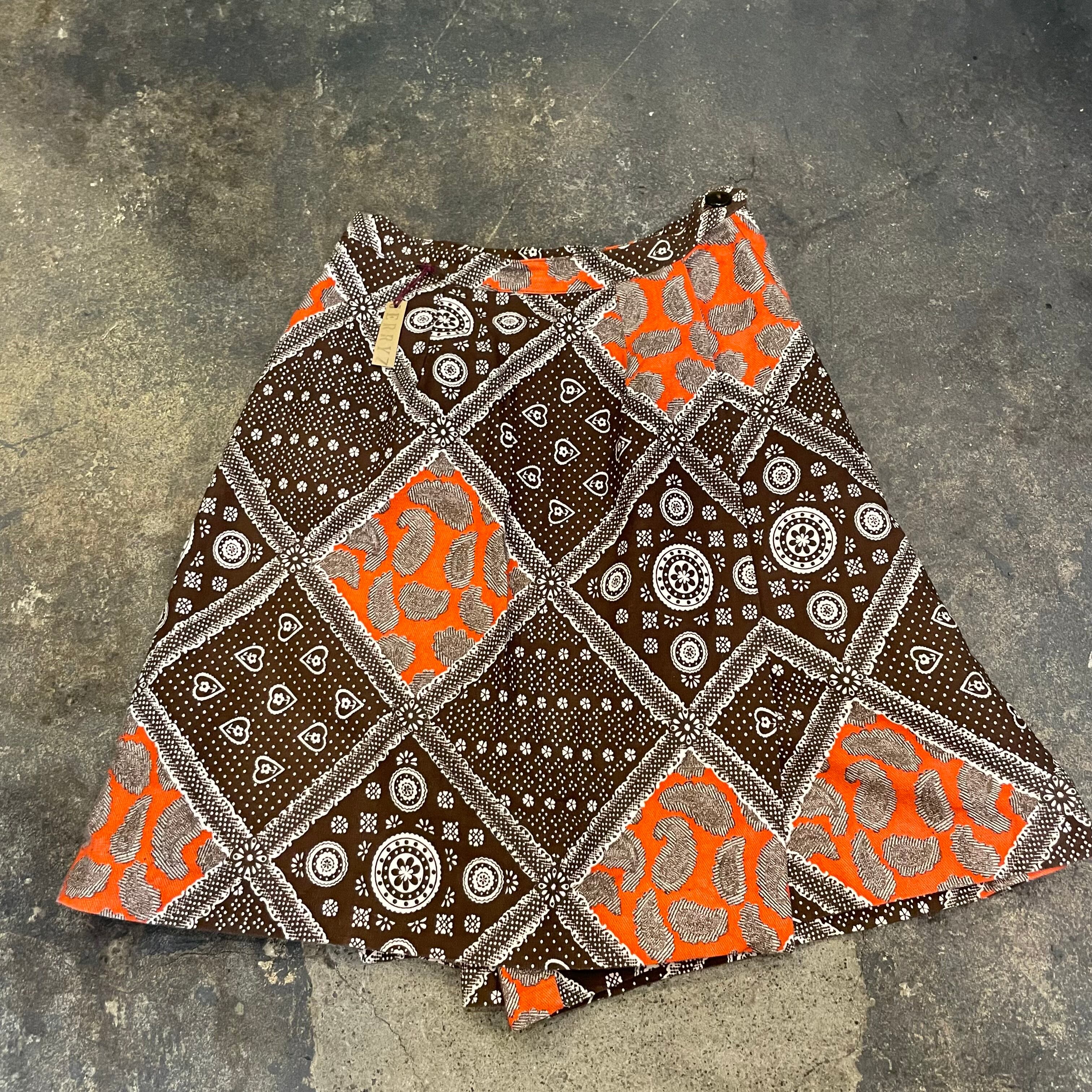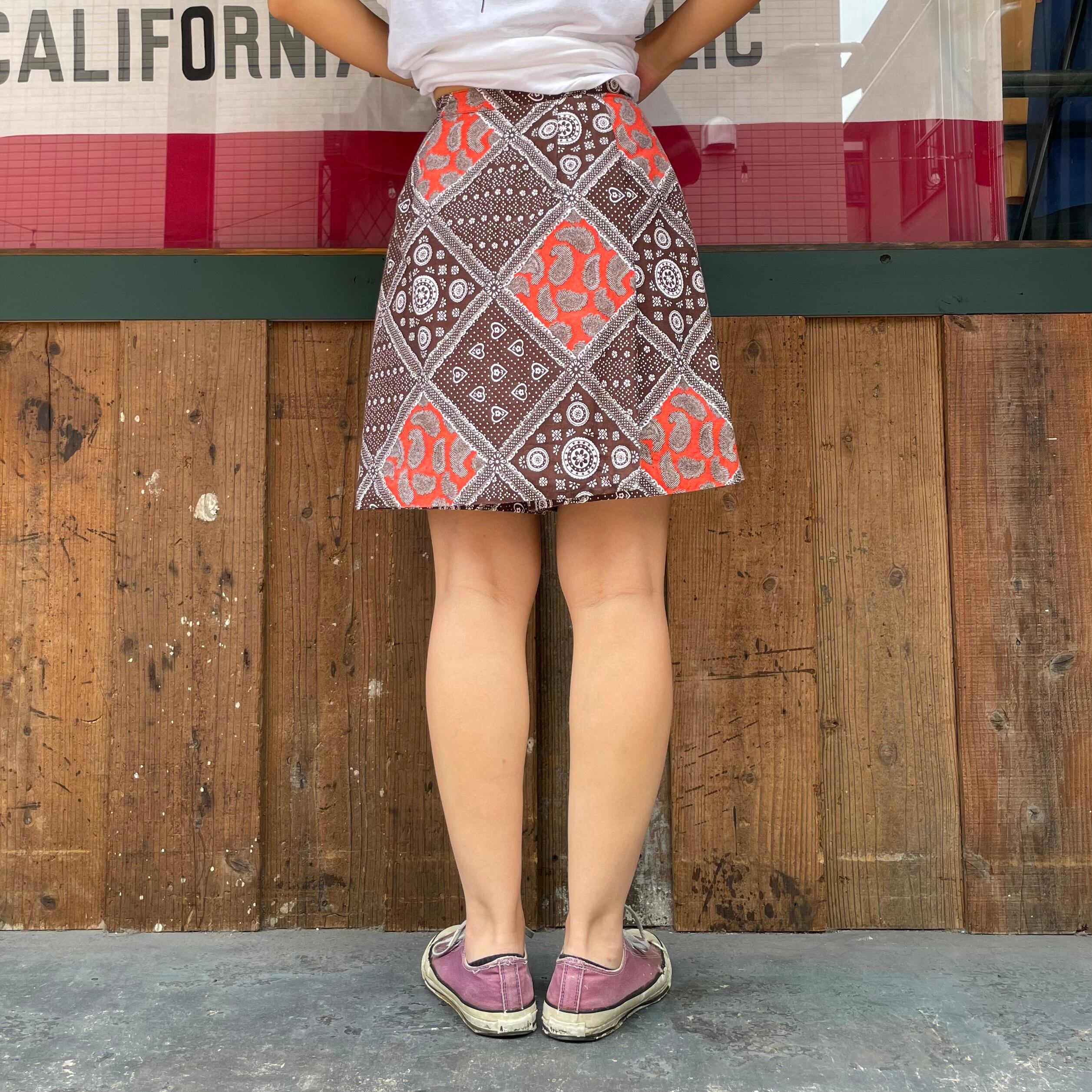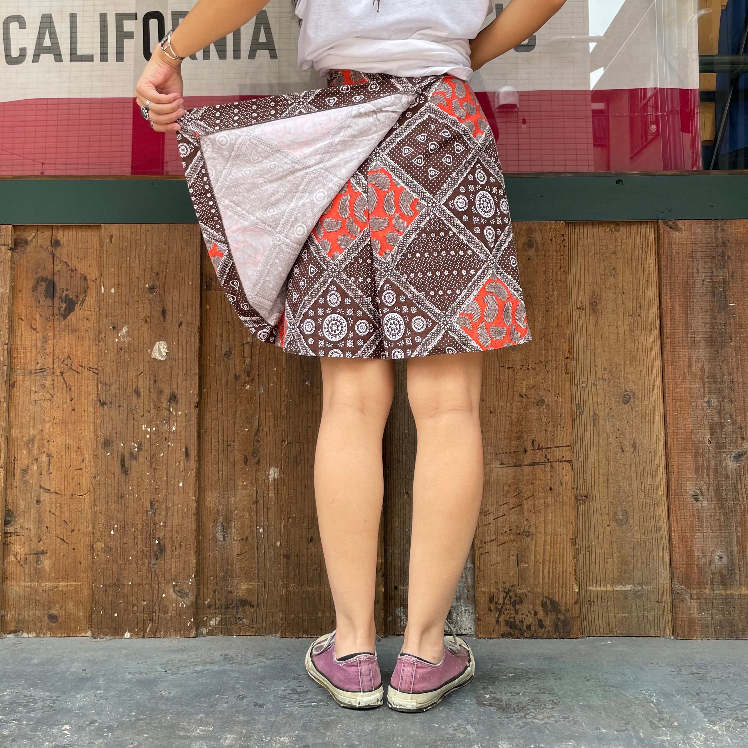バンダナのような柄などの模様が70年代らしい、ヴィンテージ感溢れるかわいいキュロットパンツです。ピラっとスカートの部分が前も後ろにも付いていて一見ミニスカートです。
