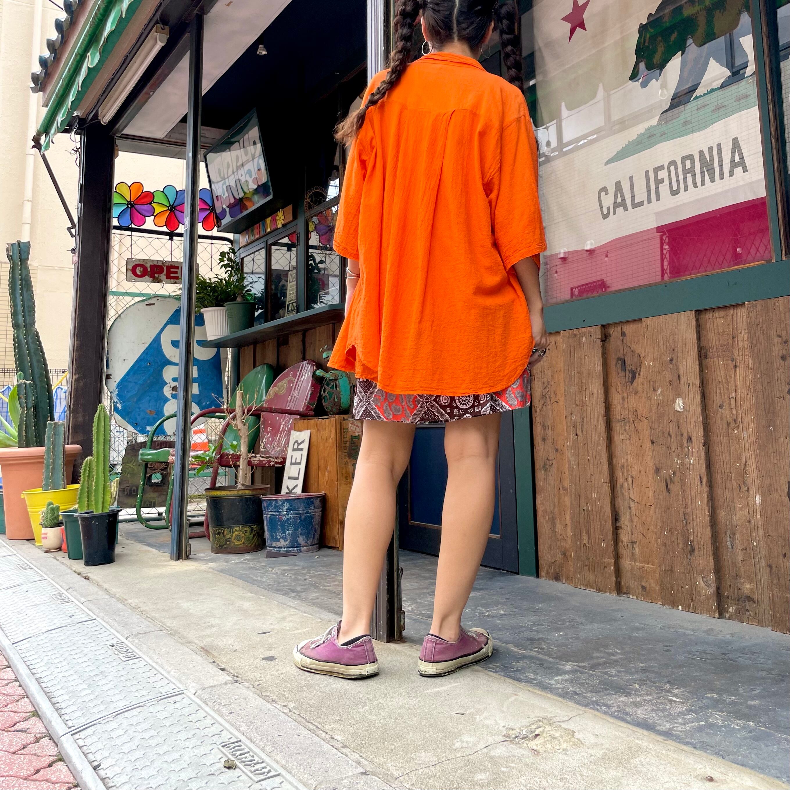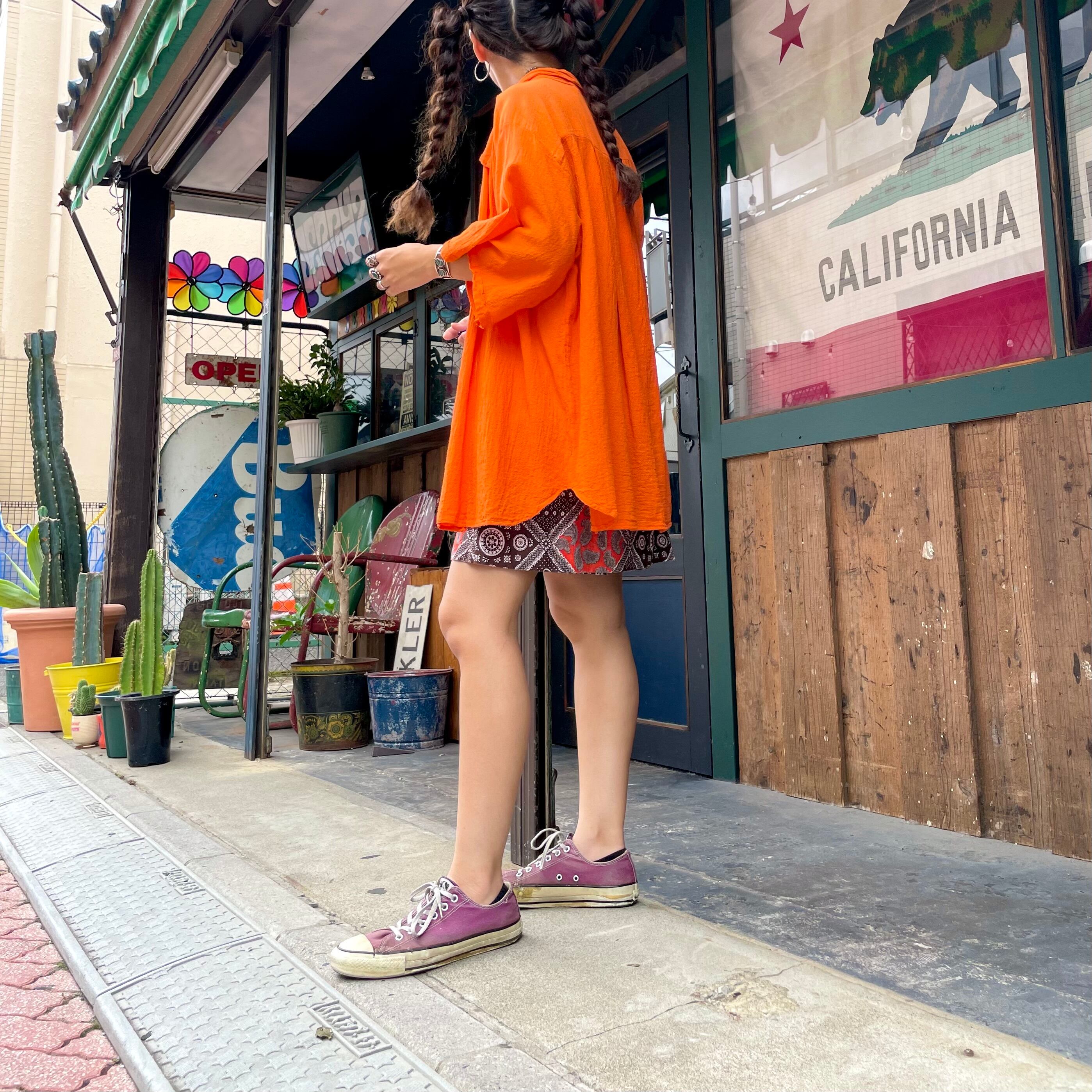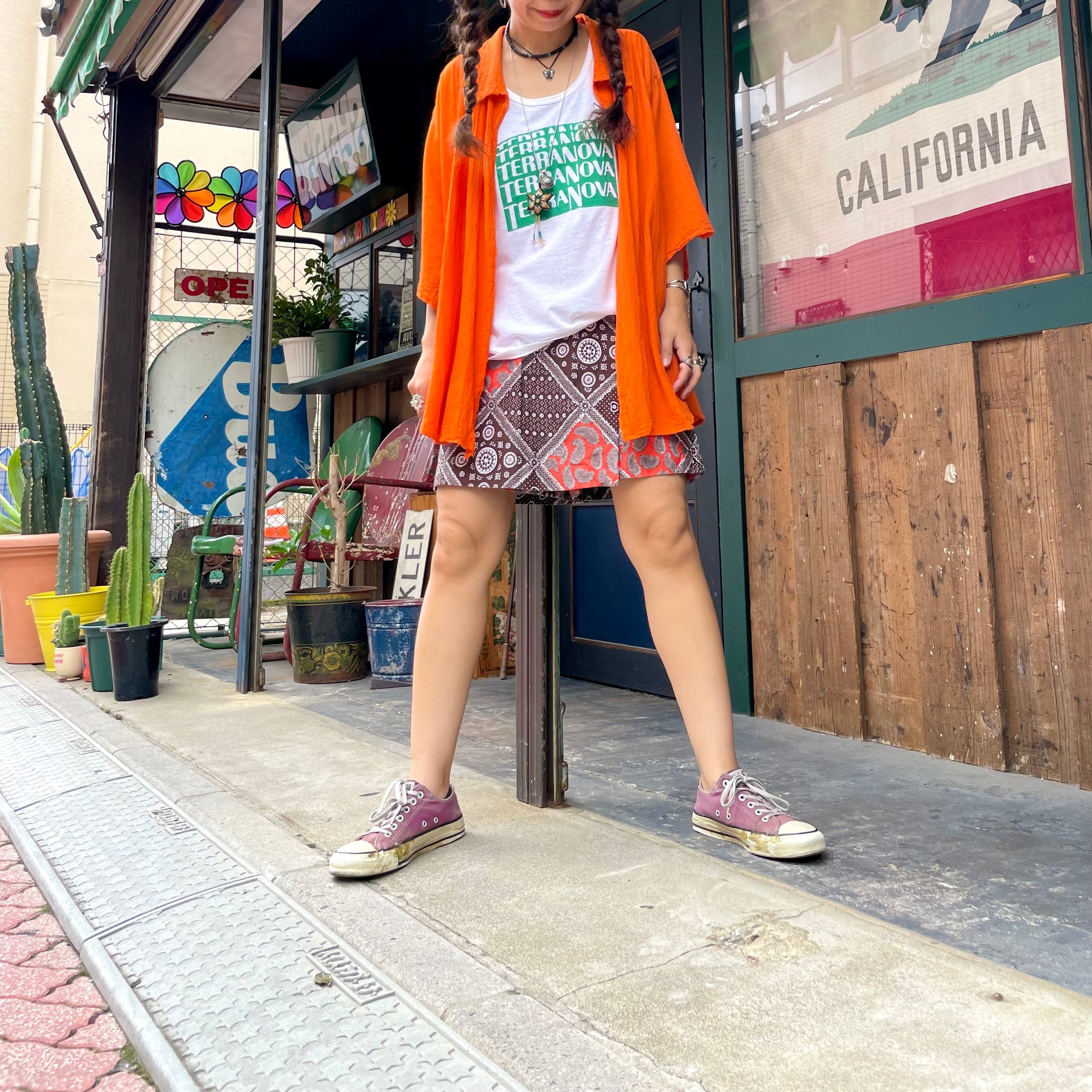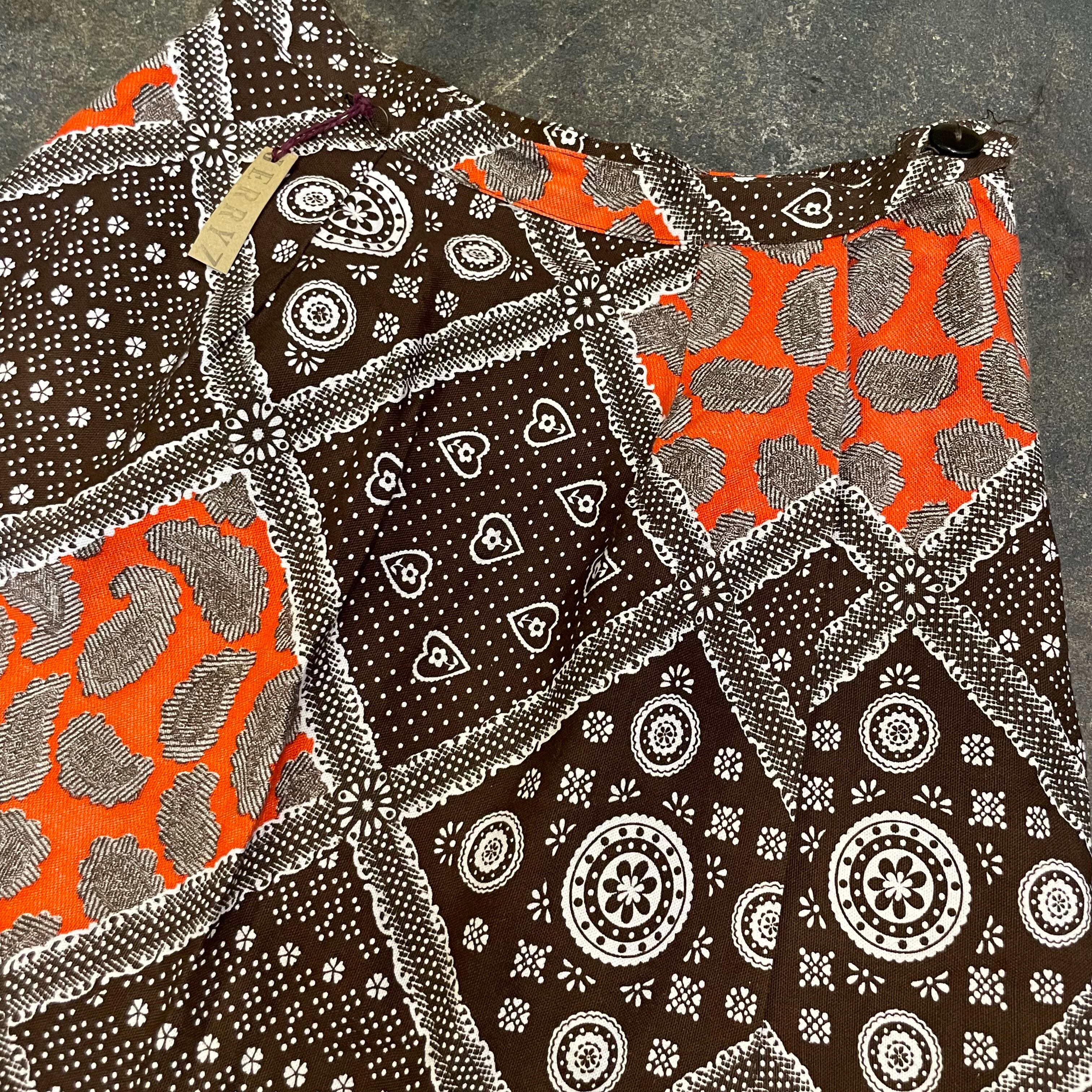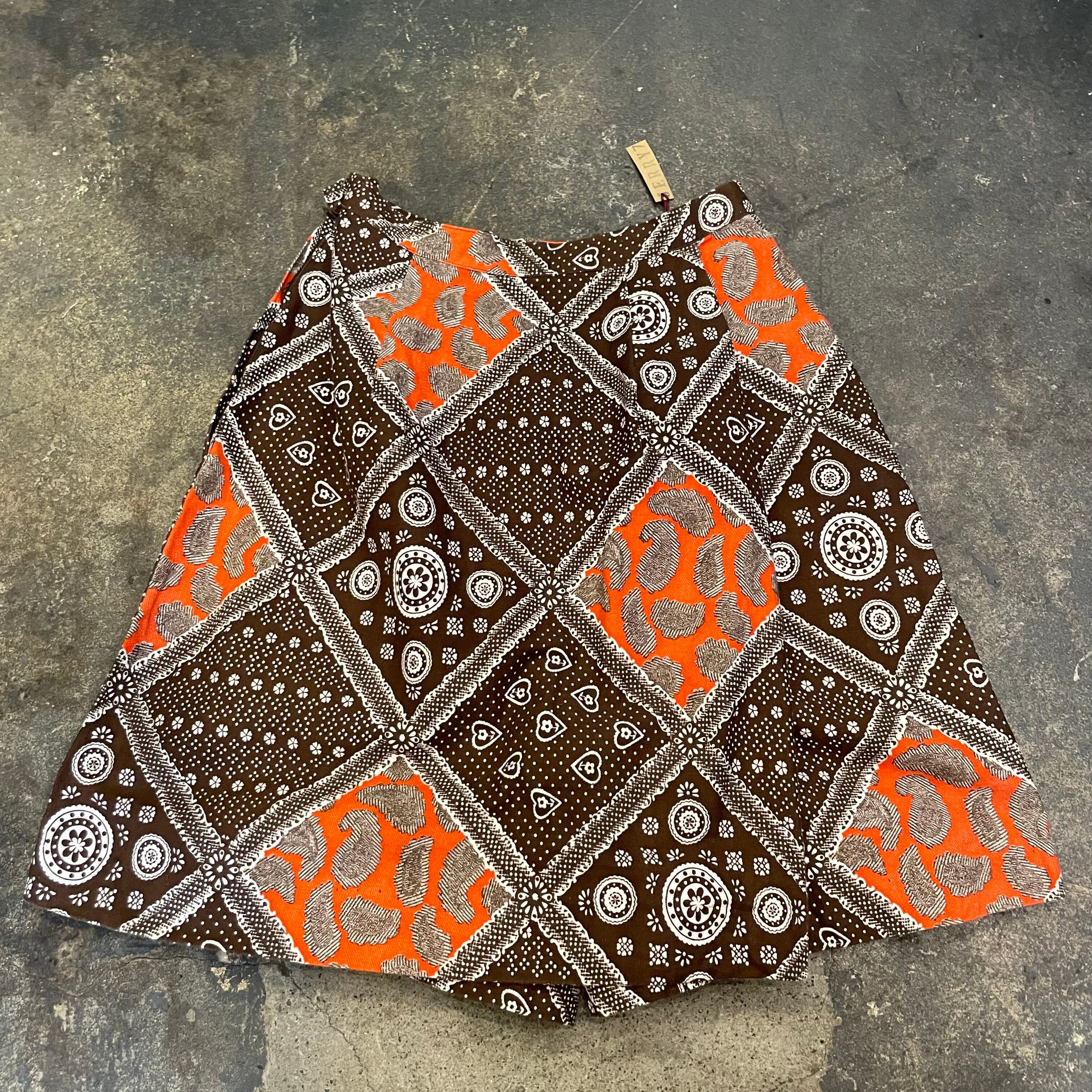 バンダナのような柄などの模様が70年代らしい、ヴィンテージ感溢れるかわいいキュロットパンツです。ピラっとスカートの部分が前も後ろにも付いていて一見ミニスカートです。