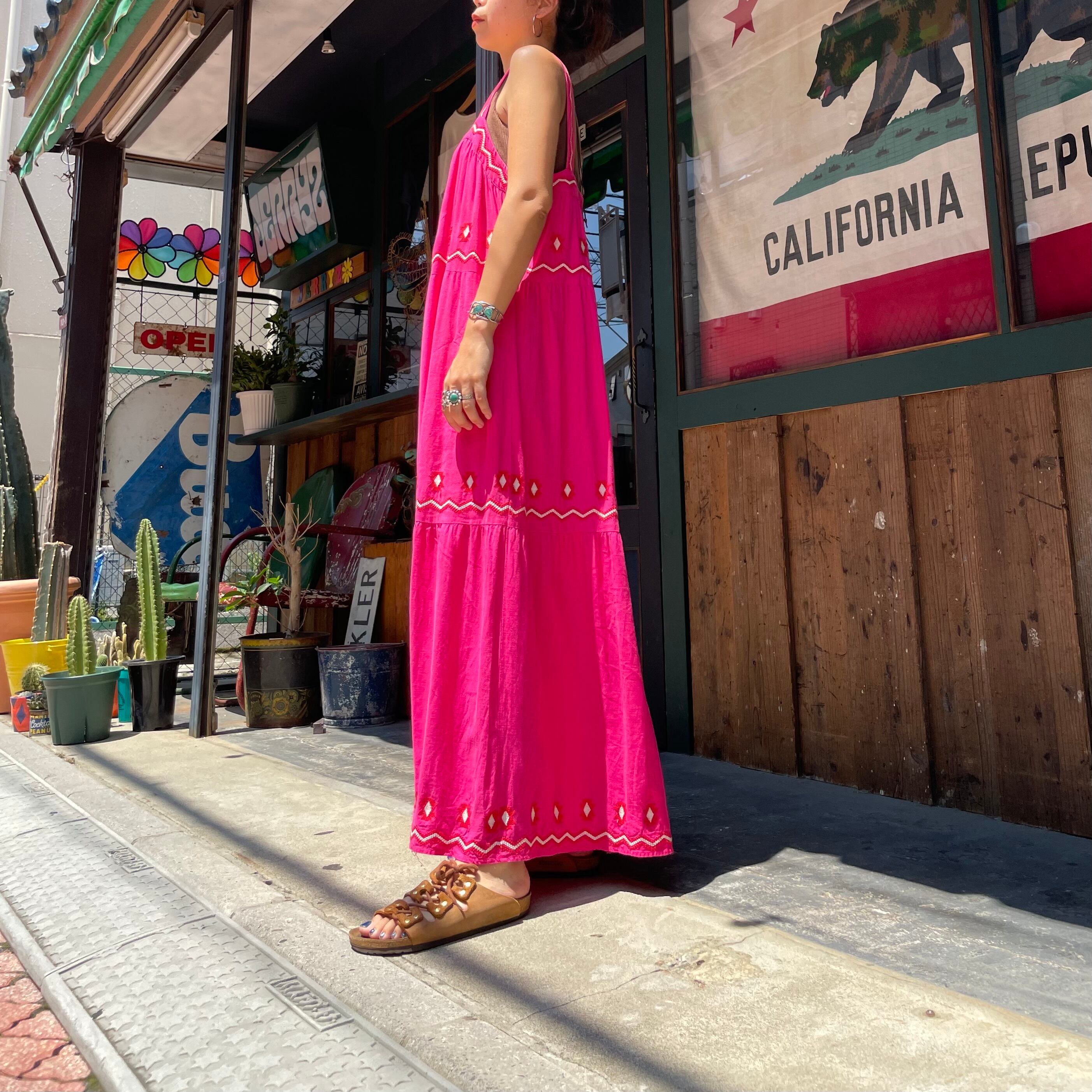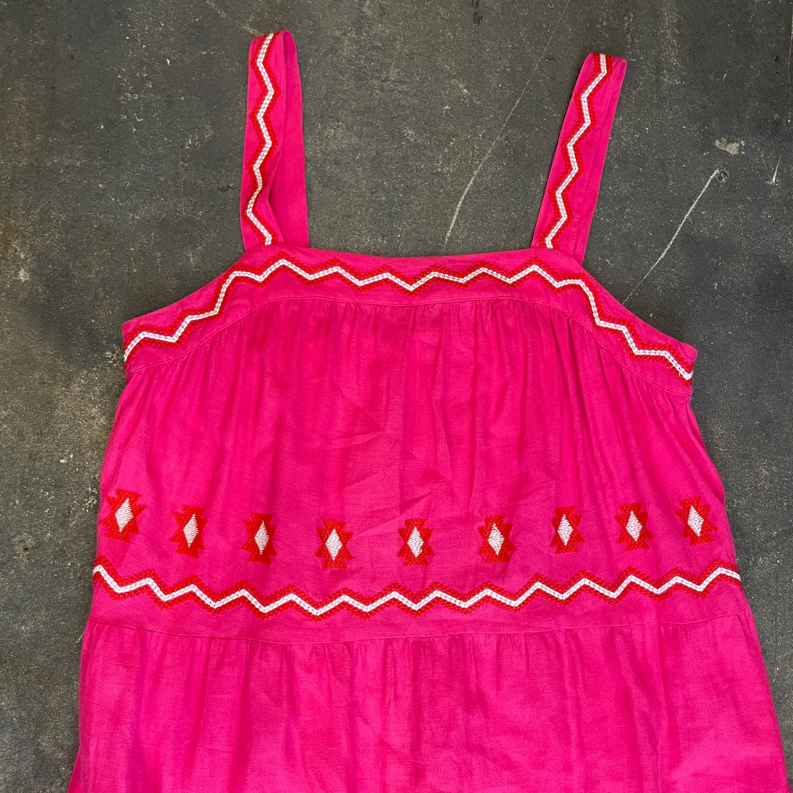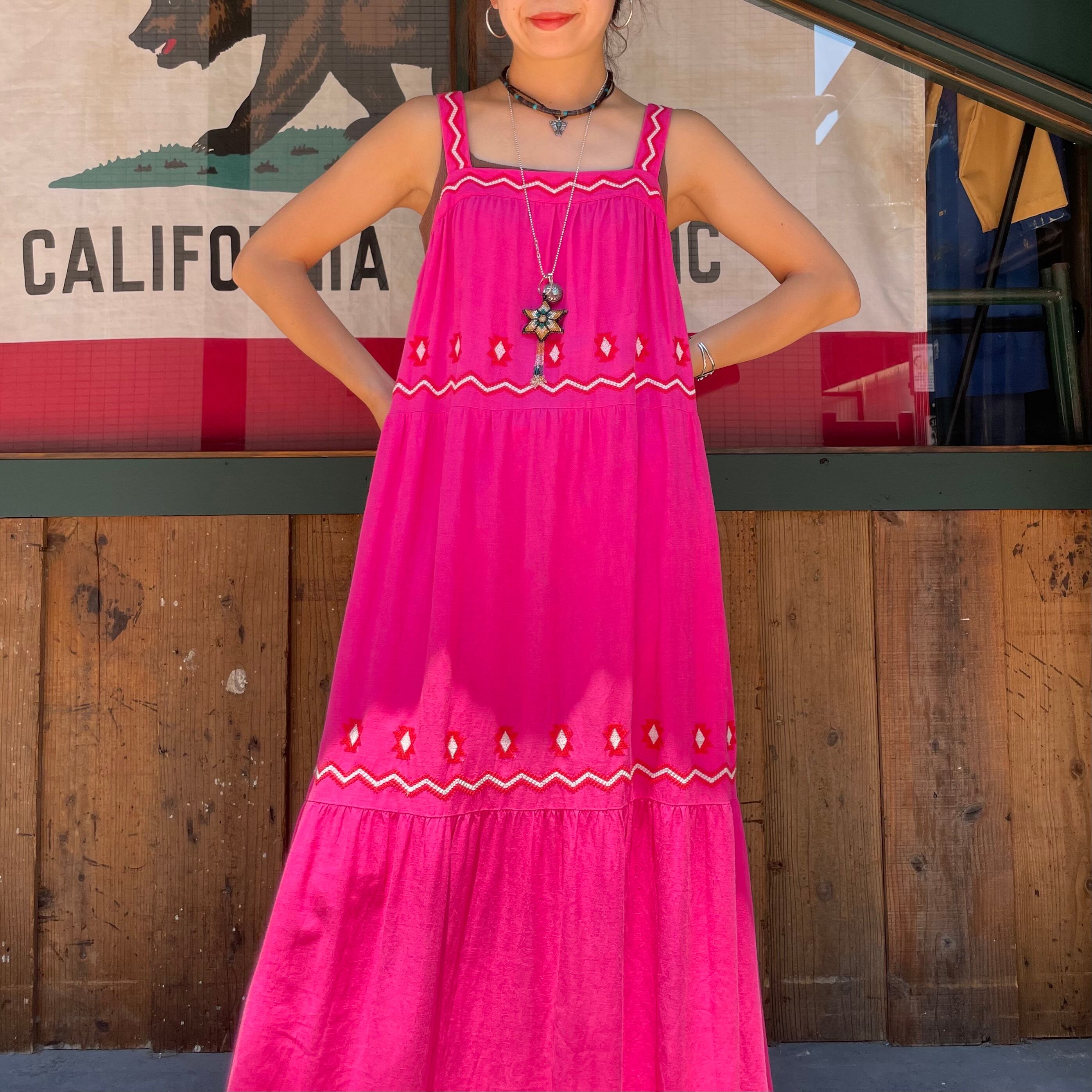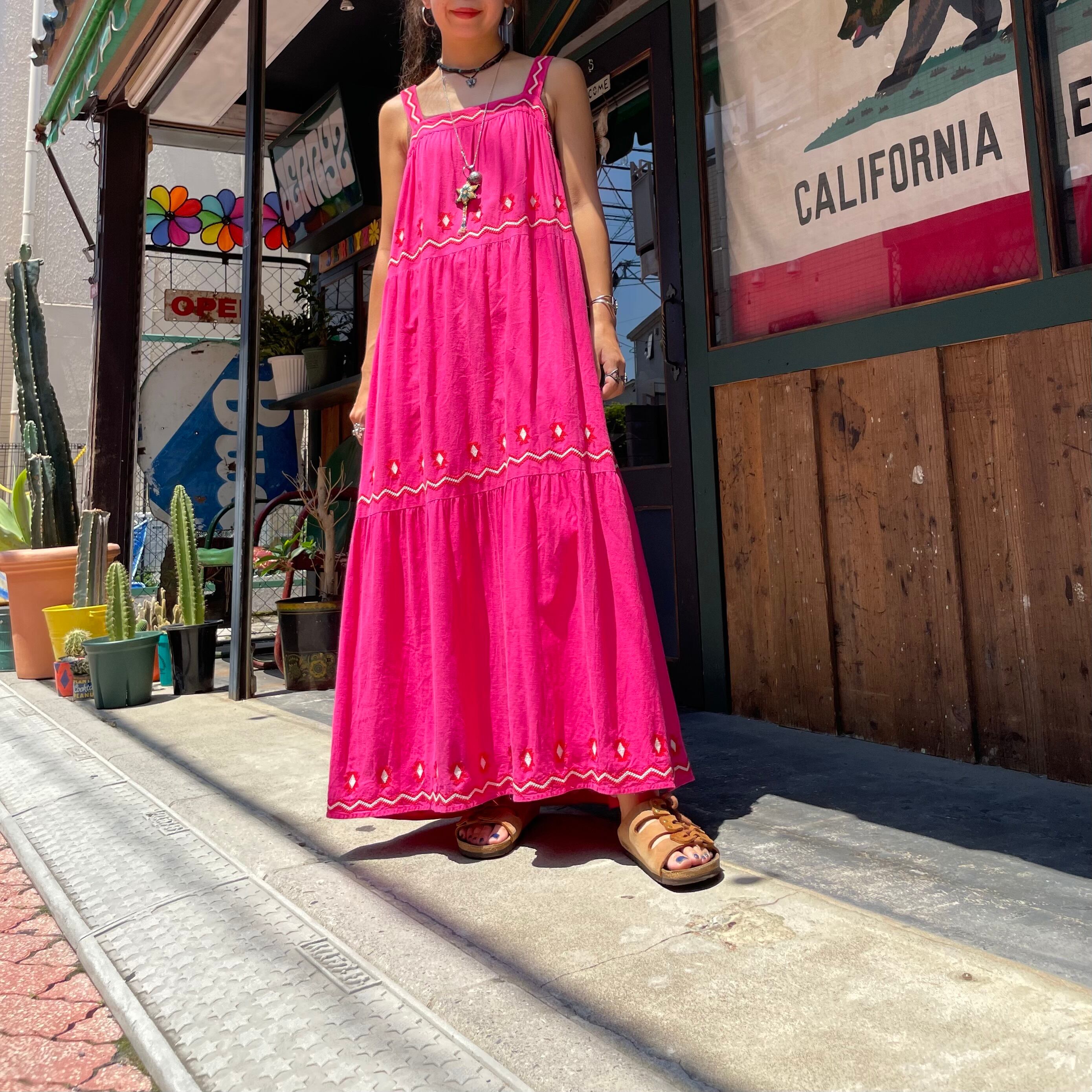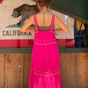 ピンクに赤白のギザギザな機械刺繍がかわいいキャミソールワンピースです。
