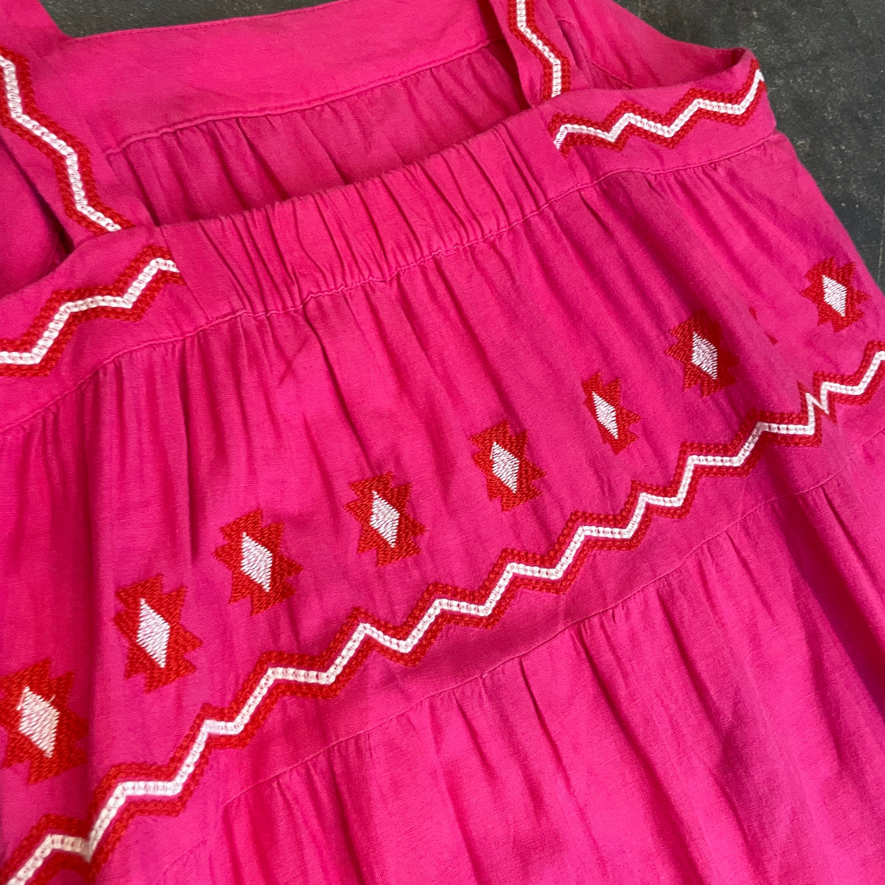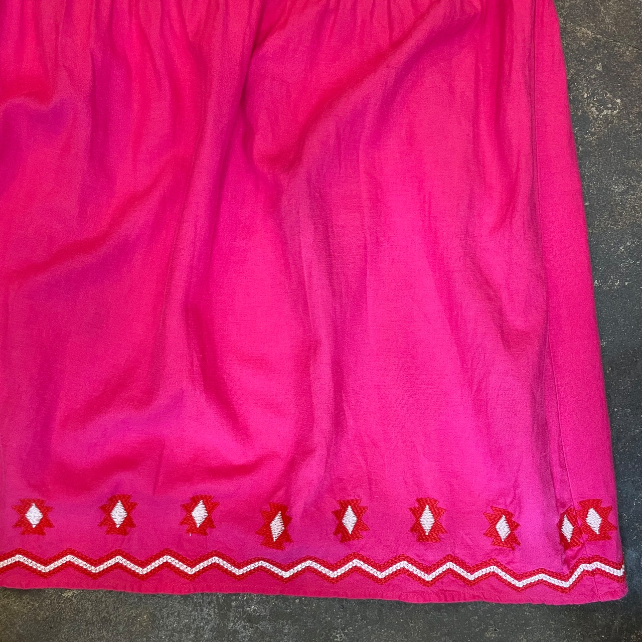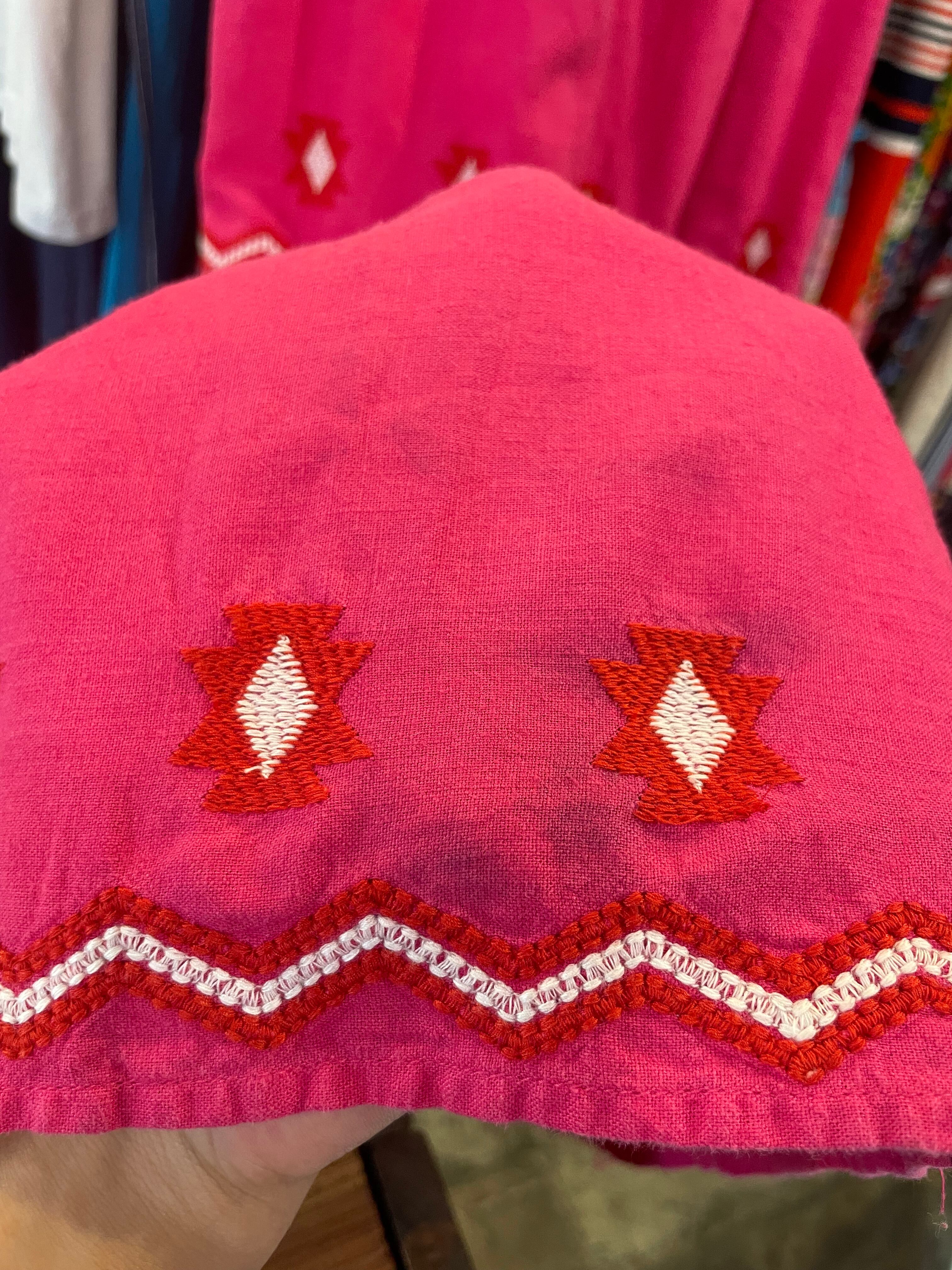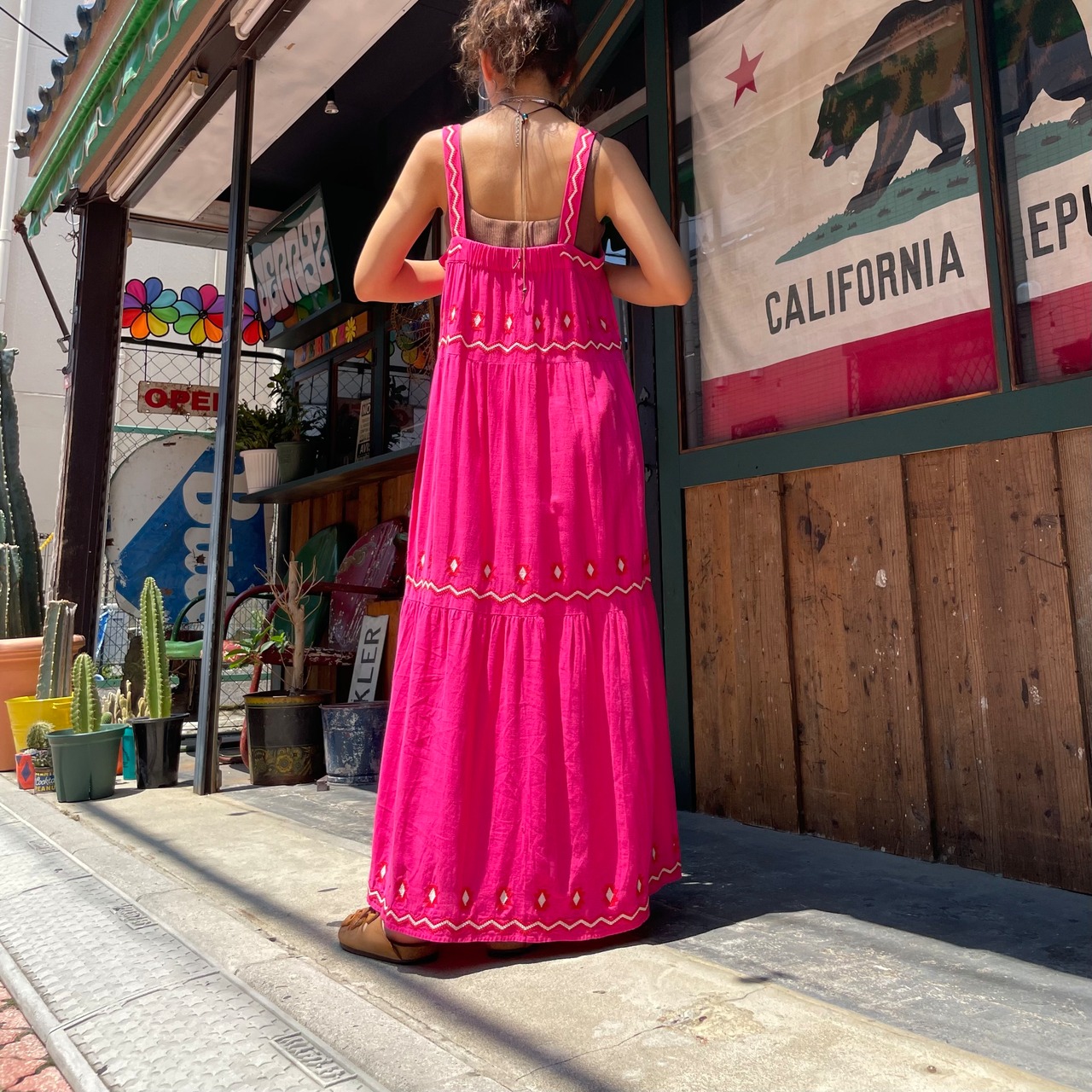 ピンクに赤白のギザギザな機械刺繍がかわいいキャミソールワンピースです。