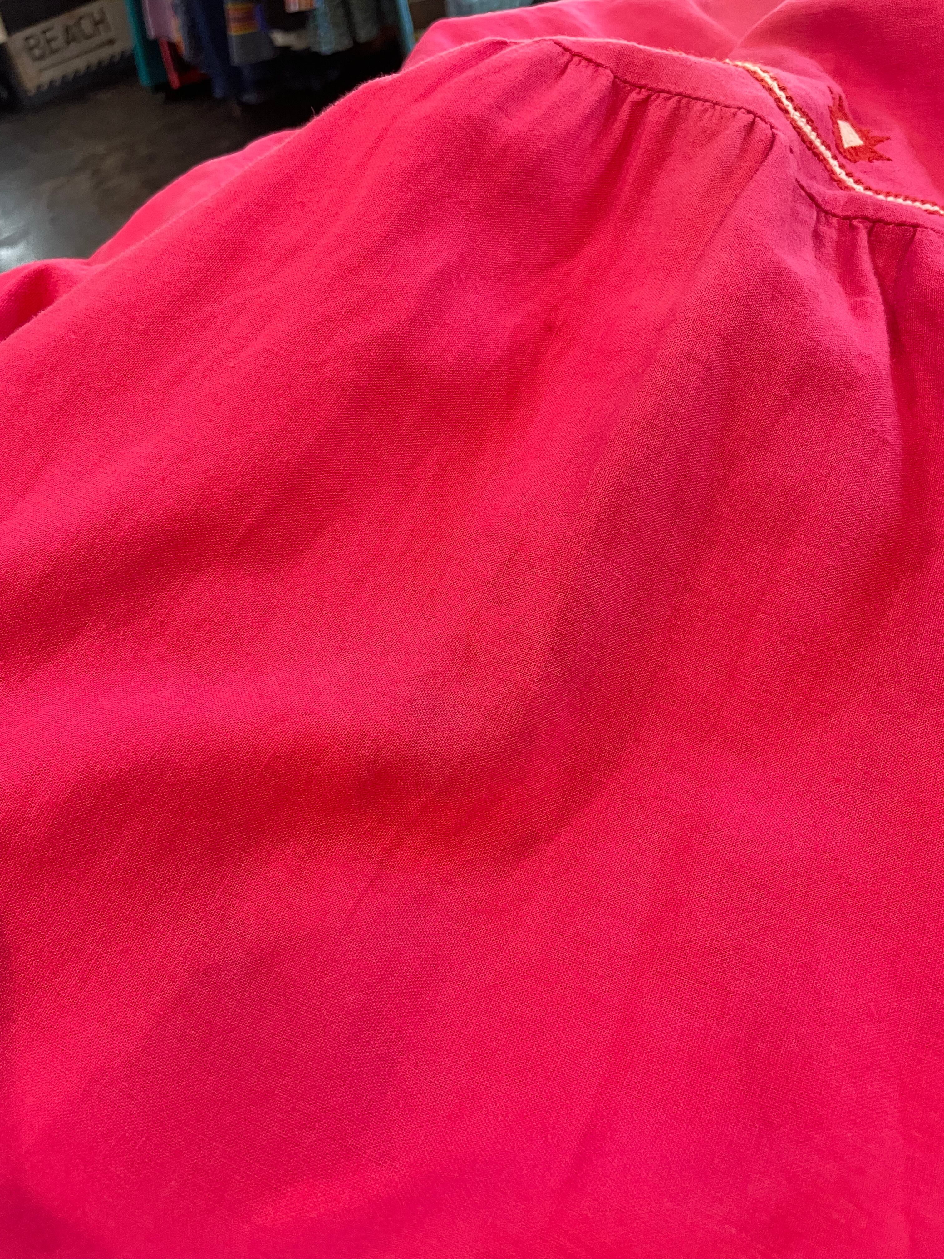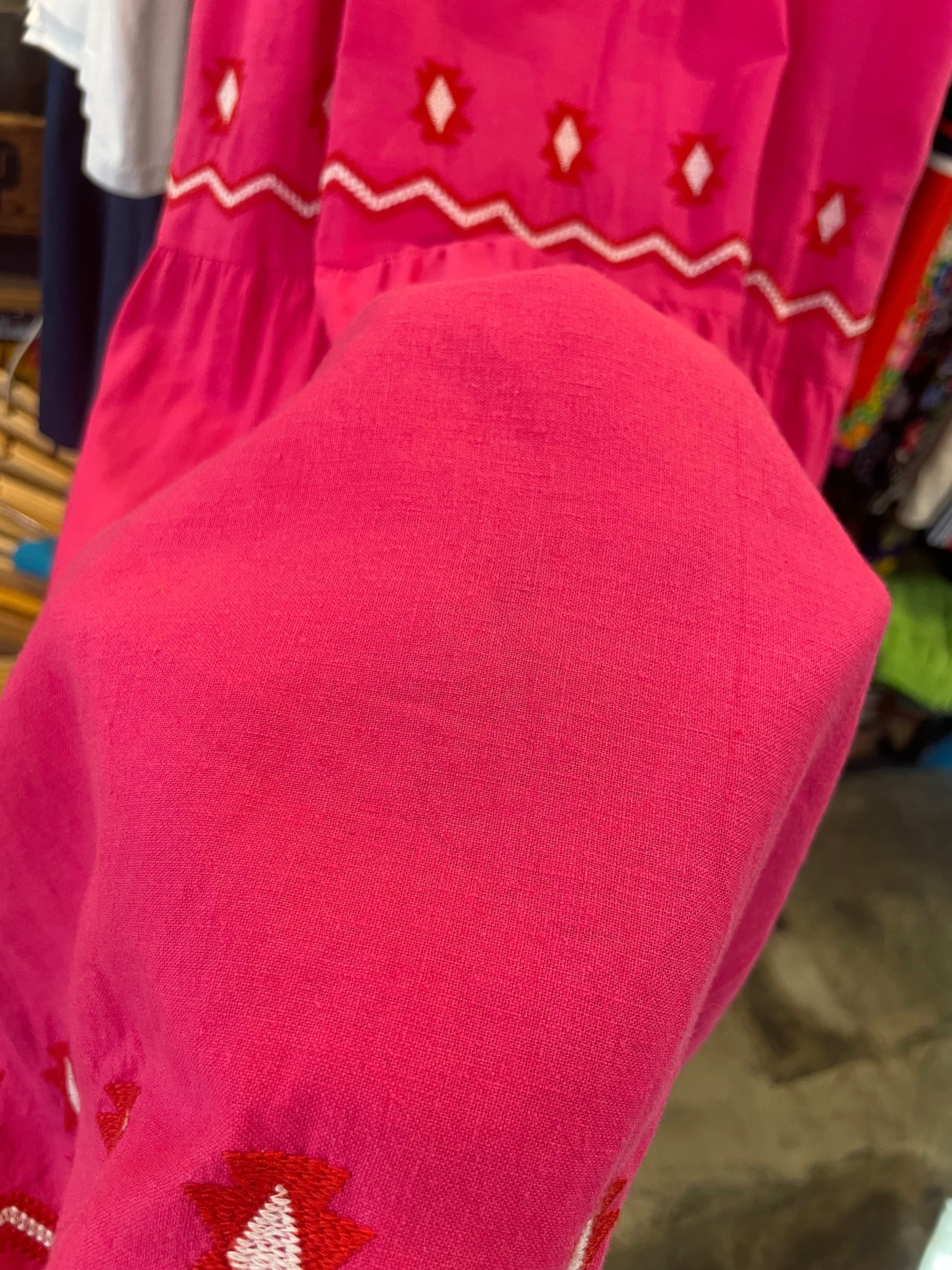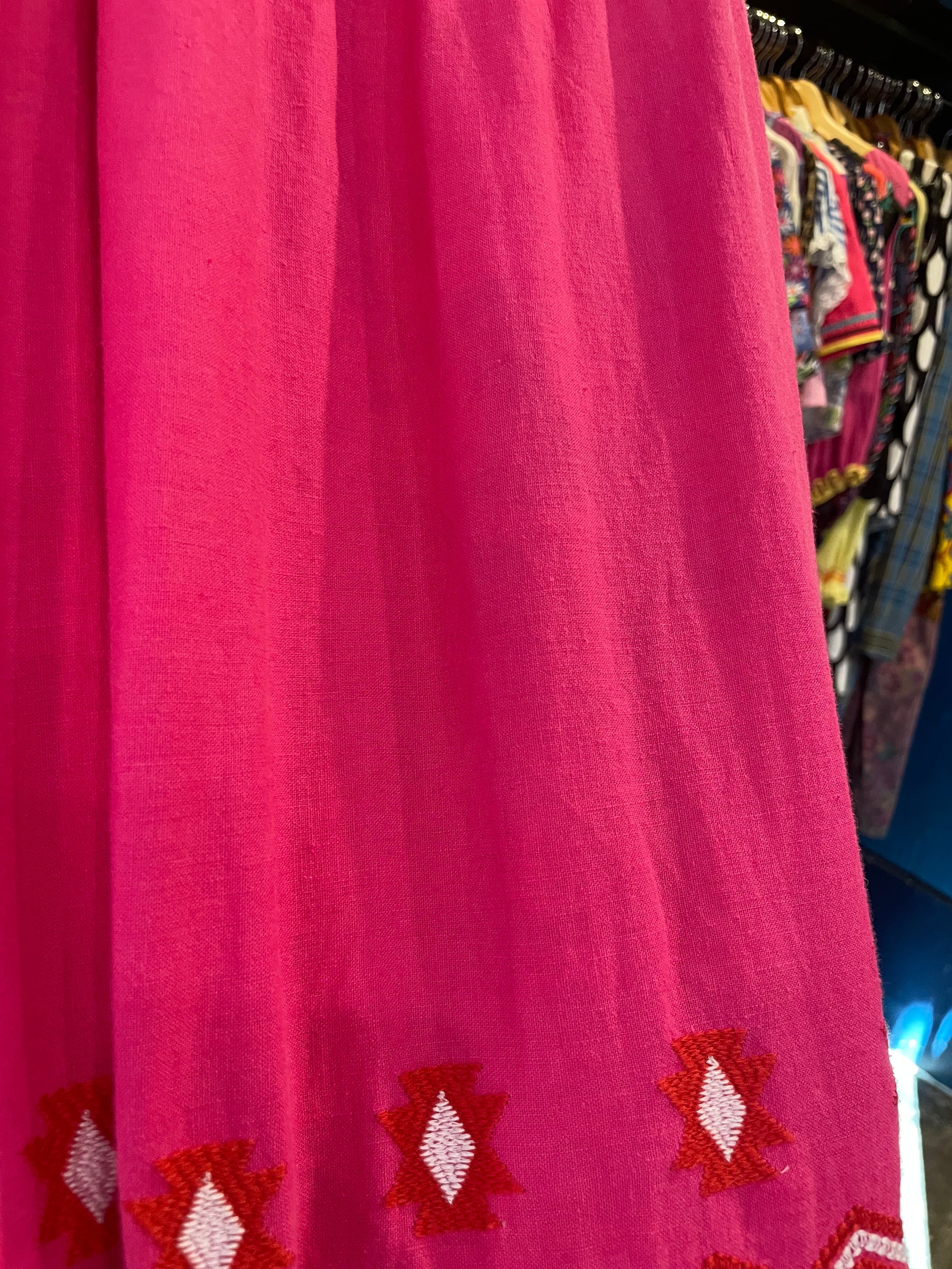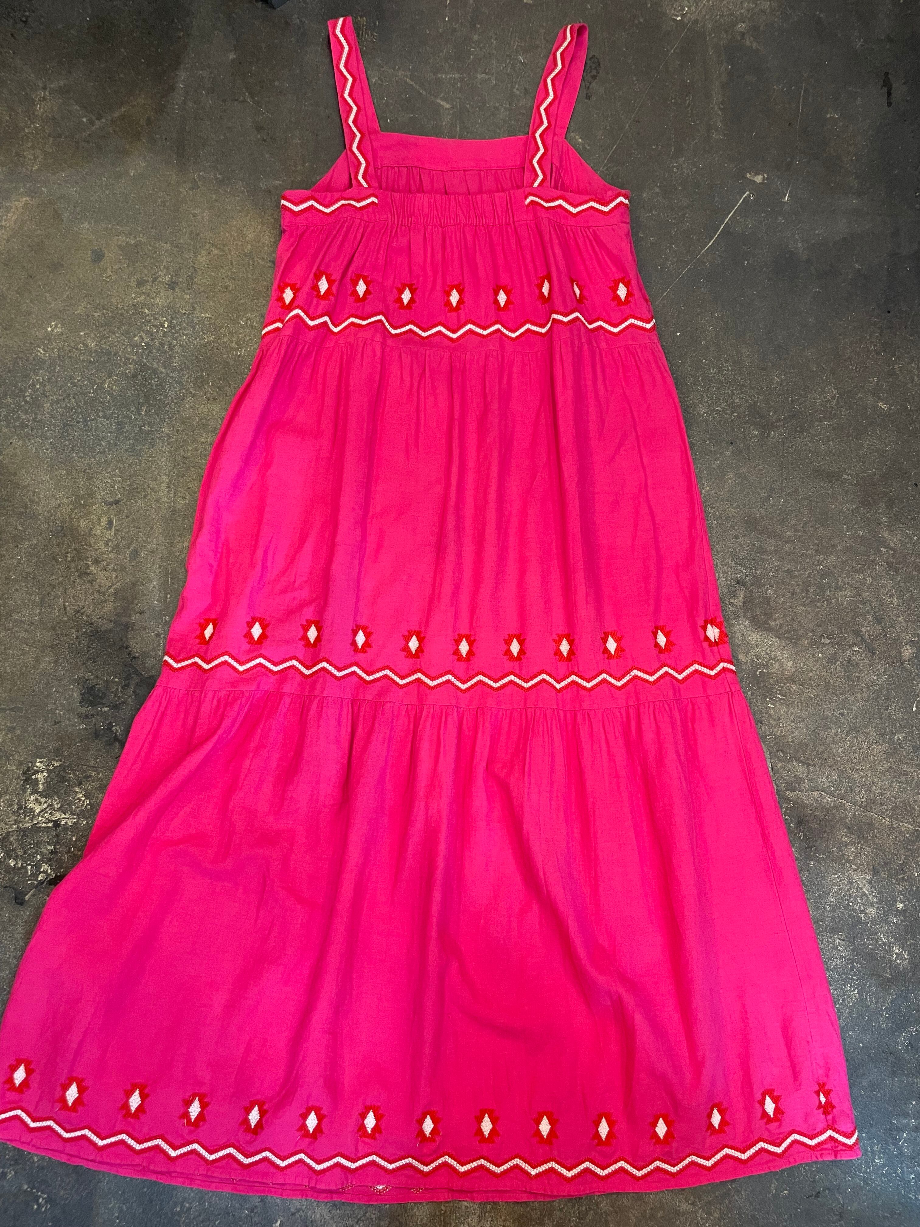 ピンクに赤白のギザギザな機械刺繍がかわいいキャミソールワンピースです。