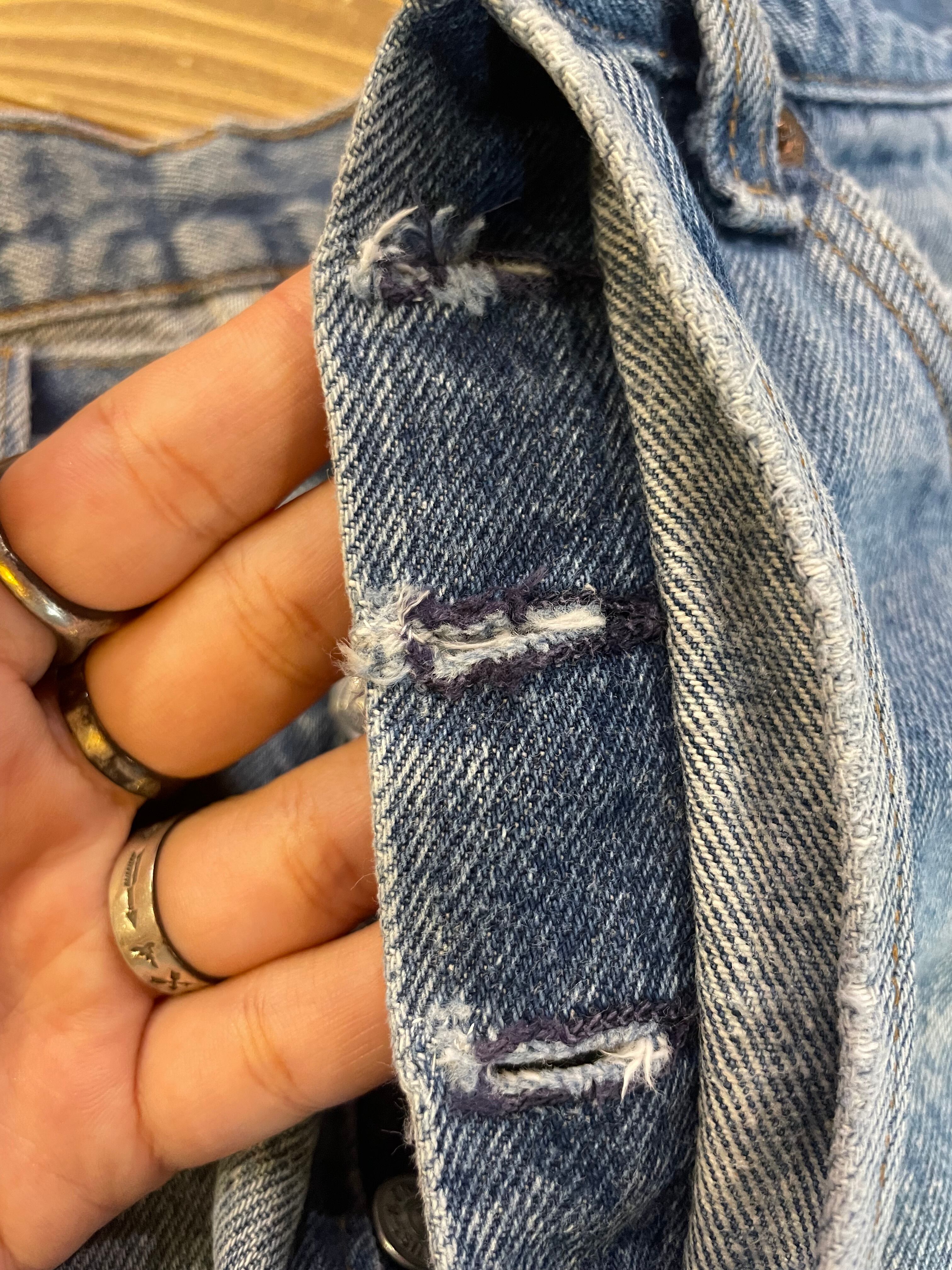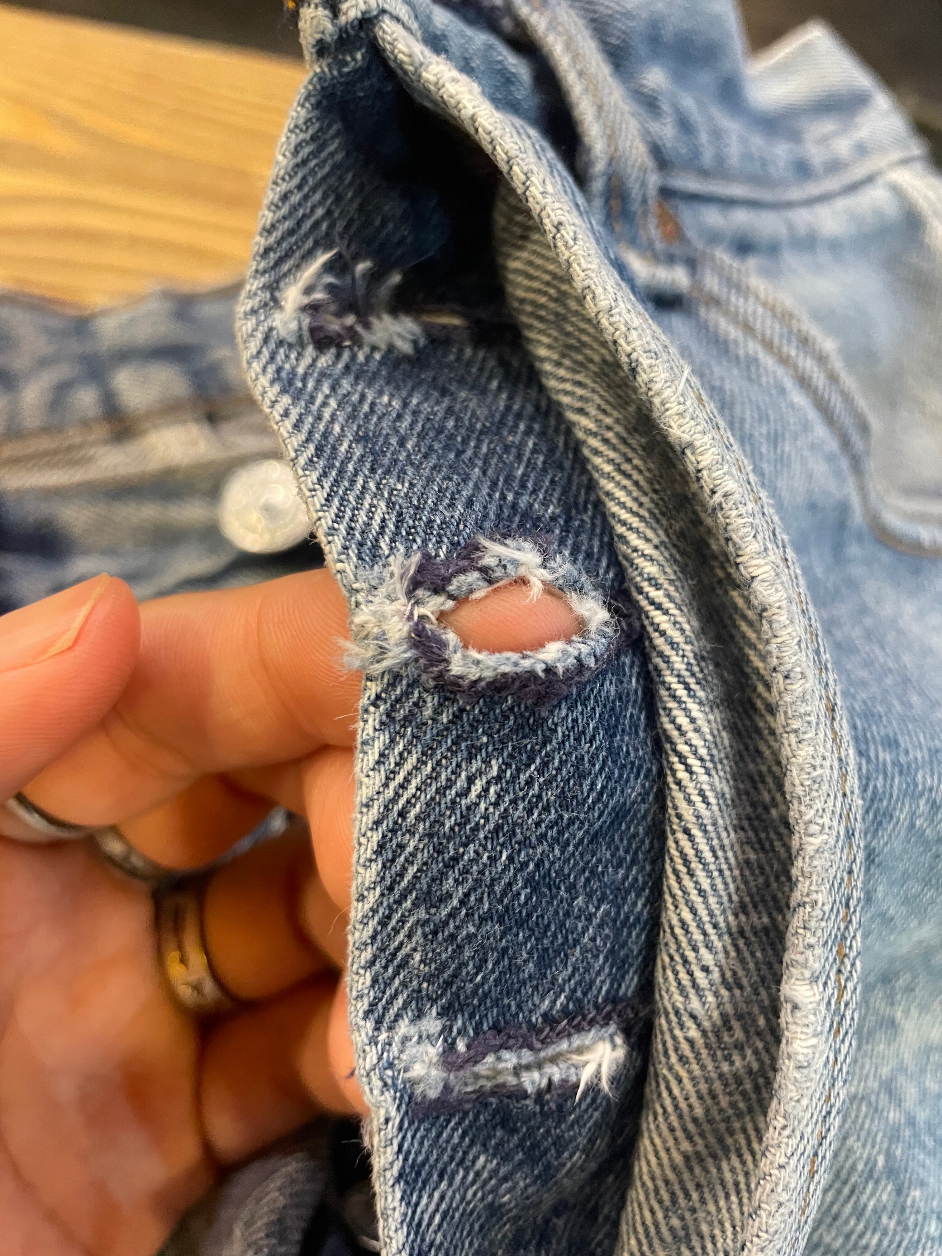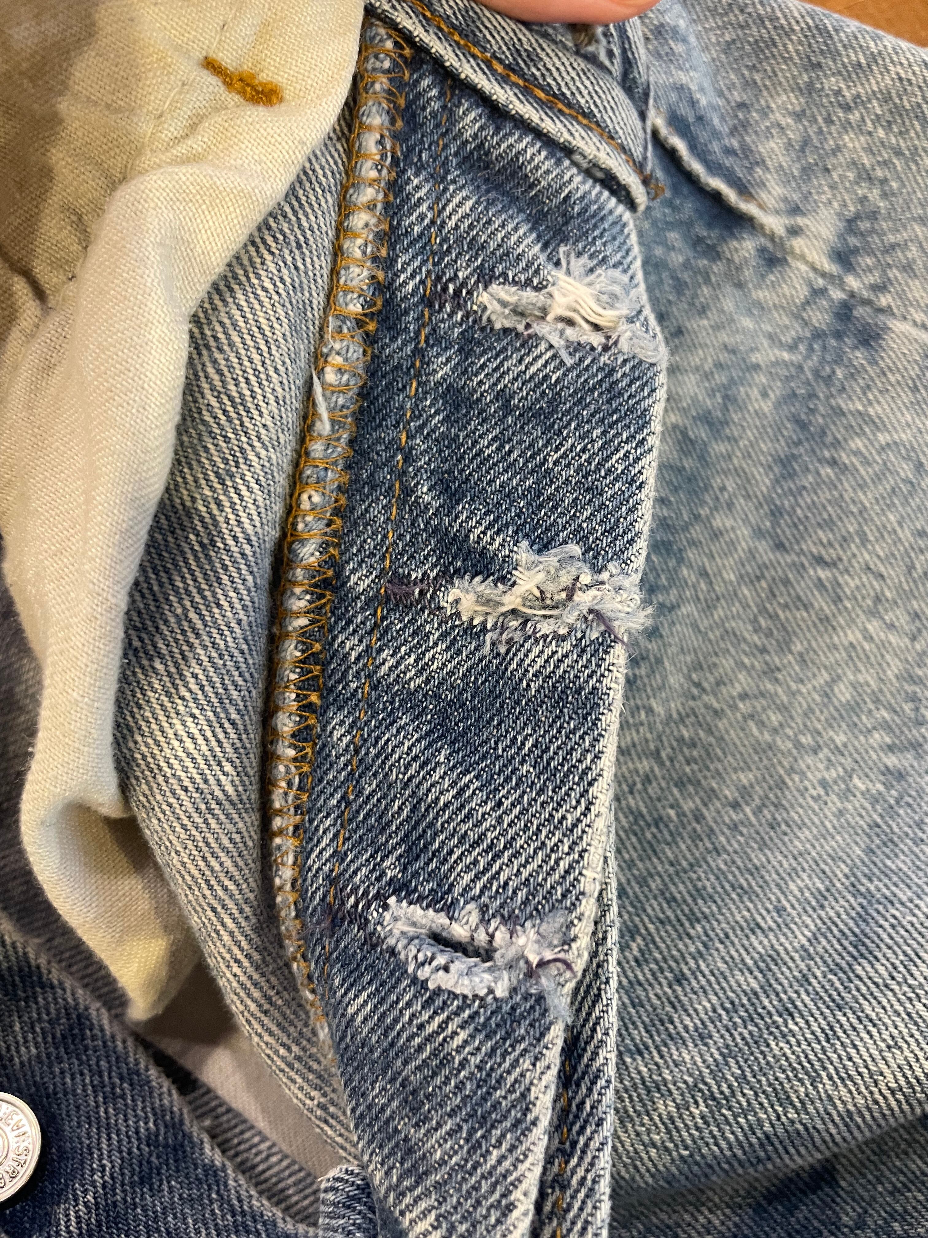 ボタンホールの端にダメージがありましたのでリペアしてあります。擦れや色褪せ等使用感のある商品ですので古着にご理解のある方のご購入をお願い致します。