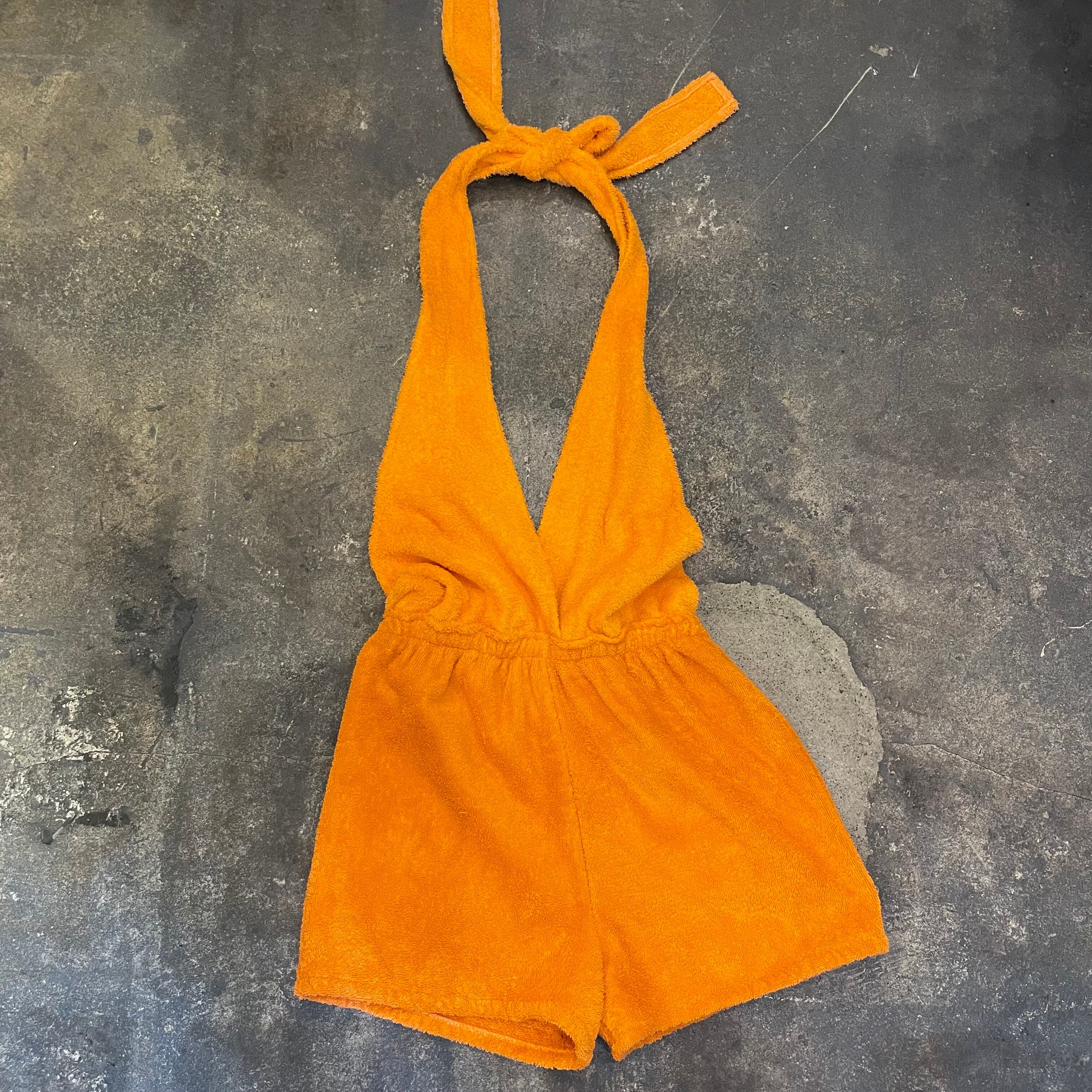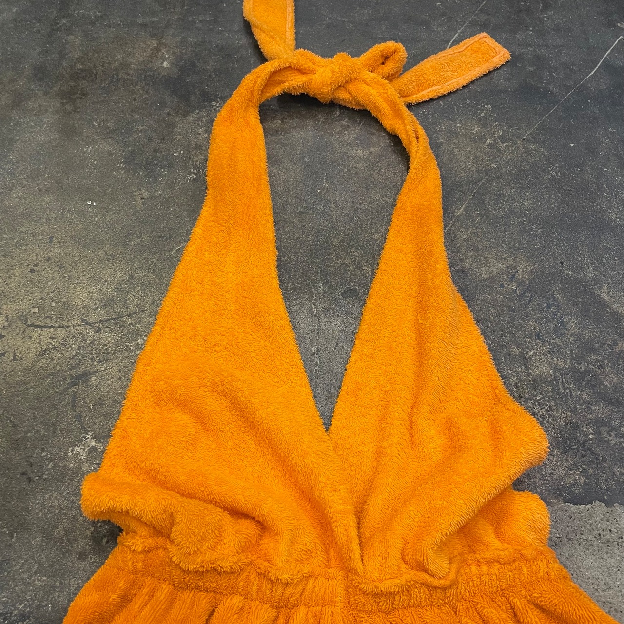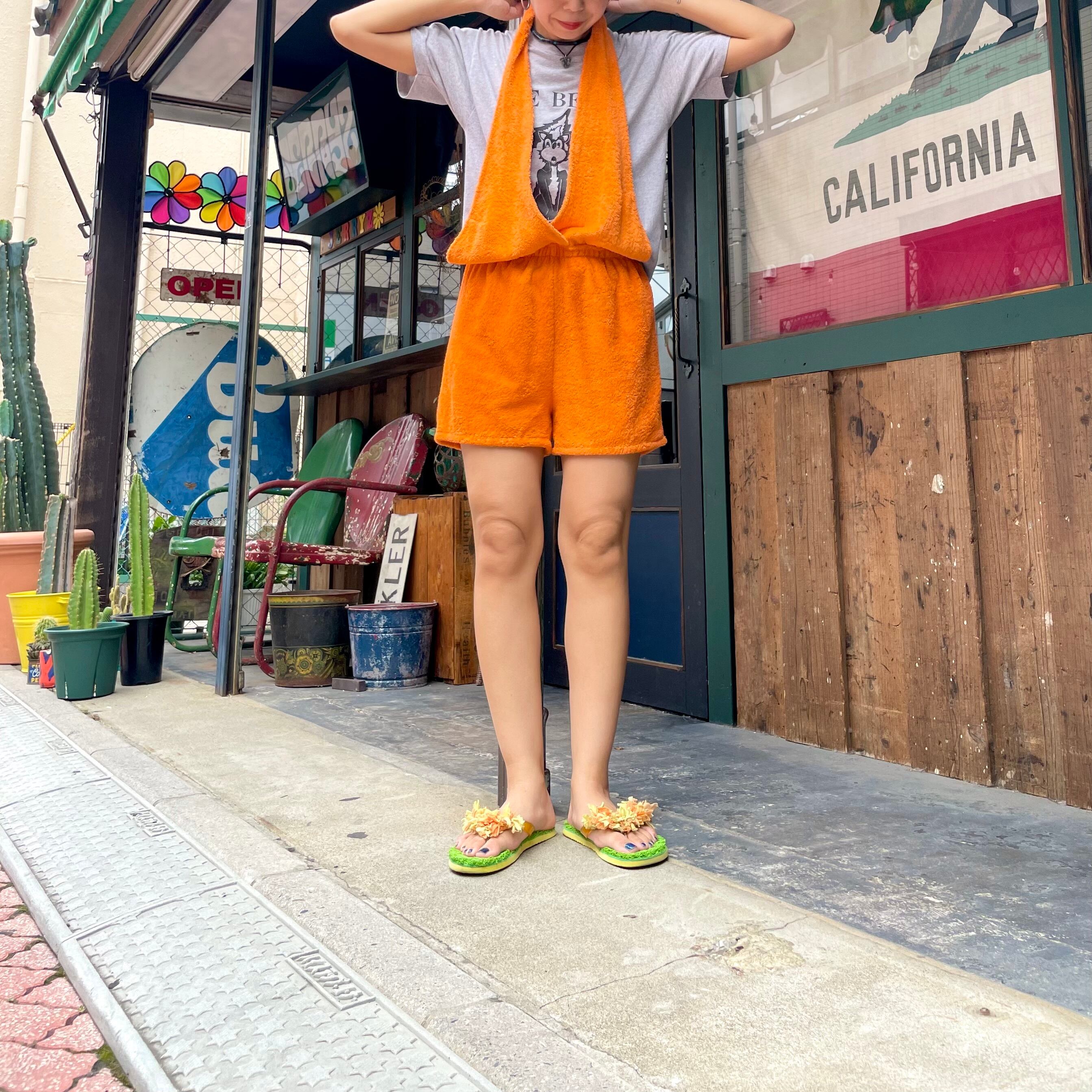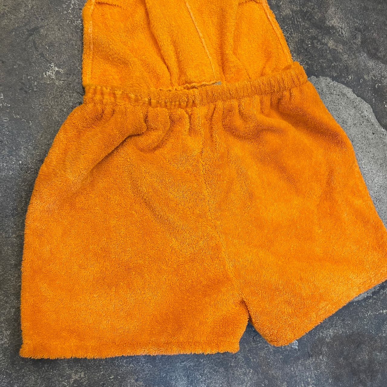 厚手のタオルをリメイクしているホルターネックのサロペットになります。
